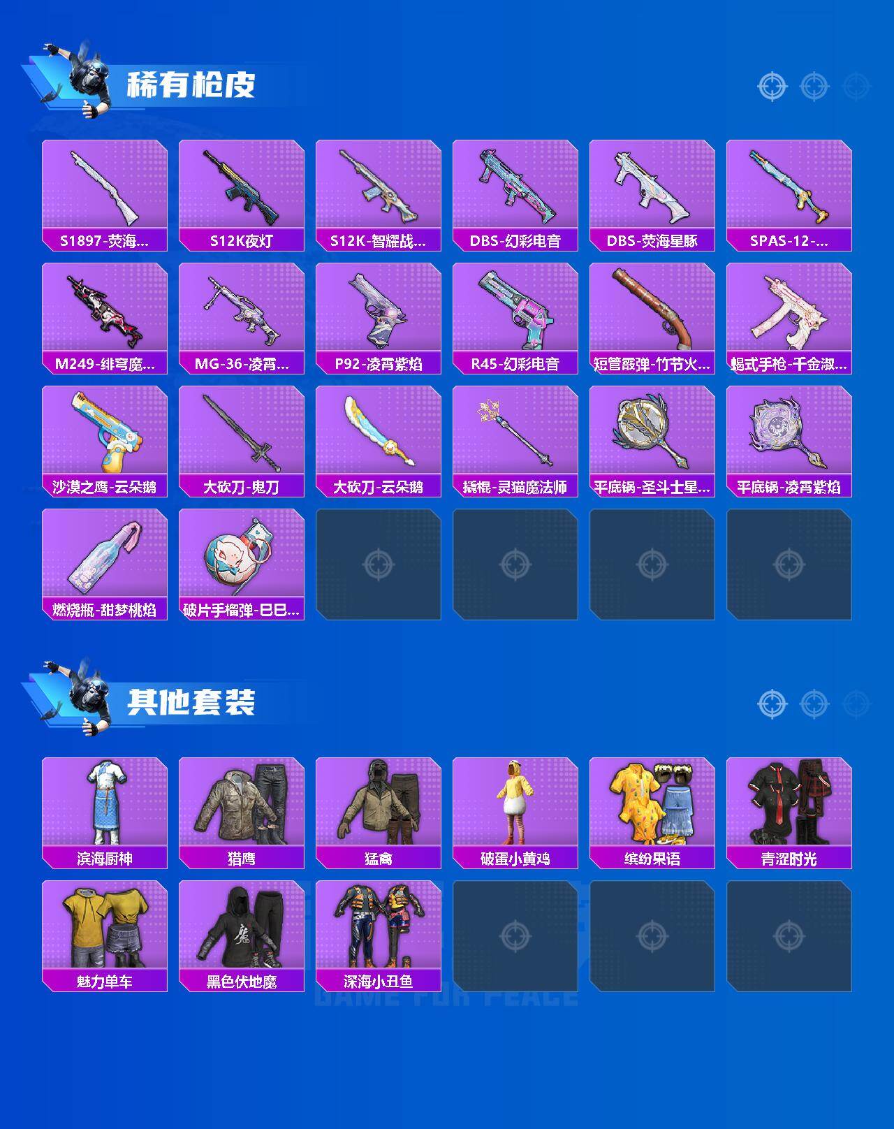 1载具-50套装-101呛皮-50套装/呛械6/装备126/载具1/战备64/王牌印记3/热力值29329/五级groza-镜光银凌/五级aug-暖羊咩咩/六级蜜獾-荧海星豚/五级kar98k-巳巳如意/五级mk14-甜梦熊击/五级dp-28-豹影疾电/深海小丑鱼/角色-时光之吻/角色-宁雨蝶/角色-罗征/角色-荧海星豚/角色-绯穹魔姬/霜龙神御(云雾蓝)/groza-镜光银凌/aug-暖羊咩咩/蜜獾-荧海星豚/kar98