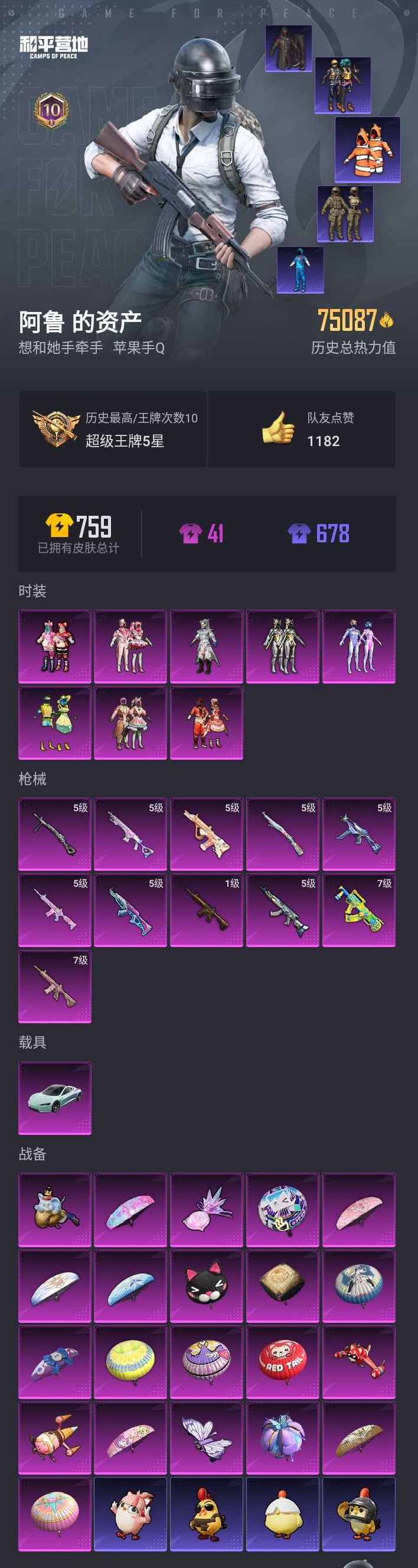 【和平精英】【lyhp19668】高印记 7w热力值 8粉装11特效呛1载具 梦幻火箭 绚金战神 满级aug 满级狗杂香水柠檬 满级m4心之恋语 5级akm梦之光华 特斯拉 8粉装,11特效呛,1载具,历史最高段位:超级王牌5星 王牌印记10次 热力值:75087,150套装,224呛械,249装备,117战备;套装:套装-梦幻火箭,套装-草莓生巧,套装-馨动时刻,套装-俏皮狐尾,套装-银刃赛罗,套装-锦绣火鲤,套装-绚金战神,套装-香水柠檬,套装-黄色运动,套装-蓝色运动,套装-黄色伏地魔,套装-白色伏地魔,套装-黑色伏地魔,套装-竞技名士,套装-长空猛禽,套装-漫步者,套装-黎明保卫者,套装-海岛探路者,套装-灼焰舞者,套装-特战装甲,套装-贵族骑装,套装-特殊使命,套装-青春校园,套装-灰色格斗者,套装-龙腾端午,套装-燃烧卡路里,套装-鹰眼刺客,套装-冰冻风暴,套装-街头潮人,套装-千禧之恋,套装-神秘领域,套装-怒火燎原,套装-魅力单车,套装-耀眼新星,套装-坚韧舞者,套装-竞技达人朋克,套装-都市漫游者,套装-都市魅力,套装-热血青春,套装-幻世战舞者,套装-奇异狩猎者,套装-金耀舞者,套装-蓝调潮人,套装-弄潮海豚,套装-迅捷狂鲨,套装-呆萌铁蟹,套装-深海小丑鱼,套装-甜蜜熊情侣,套装-缤纷果语,套装-小丑鱼,套装-东方飞龙,套装-军械专家,套装-淡雅花蕊,套装-新侠客行,套装-深山诡影,套装-ss10特训,套装-神秘黑猫,套装-软萌银虎,套装-白熊同盟,套装-萌黄之夏,套装-隐空刺,套装-影双刃,套装-击剑大师,套装-深海来使,套装-神秘舞者,套装-抹茶蜜豆,套装-薄荷蓝莓,套装-山经魅狐,套装-本愿之火,套装-dkg战队服,套装-牛气满满,套装-韶华初心,套装-梦之呓语,套装-ss11特训,套装-青春冒险家,套装-潮流游乐家,套装-玄武圣者,套装-白虎圣者,套装-浪客战士,套装-骁骑迪迦,套装-原初圣火,套装-逆风勇士,套装-娴静芝兰,套装-萌趣颜团子,套装-特种颜团子,套装-战术大师,套装-ss12特训,套装-牛气冲天,套装-ss18特训,套装-闪金天王,套装-镭射皇者,套装-银白舞王,套装-迅捷之星,套装-治愈之星,套装-科技之星,套装-萌主吾皇,套装-飞行日记,套装-ss13特训,套装-冰爽海盐,套装-浪漫樱花,套装-双棍侠客,套装-ss14特训,套装-吉莉礼服,套装-ss15特训,套装-ss16特训,套装-暴风机械师,套装-时空追击者,套装-ss17特训,套装-福星高照,套装-ss19特训,套装-ss20特训,套装-ss21特训,套装-ss22特训,套装-光之冒险,套装-ss23特训,套装-神气柴柴,套装-懵萌河马,套装-ss24特训,套装-龟仙人,套装-ss25特训,套装-惊鸿侠骨,套装-锦衣飞扬,套装-元气发射,套装-龙的传人,套装-ss26特训,套装-空岛之星,套装-焰鹰斗篷,套装-幽夜迷踪,套装-幻羽潜行,套装-ss27特训,套装-恋语绒绒,套装-ss28特训,套装-街头风暴,套装-海盐绵绵冰,套装-创世·幻影,套装-ss29特训,角色-临安公主,套装-ss30特训,套装-ss31特训,套装-智谋强哥,套装-ss33特训,套装-巳巳如意,套装-ss32特训,套装-顶瓜瓜,角色-灵公主,套装-炫彩糖果,套装-元气之梦,套装-ss34特训,套装-ss35特训,套装-萌鸡速递;呛皮:5级akm-梦之光华,akm-灼热熔岩,akm-生命誓言,akm-奇异狩猎者,akm-缤纷海域,akm-春暖花开,akm-山经魅狐,akm-夜灯,akm-锦绣火鲤,akm-深山诡影,akm-涂鸦街区,akm-阿狸红,akm-彩虹符号,akm-萌趣颜团子,akm-龙的传人,akm-霓彩脉冲,7级groza-香水柠檬,groza-影袭,groza-生命誓言,groza-马卡龙,groza-治愈之星,groza-彩虹符号,groza-懵萌河马,groza-绯红回忆,groza-海盐豹豹,5级aug-暖羊咩咩,aug-幻影战神,aug-诡面斩,aug-耀粉歌者,aug-青春冒险家,aug-天降萌叽,aug-异域银装,aug-紫晶流影,g36c-金风玉露,g36c-时空追击者,g36c-懵萌河马,g36c-乌木金纹,famas-霓彩脉冲,famas-乌木金纹,1级m416-五爪金龙,7级m416-心之恋语,5级m416-电玩时刻,m416-蓝色火焰,m416-神秘黑猫,m416-阿狸红,m416-滑板小狐,蜜獾-天降萌叽,蜜獾-精灵梦叶罗丽,蜜獾-鸡智如我,蜜獾-乌木金纹,5级m762-激战未来,m762-奇异狩猎者,m762-牛气冲天,m762-镭射皇者,m762-天降萌叽,q-神秘黑猫,q-潮汐统领,q-原初圣火,q-赛罗,q-彩虹符号,scar-l-夜灯,scar-l-夏日绵绵冰,scar-l-繁花小夜曲,scar-l-炫彩节奏,scar-l-暗夜玫瑰,scar-l-玉兔迎春,scar-l-海盐豹豹,m16a4-夜灯,m16a4-幻世战舞者,mk47-青春冒险家,ac-val-乌木金纹,win94-夏日绵绵冰,win94-乌木金纹,5级kar98k-巳巳如意,kar98k-梦幻火箭,kar98k-终极赛罗,kar98k-彩虹符号,kar98k-乌木金纹,莫辛纳甘-乌木金纹,莫辛纳甘-懵萌河马,awm-不夜海上花,awm-天降萌叽,awm-焰鹰斗篷,awm-乌木金纹,m24-影袭,m24-奇异狩猎者,m24-治愈之星,m24-香水柠檬,m24-乌木金纹,m200-惊鸿侠骨,m200-乌木金纹,amr-乌木金纹,m417-惊鸿侠骨,m417-玩趣呆呆,mini14-穿刺龙虾,mini14-金鼠迎春,mini14-梦幻火箭,mini14-原初圣火,mini14-炫彩节奏,mini14-马卡龙,mini14-阿狸红,qbu-锦绣火鲤,qbu-青春冒险家,qbu-烈焰拳霸,5级mk14-甜梦熊击,mk14-山经魅狐,mk14-童趣迷兔,mk14-治愈之星,mk14-乌木金纹,mk14-冰河战士,mk14-薄荷星砂,mk14-紫晶流影,vss-未来战士,vss-深山诡影,vss-镭射皇者,vss-香桃花海,vss-乌木金纹,slr-葫芦兄弟,slr-霓彩脉冲,sks-迅猛狂鲨,sks-心之恋语,sks-时空追击者,sks-未来歌姬,mk20-h-狂鲨锋刃,mk20-h-乌木金纹,mk12-乌木金纹,p90-飞驰魅影,p90-倾城蜜语,p90-玩趣呆呆,p90-巳巳如意,p90-乌木金纹,mp5k-梨园星光,mp5k-乌木金纹,aks-74u-鸡智如我,aks-74u-乌木金纹,uzi-金风玉露,uzi-炫彩节奏,uzi-天降萌叽,uzi-绝色倾城,uzi-啾咪啾咪,uzi-炫彩糖果,5级ump45-量子极限,ump45-夜灯,ump45-蓝色火焰,ump45-生命誓言,ump45-