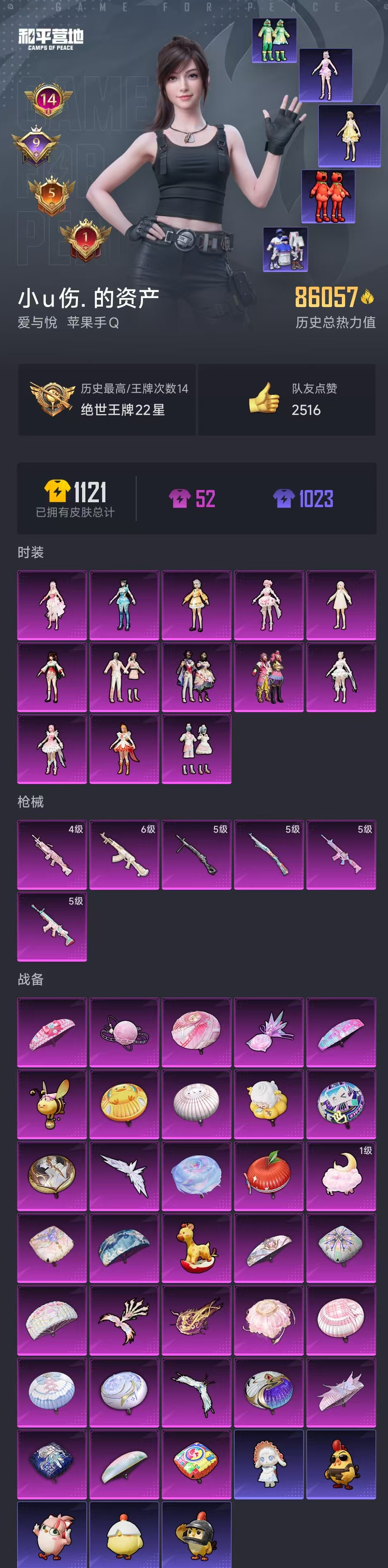 【和平精英】【lyhp19704】8.6w热力值高印记精品女号 13粉装6特效呛 绝对恒星 呆萌星弥 联名小叽 冷鸢歌者 第五大道 猪妹 千金淑猫 小番茄 天命 13粉装,6特效呛,0载具,历史最高段位:绝世王牌22星 王牌印记14次 热力值:86058,206套装,274呛械,407装备,205战备;套装:套装-缤纷油彩,角色-小可学妹,角色-呆萌星弥,角色-白勺歌姬,套装-第五大道,套装-蜜语绒猫,角色-小蓝,角色-美雪,角色-异瞳寒姬,角色-千金淑猫,套装-星穹咏叹调,角色-奇迹舞步 美雪,角色-绝对恒星,套装-特训学院,套装-猎鹰,套装-青年教官,套装-橘黑制服,套装-红色运动,套装-黄色运动,套装-蓝色运动,套装-黄色伏地魔,套装-白色伏地魔,套装-黑色伏地魔,套装-竞技名士,套装-深蓝色名流,套装-酒红色名流,套装-湖蓝色名流,套装-黄色名流,套装-猛禽,套装-长空猛禽,套装-海岛探路者,套装-冷焰舞者,套装-灼焰舞者,套装-浪漫天命,套装-特战装甲,套装-战地督导,套装-完美偶像,套装-人气偶像,套装-幻影武者,套装-街头潮人,套装-蓝彩潮人,套装-神秘领域,套装-魅力单车,套装-绮丽涂鸦,套装-坚韧舞者,套装-竞技达人朋克,套装-破晓战魂,套装-都市魅力,套装-热血青春,套装-沙漠兵团,套装-酷潮明星,套装-幻世战舞者,套装-缤纷果语,套装-滨海厨神,套装-龙魂突击队,套装-元素星魂,套装-极速红龙,套装-麻辣教官,套装-破蛋小黄鸡,套装-霓虹街区,套装-白熊同盟,套装-萌黄之夏,套装-夏日音浪,套装-顽皮玉兔,套装-牛气满满,套装-白糯汤圆,套装-战术大师,套装-耀粉歌者,套装-飞行日记,套装-竞技角斗士,套装-曼妙人鱼,套装-热情海星,套装-纯真浪花,套装-豚鼠丹丹,套装-ss19特训,套装-ss20特训,套装-粉团憨憨,套装-软羊咩咩,套装-猎梦纪元,套装-甜心亚梦,套装-虚音幻奏,套装-ss21特训,套装-夏雨游龙,套装-红熊茄茄,套装-玉兔迎春,套装-ss22特训,套装-轻风白浪,套装-光之冒险,套装-绯格组合,套装-ss23特训,套装-白兰地假日,套装-甜梦熊熊,套装-神气柴柴,套装-懵萌河马,套装-幻彩翩翩,套装-王牌教练,套装-柠萌假日,套装-青玉碎影,套装-ss24特训,套装-日照花林,套装-龟仙人,套装-涂山之恋,套装-ss25特训,套装-惊鸿侠骨,套装-锦衣飞扬,套装-双彩绵绵,套装-绝对偶像,套装-香桃花海,角色-2b战斗服款,套装-龙的传人,套装-冰河战士,套装-ss26特训,套装-快闪甜心,套装-春光漫游,套装-漫游都市,套装-空岛之星,角色-星际旅行,套装-萌趣绒叽,套装-云魄琉璃,套装-贝斯之夜,套装-焰鹰斗篷,套装-幽夜迷踪,套装-幻羽潜行,套装-ss27特训,套装-恋语绒绒,套装-老实芭蕉,套装-ss28特训,套装-铁血战翼,角色-迎夏光舞,角色-粉雾星云,角色-白光莹,角色-情公主,套装-街头风暴,套装-海盐绵绵冰,套装-航行童话,套装-蝶变,套装-湖畔霞光,套装-雪夜云雾,套装-小熊娃娃,套装-ss29特训,套装-雏菊兔兔,套装-萝兰蝴蝶,套装-奶油柴柴,套装-异域银装,角色-都市丽猫,套装-星途旅人,套装-ss30特训,套装-青团波波,套装-棉花软糖,套装-绒绒粉兔,角色-光矢逐梦,角色-绛羽幽主,套装-糖糖葫芦,套装-夜幕侵蚀,套装-小鸟芋圆,角色-馥郁金蕊,套装-绒宝小鹅,套装-ss31特训,套装-鱼渊荷华,套装-石蕴玉辉,套装-燕燕于飞,套装-智谋强哥,套装-晶灵使者,套装-紫幽梦,套装-粉恋花,套装-晶辉守护,套装-ss33特训,角色-猎影月神,套装-云朵鹅,套装-巳巳如意,套装-ss32特训,套装-彩虹兔,套装-蓝冰羽,套装-顶瓜瓜,套装-雪绒豹,套装-狂鲨锋刃,套装-乐游熊熊,套装-大橘大利,角色-幽澜祭司,套装-霓虹热舞,套装-炫彩糖果,套装-星影赞美诗,玩偶服-懒羊羊,玩偶服-美羊羊,套装-元气之梦,套装-ss34特训,套装-擎苍青焰,套装-朱霞炽焰,套装-游乐,套装-凌霄紫焰,套装-薄荷星砂,套装-ss35特训,套装-午间小调,套装-秘语星愿,套装-风迹短诗,套装-琴音绮想,套装-粉黛兰香,角色-超感刻度,套装-画境星梦,套装-书海巡游,套装-错位像素,角色-甜心蒙太奇,套装-ss36特训,套装-雪国风尚,套装-超能元气,套装-萌鸡速递;呛皮:蜜獾-天降萌叽,蜜獾-糖糖葫芦,蜜獾-风迹短诗,蜜獾-绿洲时空,蜜獾-乌木金纹,famas-璀璨流光,famas-霓彩脉冲,famas-乌木金纹,groza-懵萌河马,groza-2b战斗服款,groza-海盐豹豹,m16a4-蓝色火焰,m16a4-红色方程式,m16a4-甜心亚梦,m16a4-幻世战舞者,m16a4-冰河战士,m16a4-天使羽翼,aug-耀粉歌者,aug-2p战斗服款,aug-异域银装,aug-月影灵韵,aug-绝对恒星,aug-紫晶流影,6级akm-白勺歌姬,akm-破晓战魂,akm-霓虹街区,akm-涂鸦街区,akm-彩虹符号,akm-恐龙拽拽,akm-龙的传人,akm-江南烟雨,akm-霓彩脉冲,akm-绿洲时空,ac-val-甜心亚梦,ac-val-乌木金纹,ac-val-天降萌叽,ac-val-快闪甜心,ac-val-兔兔小魔女,ac-val-时光之吻,5级scar-l-锦绣绵绵,scar-l-红色方程式,scar-l-夜灯,scar-l-炫彩节奏,scar-l-暗夜玫瑰,scar-l-彩虹符号,scar-l-玉兔迎春,scar-l-星途旅人,scar-l-海盐豹豹,scar-l-乐游熊熊,5级m416-电玩时刻,m416-蓝色火焰,m416-绯红前夜,m416-红色方程式,m416-糯团青竹,m416-错位像素,m762-彩虹符号,m762-天降萌叽,m762-萌物绒绒,m762-雏菊兔兔,m762-云朵鹅,arx-凌霄紫焰,mk47-乌木金纹,mk47-风迹短诗,g36c-懵萌河马,ace32-画境星梦,q-彩虹符号,q-纯真浪花,m24-天降萌叽,m24-樱桃泡泡,m24-蓝晶绮麟,m24-时光之吻,m24-乌木金纹,amr-白勺歌姬,amr-镜光幻境,amr-鸡智如我,amr-时光之誓,amr-喜羊羊与灰太狼,amr-乌木金纹,awm-垂柳戏鸭,awm-天降萌叽,awm-焰鹰斗篷,awm-纯真浪花,awm-绿洲时空,5级kar98k-巳巳如意,kar98k-红