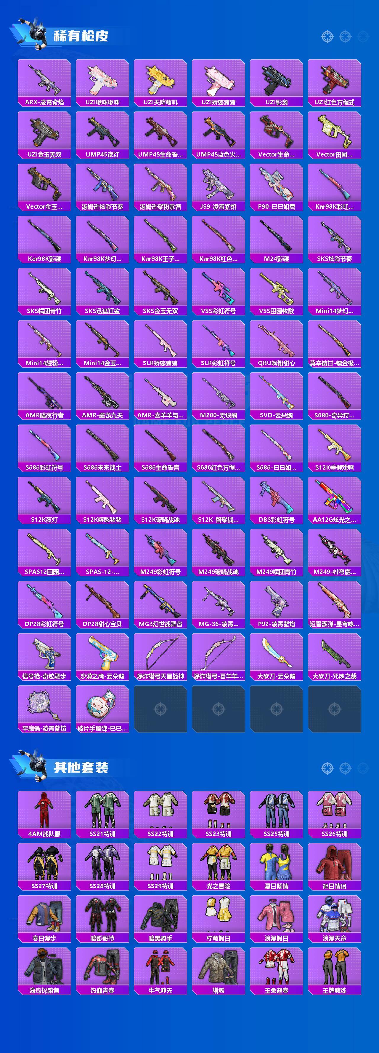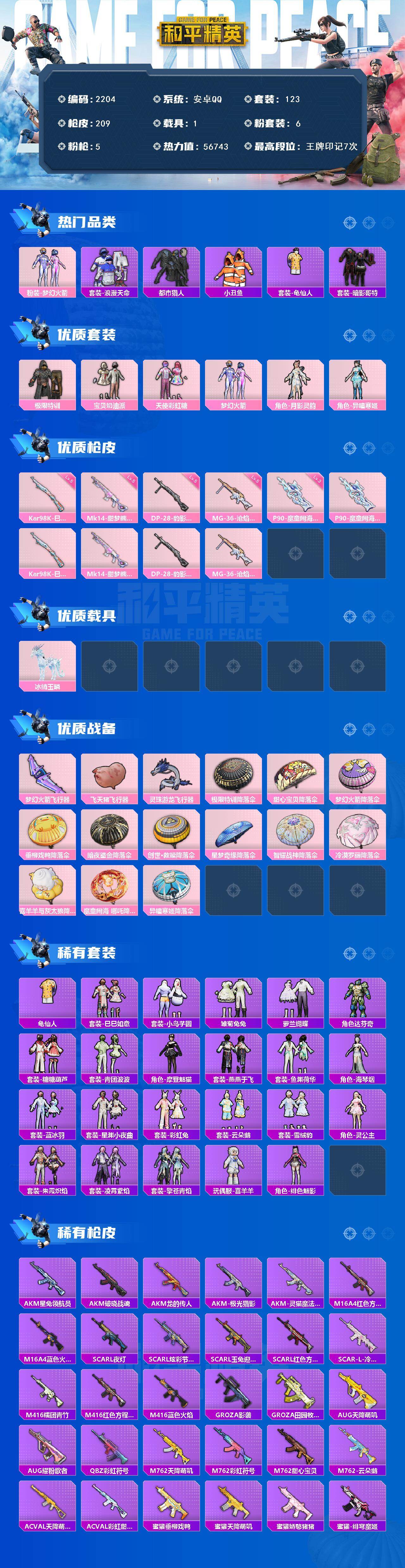 1载具-123套装-209呛皮-123套装/呛械5/装备223/载具1/战备143/王牌印记7/热力值56743/三级p90-魔童闹海 敖丙/五级kar98k-巳巳如意/五级mk14-甜梦熊击/五级dp-28-豹影疾电/五级mg-36-沧焰双生/粉装-梦幻火箭/套装-浪漫天命/都市猎人/小丑鱼/套装-龟仙人/套装-暗影哥特/极限特训/宝贝奶油派/天使彩虹糖/梦幻火箭/月影灵韵/角色-异瞳寒姬/冰绡玉鳞/p90-魔童闹海 敖丙