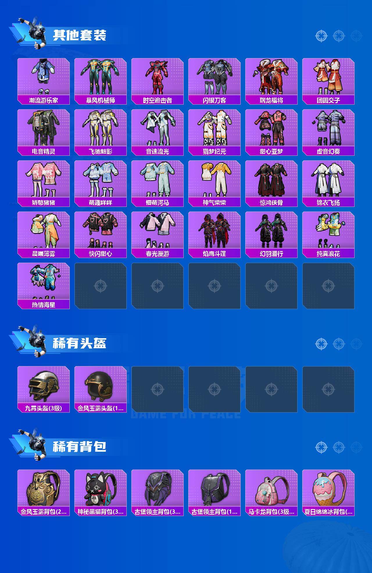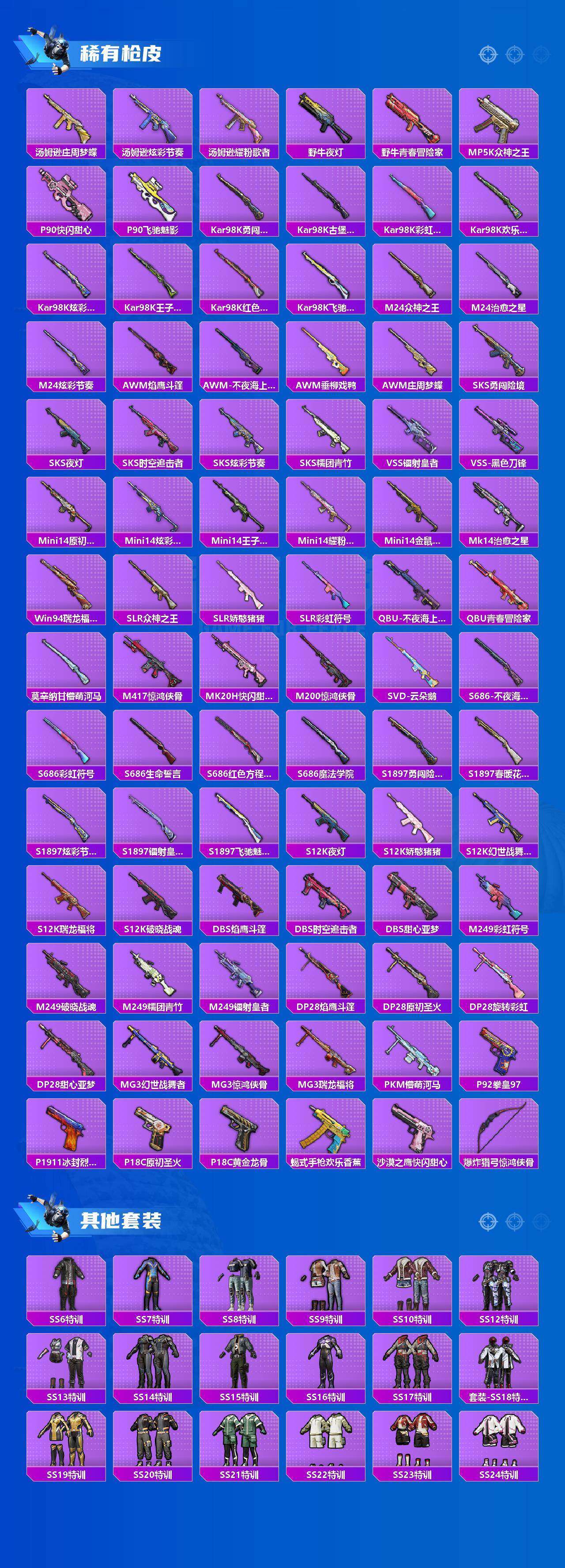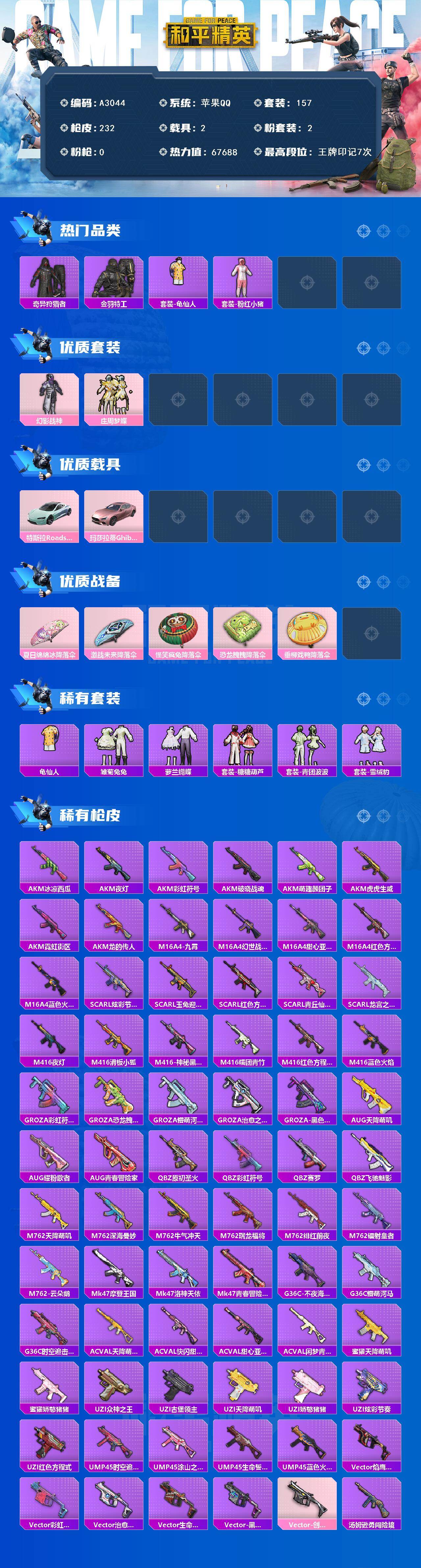 [15449615]苹果 【小号/玛莎拉蒂ghibli(粉)】手q-2粉装-0特效呛-2载具-0粉色飞行器-67688热力值-7王牌印记-157套装-232呛皮 【热门品类】:套装-奇异狩猎者,套装-金羽特工,套装-龟仙人,套装-粉红小猪 【粉色套装】:粉装-幻影战神,粉装-庄周梦蝶 【粉色载具】:特斯拉roadster(水滴蓝),玛莎拉蒂ghibli(粉) 【粉色降落伞】:夏日绵绵冰降落伞,激战未来降落伞,怪笑疯兔降落伞,恐龙拽拽降落伞,垂柳戏鸭降落伞 【稀有套装】:套装-龟仙人,套装-雏菊兔兔,套装-萝兰蝴蝶,套装-糖糖葫芦,套装-青团波波,套装-雪绒豹 【稀有呛皮】:akm-冰凉西瓜,akm-夜灯,akm-彩虹符号,akm-破晓战魂,akm-萌趣颜团子,akm-虎虎生威,akm-霓虹街区,akm-龙的传人,m16a4-九霄,m16a4-幻世战舞者,m16a4-甜心亚梦,m16a4-红色方程式,m16a4-蓝色火焰,scar-l-炫彩节奏,scar-l-玉兔迎春,scar-l-红色方程式,scar-l-青丘仙客,scar-l-龙宫之主,m416-夜灯,m416-滑板小狐,m416-神秘黑猫,m416-糯团青竹,m416-红色方程式,m416-蓝色火焰,groza-彩虹符号,groza-恐龙拽拽,groza-懵萌河马,groza-治愈之星,groza-黑色刀锋,aug-天降萌叽,aug-耀粉歌者,aug-青春冒险家,q-原初圣火,q-彩虹符号,q-赛罗,q-飞驰魅影,m762-天降萌叽,m762-深海曼妙,m762-牛气冲天,m762-瑞龙福将,m762-绯红前夜,m762-镭射皇者,m762-云朵鹅,mk47-摩登王国,mk47-洛神天依,mk47-青春冒险家,g36c-不夜海上花,g36c-懵萌河马,g36c-时空追击者,ac-val-天降萌叽,ac-val-快闪甜心,ac-val-甜心亚梦,ac-val-闲梦青缨,蜜獾-天降萌叽,蜜獾-娇憨猪猪,uzi-众神之王,uzi-古堡领主,uzi-天降萌叽,uzi-娇憨猪猪,uzi-炫彩节奏,uzi-红色方程式,ump45-时空追击者,ump45-涂山之恋,ump45-生命誓言,ump45-蓝色火焰,vect-焰鹰斗篷,vect-彩虹符号,vect-治愈之星,vect-生命誓言,vect-黑色刀锋,