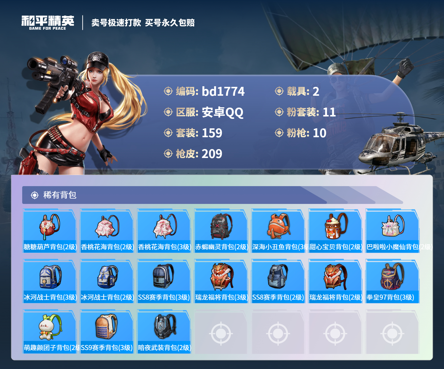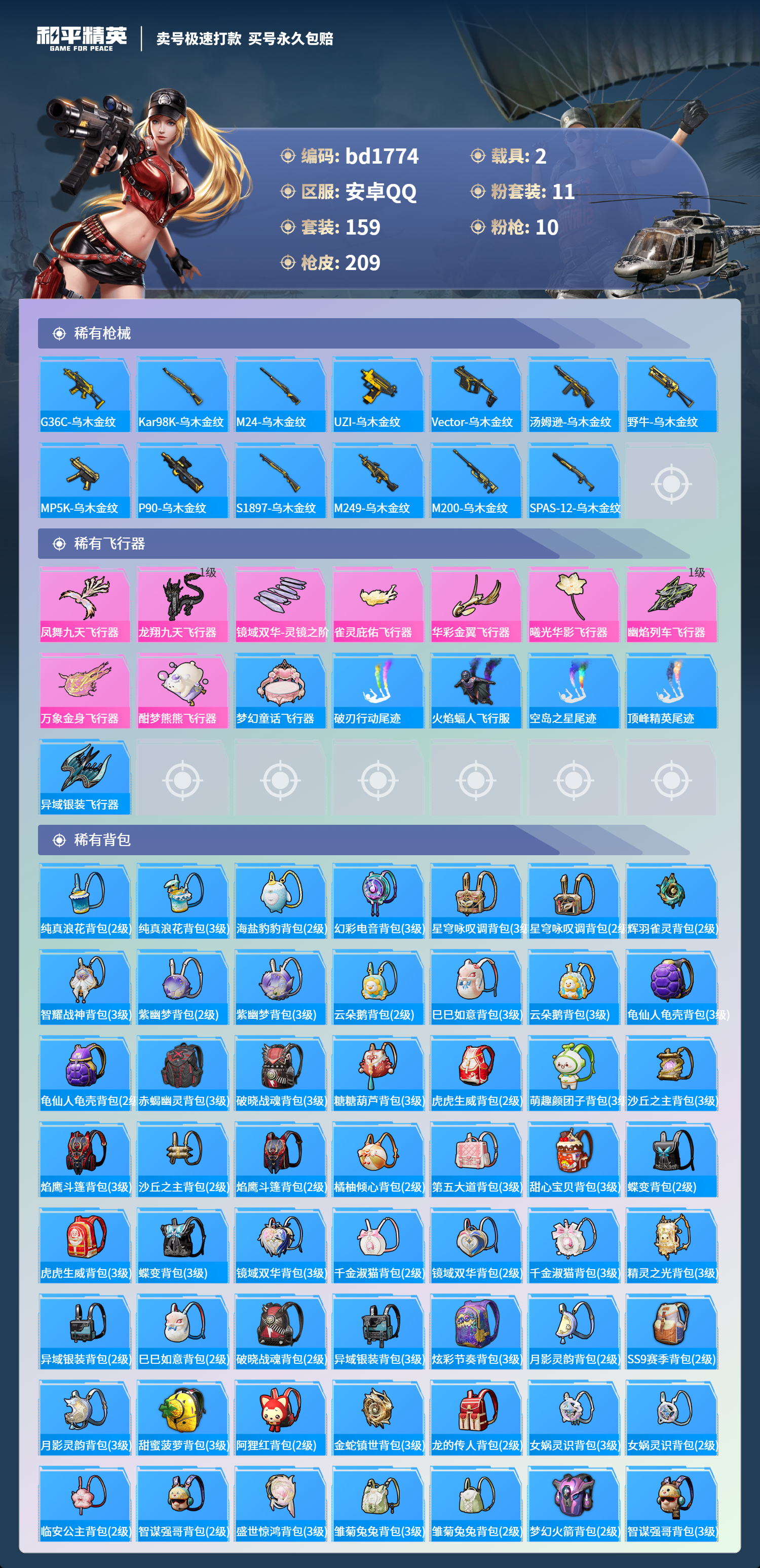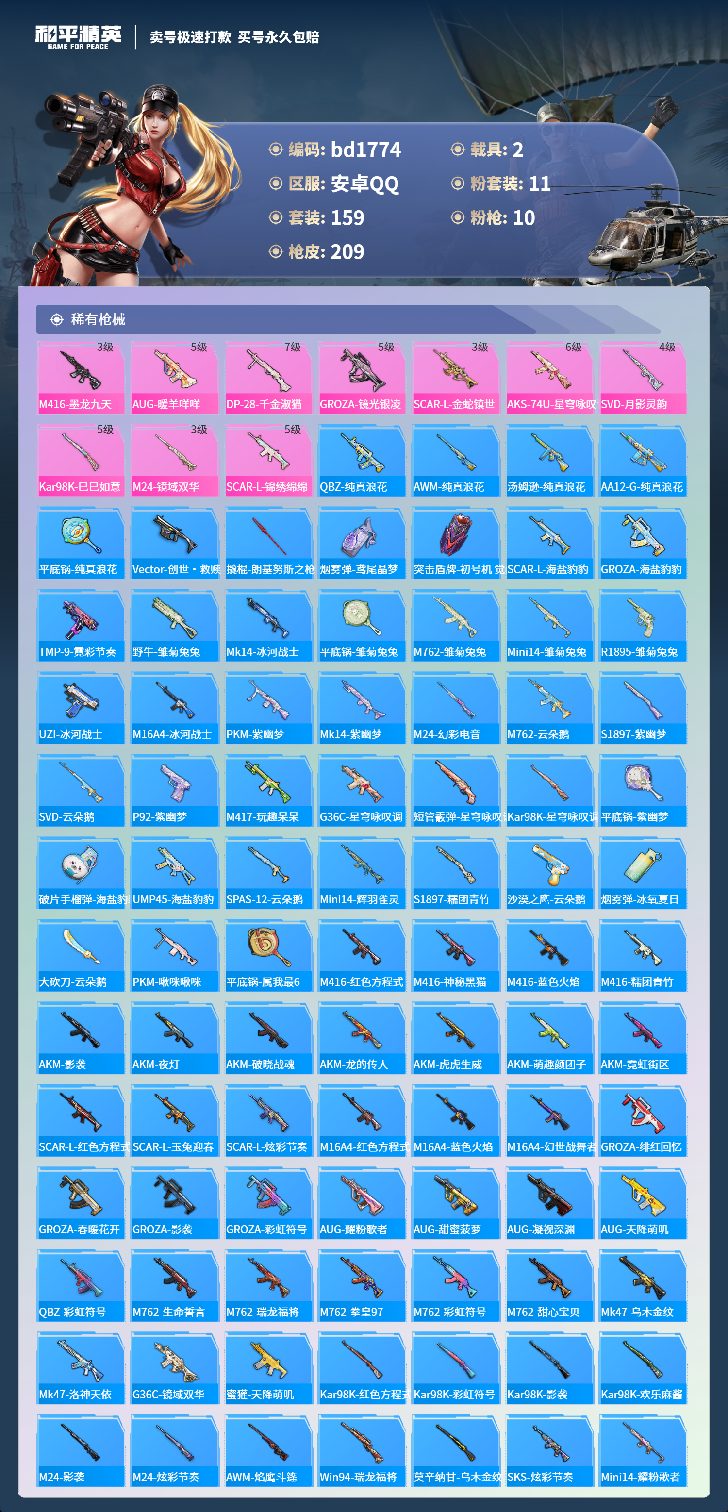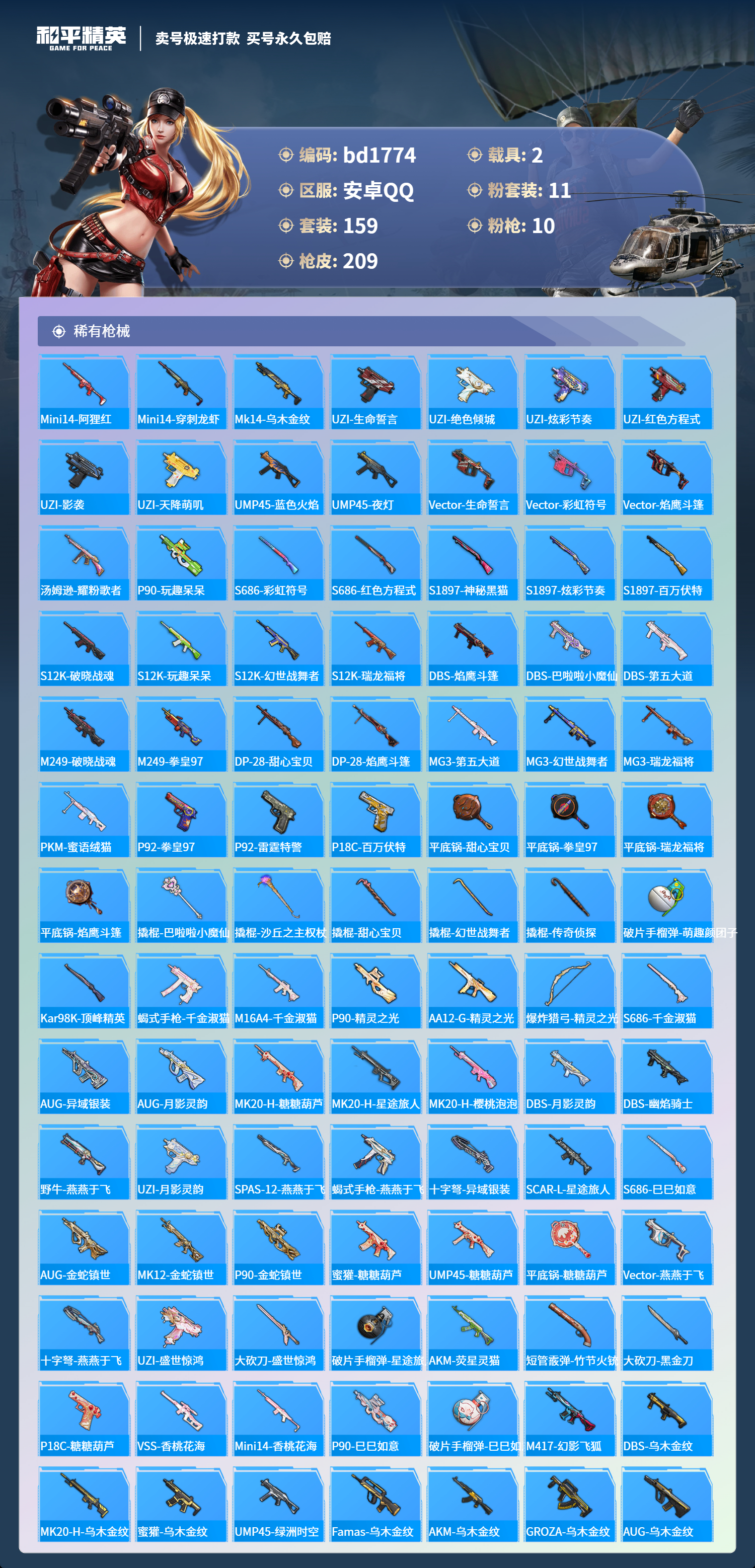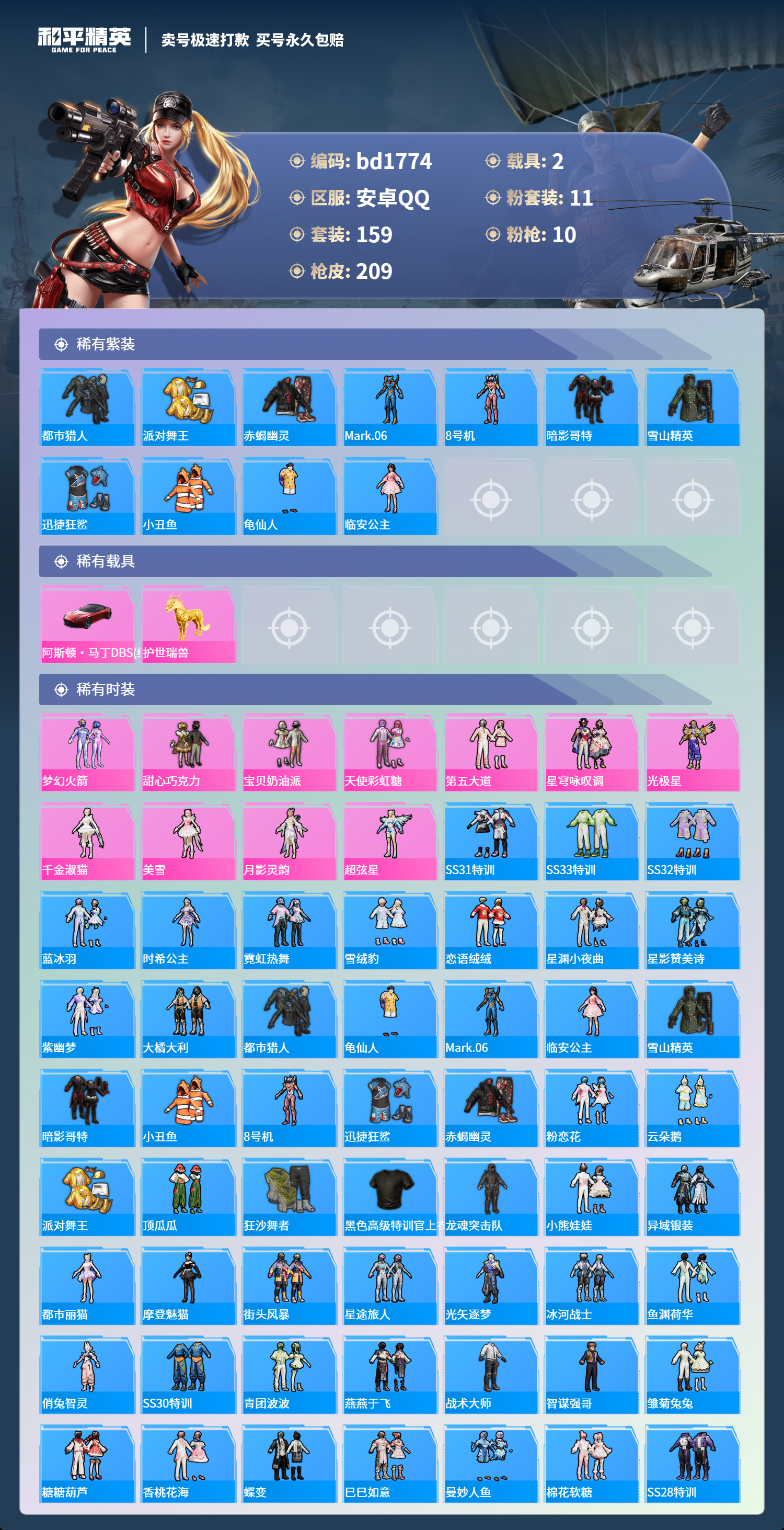 2载具-159套装-209呛皮-1774/11粉/10呛/2车/8号机/mark.06/巧克力三姐妹/派对舞王/赤蝎幽灵/都市猎人/暗影哥特/梦幻火箭/第五大道/超弦星/光极星//scar-l-金蛇镇世[3级]/m416-墨龙九天[