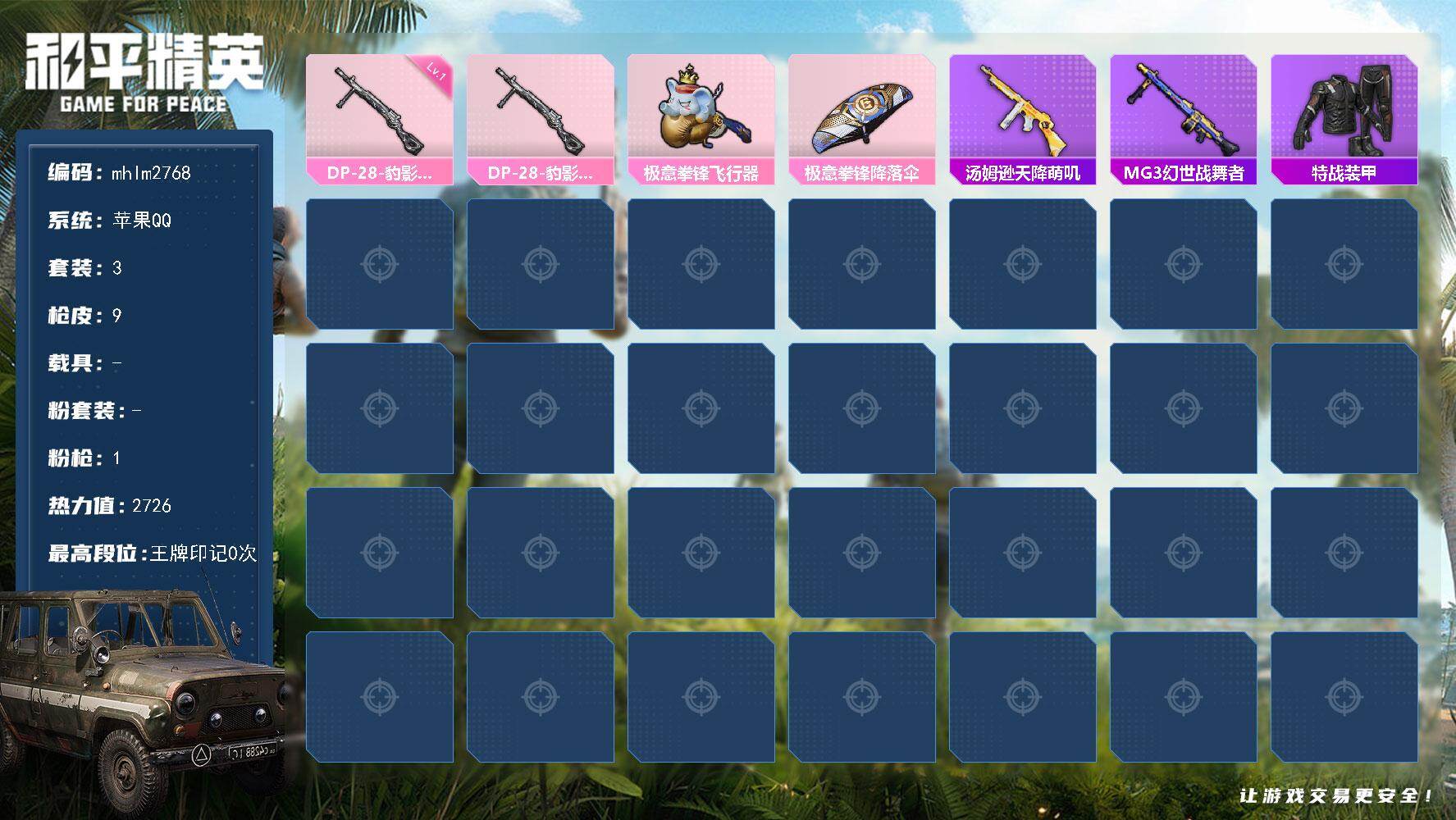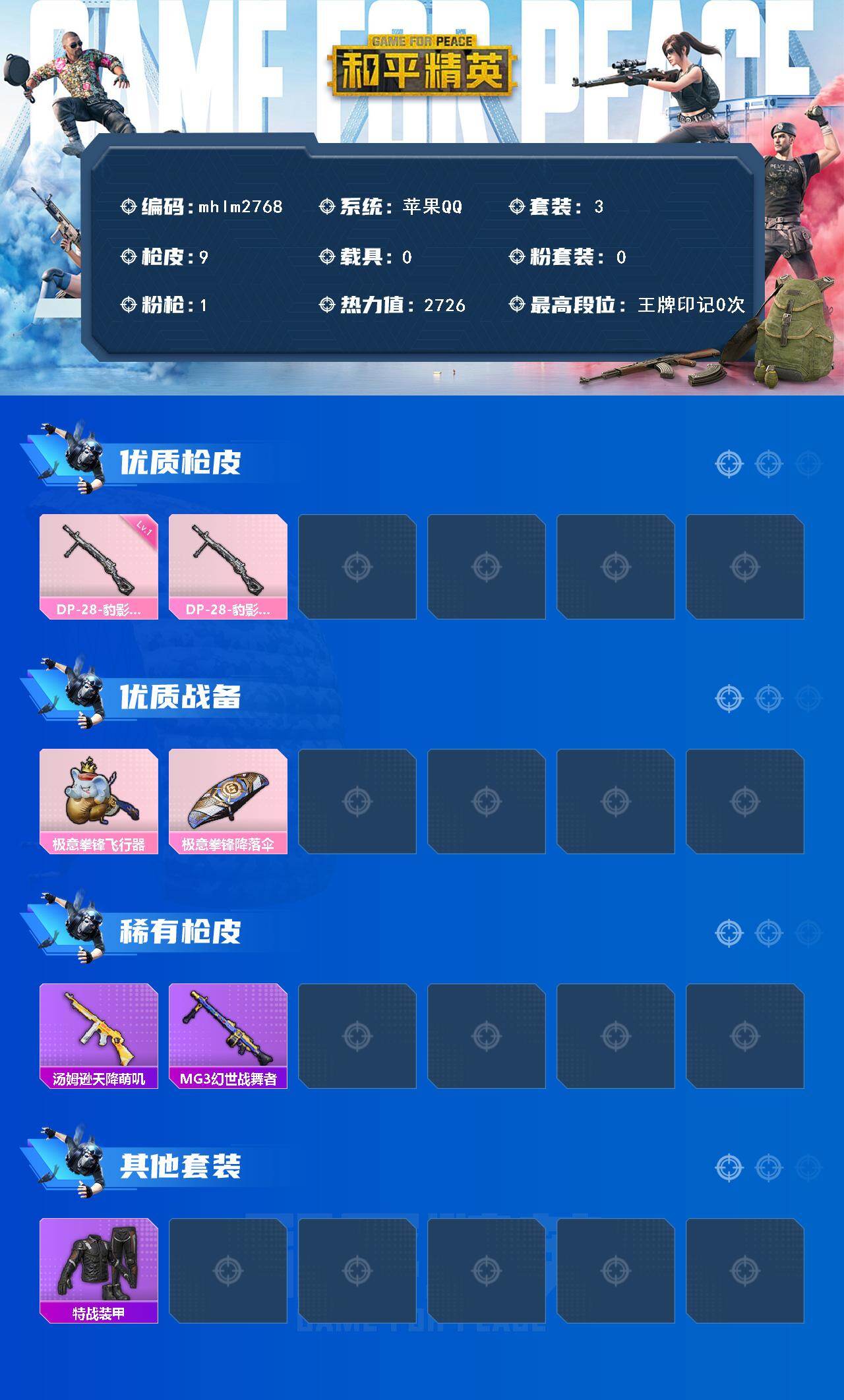 [15452406]【mhlm2768】苹果 手q-0粉装-1特效呛-0载具-1粉色飞行器-2726热力值-0王牌印记-3套装-9呛皮 【粉色呛皮等级】:dp-28-豹影疾电一级 【粉色呛皮】:dp-28-豹影疾电 【粉色飞行器】:极意拳锋飞行器 【粉色降落伞】:极意拳锋降落伞 【稀有呛皮】:汤姆逊-天降萌叽,mg3-幻世战舞者 【其他套装】:套装-特战装甲 【营地id】:985962330