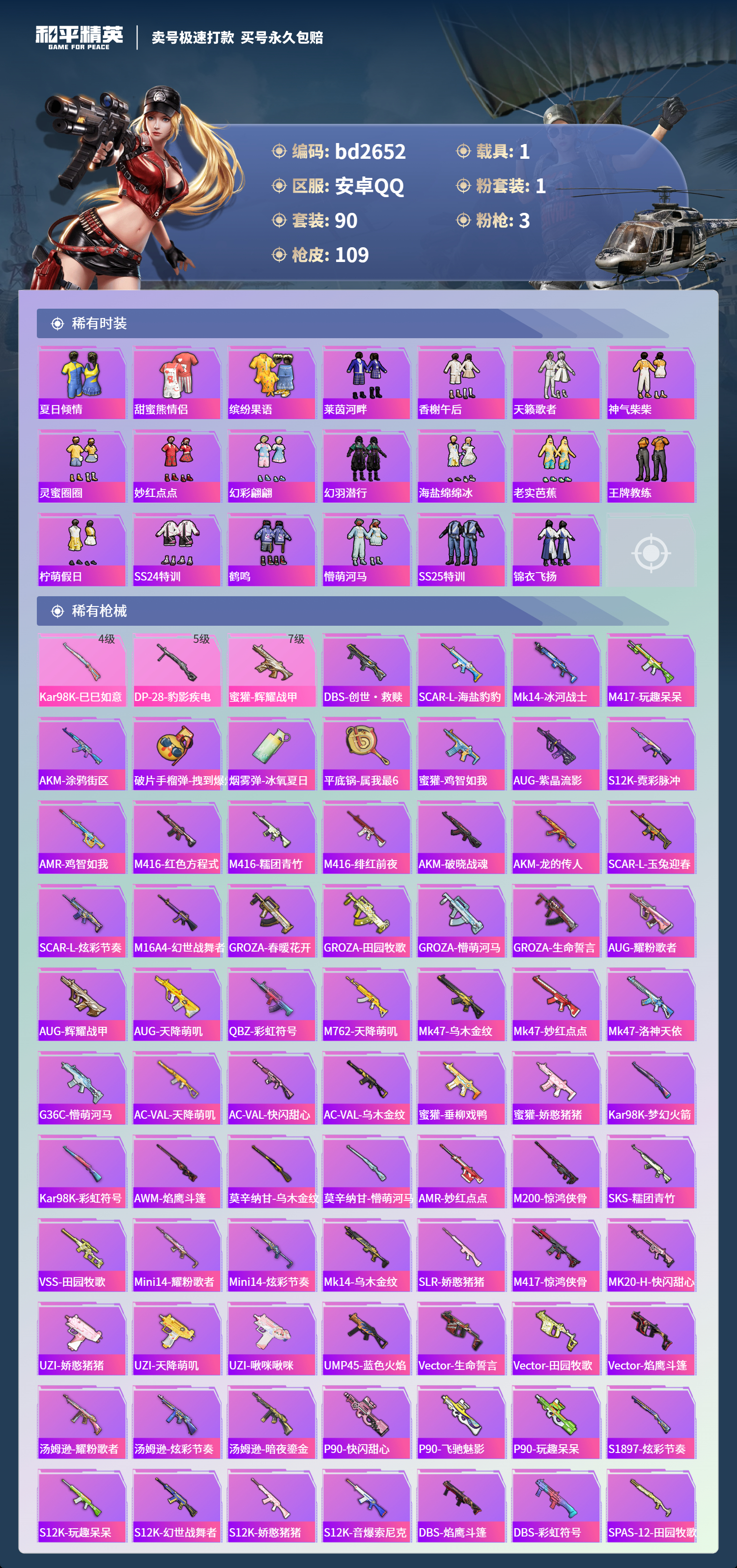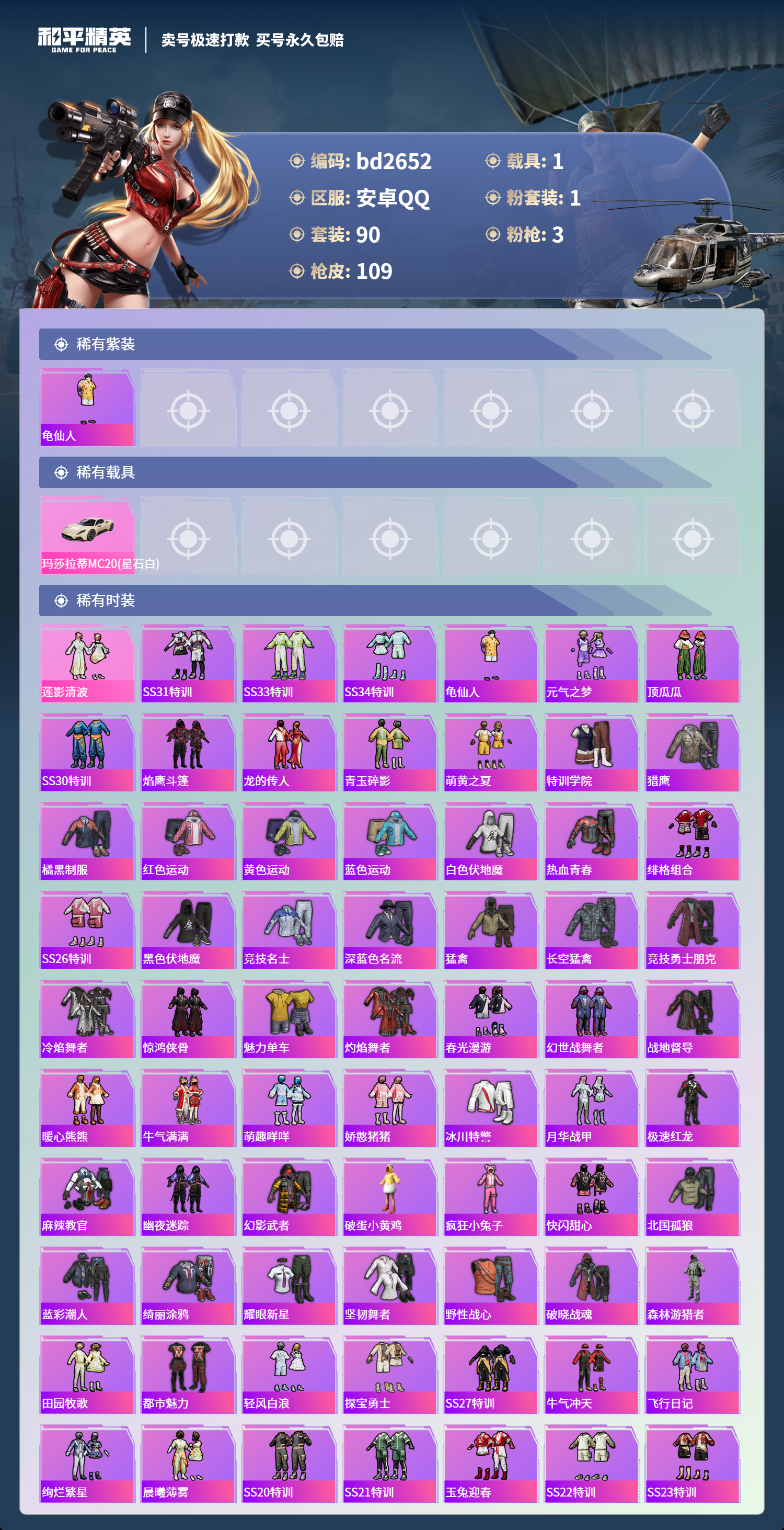 1载具-90套装-109呛皮-bd2652安卓手q-5王牌印记-1粉装-3特效呛-1载具-36374热力值-90套装-109呛皮-0卓越印记-0传奇印记