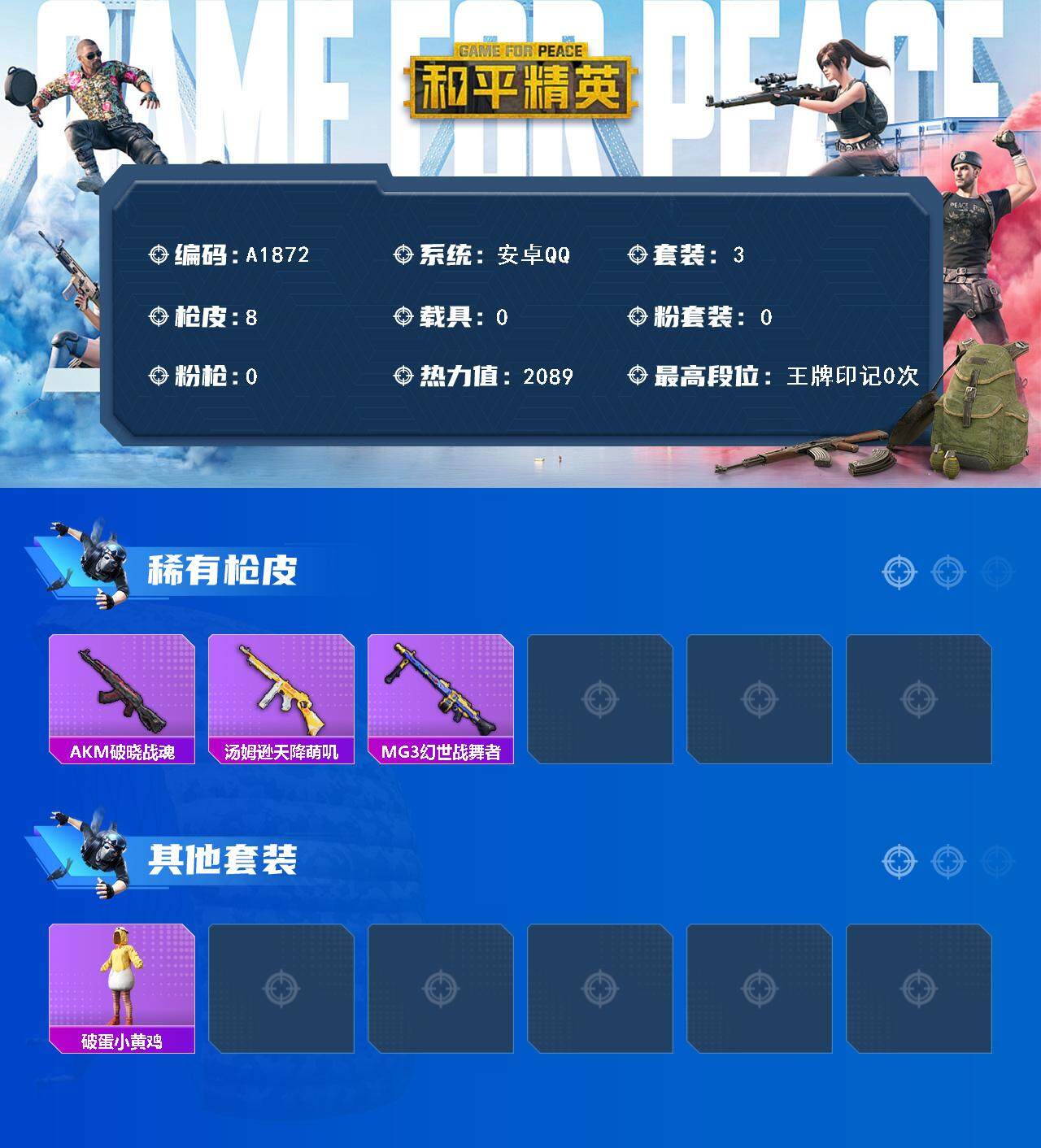 [15454438]安卓【小号】 手q-0粉装-0特效呛-0载具-0粉色飞行器-2089热力值-2王牌印记-3套装-8呛皮 【稀有呛皮】:akm-破晓战魂,汤姆逊-天降萌叽,mg3-幻世战舞者 【其他套装】:套装-破蛋小黄鸡 【营地id】:1021693833