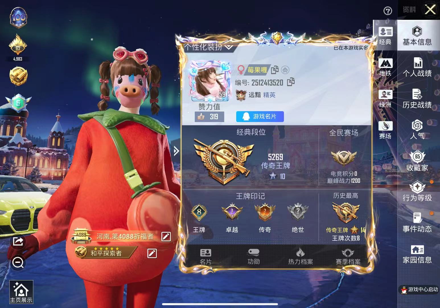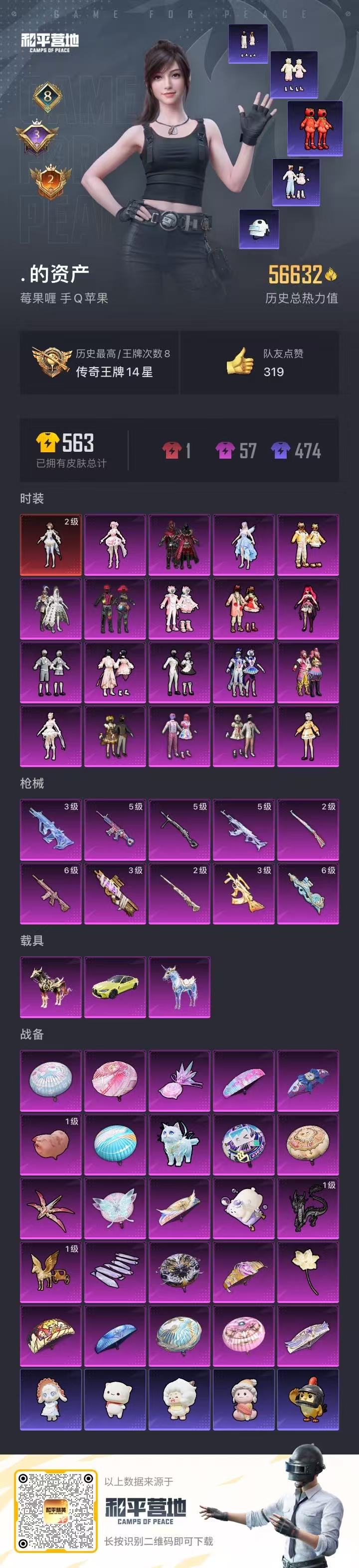 【和平精英】【txhp5949】19粉装,10特效呛,3载具,历史最高段位:传奇王牌14星 王牌印记8次 热力值:56632,96套装,130呛械,219装备,94战备;套装:镜域双华-欧若拉,套装-甜心巧克力,套装-宝贝奶油派,套装-天使彩虹糖,套装-缤纷油彩,套装-放客神游,套装-星空之魅,套装-冰霜白皇,套装-炙焰红王,套装-岚岚物语,套装-暖熊萌萌,套装-甜梦小狐,套装-冰川幽秘,套装-甜蜜草莓,角色-呆萌星弥,角色-星梦奇缘,套装-桃粉嫣然,角色-千金淑猫,角色-绯穹魔姬,角色-奇迹舞步 美雪,套装-特训学院,套装-竞技名士,套装-长空猛禽,套装-完美偶像,套装-魅力单车,套装-破蛋小黄鸡,套装-战术大师,套装-耀粉歌者,套装-ss15特训,套装-红熊茄茄,套装-俏皮奶喵,套装-暖心橘喵,套装-莱茵河畔,套装-白兰地假日,套装-糯粉咩咩,套装-王牌教练,套装-青玉碎影,套装-软软马卡龙,套装-香桃花海,套装-冰河战士,套装-奶油梦幻熊,角色-极地流光,角色-粉雾星云,套装-蝶变,角色-兔兔小魔女,套装-湖畔霞光,套装-粉日山川,套装-小熊娃娃,套装-ss29特训,套装-雏菊兔兔,套装-萝兰蝴蝶,套装-异域银装,角色-都市丽猫,套装-星途旅人,角色-俏兔智灵,套装-ss30特训,套装-青团波波,套装-棉花软糖,角色-夜瞳黯灵,套装-糖糖葫芦,套装-摩登天骄,套装-ss31特训,套装-鱼渊荷华,套装-燕燕于飞,套装-晶灵使者,套装-紫幽梦,套装-粉恋花,套装-晶辉守护,套装-ss33特训,套装-云朵鹅,套装-ss32特训,套装-彩虹兔,套装-蓝冰羽,套装-顶瓜瓜,套装-雪绒豹,套装-狂鲨锋刃,套装-大橘大利,套装-极速光影,角色-鲛海歌灵,套装-星渊小夜曲,套装-炫彩糖果,套装-元气之梦,套装-ss34特训,套装-擎苍青焰,套装-朱霞炽焰,套装-凌霄紫焰,套装-薄荷星砂,套装-ss35特训,套装-午间小调,套装-秘语星愿,套装-风迹短诗,套装-琴音绮想,套装-画境星梦,套装-书海巡游,套装-ss36特训,套装-雪国风尚;呛皮:3级aug-星梦奇缘,aug-兔兔小魔女,aug-异域银装,aug-冰晶雪宝,arx-凌霄紫焰,5级akm-幻海仙踪,mk47-乌木金纹,mk47-风迹短诗,m16a4-冰河战士,m762-甜心宝贝,m762-彩虹甜喵,m762-天降萌叽,m762-雏菊兔兔,m762-云朵鹅,q-洛神天依,famas-墨龙九天,famas-镜域双华,famas-乌木金纹,蜜獾-糖糖葫芦,蜜獾-风迹短诗,蜜獾-乌木金纹,3级groza-精灵之光,groza-奶油梦幻熊,ace32-画境星梦,5级scar-l-童趣迷兔,scar-l-炫彩节奏,ac-val-彩虹甜喵,ac-val-兔兔小魔女,6级m416-心之恋语,m200-仲夏莫吉托,m200-乌木金纹,svd-冷漠罗丽,svd-云朵鹅,amr-墨龙九天,2级m24-镜域双华,m24-幻彩电音,莫辛纳甘-兔兔小魔女,莫辛纳甘-风迹短诗,win94-晶梦幻蝶,win94-乌木金纹,2级kar98k-巳巳如意,slr-金丰海韵,mk20-h-星梦奇缘,mk20-h-糖糖葫芦,mk20-h-狂鲨锋刃,mk20-h-乌木金纹,sks-炫彩节奏,mk14-童趣迷兔,mk14-冰河战士,mk14-紫幽梦,mk14-薄荷星砂,mini14-香桃花海,mini14-雏菊兔兔,mk12-风迹短诗,mk12-乌木金纹,m1加兰德-画境星梦,vss-香桃花海,3级p90-沙丘之主,6级p90-金丰海韵,p90-精灵之光,p90-巳巳如意,p90-乌木金纹,vect-田园牧歌,vect-燕燕于飞,js9-凌霄紫焰,汤姆逊-星梦奇缘,汤姆逊-智耀战神,汤姆逊-灵猫魔法师,野牛-沙丘之主,野牛-奶油梦幻熊,野牛-雏菊兔兔,野牛-燕燕于飞,uzi-影袭,uzi-冰河战士,uzi-月影灵韵,uzi-炫彩糖果,aks-74u-鸡智如我,aks-74u-乌木金纹,ump45-糖糖葫芦,mp5k-画境星梦,s686-生命誓言,spas-12-燕燕于飞,spas-12-狂鲨锋刃,spas-12-云朵鹅,spas-12-乌木金纹,dbs-彩虹甜喵,dbs-第五大道,dbs-幻彩电音,dbs-月影灵韵,dbs-风迹短诗,dbs-乌木金纹,aa12-g-精灵之光,aa12-g-画境星梦,s1897-紫幽梦,m249-糯团青竹,m249-沙丘之主,m249-金丰海韵,m249-绯穹魔姬,m249-冰晶雪宝,mg-36-凌霄紫焰,mg-36-薄荷星砂,mg3-幻世战舞者,mg3-镜域双华,pkm-紫幽梦,5级dp-28-豹影疾电,dp-28-甜心宝贝,r45-幻彩电音,r1895-雏菊兔兔,p92-紫幽梦,p92-凌霄紫焰,蝎式手呛-奶油梦幻熊,蝎式手呛-金丰海韵,蝎式手呛-燕燕于飞,沙墨之鹦-云朵鹅,信号呛-奇迹舞步,p18c-糖糖葫芦,平底锅-雏菊兔兔,平底锅-糖糖葫芦,平底锅-紫幽梦,平底锅-凌霄紫焰,平底锅-画境星梦,撬棍-甜心宝贝,撬棍-沙丘之主权杖,大砍刀-云朵鹅,十子怒-燕燕于飞,十子怒-异域银装,盐雾蛋-冰氧夏日,破片手留单-巳巳如意,破片手留单-爆破雪人,铝热弹-炫彩糖果;载具:宝马m4圣保罗黄,星梦玉骢,黑曜夜骑;降落伞:镜域双华-灵镜之阶,曦光华影飞行器,酣梦熊熊飞行器,祥瑞起舞飞行器,灵猫魔法师飞行器,炫彩糖果飞行器,沙丘之主天马,龙翔九天飞行器,飞天猪飞行器,异域银装飞行器,狂鲨锋刃飞行器,登顶巅峰飞行器; 详情看图【极品精氪女号】8印记-5.6w热力-1红-19粉-10特-3车 2级欧若拉/三巧/小狐/甜蜜草莓/猪妹/暖熊/洋葱头/岚岚物语/千金淑猫/放客/番茄/咩咩/马卡龙/奶油梦幻熊 星梦/沙丘之主/镜域双华/精灵之梦/恋语/童趣 星空马/黑马