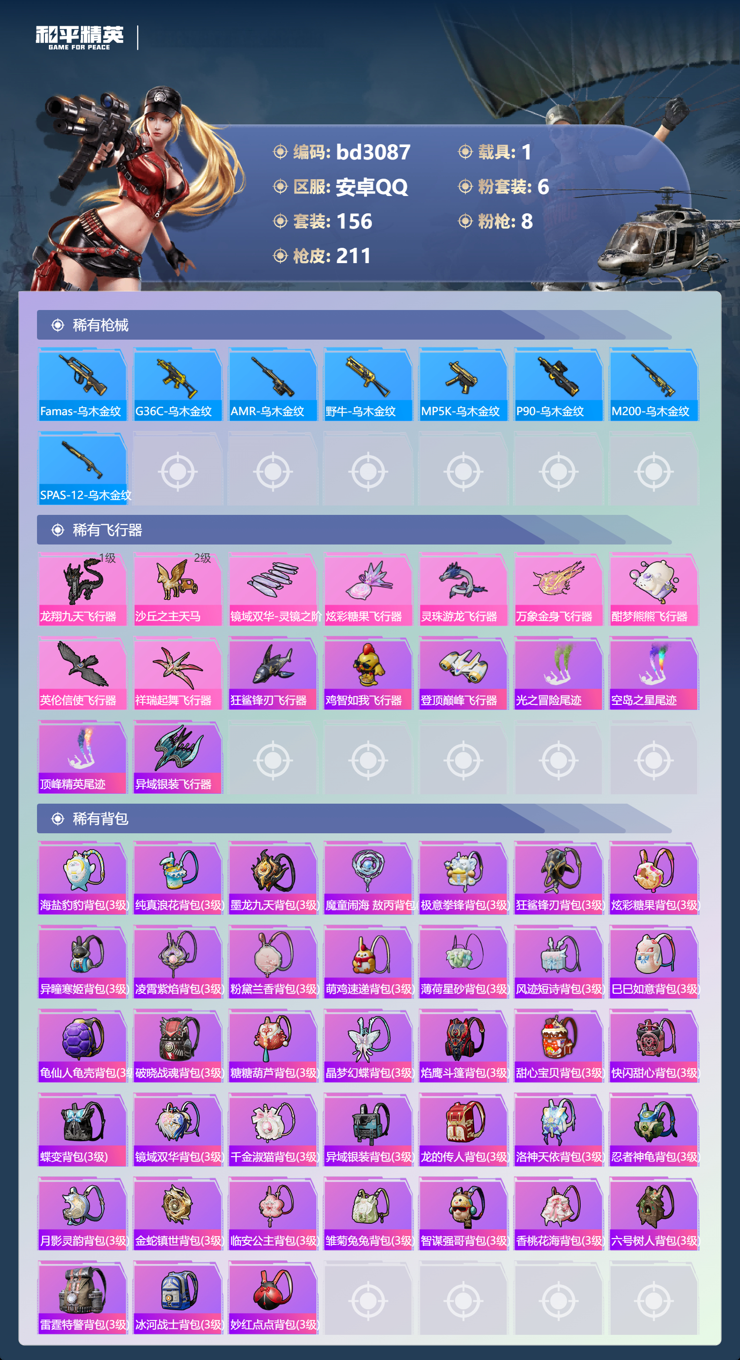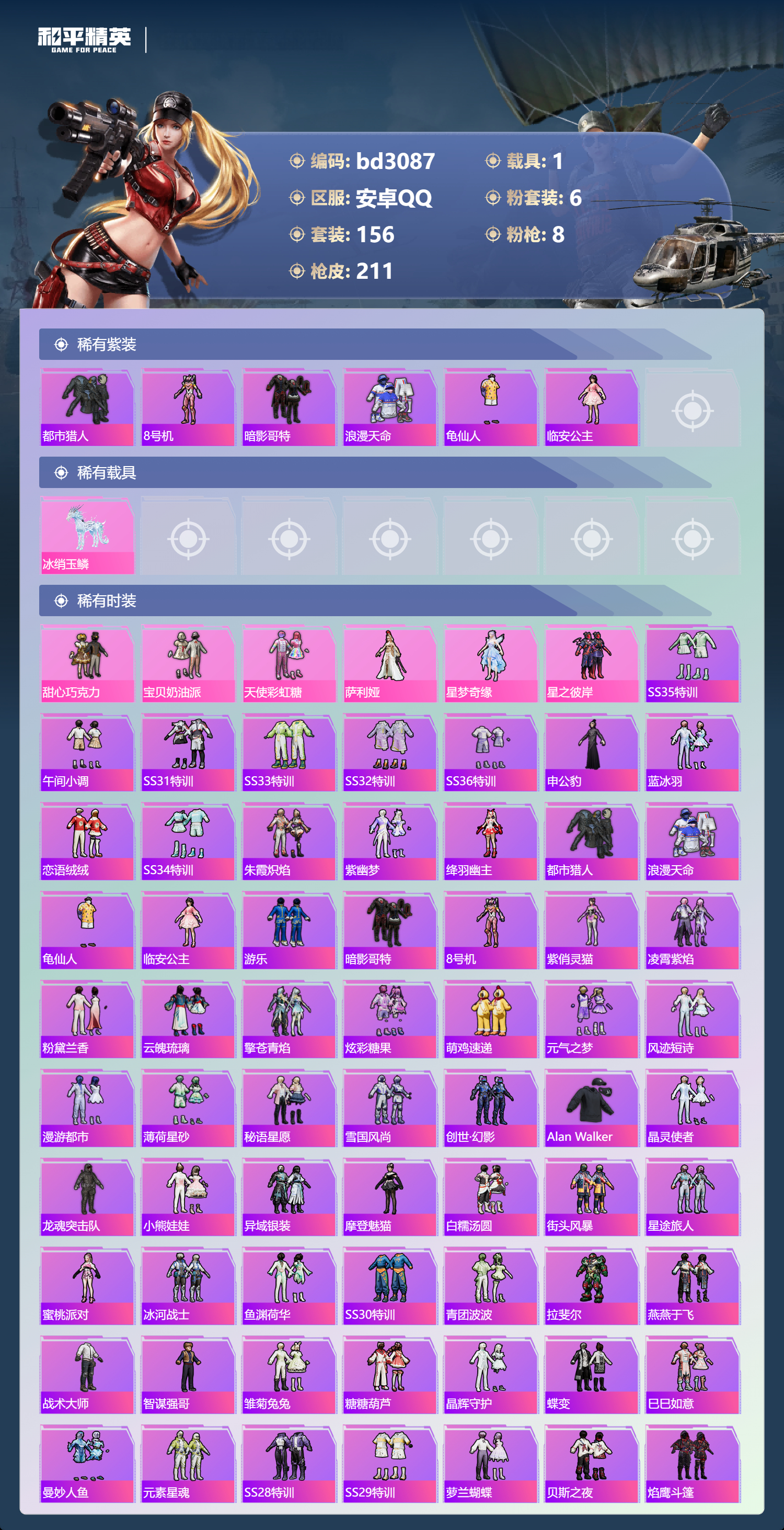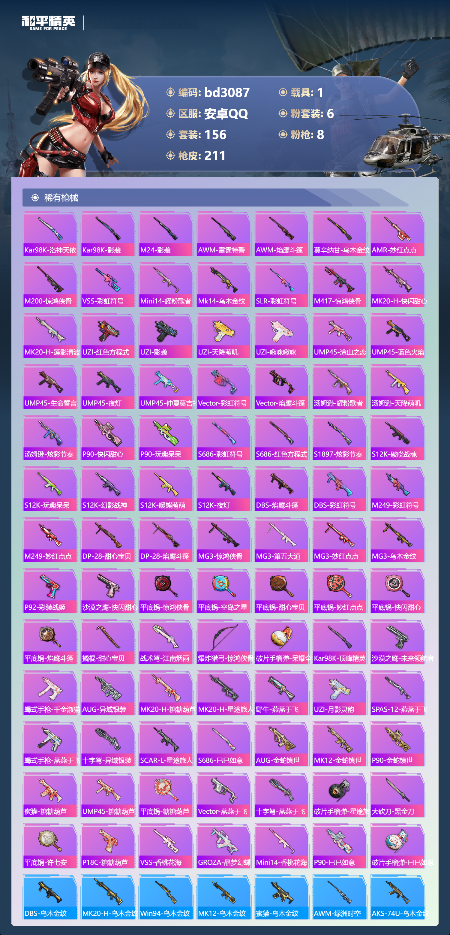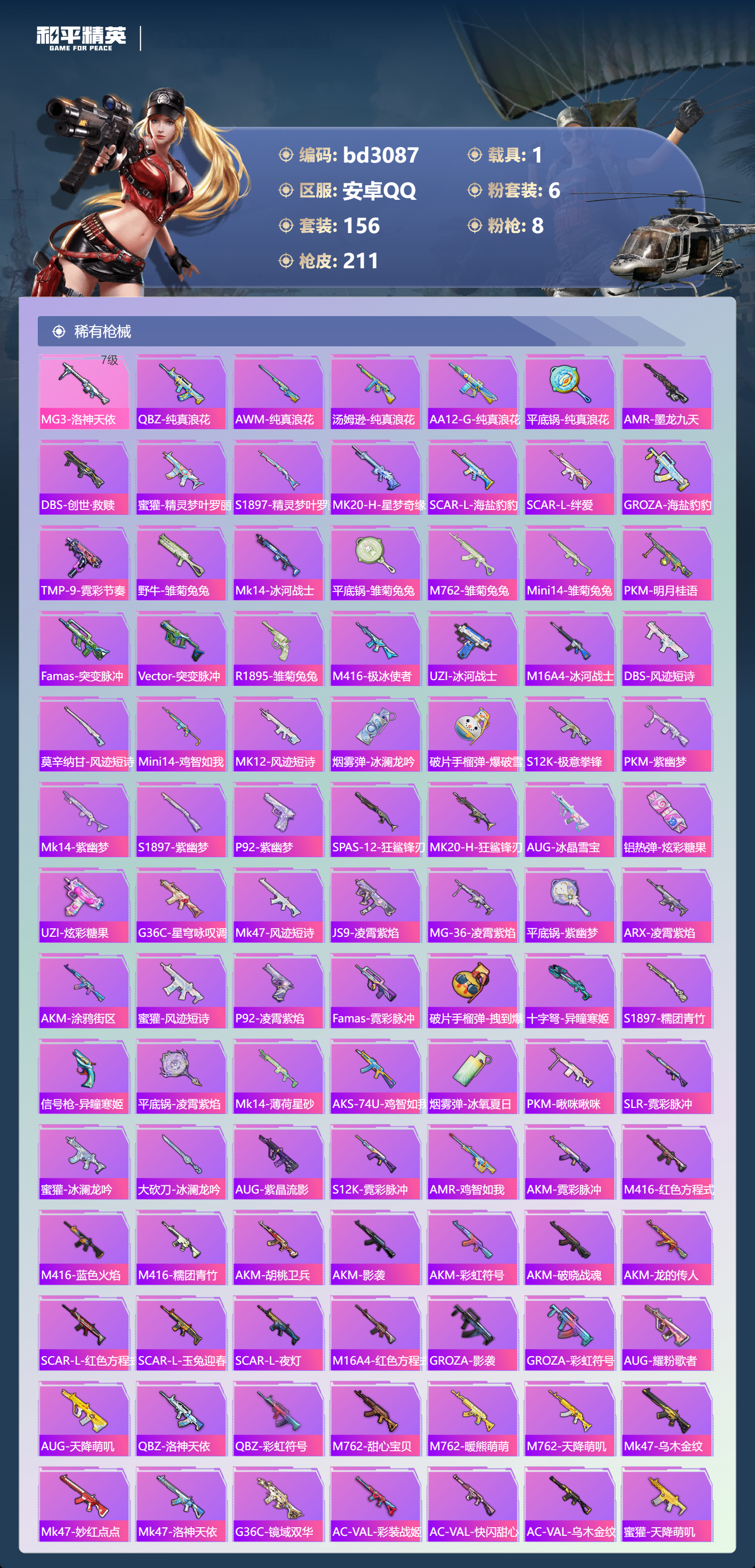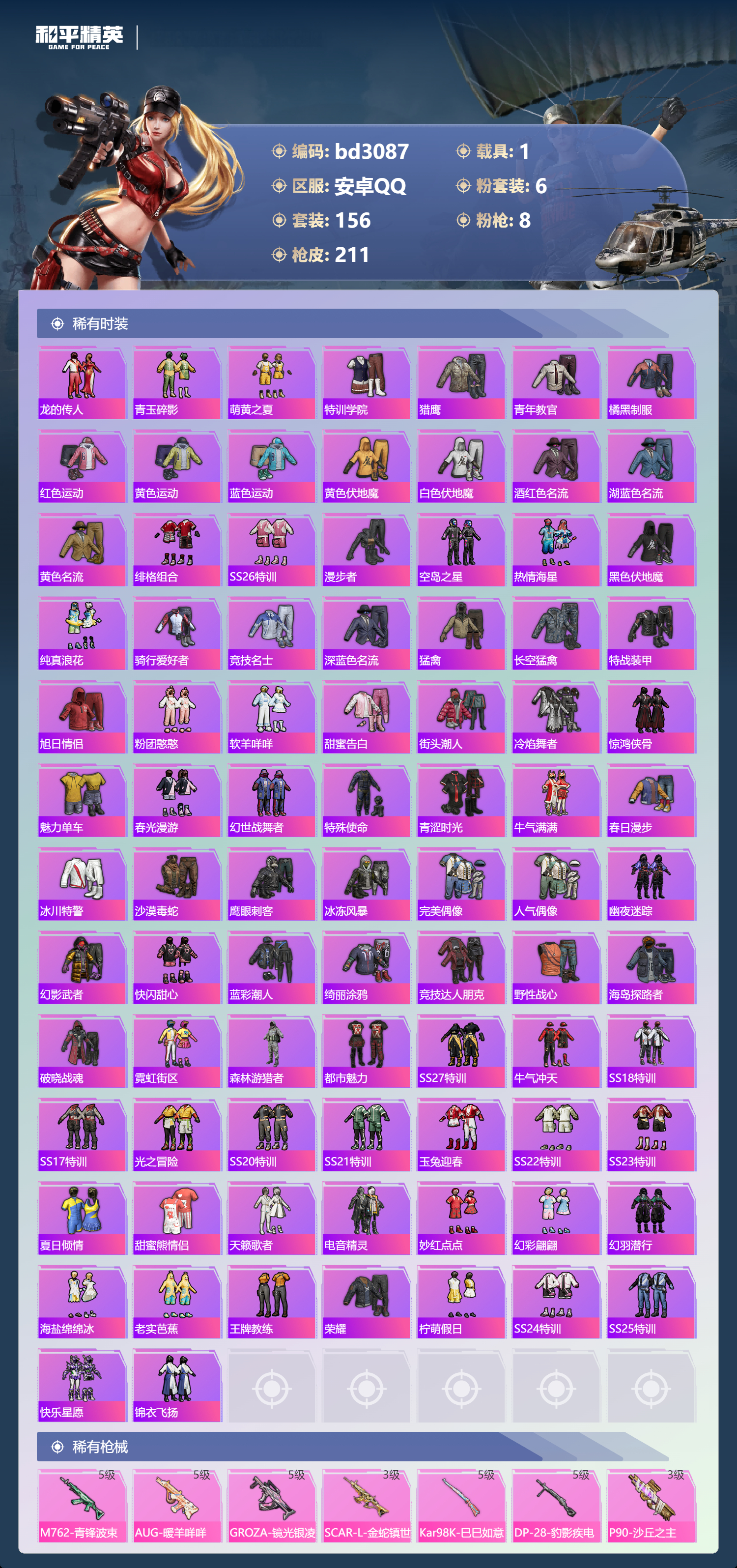 1载具-156套装-211呛皮-安卓手q-6王牌印记-6粉装-8特效呛-1载具-67809热力值-156套装-211呛皮-3卓越印记-1传奇印记【6粉装】套装-天使彩虹糖角色-萨利娅套装-宝贝奶油派套装-星之彼岸套装-甜心巧克力角色-星梦奇缘【8特效呛】m762-青锋波束/5级aug-暖羊咩咩/5级kar98k-巳巳如意/5级scar-l-金蛇镇世/3级p90-沙丘之主/3级groza-镜光银凌/5级mg3