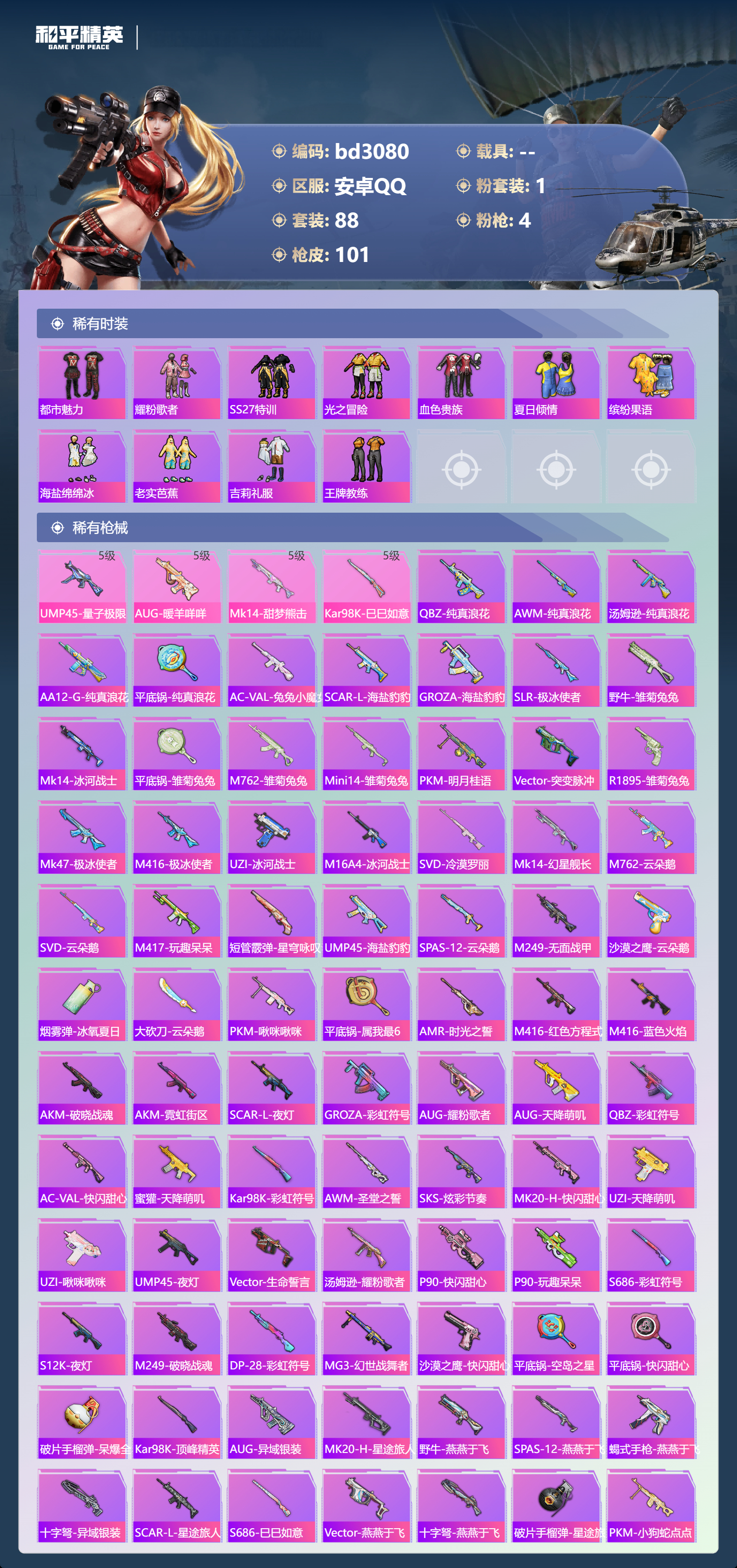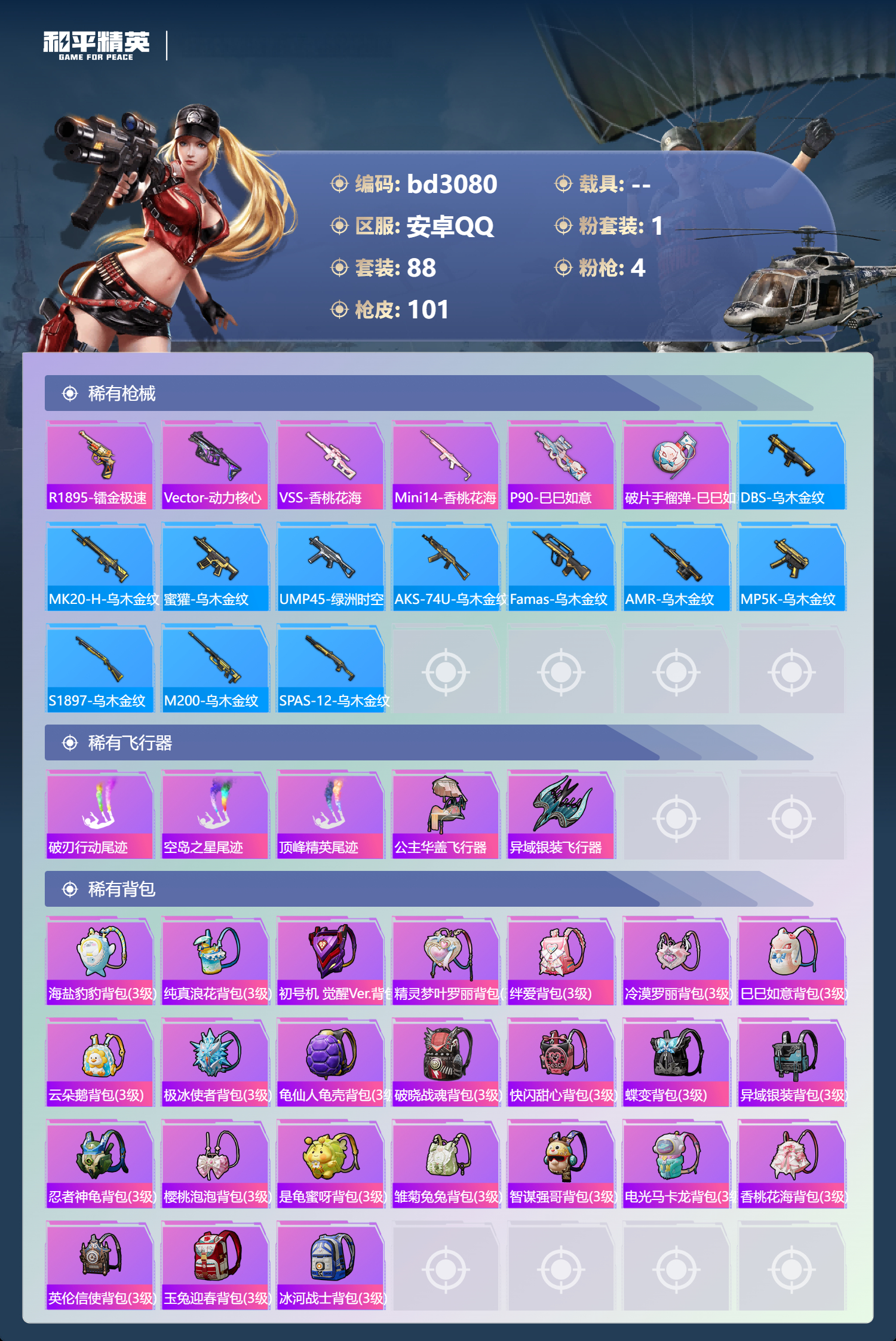 0载具-88套装-101呛皮-安卓手q-4王牌印记-1粉装-4特效呛-29614热力值-88套装-101呛皮-2卓越印记【1粉装】套装-幻彩电音【4特效呛】ump45-量子极限/5级aug-暖羊咩咩/5级mk14-甜梦熊击/5级kar98k-巳巳如意/5级【3稀有紫装】8号机深海小丑鱼龟仙人【88稀有时装】幻彩电音ss31特训ss33特训ss32特训雪绒豹恋语绒绒星影赞美诗ss34特训大橘大利龟仙人