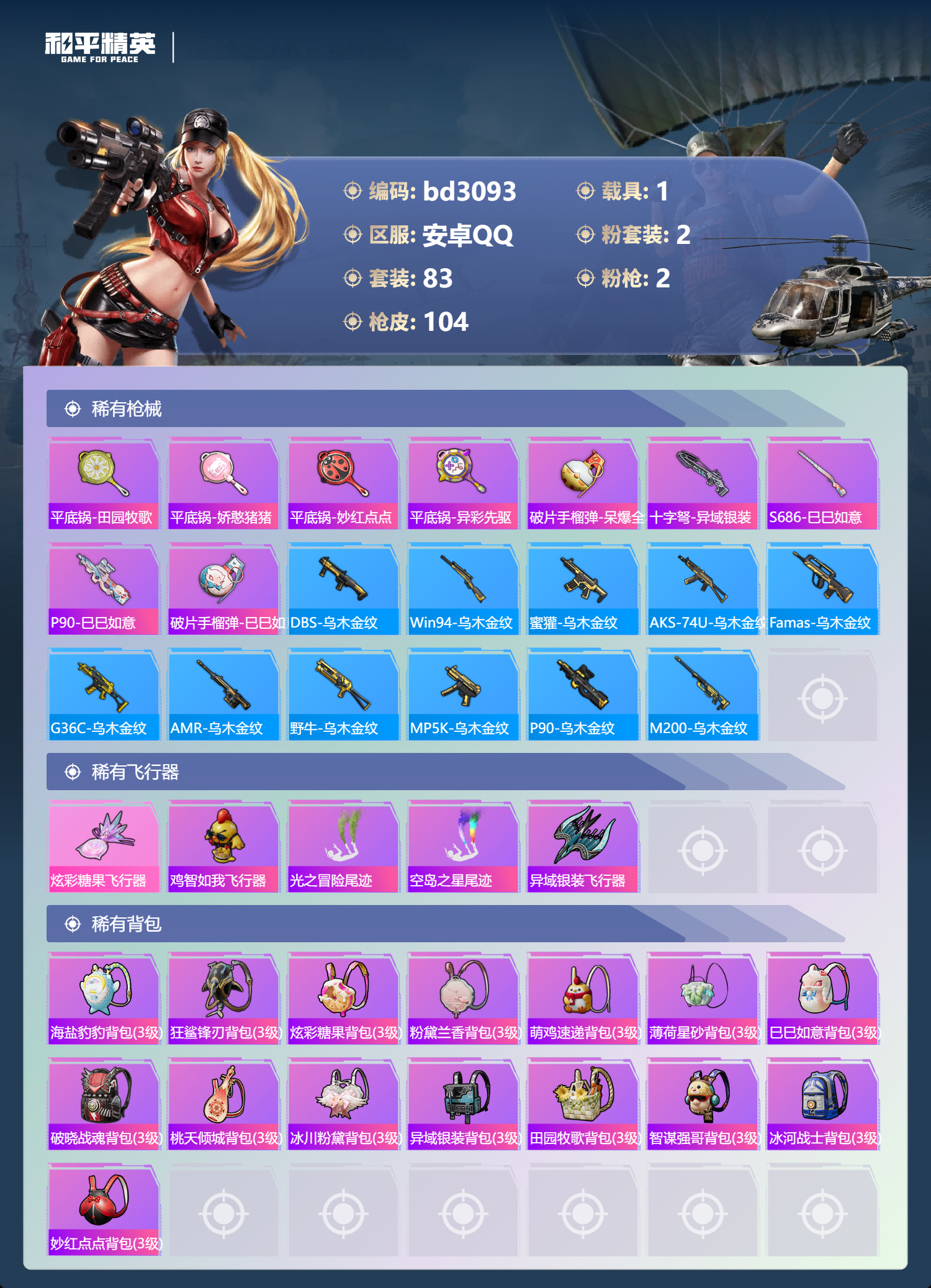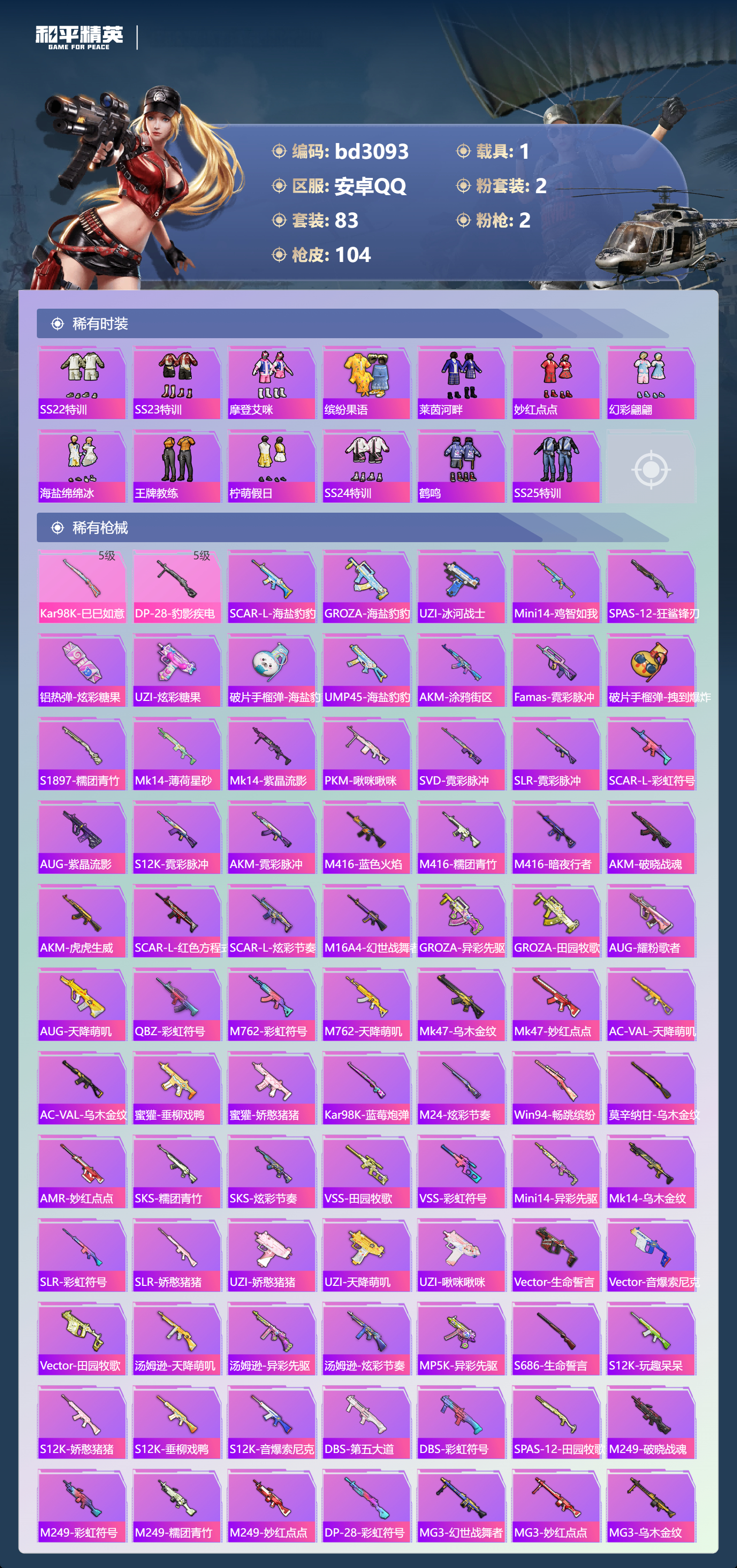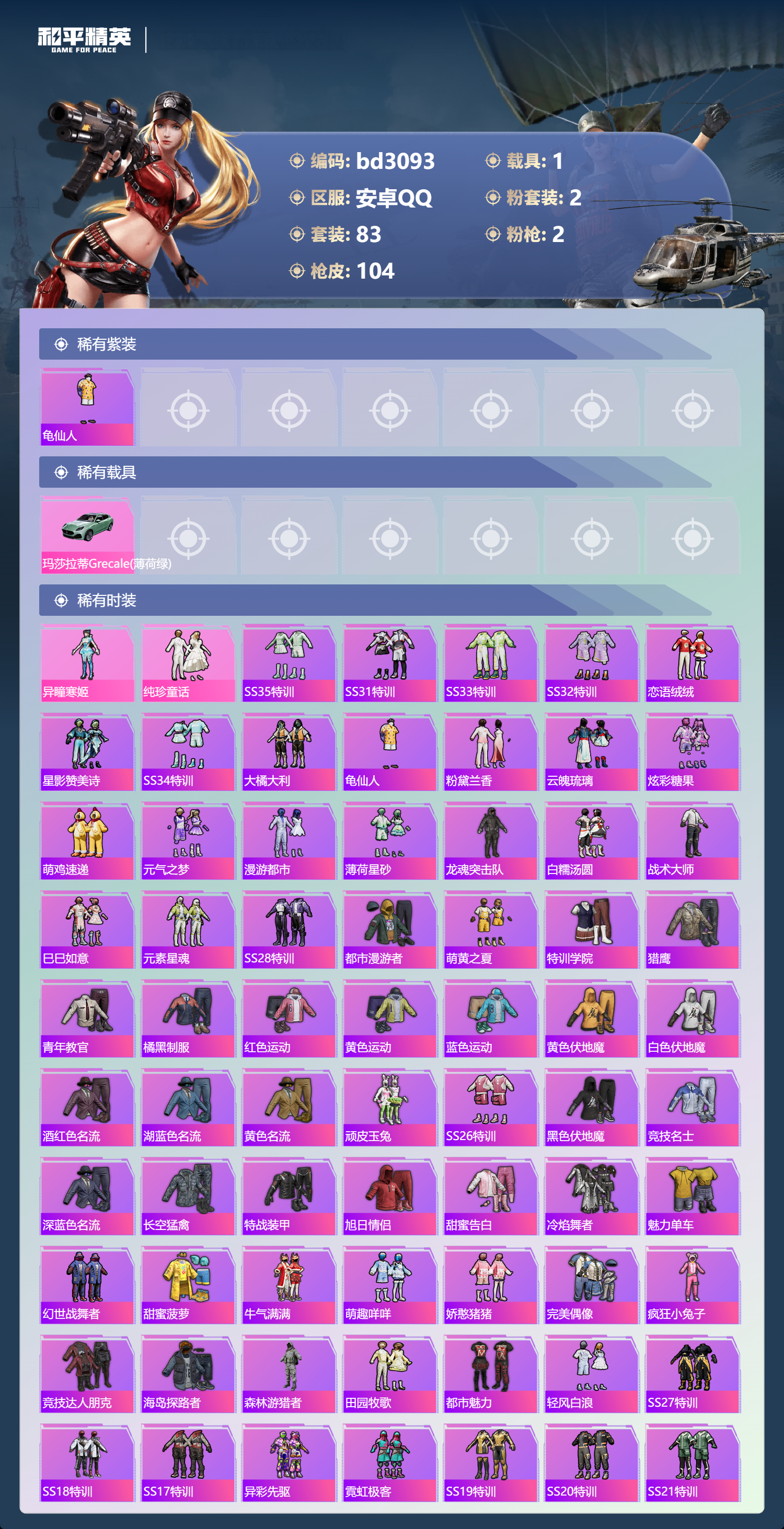 1载具-83套装-104呛皮-安卓手q-5王牌印记-2粉装-2特效呛-1载具-29408热力值-83套装-104呛皮-1卓越印记-1传奇印记【2粉装】角色-异瞳寒姬套装-纯珍童话【2特效呛】dp-28-豹影疾电/5级kar98k-巳巳如意/5级【1稀有紫装】龟仙人【1稀有载具】玛莎拉蒂grecale薄荷绿【83稀有时装】异瞳寒姬ss35特训ss31特训ss33特训ss32特训恋语绒绒星影赞美诗ss34特训