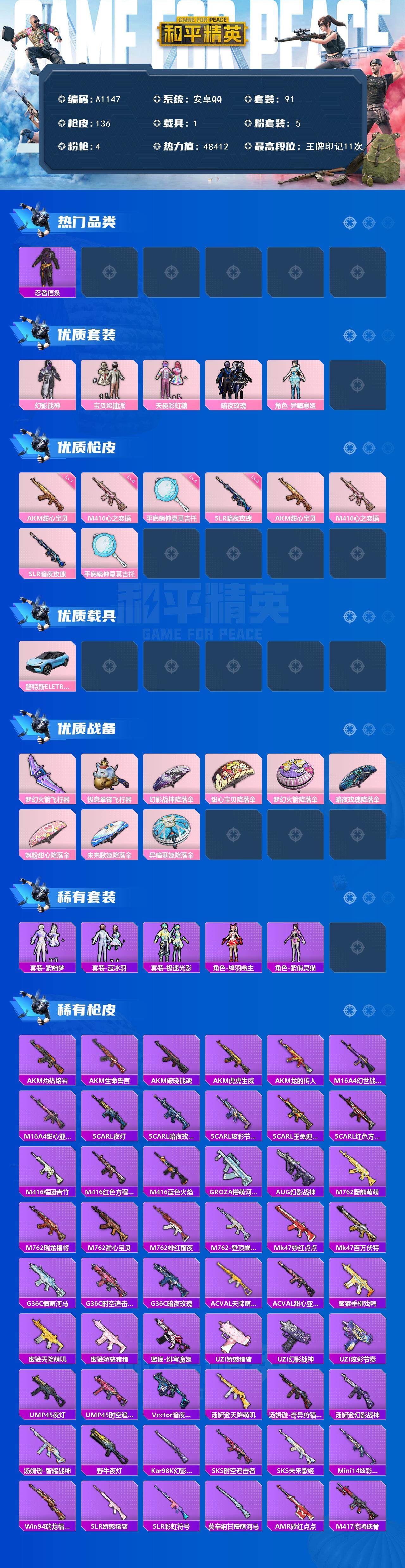[15463228]安卓 【公主号 浪漫天命/幻影战神/宝贝奶油派/akm-甜心宝贝七级/路特斯eletre(冰川蓝)】手q-5粉装-4特效呛-1载具-3粉色飞行器-48412热力值-11王牌印记-91套装-136呛皮 【热门品类】:套装-浪漫天命,套装-忍者信条,套装-暗影哥特 【粉色套装】:粉装-幻影战神,粉装-宝贝奶油派,粉装-天使彩虹糖,粉装-暗夜玫瑰,角色-异瞳寒姬 【粉色呛皮等级】:akm-甜心宝贝七级,m416-心之恋语六级,slr-暗夜玫瑰三级,平底锅-仲夏莫吉托四级 【粉色载具】:路特斯eletre(冰川蓝) 【粉色呛皮】:akm-甜心宝贝,m416-心之恋语,slr-暗夜玫瑰,平底锅-仲夏莫吉托 【粉色飞行器】:梦幻火箭飞行器,极意拳锋飞行器 【粉色降落伞】:幻影战神降落伞,甜心宝贝降落伞,梦幻火箭降落伞,暗夜玫瑰降落伞,飒粉甜心降落伞,未来歌姬降落伞,异瞳寒姬降落伞 【稀有套装】:套装-紫幽梦,套装-蓝冰羽,套装-极速光影,角色-绛羽幽主,角色-紫俏灵猫,套装-炫彩糖果 【稀有呛皮】:aug-冰晶雪宝,akm-灼热熔岩,akm-生命誓言,akm-破晓战魂,akm-虎虎生威,akm-龙的传人,m16a4-幻世战舞者,m16a4-甜心亚梦,scar-l-夜灯,scar-l-暗夜玫瑰,scar-l-炫彩节奏,scar-l-玉兔迎春,scar-l-红色方程式,m416-糯团青竹,m416-红色方程式,m416-蓝色火焰,groza-懵萌河马,aug-幻影战神,m762-暖熊萌萌,m762-瑞龙福将,m762-甜心宝贝,m762-绯红前夜,m762-登顶巅峰,mk47-妙红点点,mk47-百万伏特,g36c-懵萌河马,g36c-时空追击者,g36c-暗夜玫瑰,ac-val-天降萌叽,ac-val-甜心亚梦,蜜獾-垂柳戏鸭,蜜獾-天降萌叽,蜜獾-娇憨猪猪,蜜獾-绯穹魔姬,uzi-娇憨猪猪,uzi-幻影战神,uzi-炫彩节奏,ump45-夜灯,ump45-时空追击者,vect-暗夜玫瑰,汤姆逊-天降萌叽,汤姆逊-奇异狩猎者,汤姆逊-幻影战神,汤姆逊-智耀战神,野牛-夜灯,kar98k-幻影战神,sks-时空追击者,sks-未来歌姬,mini14-炫彩节奏,win94-瑞龙福将,slr-娇憨猪猪,slr-彩虹符号,莫辛纳甘-懵萌河马,amr-妙红点点,m