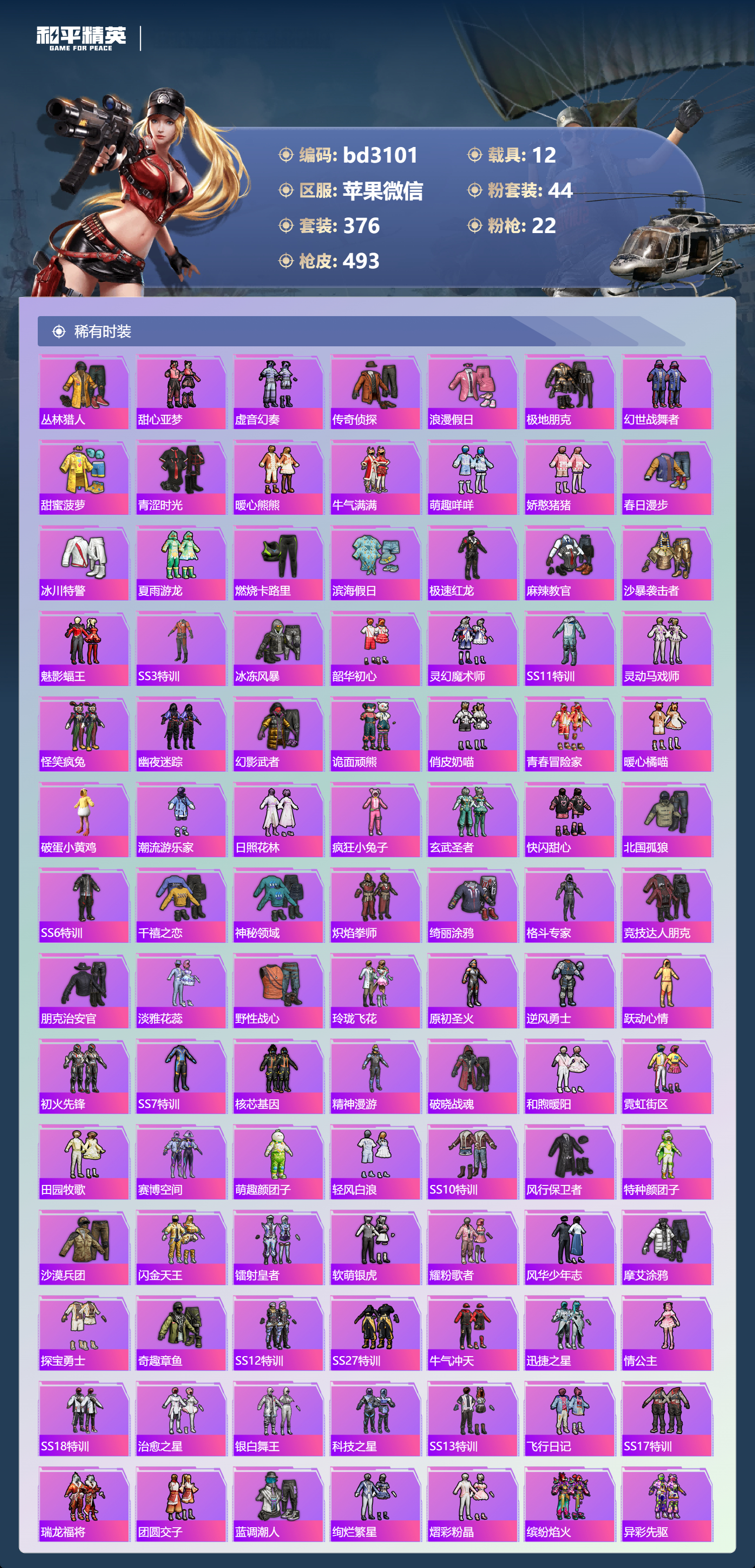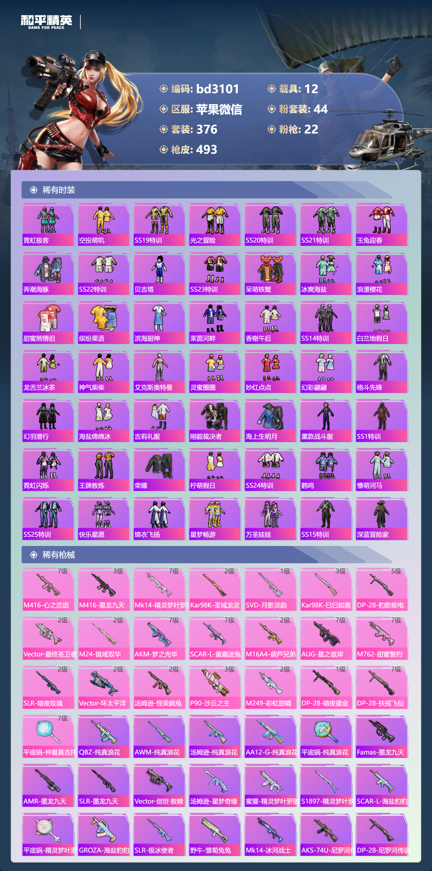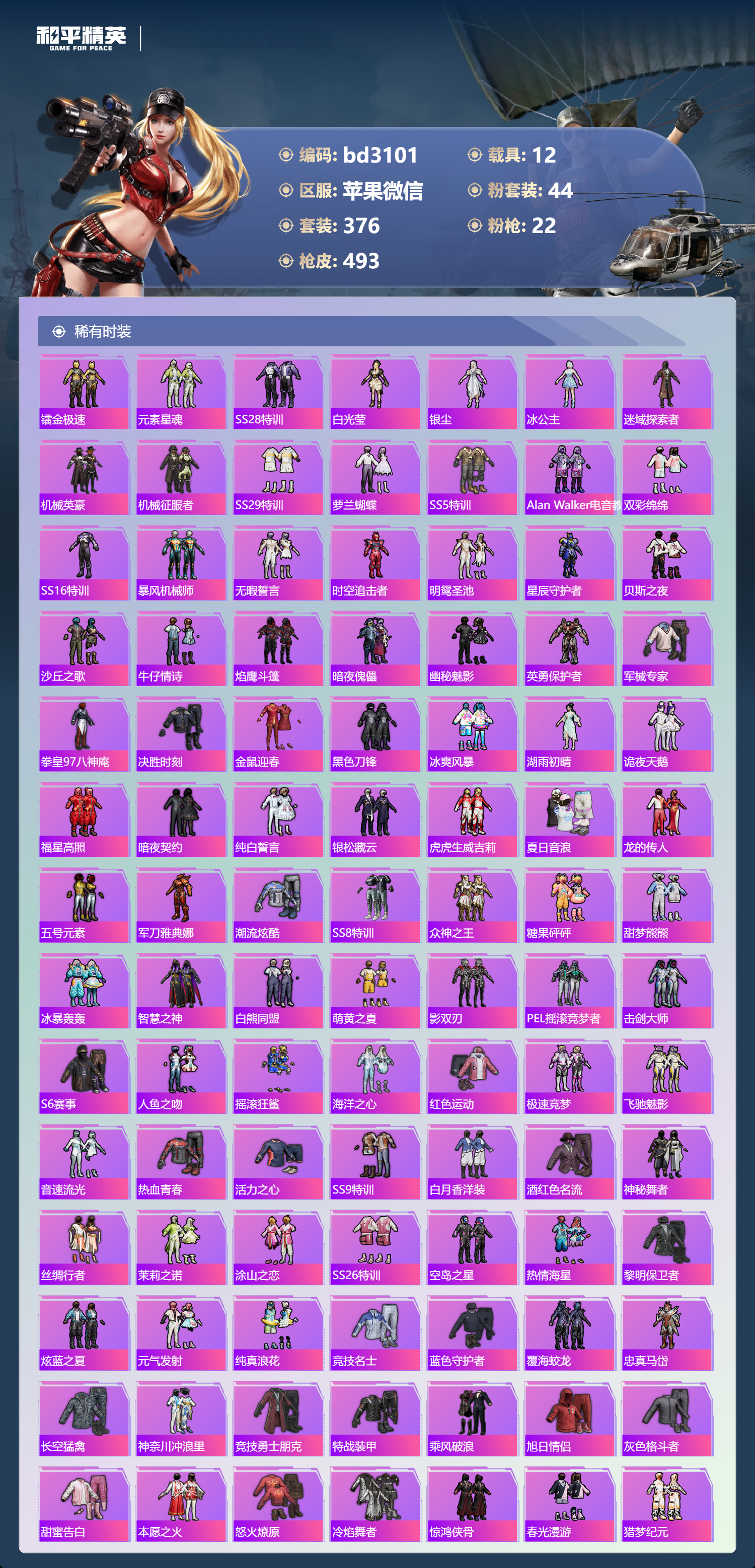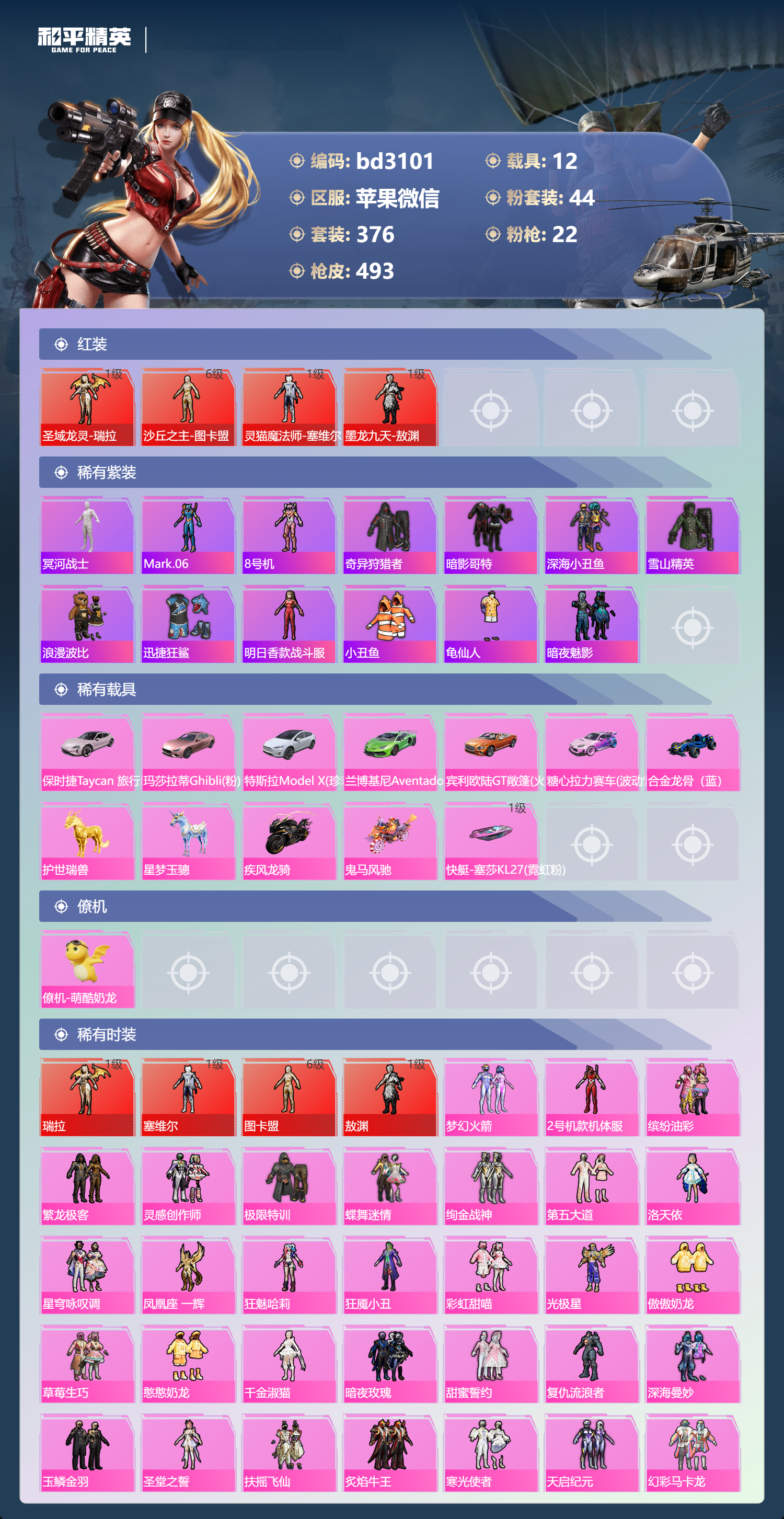 12载具-376套装-493呛皮-苹果微信-30王牌印记-有战神框-4红装-44粉装-22特效呛-12载具-热力值-376套装-493呛皮-1卓越印记-1传奇印记【4红装】沙丘之主-图卡盟/6级圣域龙灵-瑞拉/1级墨龙九天-敖渊/1级灵猫魔法师-塞维尔/1级【44粉装】套装-天启纪元角色-千金淑猫套装-缤纷油彩套装-冰川红玫套装-繁龙极客角色-小蓝套装-玉鳞金羽套装-憨憨奶龙角色-狂魅哈莉角色-