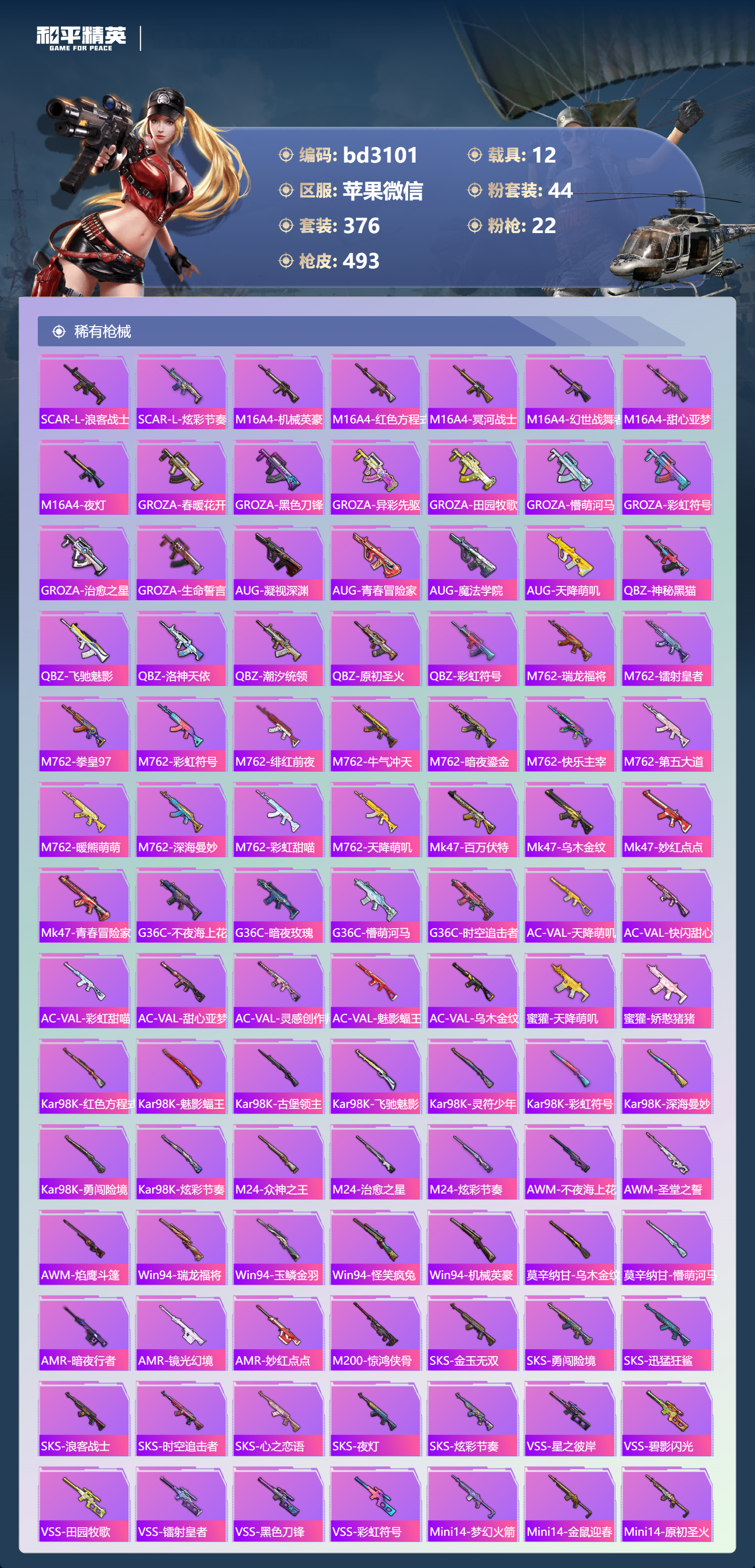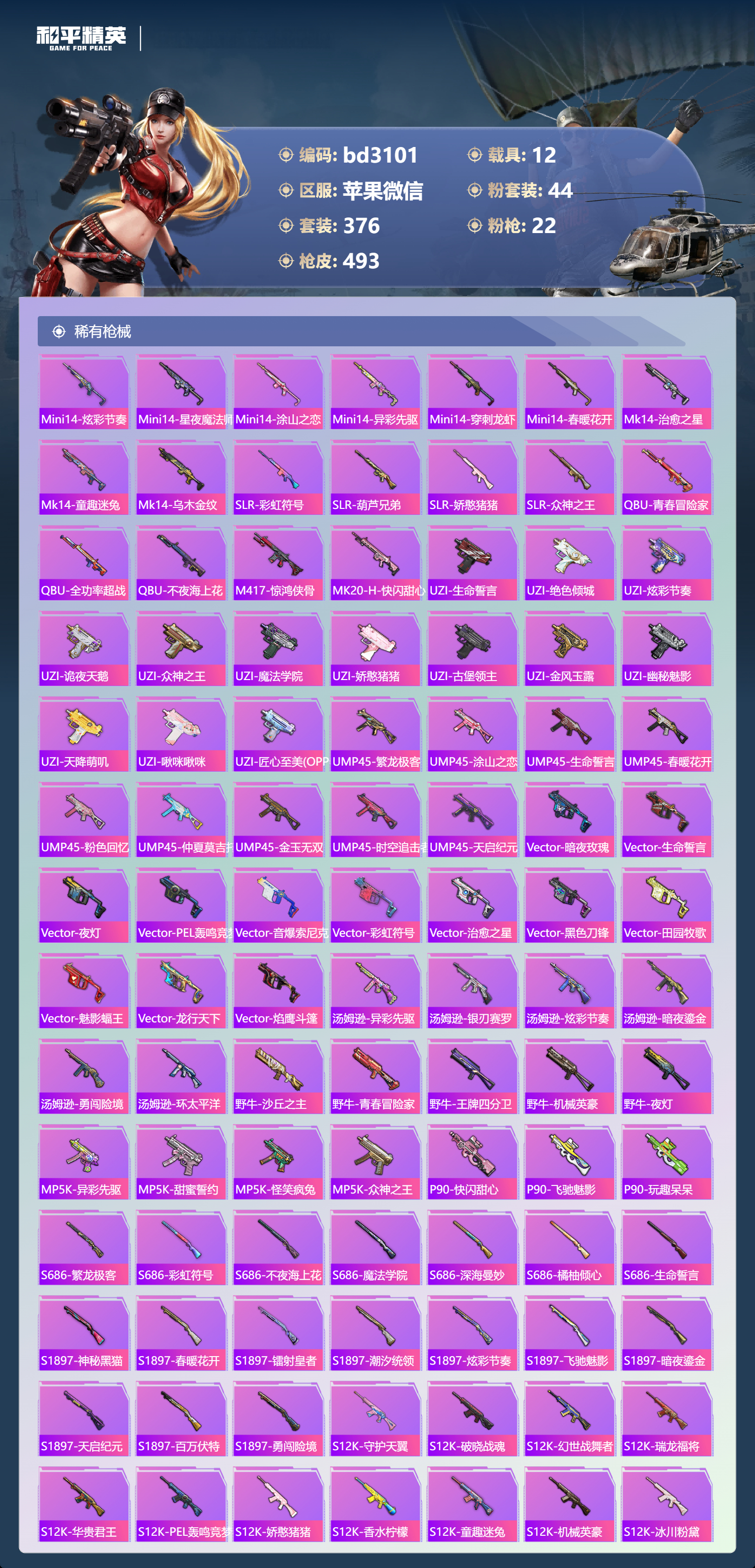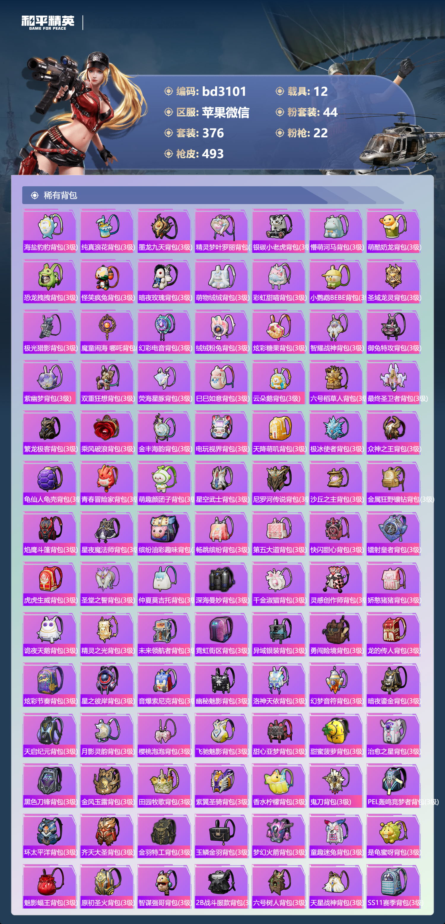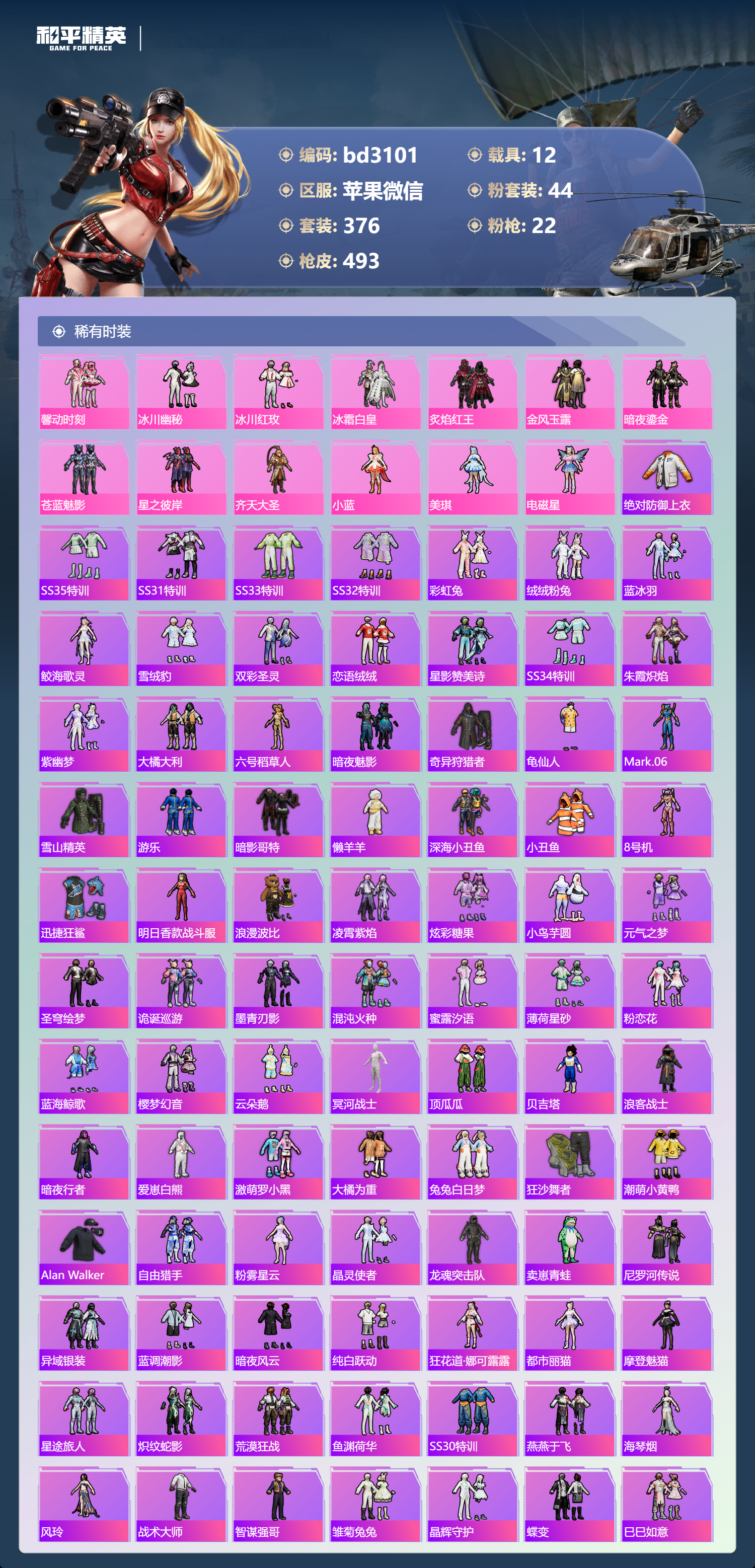 12载具-376套装-493呛皮-苹果微信-30王牌印记-有战神框-4红装-44粉装-22特效呛-12载具-热力值-376套装-493呛皮-1卓越印记-1传奇印记【4红装】沙丘之主-图卡盟/6级圣域龙灵-瑞拉/1级墨龙九天-敖渊/1级灵猫魔法师-塞维尔/1级【44粉装】套装-天启纪元角色-千金淑猫套装-缤纷油彩套装-冰川红玫套装-繁龙极客角色-小蓝套装-玉鳞金羽套装-憨憨奶龙角色-狂魅哈莉角色-