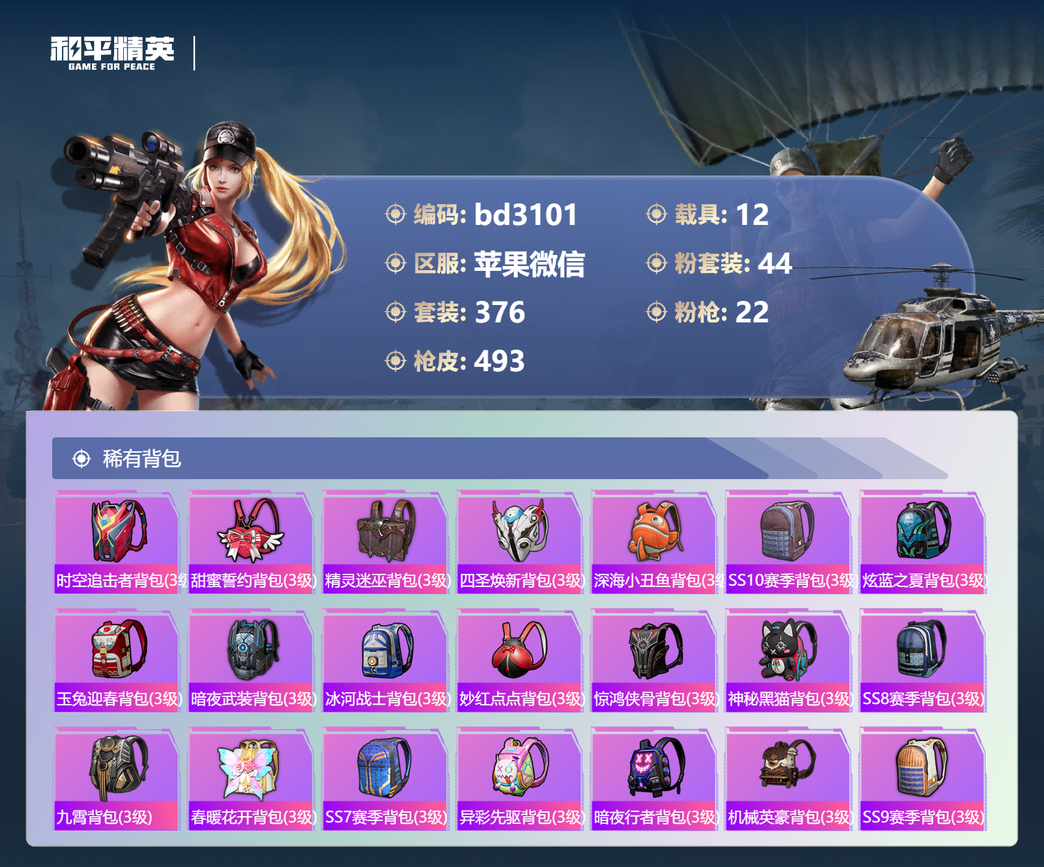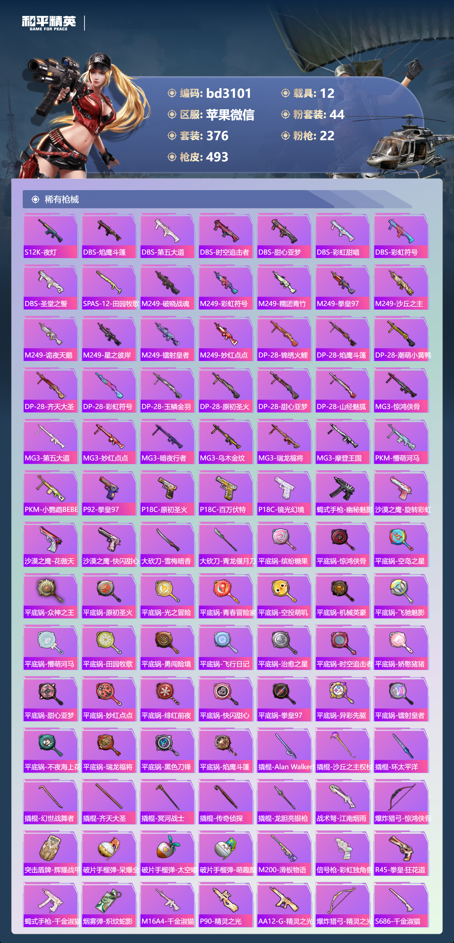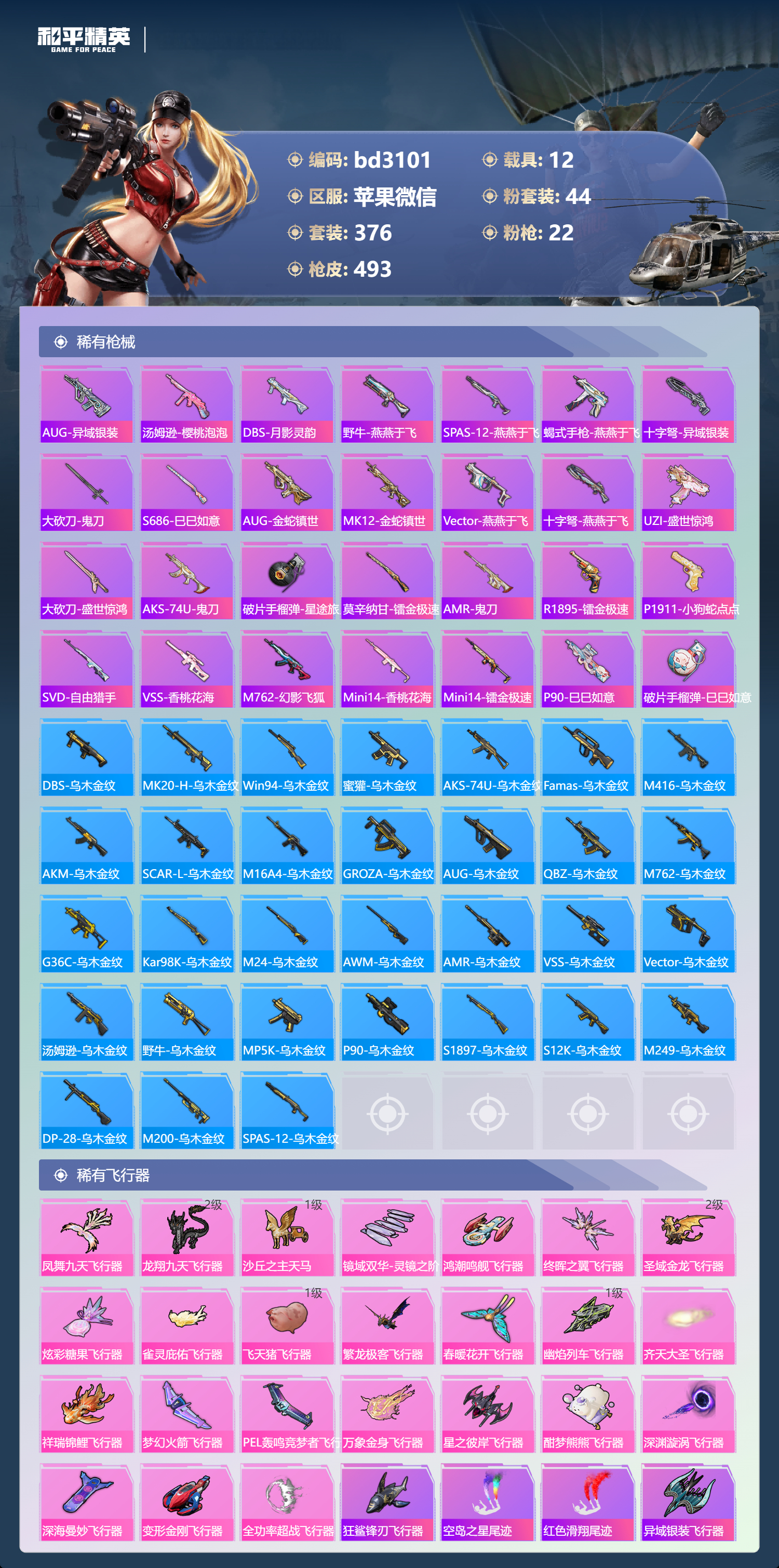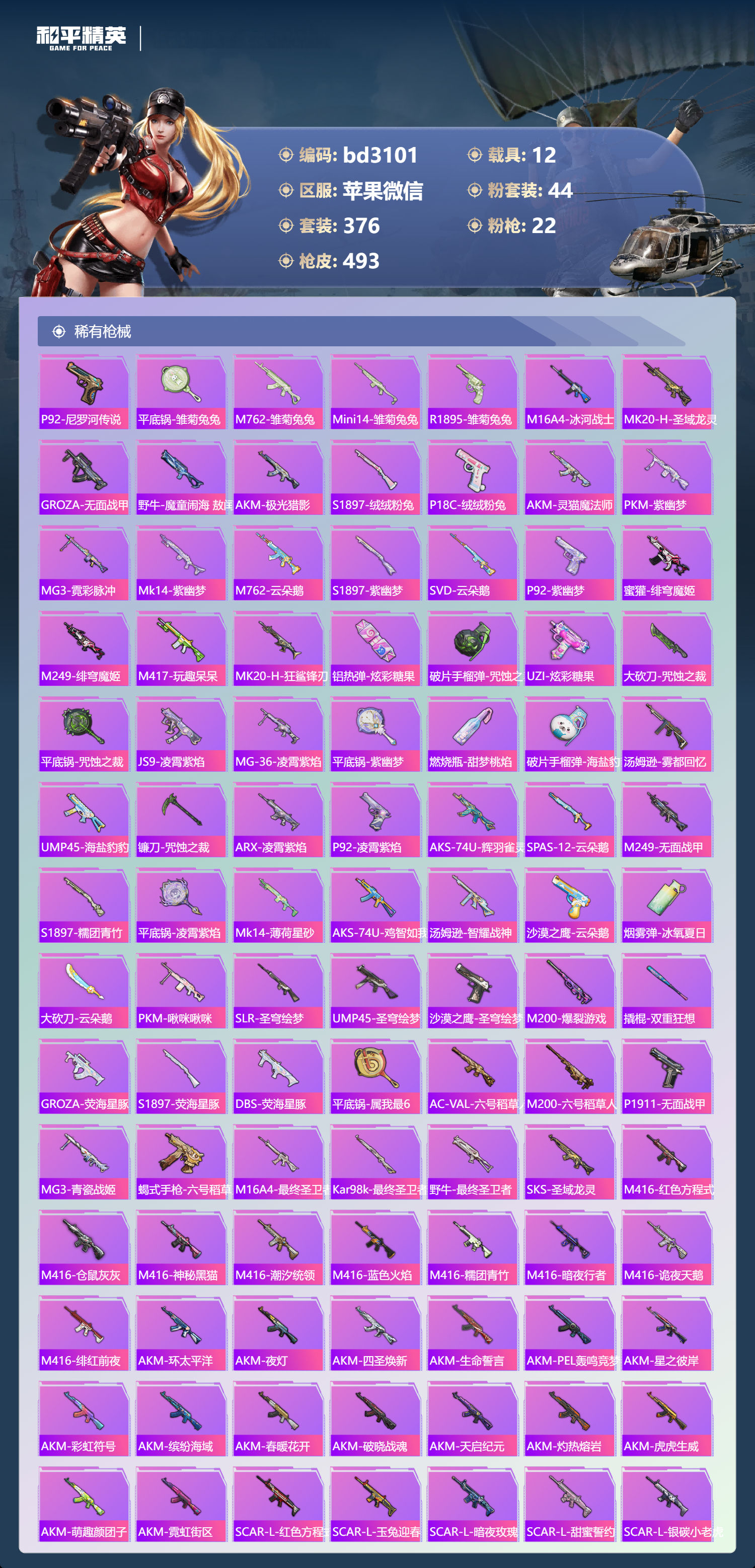12载具-376套装-493呛皮-苹果微信-30王牌印记-有战神框-4红装-44粉装-22特效呛-12载具-热力值-376套装-493呛皮-1卓越印记-1传奇印记【4红装】沙丘之主-图卡盟/6级圣域龙灵-瑞拉/1级墨龙九天-敖渊/1级灵猫魔法师-塞维尔/1级【44粉装】套装-天启纪元角色-千金淑猫套装-缤纷油彩套装-冰川红玫套装-繁龙极客角色-小蓝套装-玉鳞金羽套装-憨憨奶龙角色-狂魅哈莉角色-