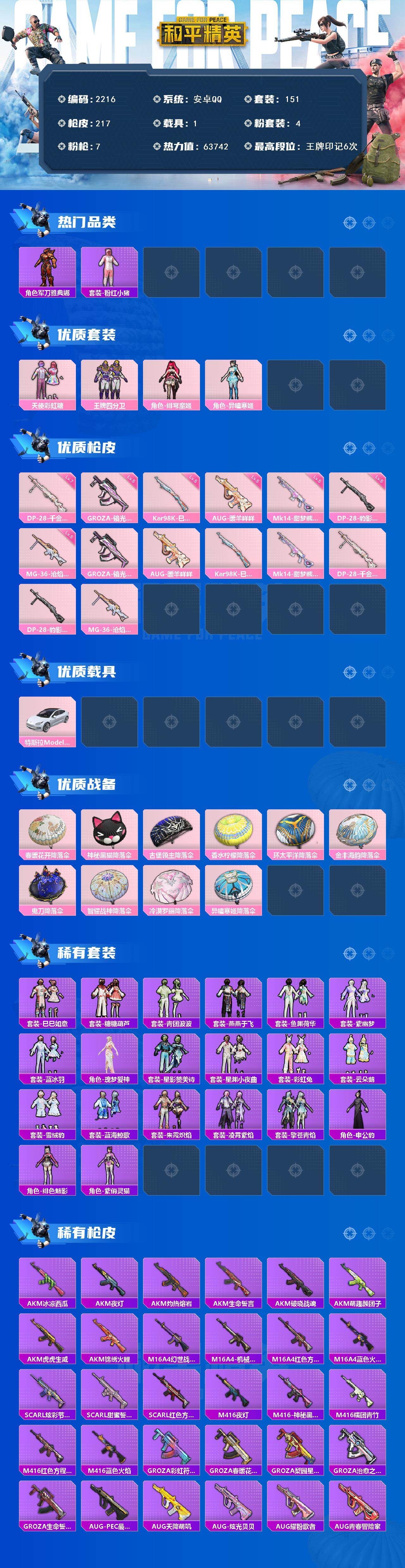 1载具-151套装-217呛皮-151套装/呛械7/装备265/载具1/战备150/王牌印记6/热力值63742/五级groza-镜光银凌/五级aug-暖羊咩咩/五级kar98k-巳巳如意/五级mk14-甜梦熊击/七级dp-28-千金淑猫/五级dp-28-豹影疾电/五级mg-36-沧焰双生/军刀雅典娜/套装-粉红小猪/天使彩虹糖/王牌四分卫/角色-绯穹魔姬/角色-异瞳寒姬/特斯拉model 3珍珠白/groza-镜光银凌