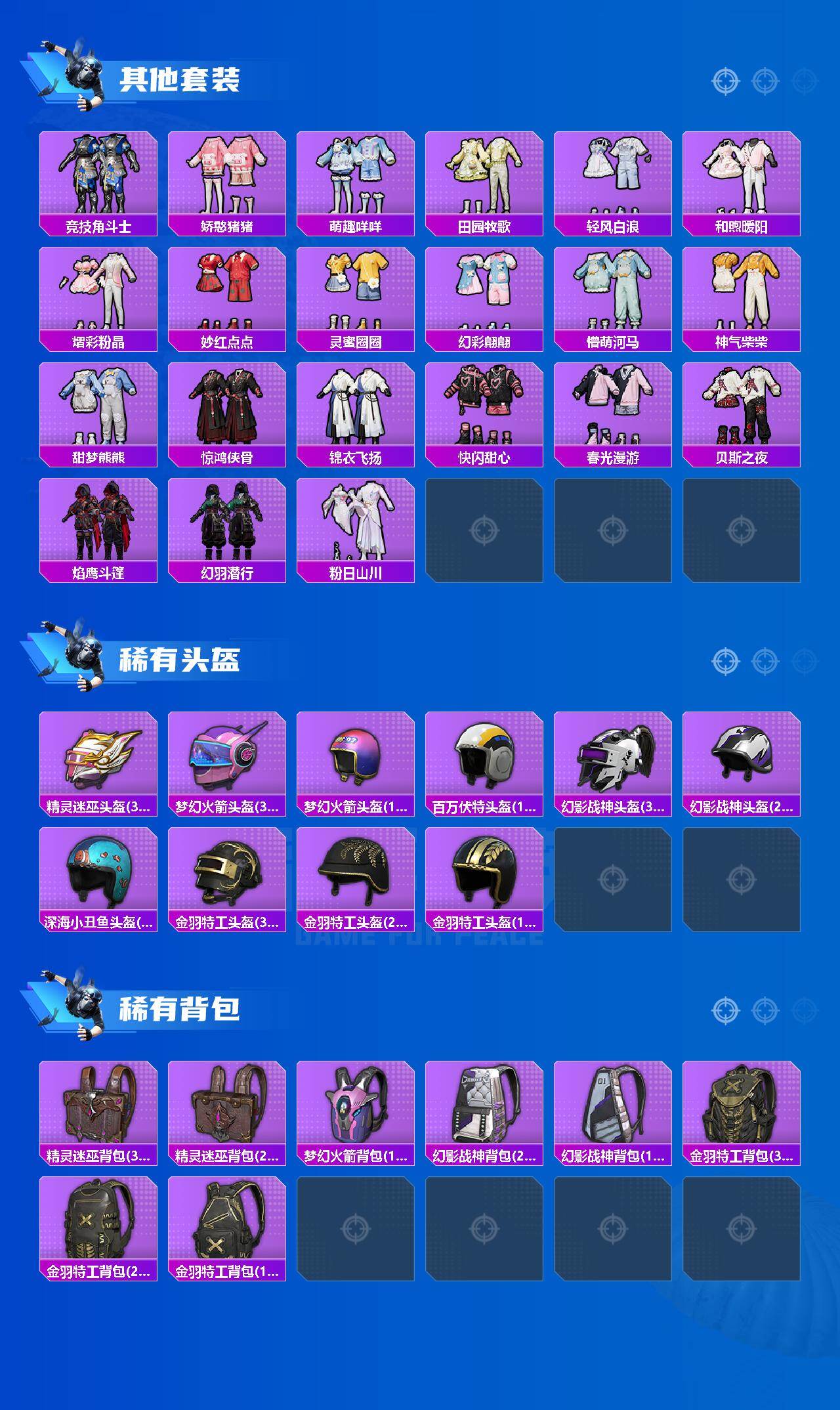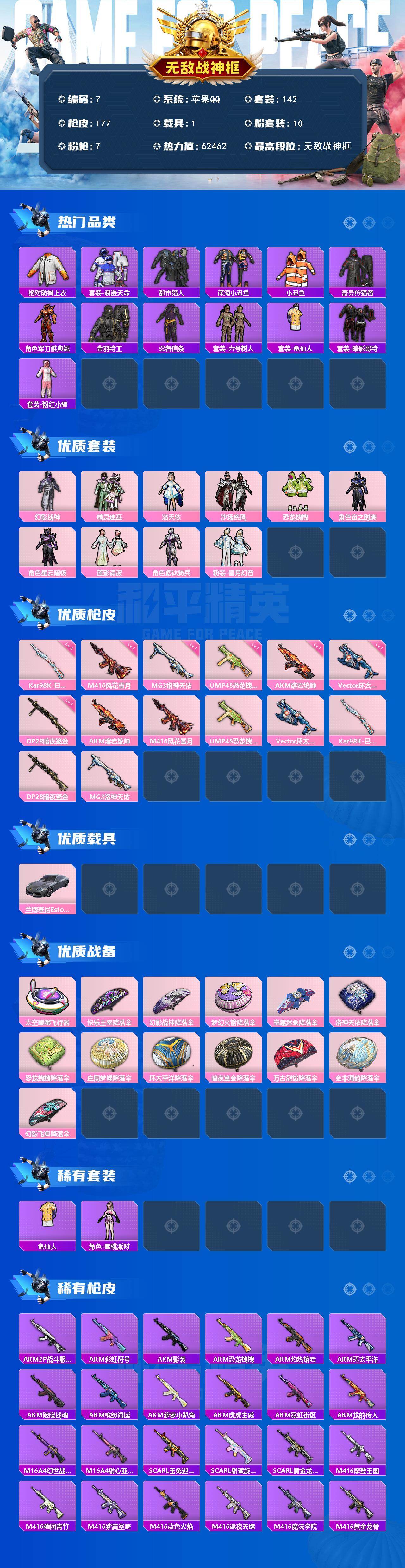 【7】苹果 手q-无敌战神框-10粉装-7特效呛-1载具-1粉色飞行器-62462热力值-10王牌印记-142套装-177呛皮 【热门品类】:绝对防御上衣,套装-浪漫天命,套装-都市猎人,套装-深海小丑鱼,套装-小丑鱼,套装-奇异狩猎者,角色-军刀雅典娜,套装-金羽特工,套装-忍者信条,套装-六号树人,套装-龟仙人,套装-暗影哥特,套装-粉红小猪 【粉色套装】:粉装-幻影战神,粉装-精灵迷巫,角色-洛天依,粉装-沙场疾风,粉装-恐龙拽拽,角色-宙之时溯,角色-星云暗核,粉装-莲影清波,角色-紫钛骑兵,粉装-雪月幻音 【粉色呛皮等级】:akm-熔岩统帅一级,m416-风花雪月一级,ump45-恐龙拽拽一级,vect-环太平洋一级,kar98k-巳巳如意四级,dp-28-暗夜鎏金一级,mg3-洛神天依一级 【粉色载具】:兰博基尼estoque(银翼灰) 【粉色呛皮】:akm-熔岩统帅,m416-风花雪月,ump45-恐龙拽拽,vect-环太平洋,kar98k-巳巳如意,dp-28-暗夜鎏金,mg3-洛神天依 【粉色飞行器】:太空嘟嘟飞行器 【粉色降落伞】:快乐主宰降落伞,幻影战神降落伞,梦幻火箭降落伞,童趣迷兔降落伞,洛神天依降落伞,恐龙拽拽降落伞,庄周梦蝶降落伞,环太平洋降落伞,暗夜鎏金降落伞,万古烈焰降落伞,金丰海韵降落伞,幻影飞狐降落伞 【稀有套装】:套装-龟仙人,角色-蜜桃派对 【稀有呛皮】:akm-2p战斗服款,akm-彩虹符号,akm-影袭,akm-恐龙拽拽,akm-灼热熔岩,akm-环太平洋,akm-破晓战魂,akm-缤纷海域,akm-萝萝小趴兔,akm-虎虎生威,akm-霓虹街区,akm-龙的传人,m16a4-幻世战舞者,m16a4-甜心亚梦,scar-l-玉兔迎春,scar-l-甜蜜旋律,scar-l-黄金龙骨,m416-摩登王国,m416-糯团青竹,m416-紫翼圣骑,m416-蓝色火焰,m416-诡夜天鹅,m416-魔法学院,m416-黄金龙骨,groza-异彩先驱,groza-影袭,groza-恐龙拽拽,groza-懵萌河马,groza-田园牧歌,aug-天降萌叽,aug-幻影战神,aug-耀粉歌者,q-彩虹符号,q-洛神天依,q-飞驰魅影,m762-天降萌叽,m762-快乐主宰,m762-瑞龙福将,mk47-妙红点点,mk47-洛神天依,g36c-懵萌河马,ac-val-天降萌叽,ac-val-快闪甜心,ac-val-甜心亚梦,蜜獾-天降萌叽,蜜獾-娇憨猪猪,uzi-啾咪啾咪,uzi-天降萌叽,uzi-娇憨猪猪,uzi-幻影战神,uzi-幽秘魅影,uzi-影袭,uzi-炫彩节奏,ump45-夜灯,ump45-涂山之恋,ump45-生命誓言,vect-焰鹰斗篷,vect-彩虹符号,vect-田园牧歌,vect-香水柠檬,汤姆逊-天降萌叽,汤姆逊-异彩先驱,汤姆逊-暗夜鎏金,汤姆逊-炫彩节奏,汤姆逊-环太平洋,mp5k-异彩先驱,p90-快闪甜心,p90-飞驰魅影,p90-巳巳如意,kar98k-六号树人,kar98k-彩虹符号,kar98k-影袭,kar98k-洛神天依,kar98k-炫彩节奏,kar98k-王子的夏天,kar98k-飞驰魅影,m24-影袭,m24-炫彩节奏,awm-焰鹰斗篷,awm-恐龙拽拽,awm-飒粉甜心,awm-黄金龙骨,sks-炫彩节奏,sks-迅猛狂鲨,vss-彩虹符号,vss-田园牧歌,mini14-异彩先驱,mini14-涂山之恋,mini14-熔岩统帅,win94-瑞龙福将,slr-娇憨猪猪,slr-彩虹符号,莫辛纳甘-懵萌河马,莫辛纳甘-银碳小老虎,amr-妙红点点,m417-惊鸿侠骨,mk20-h-墨染幽兰,mk20-h-快闪甜心,m200-惊鸿侠骨,m200-绿野极光,s686-奇异狩猎者,s686-彩虹符号,s686-生命誓言,s1897-小鹦鹉bebe,s1897-暗夜鎏金,s1897-炫彩节奏,s1897-百万伏特,s1897-飞驰魅影,s12k-玩趣呆呆,s12k-瑞龙福将,s12k-娇憨猪猪,s12k-幻世战舞者,s12k-幻影战神,dbs-焰鹰斗篷,dbs-彩虹符号,dbs-甜心亚梦,spas-12-田园牧歌,m249-妙红点点,m249-彩虹符号,m249-糯团青竹,dp-28-焰鹰斗篷,dp-28-甜心亚梦,mg3-妙红点点,mg3-幻世战舞者,mg3-惊鸿侠骨,mg3-瑞龙福将,pkm-懵萌河马,r1895-六号树人,沙墨之鹦-快闪甜心,爆炸猎弓-惊鸿侠骨 【其他套装】:套装-ss17特训,套装-ss18特训,套装-ss19特训,套装-ss20特训,套装-ss21特训,套装-ss22特训,套装-ss23特训,套装-ss24特训,套装-ss25特训,套装-ss26特训,套装-ss27特训,套装-ss28特训,套装-光之冒险,套装-六六大吉,套装-吉莉礼服,套装-夏日音浪,套装-幻世战舞者,套装-探宝勇士,套装-旭日情侣,套装-暗影哥特,套装-柠萌假日,套装-格斗先锋,套装-沙漠兵团,套装-浪漫天命,套装-涂山之恋,套装-湖蓝色名流,套装-滨海假日,套装-炫蓝之夏,套装-热血青春,套装-牛气冲天,套装-牛气满满,套装-特殊使命,套装-玉兔迎春,套装-王牌教练,套装-甜蜜熊情侣,套装-白色伏地魔,套装-福星高照,套装-空岛之星,套装-空投萌叽,套装-竞技名士,套装-粉红小猪,套装-绯格组合,套装-萌黄之夏,套装-蓝色运动,套装-虎虎生威吉莉,套装-酷潮明星,套装-野性战心,套装-长空猛禽,套装-霓虹街区,套装-霓虹闪烁,套装-青春校园,套装-青涩时光,套装-青玉碎影,套装-魅力单车,套装-鹤鸣,套装-麻辣教官,套装-黄色名流,套装-黄色运动,套装-黎明保卫者,套装-龙的传人,套装-龙腾端午,套装-龟仙人,角色-英勇保护者,套装-刚毅裁决者,套装-沙漠毒蛇,套装-鹰眼刺客,套装-冰冻风暴,套装-漫步者,套装-奇异狩猎者,套装-装甲骑士,套装-街舞达人,套装-深海小丑鱼,套装-呆萌铁蟹,套装-迅捷狂鲨,套装-弄潮海豚,套装-冰川特警,套装-坚韧舞者,套装-蔷薇魔法师,套装-梦之呓语,套装-醒狮腾龙,套装-瑞龙福将,套装-团圆交子,套装-电音精灵,套装-天籁歌者,套装-异彩先驱,套装-缤纷焰火,套装-霓虹极客,套装-极速竞梦,套装-飞驰魅影,套装-音速流光,套装-豚鼠丹丹,套装-雪兔飞飞,套装-猎梦纪元,套装-甜心亚梦,套装-虚音幻奏,套装-浑天鲲鹏,套装-竞技角斗士,套装-娇憨猪猪,套装-萌趣咩咩,套装-田园牧歌,套装-轻风白浪,套装-和煦暖阳,套装-熠彩粉晶,套装-妙红点点,套装-灵蜜圈圈,套装-幻彩翩翩,套装-懵萌河马,套装-神气柴柴,
