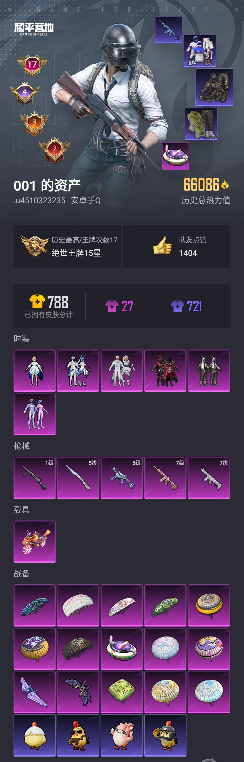 【和平精英】【lyhp19764】6粉装,5特效呛,1载具,历史最高段位:绝世王牌15星 王牌印记17次 热力值:66086,154套装,208呛械,267装备,132战备;套装:套装-数码大师,套装-梦幻火箭,套装-炙焰红王,套装-彩虹鹿灵,角色-洛天依,套装-未来歌姬,套装-特训学院,套装-蓝色运动,套装-黄色伏地魔,套装-竞技名士,套装-深蓝色名流,套装-酒红色名流,套装-湖蓝色名流,套装-黄色名流,套装-长空猛禽,套装-海岛探路者,套装-水银刺客,套装-浪漫天命,套装-甜蜜告白,套装-滨海假日,套装-魅力单车,套装-绮丽涂鸦,套装-竞技达人朋克,套装-金羽特工,套装-狂沙舞者,套装-荣耀,套装-热血青春,套装-潮流炫酷,套装-极地朋克,套装-幻世战舞者,套装-清新柠檬,套装-呆萌铁蟹,套装-青涩时光,套装-缤纷果语,套装-alan walker,套装-龙魂突击队,套装-格斗先锋,套装-麻辣教官,套装-万圣娃娃,套装-粉红小猪,套装-破蛋小黄鸡,套装-鹤鸣,套装-霓虹街区,套装-激萌罗小黑,套装-萌黄之夏,套装-夏日音浪,套装-探宝勇士,套装-牛气满满,套装-诡面顽熊,套装-潮流游乐家,套装-战术大师,套装-牛气冲天,套装-ss18特训,套装-飞行日记,套装-曼妙人鱼,套装-热情海星,套装-纯真浪花,套装-电音精灵,套装-ss17特训,套装-瑞龙福将,套装-团圆交子,套装-炫光向阳,套装-福星高照,角色-军刀雅典娜,套装-异彩先驱,套装-霓虹极客,套装-空投萌叽,套装-ss19特训,套装-飞驰魅影,套装-音速流光,套装-炫蓝之夏,套装-ss20特训,套装-猎梦纪元,套装-甜心亚梦,套装-虚音幻奏,套装-ss21特训,套装-萌趣咩咩,套装-娇憨猪猪,套装-荷畔雨呱,套装-暖心橘喵,套装-玉兔迎春,套装-ss22特训,套装-和煦暖阳,套装-田园牧歌,套装-轻风白浪,套装-绚烂繁星,套装-光之冒险,套装-绯格组合,套装-ss23特训,套装-白兰地假日,套装-甜梦熊熊,套装-神气柴柴,套装-懵萌河马,套装-灵蜜圈圈,套装-妙红点点,套装-幻彩翩翩,套装-王牌教练,套装-柠萌假日,套装-ss24特训,套装-华灯初上,角色-短笛,套装-龟仙人,套装-涂山之恋,套装-ss25特训,套装-惊鸿侠骨,套装-锦衣飞扬,套装-香桃花海,套装-龙的传人,套装-冰河战士,套装-ss26特训,套装-快闪甜心,套装-春光漫游,套装-空岛之星,套装-云魄琉璃,套装-贝斯之夜,玩偶服-菲菲,套装-焰鹰斗篷,套装-幽夜迷踪,套装-幻羽潜行,套装-ss27特训,套装-老实芭蕉,套装-ss28特训,角色-情公主,角色-银尘,套装-街头风暴,套装-海盐绵绵冰,套装-蝶变,套装-创世·追猎,套装-小熊娃娃,套装-ss29特训,套装-雏菊兔兔,套装-萝兰蝴蝶,套装-先驱飞行员,套装-异域银装,套装-ss30特训,套装-蓝调潮影,套装-纯白跃动,套装-ss31特训,套装-鱼渊荷华,套装-燕燕于飞,套装-ss33特训,套装-云朵鹅,套装-ss32特训,套装-风舞幻音,套装-雪绒豹,套装-狂鲨锋刃,套装-蜜露汐语,套装-元气之梦,套装-ss34特训,套装-朱霞炽焰,套装-凌霄紫焰,套装-薄荷星砂,套装-ss35特训,套装-萌鸡速递;呛皮:q-飞驰魅影,q-纯真浪花,mk47-百万伏特,mk47-洛神天依,mk47-乌木金纹,mk47-妙红点点,m16a4-红色方程式,m16a4-甜心亚梦,m16a4-幻世战舞者,m16a4-冰河战士,aug-耀粉歌者,aug-异域银装,m762-瑞龙福将,m762-彩虹符号,m762-彩虹甜喵,m762-天降萌叽,m762-雏菊兔兔,m762-云朵鹅,蜜獾-娇憨猪猪,蜜獾-天降萌叽,蜜獾-精灵梦叶罗丽,蜜獾-绯穹魔姬,蜜獾-乌木金纹,7级m416-心之恋语,m416-蓝色火焰,m416-糯团青竹,m416-绿野极光,m416-魔童闹海 敖闰,ac-val-甜心亚梦,ac-val-乌木金纹,ac-val-彩虹甜喵,ac-val-天降萌叽,ac-val-快闪甜心,famas-乌木金纹,7级scar-l-纯梦嫁纱,scar-l-红色方程式,scar-l-碧影闪光,scar-l-玉兔迎春,scar-l-海盐豹豹,akm-缤纷海域,akm-百万伏特,akm-霓虹街区,akm-涂鸦街区,akm-彩虹符号,akm-虎虎生威,akm-龙的传人,groza-蓝莓炮弹,groza-异彩先驱,groza-田园牧歌,groza-懵萌河马,groza-荧海星豚,arx-凌霄紫焰,g36c-暗夜玫瑰,g36c-懵萌河马,g36c-星穹咏叹调,g36c-蛇蝎美人,g36c-乌木金纹,win94-瑞龙福将,win94-乌木金纹,莫辛纳甘-炙焰牛王,莫辛纳甘-乌木金纹,莫辛纳甘-懵萌河马,莫辛纳甘-蜜语绒猫,5级kar98k-巳巳如意,kar98k-王子的夏天,kar98k-飞驰魅影,amr-妙红点点,amr-乌木金纹,svd-云朵鹅,awm-垂柳戏鸭,awm-焰鹰斗篷,awm-纯真浪花,m200-仲夏莫吉托,m200-惊鸿侠骨,m200-乌木金纹,m24-炫彩节奏,m24-能量风暴,m24-拂晓神骑,m24-乌木金纹,vss-星之彼岸,vss-碧影闪光,vss-田园牧歌,vss-香桃花海,slr-娇憨猪猪,slr-彩虹符号,slr-金丰海韵,sks-天之羽翼,mk14-乌木金纹,mk14-冰河战士,mini14-金玉无双,mini14-梦幻火箭,mini14-异彩先驱,mini14-涂山之恋,mini14-香桃花海,mini14-雏菊兔兔,m417-惊鸿侠骨,mk20-h-快闪甜心,mk20-h-狂鲨锋刃,mk20-h-乌木金纹,汤姆逊-耀粉歌者,汤姆逊-异彩先驱,汤姆逊-暗夜鎏金,汤姆逊-天降萌叽,汤姆逊-纯真浪花,p90-飞驰魅影,p90-快闪甜心,p90-巳巳如意,p90-乌木金纹,uzi-炫彩节奏,uzi-娇憨猪猪,uzi-冰河战士,uzi-啾咪啾咪,vect-生命誓言,vect-暗夜玫瑰,vect-田园牧歌,vect-焰鹰斗篷,vect-燕燕于飞,野牛-雏菊兔兔,野牛-燕燕于飞,野牛-乌木金纹,5级ump45-量子极限,ump45-夜灯,ump45-蓝色火焰,ump45-生命誓言,ump45-仲夏莫吉托,ump45-涂山之恋,ump45-猪猪侠,mp5k-异彩先驱,mp5k-乌木金纹,js9-凌霄紫焰,aks-74u-乌木金纹,spas-12-田园牧歌,spas-12-燕燕于飞,spas-12-狂鲨锋刃,spas-12-云朵鹅,spas-12-乌木金纹,aa12-g-纯真浪花,aa12-g-绒兔团圆,dbs-甜心亚梦,dbs-彩虹甜喵,dbs-歌者泠鸢,dbs-第五大道,dbs-彩虹符号,dbs-焰鹰斗篷,dbs-乌木金纹,s1897-炫彩节奏,s18