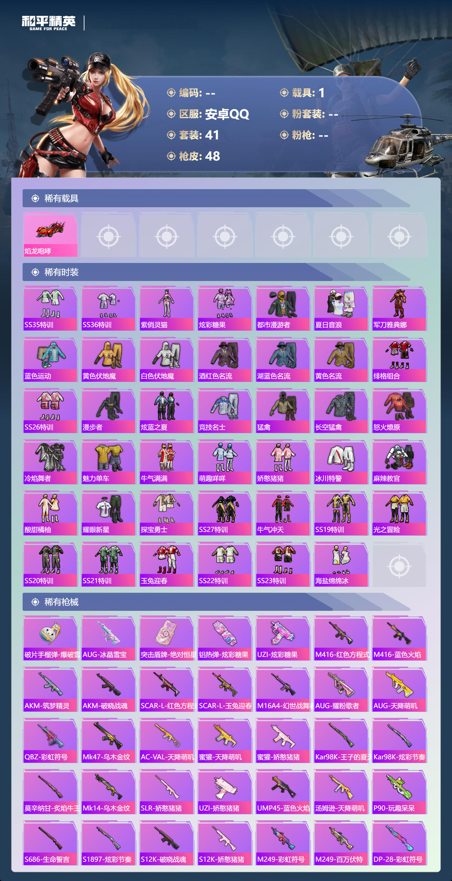 1载具-41套装-48呛皮-安卓手q-1王牌印记-1载具-14506热力值-41套装-48呛皮【1稀有载具】焰龙咆哮【41稀有时装】ss35特训ss36特训紫俏灵猫炫彩糖果都市漫游者夏日音浪军刀雅典娜蓝色运动黄色伏地魔白色伏地魔酒红色名流湖蓝色名流黄色名流绯格组合ss26特训漫步者炫蓝之夏竞技名士猛禽长空猛禽怒火燎原冷焰舞者魅力单车牛气满满萌趣咩咩娇憨猪猪冰川特警麻辣教官