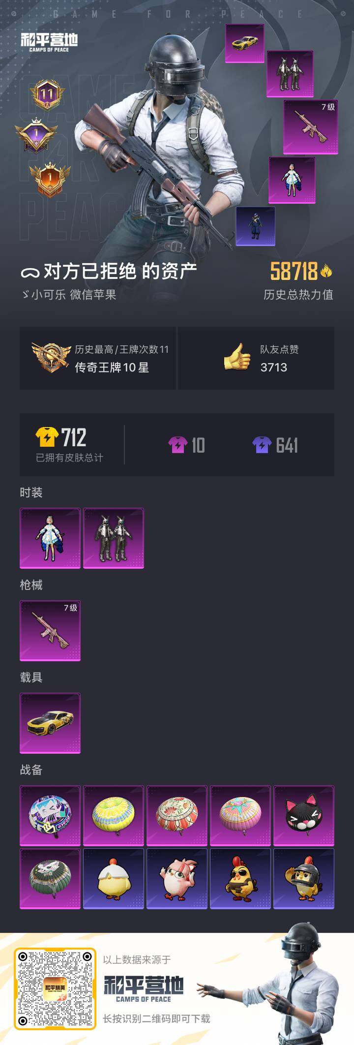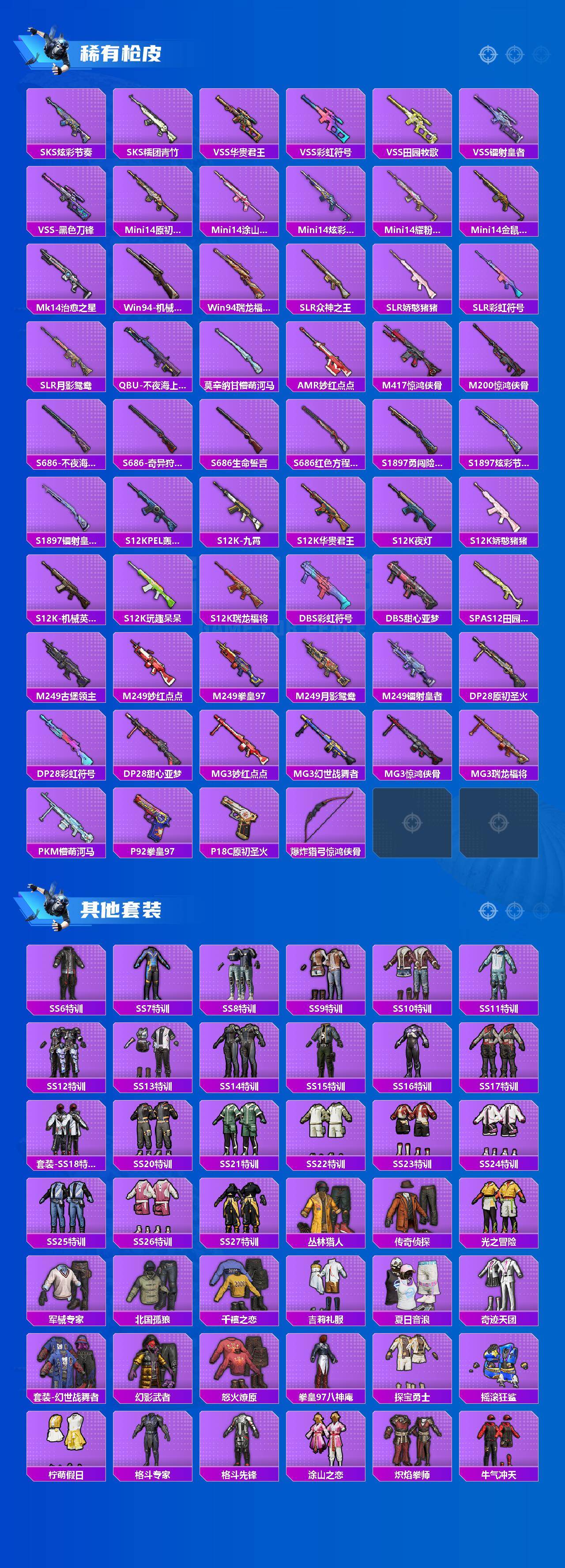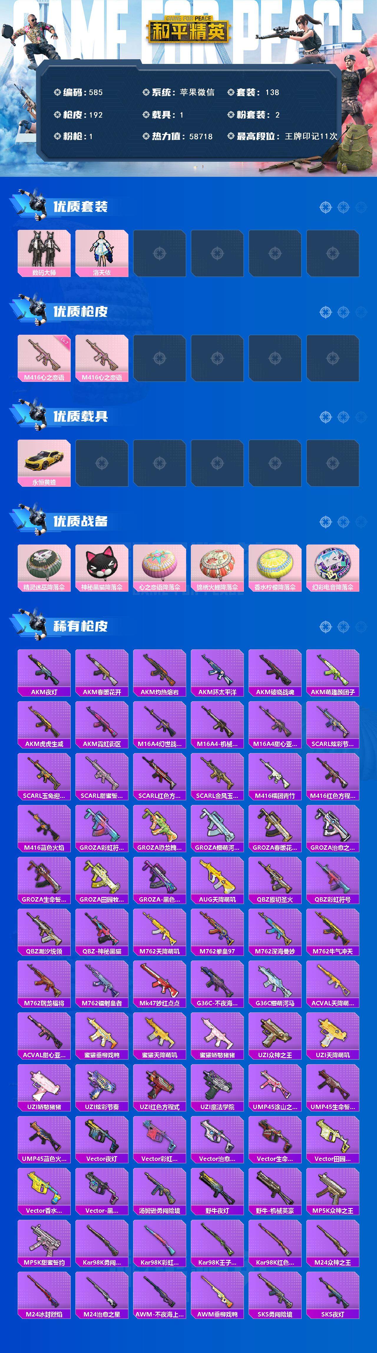 2382385微信-2粉装-1特效呛-1载具-0粉色飞行器-58718热力值-11王牌印记-138套装-192呛皮 【热门品类】:套装-龟仙人,套装-潮萌小黄鸭 【粉色套装】:粉装-数码大师,角色-洛天依 【粉色呛皮等级】:m416-心之恋语七级 【粉色载具】:永恒黄蜂 【粉色呛皮】:m416-心之恋语 【粉色降落伞】:精灵迷巫降落伞,神秘黑猫降落伞,心之恋语降落伞,锦绣火鲤降落伞,