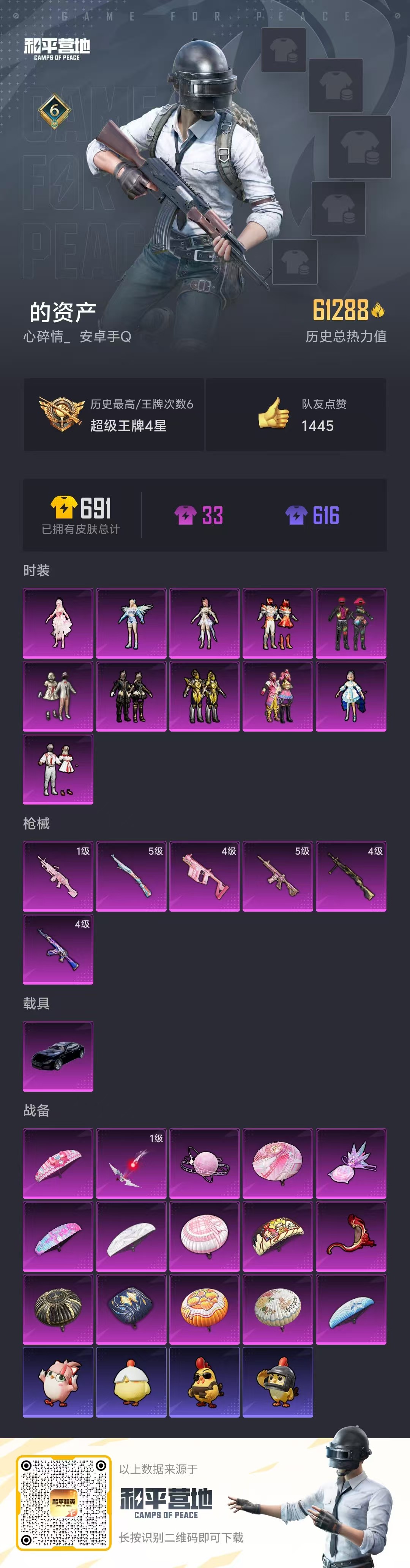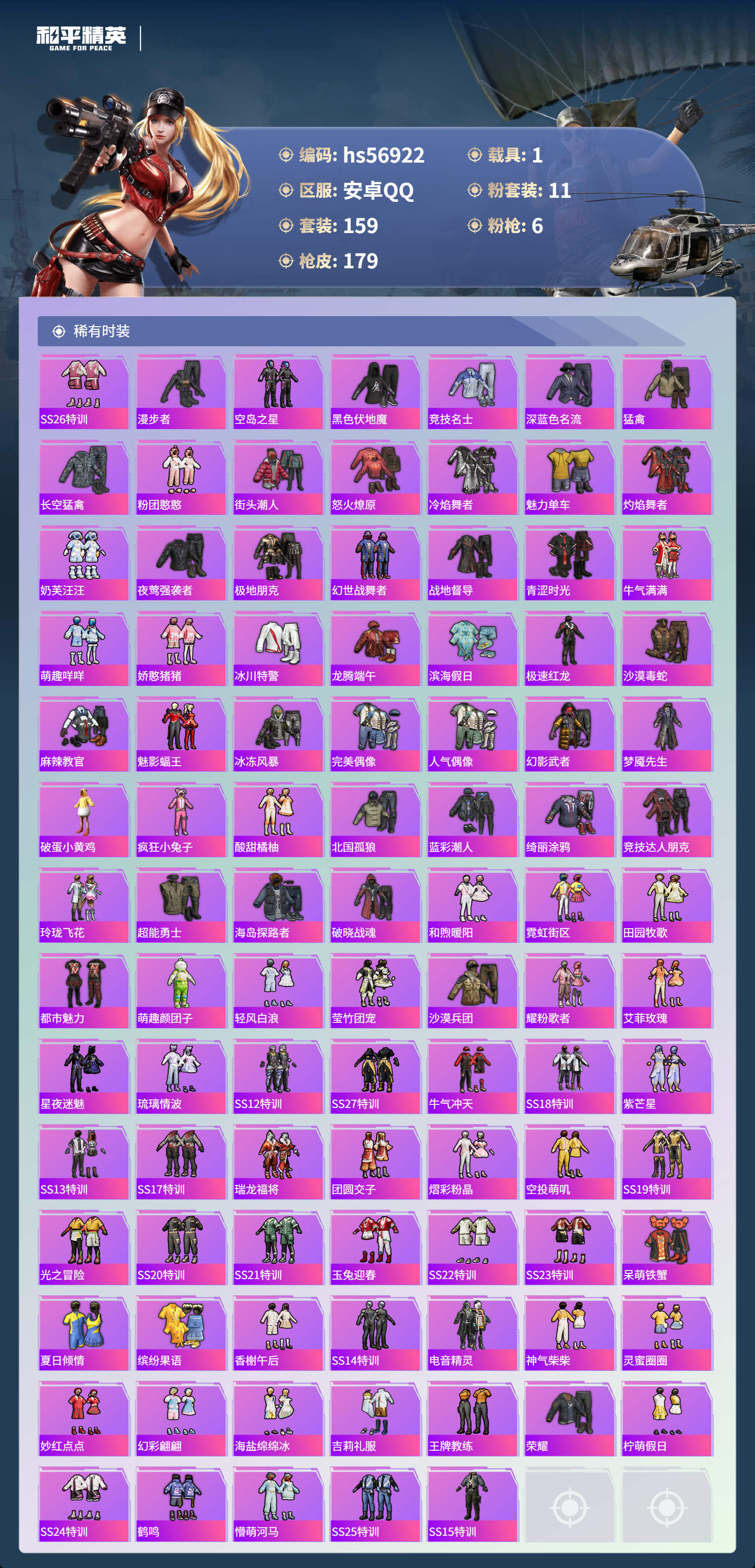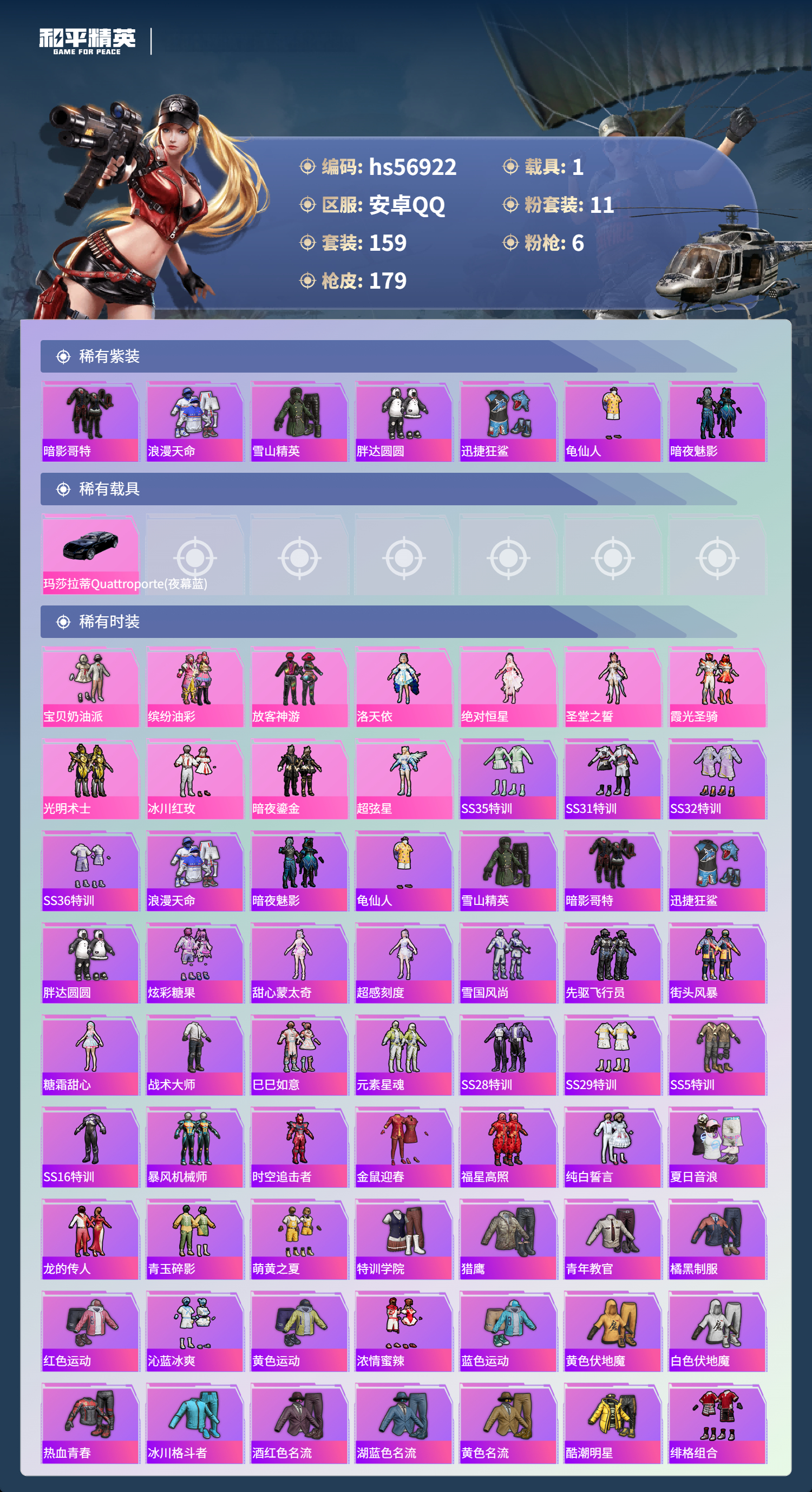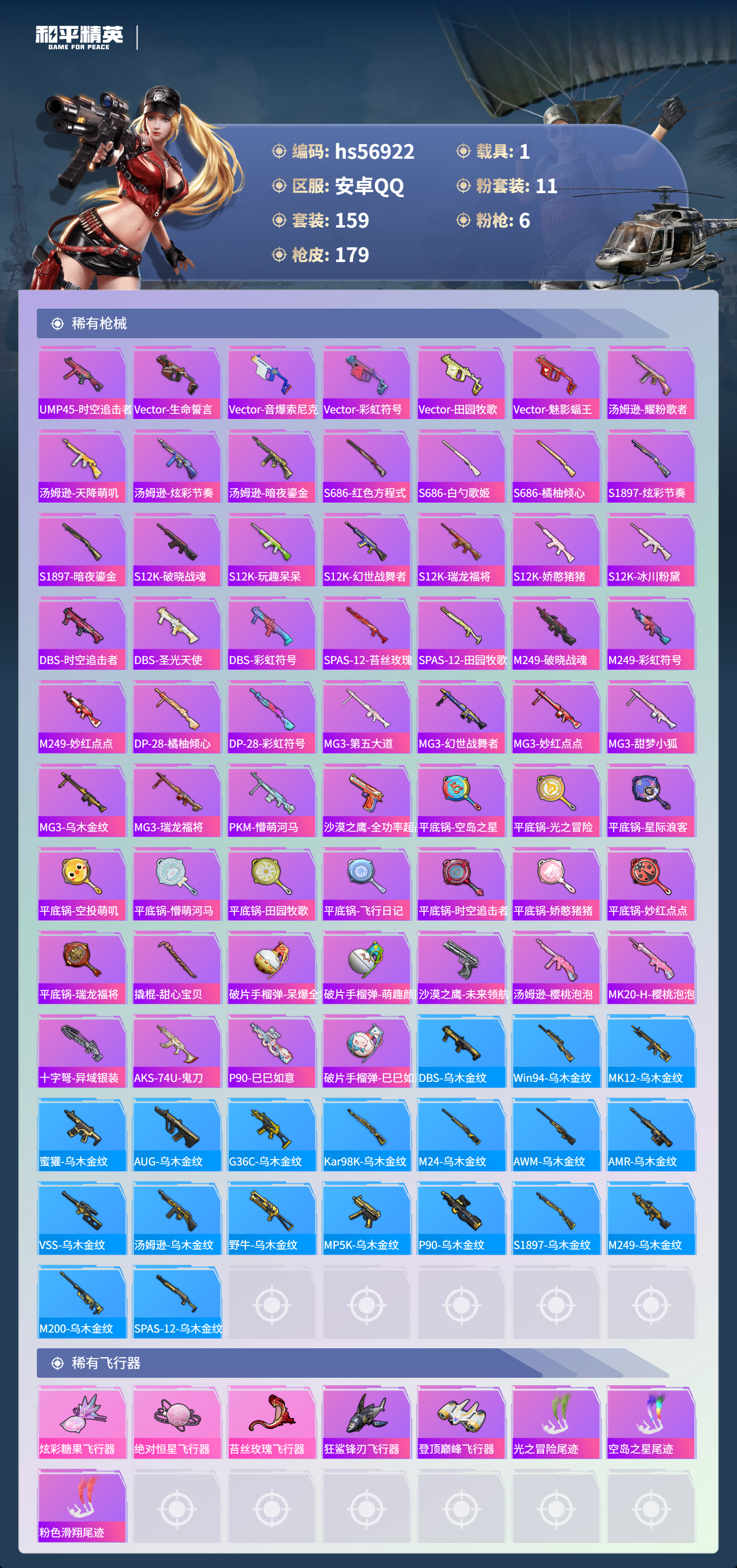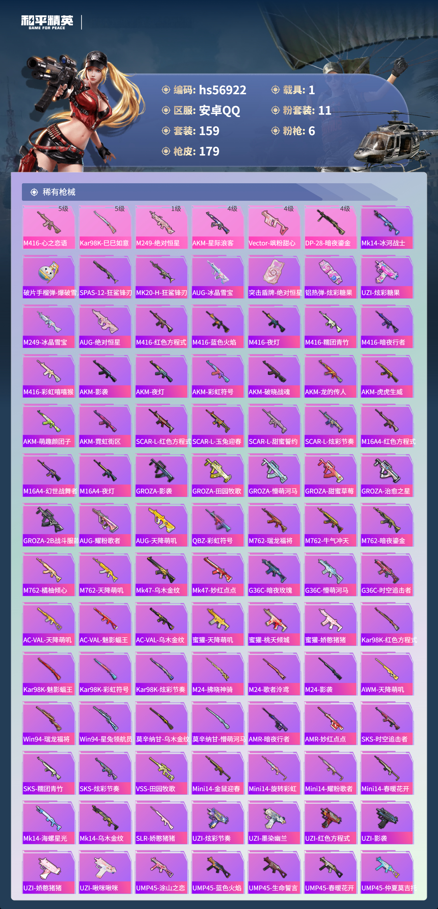 2382573安卓手q-6王牌印记-11粉装-6特效呛-1载具-61288热力值-159套装-179呛皮 【11粉装】角色-洛天依套装-暗夜鎏金套装-缤纷油彩套装-宝贝奶油派角色-圣堂之誓套装-冰川红玫套装-放客神游角色-超弦星套装-光明术士套装-霞光圣骑角色-绝对恒星 【6特效呛】kar98k-巳巳如意/5级akm-星际浪客/4级vect-飒粉甜心/4级m