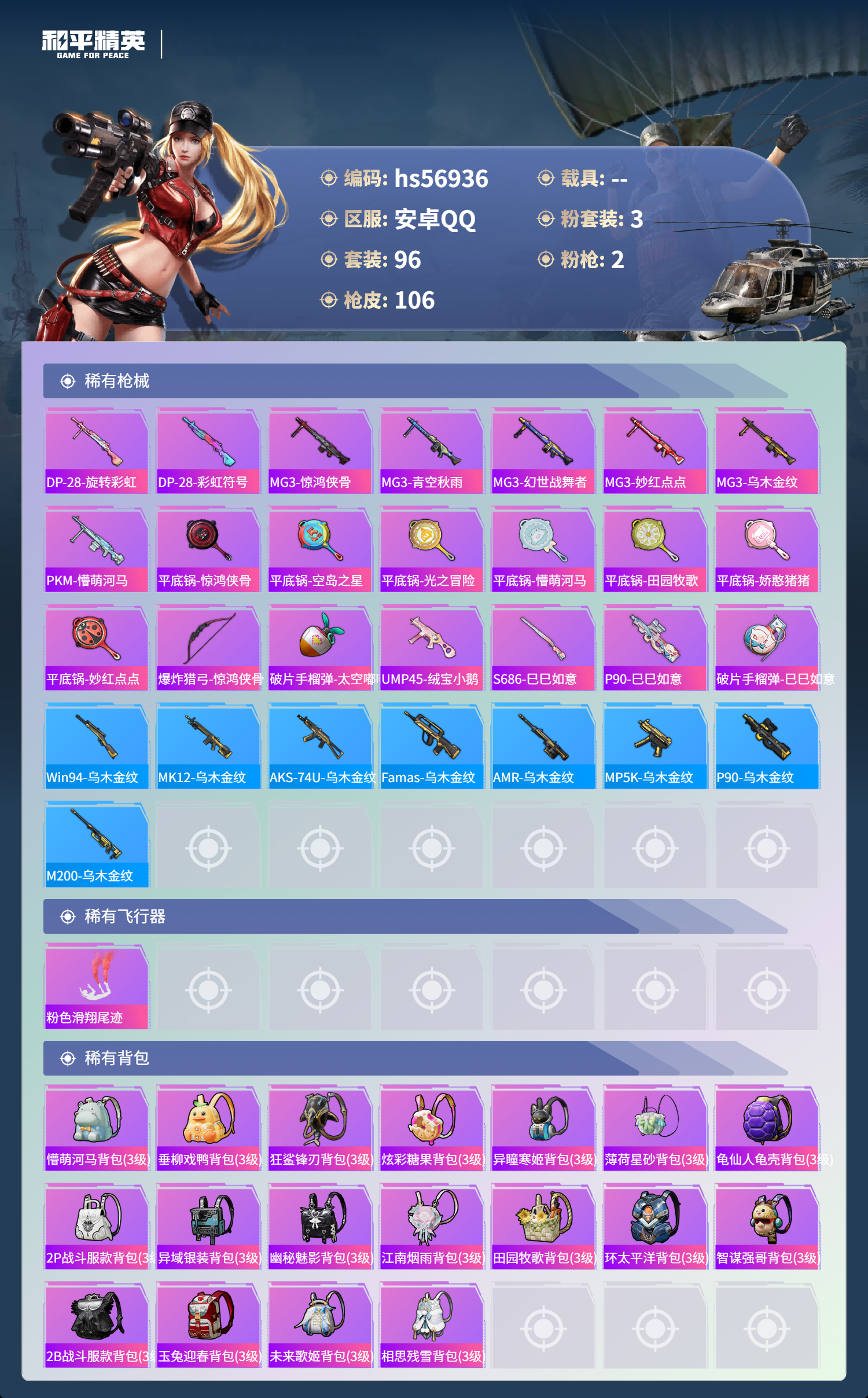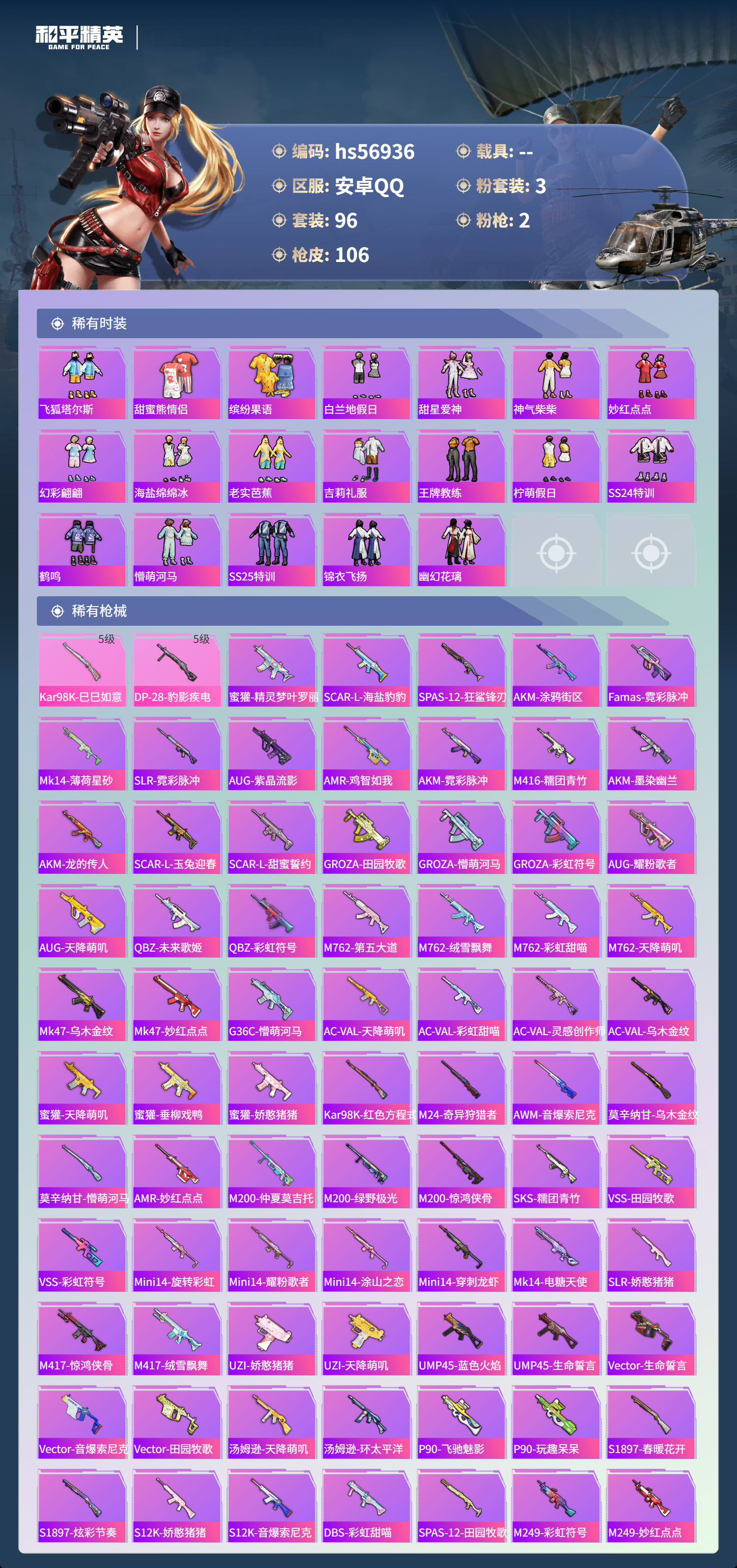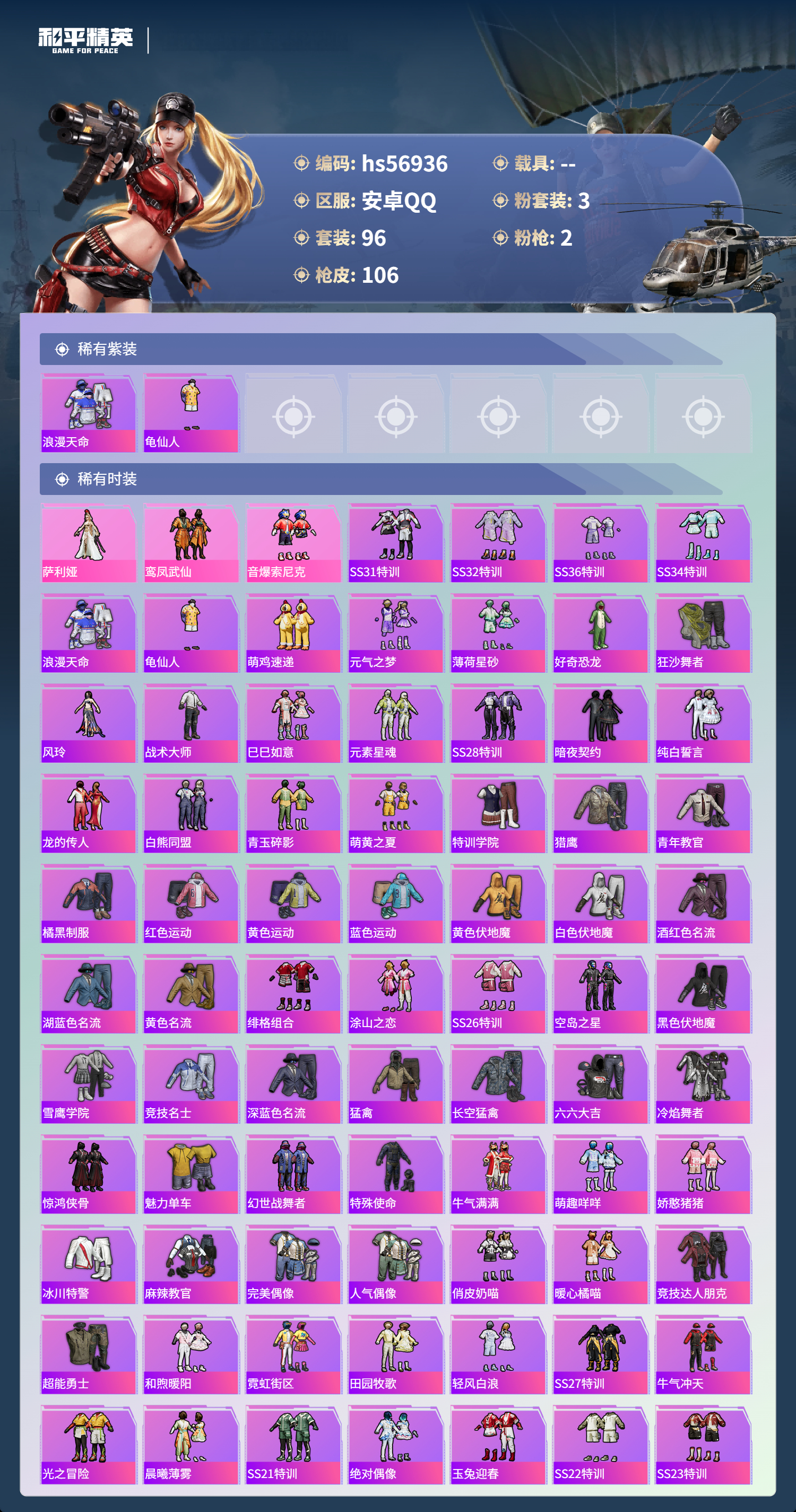 0载具-96套装-106呛皮-hs56936 安卓手q-5王牌印记-3粉装-2特效呛-30235热力值-96套装-106呛皮-1卓越印记【3粉装】套装-音爆索尼克套装-鸾凤武仙角色-萨利娅【2特效呛】dp-28-豹影疾电/5级kar98k-巳巳如意/5级【2稀有紫装】浪漫天命龟仙人【96稀有时装】ss31特训ss32特训ss36特训ss34特训浪漫天命龟仙人萌鸡速递元气之梦薄荷星砂萨利娅鸾凤