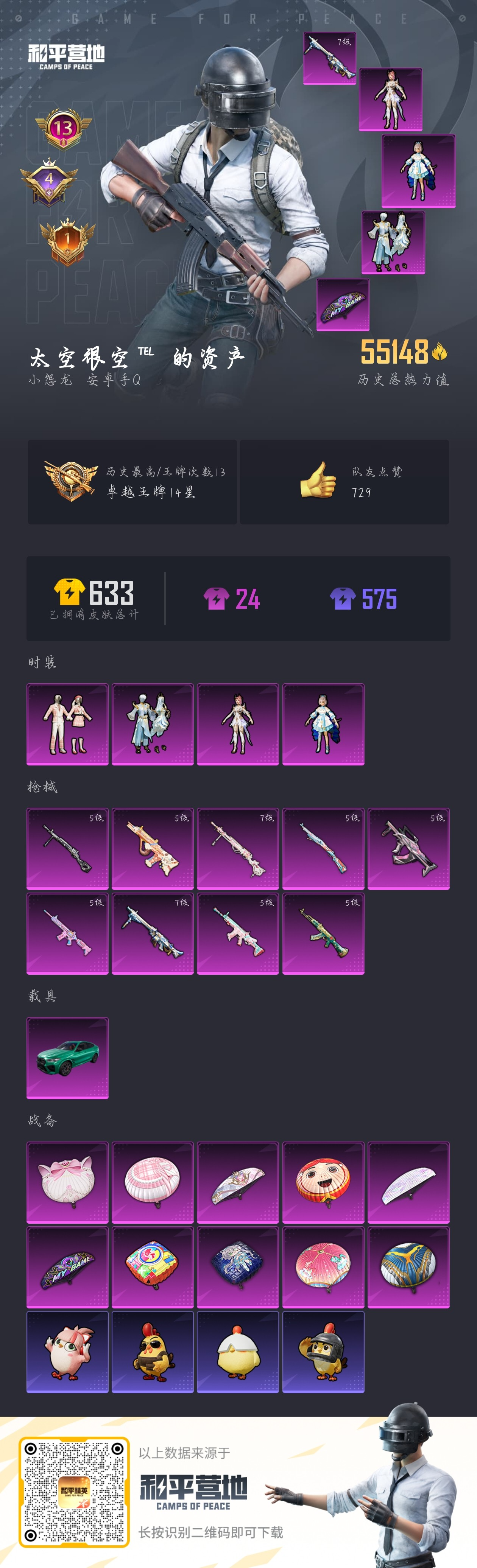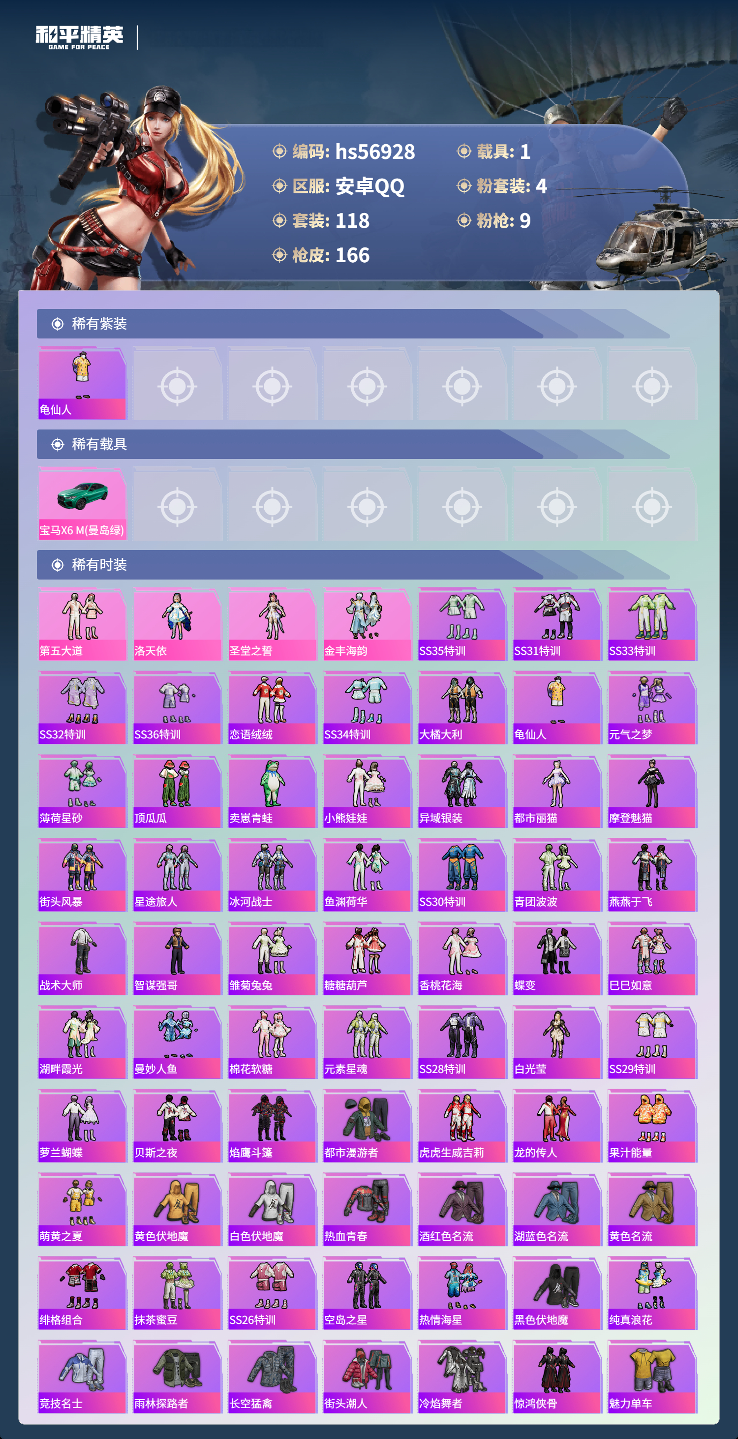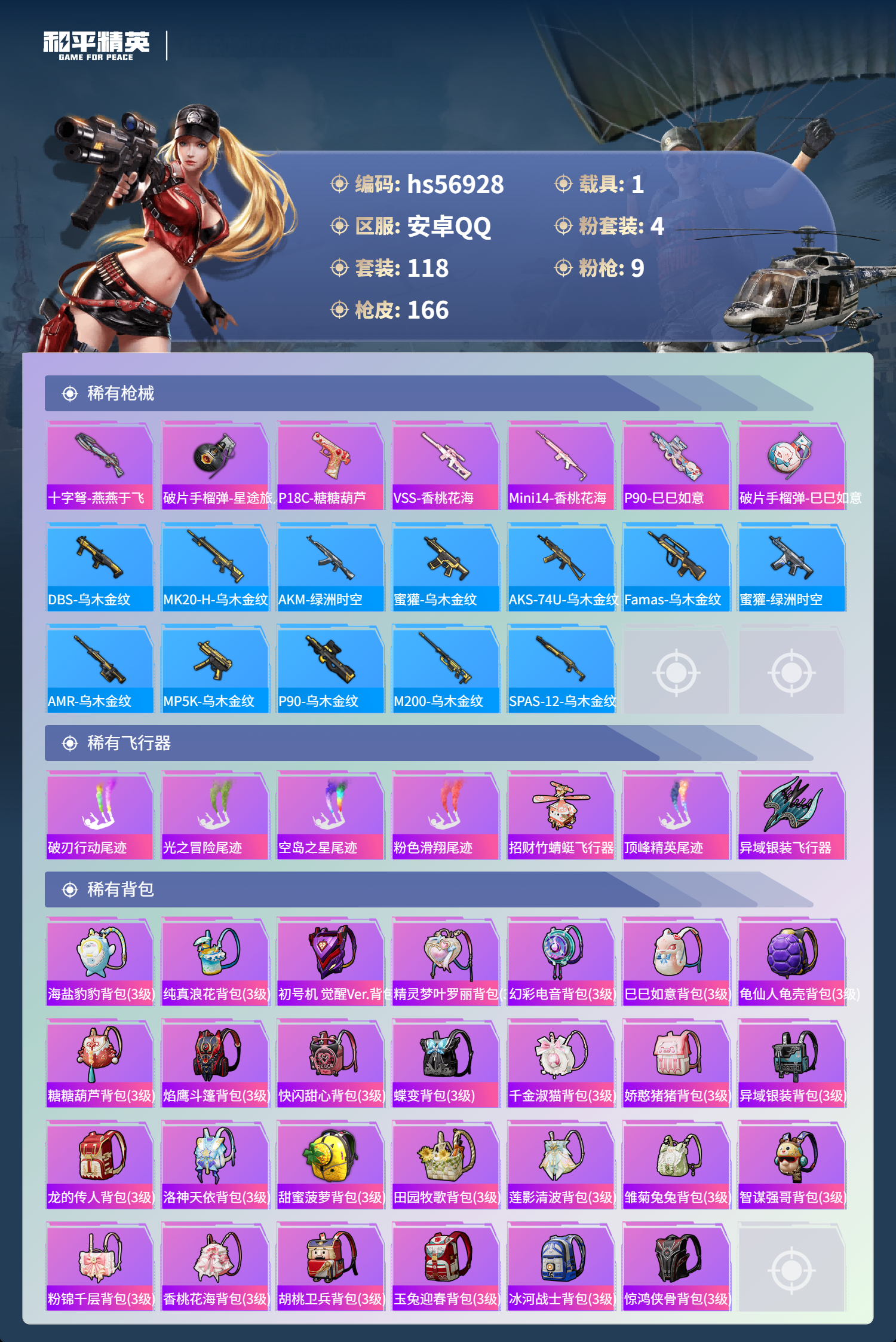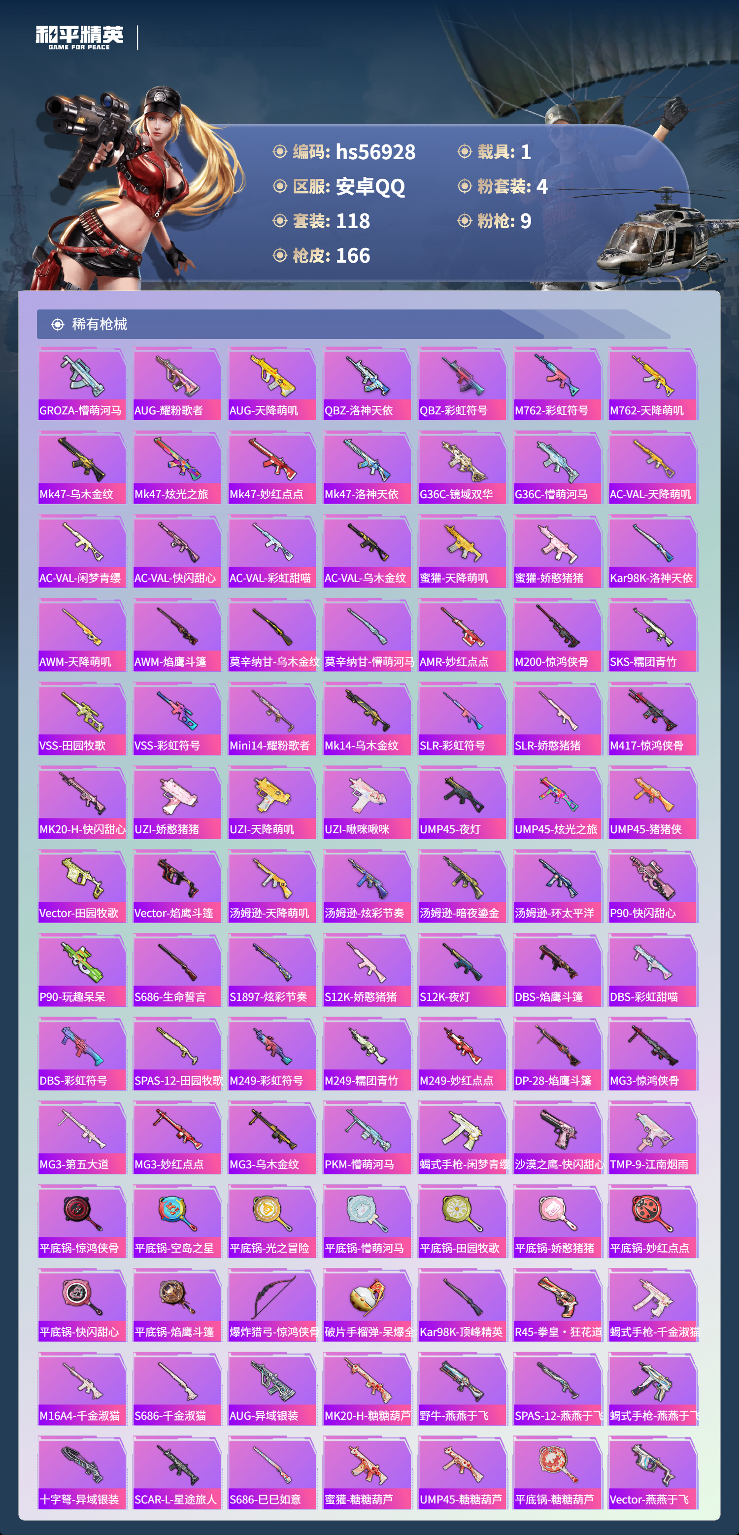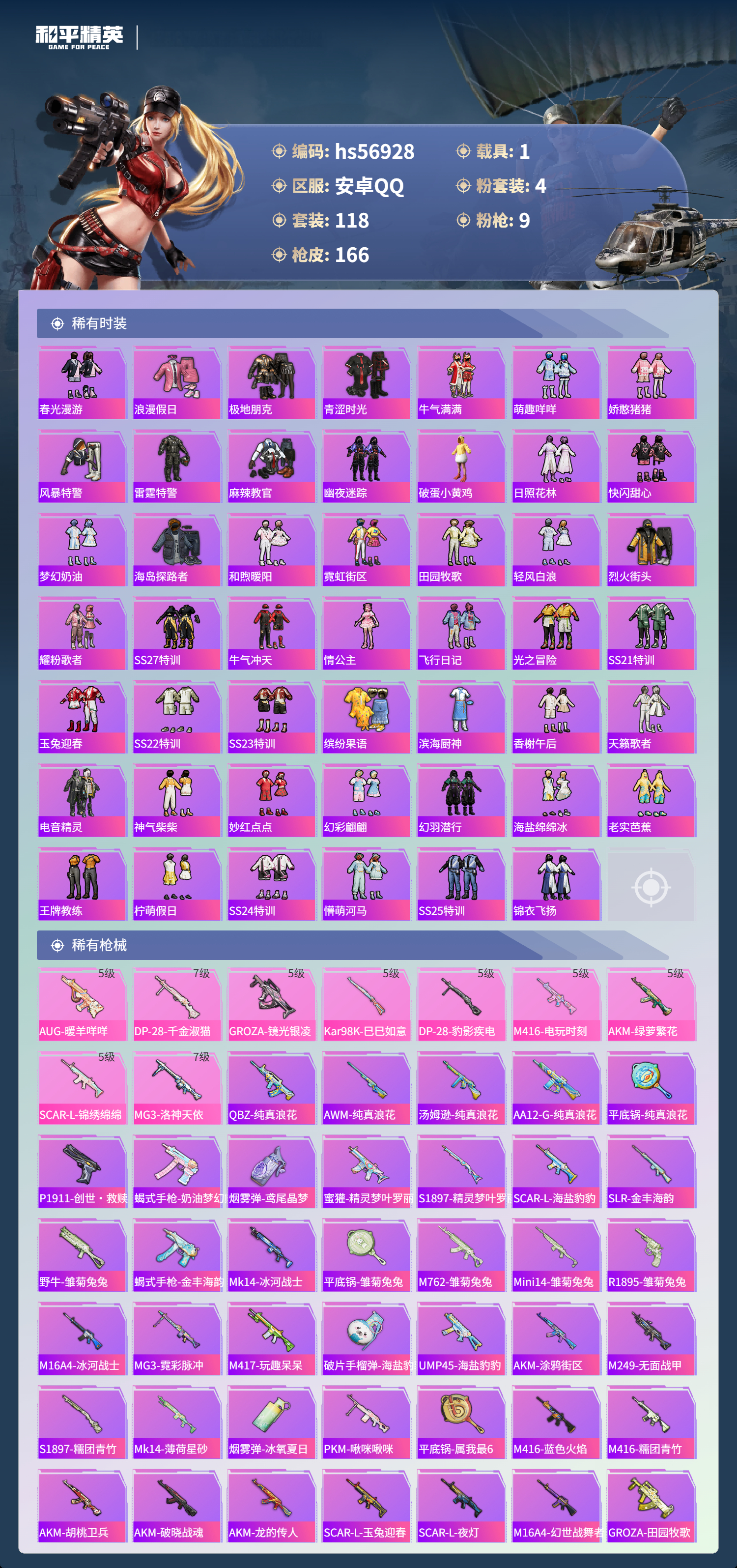 hs56928 安卓手q-13王牌印记-4粉装-9特效呛-1载具-55148热力值-118套装-166呛皮-4卓越印记-1传奇印记【4粉装】套装-金丰海韵套装-第五大道角色-洛天依角色-圣堂之誓【9特效呛】dp-28-千金淑猫/7级akm-绿萝繁花/5级kar98k-巳巳如意/5级dp-28-豹影疾电/5级scar-l-锦绣绵绵/5级groza-镜光银凌/5级mg3-洛神天依