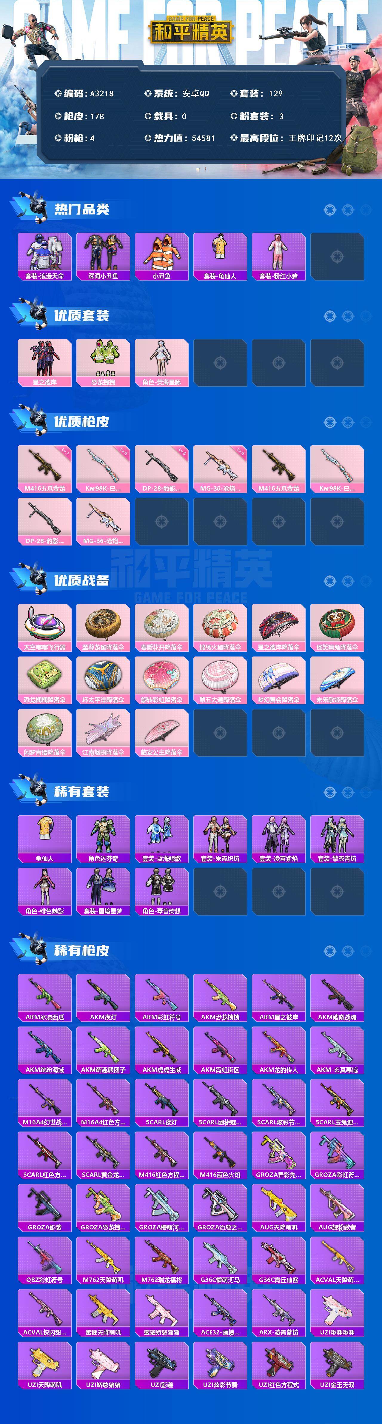 [15498010]安卓 【公主号 浪漫天命/深海小丑鱼/星之彼岸/恐龙拽拽/m416-五爪金龙七级】手q-3粉装-4特效呛-0载具-2粉色飞行器-54581热力值-12王牌印记-129套装-178呛皮 【热门品类】:套装-浪漫天命,套装-深海小丑鱼,套装-小丑鱼,套装-龟仙人,套装-粉红小猪 【粉色套装】:粉装-星之彼岸,粉装-恐龙拽拽,角色-荧海星豚 【粉色呛皮等级】:m416-五爪金龙七级,kar98k-巳巳如意五级,dp-28-豹影疾电五级,mg-36-沧焰双生五级 【粉色呛皮】:m416-五爪金龙,kar98k-巳巳如意,dp-28-豹影疾电,mg-36-沧焰双生 【粉色飞行器】:太空嘟嘟飞行器 【粉色降落伞】:至尊龙雀降落伞,春暖花开降落伞,锦绣火鲤降落伞,星之彼岸降落伞,怪笑疯兔降落伞,恐龙拽拽降落伞,环太平洋降落伞,旋转彩虹降落伞,第五大道降落伞,梦幻舞会降落伞,未来歌姬降落伞,闲梦青缨降落伞,江南烟雨降落伞,临安公主降落伞,炫彩糖果降落伞 【稀有套装】:套装-龟仙人,角色-达芬奇,套装-蓝海鲸歌,套装-朱霞炽焰,套装-凌霄紫焰,套装-擎苍青焰,角色-绯色魅影,套装-画境星梦,套装-琴音绮想,套装-炫彩糖果 【稀有呛皮】:akm-冰凉西瓜,akm-夜灯,akm-彩虹符号,akm-恐龙拽拽,akm-星之彼岸,akm-破晓战魂,akm-缤纷海域,akm-萌趣颜团子,akm-虎虎生威,akm-霓虹街区,akm-龙的传人,akm-玄冥寒域,m16a4-幻世战舞者,m16a4-红色方程式,scar-l-夜灯,scar-l-幽秘魅影,scar-l-炫彩节奏,scar-l-玉兔迎春,scar-l-红色方程式,scar-l-黄金龙骨,m416-红色方程式,m416-蓝色火焰,groza-异彩先驱,groza-彩虹符号,groza-影袭,groza-恐龙拽拽,groza-懵萌河马,groza-治愈之星,aug-天降萌叽,aug-耀粉歌者,q-彩虹符号,m762-天降萌叽,m762-瑞龙福将,g36c-懵萌河马,g36c-青丘仙客,ac-val-天降萌叽,ac-val-快闪甜心,蜜獾-天降萌叽,蜜獾-娇憨猪猪,ace32-画境星梦,arx-凌霄紫焰,uzi-啾咪啾咪,uzi-天降萌叽,uzi-娇憨猪猪,uzi-影袭,uzi-炫彩节奏,uzi-红色方程式,uzi-金