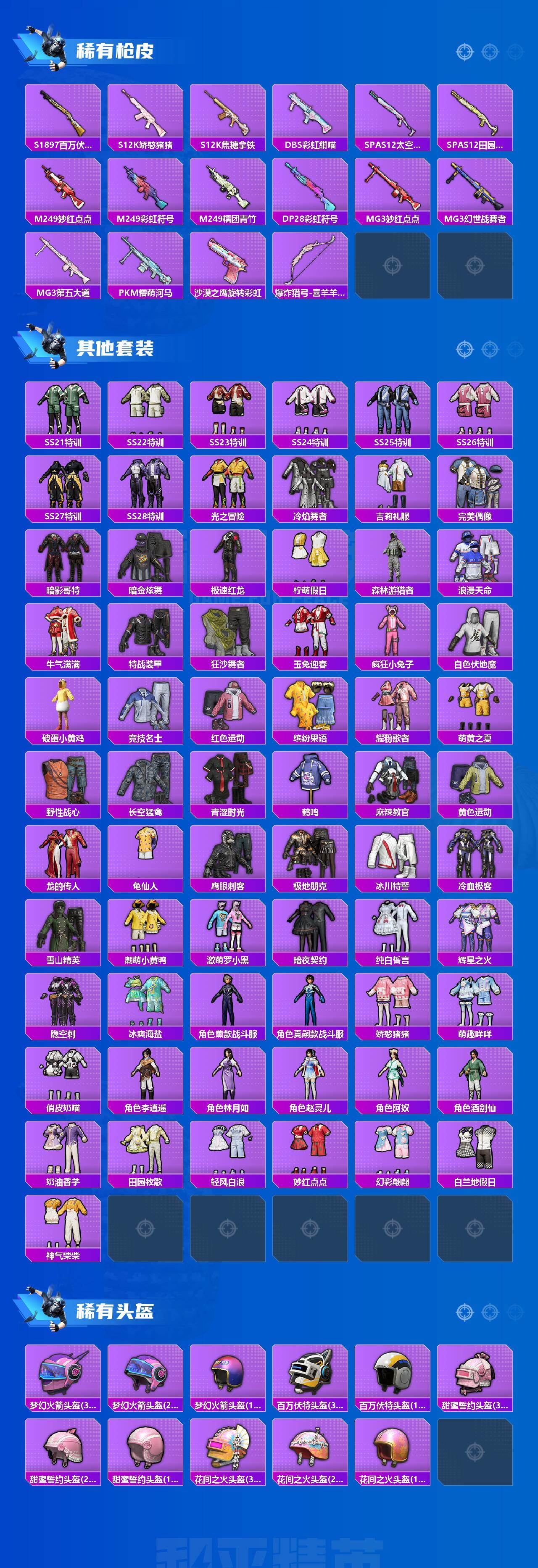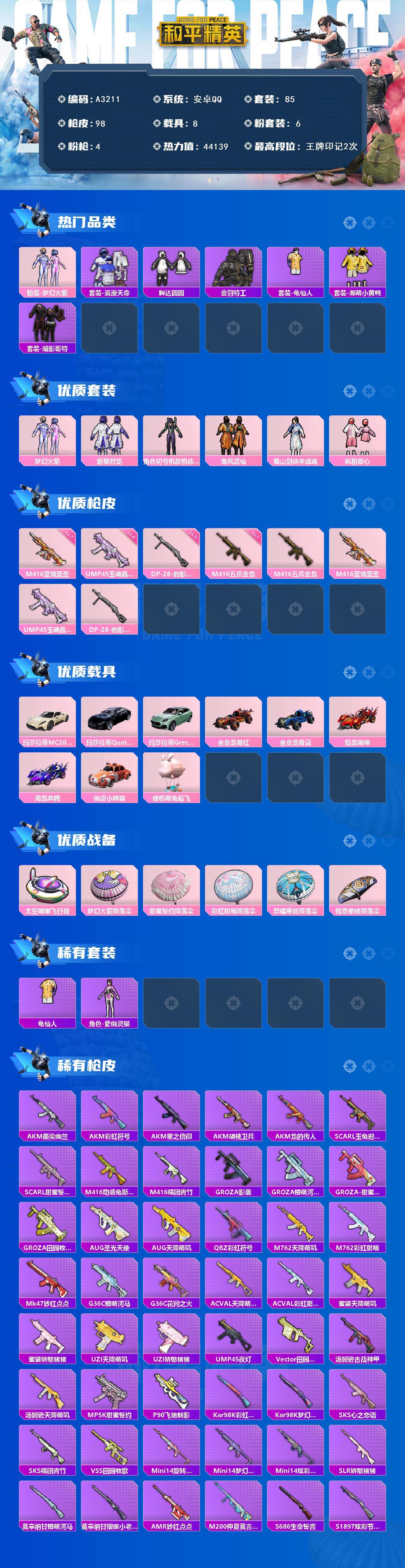 [15498144]安卓 【素材号 梦幻火箭/浪漫天命/胖达圆圆/暗影哥特/m416-至情至圣七级/玛莎拉蒂mc20(星石白)】手q-6粉装-4特效呛-8载具-3粉色飞行器-44139热力值-2王牌印记-85套装-98呛皮 【热门品类】:粉装-梦幻火箭,套装-浪漫天命,套装-胖达圆圆,套装-金羽特工,套装-龟仙人,套装-潮萌小黄鸭,套装-暗影哥特 【粉色套装】:粉装-梦幻火箭,粉装-新星烈龙,角色-初号机款机体服,粉装-鸾凤武仙,蜀山剑侠-李,粉装-飒粉甜心 【粉色呛皮等级】:m416-五爪金龙一级,m416-至情至圣七级,ump45-玉魂晶魄四级,dp-28-豹影疾电三级 【粉色载具】:玛莎拉蒂mc20(星石白),玛莎拉蒂quattropte(夜幕蓝),玛莎拉蒂grecale(薄荷绿),合金龙骨(红),合金龙骨(蓝),焰龙咆哮,海龙奔腾,俏皮小熊猫,僚机-萌兔起飞 【粉色呛皮】:m416-五爪金龙,m416-至情至圣,ump45-玉魂晶魄,dp-28-豹影疾电 【粉色飞行器】:太空嘟嘟飞行器 【粉色降落伞】:梦幻火箭降落伞,甜蜜誓约降落伞,彩虹甜喵降落伞,异瞳寒姬降落伞,极意拳锋降落伞,炫彩糖果降落伞 【稀有套装】:套装-龟仙人,角色-紫俏灵猫,套装-炫彩糖果 【稀有呛皮】:akm-墨染幽兰,akm-彩虹符号,akm-星之信仰,akm-胡桃卫兵,akm-龙的传人,scar-l-玉兔迎春,scar-l-甜蜜誓约,m416-动感兔斯基,m416-糯团青竹,groza-影袭,groza-懵萌河马,groza-甜蜜草莓,groza-田园牧歌,aug-圣光天使,aug-天降萌叽,q-彩虹符号,m762-天降萌叽,m762-彩虹甜喵,mk47-妙红点点,g36c-懵萌河马,g36c-花间之火,ac-val-天降萌叽,ac-val-彩虹甜喵,蜜獾-天降萌叽,蜜獾-娇憨猪猪,uzi-天降萌叽,uzi-娇憨猪猪,ump45-夜灯,vect-田园牧歌,汤姆逊-古战神甲,汤姆逊-天降萌叽,mp5k-甜蜜誓约,p90-飞驰魅影,kar98k-彩虹符号,kar98k-梦幻火箭,sks-心之恋语,sks-糯团青竹,vss-田园牧歌,mini14-旋转彩虹,mini14-梦幻火箭,mini14-炫彩节奏,slr-娇憨猪猪,莫辛纳甘-懵萌河马,莫辛纳甘-银碳小老虎,amr-妙红