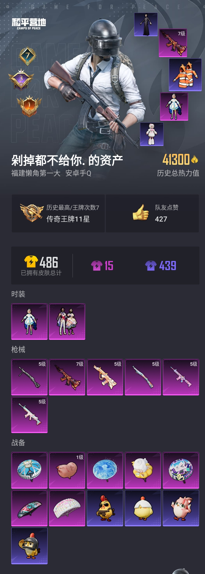 【和平精英】【lyhp19834】2粉装,6特效呛,0载具,历史最高段位:传奇王牌11星 王牌印记7次 热力值:42128,100套装,145呛械,152装备,78战备;套装:角色-洛天依,套装-星穹咏叹调,套装-特训学院,套装-青年教官,套装-红色运动,套装-黄色运动,套装-蓝色运动,套装-黑色伏地魔,套装-竞技名士,套装-湖蓝色名流,套装-黄色名流,套装-猛禽,套装-长空猛禽,套装-海岛探路者,套装-旭日情侣,套装-特战装甲,套装-特殊使命,套装-甜蜜告白,套装-龙腾端午,套装-燃烧卡路里,套装-冰冻风暴,套装-完美偶像,套装-魅力单车,套装-绮丽涂鸦,套装-都市漫游者,套装-野性战心,套装-超能勇士,套装-幻世战舞者,套装-清新柠檬,套装-夏日倾情,套装-缤纷果语,套装-龙魂突击队,套装-冰川特警,套装-小丑鱼,套装-粉红小猪,套装-鹤鸣,套装-霓虹街区,套装-萌黄之夏,套装-探宝勇士,套装-战术大师,套装-ss18特训,套装-飞行日记,套装-热情海星,套装-纯真浪花,套装-电音精灵,套装-ss19特训,套装-ss20特训,套装-ss21特训,套装-ss22特训,套装-光之冒险,套装-ss23特训,套装-王牌教练,套装-柠萌假日,套装-ss24特训,套装-龟仙人,套装-果汁能量,套装-ss26特训,套装-快闪甜心,套装-春光漫游,套装-漫游都市,套装-空岛之星,套装-贝斯之夜,玩偶服-菲菲,套装-焰鹰斗篷,套装-幻羽潜行,套装-ss27特训,套装-恋语绒绒,套装-ss28特训,玩偶服-卖崽青蛙,角色-情公主,套装-海盐绵绵冰,套装-蝶变,套装-异域银装,套装-ss30特训,套装-ss31特训,套装-鱼渊荷华,套装-燕燕于飞,套装-紫幽梦,套装-粉恋花,套装-ss33特训,角色-猎影月神,套装-云朵鹅,套装-ss32特训,套装-彩虹兔,套装-蓝冰羽,套装-顶瓜瓜,套装-雪绒豹,套装-大橘大利,套装-霓虹热舞,玩偶服-美羊羊,套装-元气之梦,套装-ss34特训,套装-擎苍青焰,套装-朱霞炽焰,角色-申公豹,套装-游乐,套装-凌霄紫焰,套装-ss35特训,套装-ss36特训,套装-萌鸡速递;呛皮:akm-破晓战魂,akm-霓虹街区,akm-涂鸦街区,akm-江南烟雨,akm-霓彩脉冲,akm-绿洲时空,arx-凌霄紫焰,5级scar-l-锦绣绵绵,scar-l-红色方程式,scar-l-夜灯,scar-l-炫彩节奏,scar-l-海盐豹豹,m16a4-幻世战舞者,5级aug-暖羊咩咩,aug-耀粉歌者,aug-天降萌叽,aug-异域银装,aug-紫晶流影,7级m416-风花雪月,5级m416-电玩时刻,m416-蓝色火焰,m416-糯团青竹,m416-魔童闹海 敖闰,q-洛神天依,q-纯真浪花,蜜獾-天降萌叽,蜜獾-绯穹魔姬,蜜獾-乌木金纹,groza-影袭,groza-彩虹符号,famas-突变脉冲,famas-霓彩脉冲,famas-乌木金纹,m762-奇异狩猎者,m762-天降萌叽,m762-云朵鹅,ac-val-天降萌叽,ac-val-快闪甜心,g36c-星穹咏叹调,mk47-乌木金纹,5级kar98k-巳巳如意,kar98k-影袭,kar98k-炫彩节奏,awm-天降萌叽,awm-焰鹰斗篷,awm-纯真浪花,win94-乌木金纹,m200-乌木金纹,m24-影袭,m24-乌木金纹,svd-云朵鹅,svd-霓彩脉冲,amr-乌木金纹,莫辛纳甘-乌木金纹,mk20-h-快闪甜心,mk20-h-乌木金纹,mini14-耀粉歌者,mini14-香桃花海,mini14-绯穹魔姬,mini14-鸡智如我,mk14-暗星紫秘,mk14-乌木金纹,mk14-冰河战士,mk14-紫幽梦,mk14-薄荷星砂,mk14-紫晶流影,mk12-乌木金纹,vss-彩虹符号,slr-彩虹符号,slr-霓彩脉冲,m417-玩趣呆呆,m417-幻影飞狐,ump45-夜灯,ump45-蓝色火焰,ump45-海盐豹豹,野牛-燕燕于飞,野牛-乌木金纹,汤姆逊-耀粉歌者,汤姆逊-炫彩节奏,汤姆逊-纯真浪花,vect-生命誓言,vect-焰鹰斗篷,vect-燕燕于飞,js9-凌霄紫焰,uzi-红色方程式,uzi-天降萌叽,uzi-冰河战士,uzi-啾咪啾咪,uzi-炫彩糖果,aks-74u-粉粉喵呜,aks-74u-鸡智如我,aks-74u-乌木金纹,p90-快闪甜心,p90-玩趣呆呆,mp5k-乌木金纹,s12k-破晓战魂,s12k-夜灯,s12k-玩趣呆呆,spas-12-燕燕于飞,spas-12-云朵鹅,spas-12-乌木金纹,aa12-g-纯真浪花,s1897-紫幽梦,s1897-糯团青竹,dbs-彩虹符号,dbs-焰鹰斗篷,dbs-乌木金纹,s686-生命誓言,5级dp-28-豹影疾电,dp-28-彩虹符号,dp-28-焰鹰斗篷,mg-36-凌霄紫焰,mg-36-薄荷星砂,pkm-啾咪啾咪,pkm-紫幽梦,mg3-幻世战舞者,mg3-乌木金纹,沙墨之鹦-快闪甜心,沙墨之鹦-云朵鹅,r45-幻彩电音,蝎式手呛-燕燕于飞,p18c-竞速先锋,p92-紫幽梦,p92-凌霄紫焰,电击呛-喜羊羊与灰太狼,tmp-9-江南烟雨,信号呛-异瞳寒姬,平底锅-光之冒险,平底锅-快闪甜心,平底锅-焰鹰斗篷,平底锅-纯真浪花,平底锅-紫幽梦,平底锅-属我最6,平底锅-凌霄紫焰,大砍刀-云朵鹅,大砍刀-冰澜龙吟,十子怒-异瞳寒姬,十子怒-燕燕于飞,十子怒-异域银装,破片手留单-呆爆全场,破片手留单-海盐豹豹,破片手留单-拽到爆炸,盐雾蛋-冰氧夏日,铝热弹-炫彩糖果,爆炸猎弓-喜羊羊与灰太狼;降落伞:飞天猪飞行器,光之冒险尾迹,空岛之星尾迹,异域银装飞行器,破刃行动尾迹; 详情看图4w1热力值精品小号 2粉装6特效呛 洛天依 星穹咏叹调 申公豹 小丑鱼 满级雪月m4 满级aug