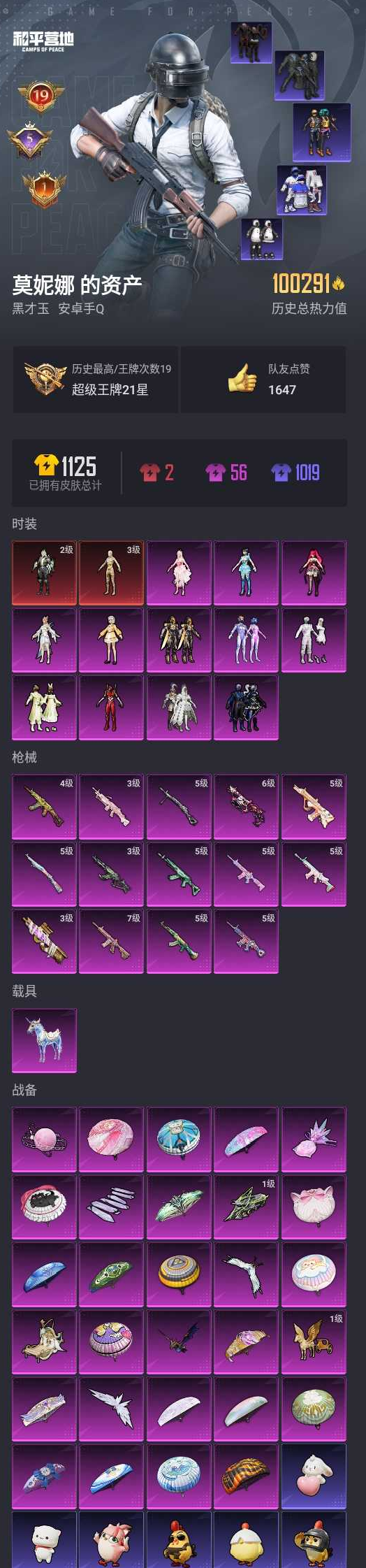 【和平精英】【lyhp19848】12粉装,14特效呛,1载具,历史最高段位:超级王牌21星 王牌印记19次 热力值:100291,231套装,301呛械,376装备,187战备;套装:沙丘之主-图卡盟,幽焰骑士-维塔,套装-梦幻火箭,套装-冰霜白皇,套装-暗夜玫瑰,角色-2号机款机体服,角色-呆萌星弥,套装-闲梦青缨,套装-镜光幻境,套装-创世·救赎,角色-异瞳寒姬,角色-绯穹魔姬,角色-月影灵韵,角色-绝对恒星,套装-特训学院,套装-猎鹰,套装-青年教官,套装-橘黑制服,套装-红色运动,套装-黄色运动,套装-蓝色运动,套装-黄色伏地魔,套装-白色伏地魔,套装-黑色伏地魔,套装-骑行爱好者,套装-登山爱好者,套装-竞技名士,套装-深蓝色名流,套装-酒红色名流,套装-湖蓝色名流,套装-黄色名流,套装-猛禽,套装-长空猛禽,套装-漫步者,套装-黎明保卫者,套装-海岛探路者,套装-旭日情侣,套装-冷焰舞者,套装-灼焰舞者,套装-都市猎人,套装-浪漫天命,套装-特战装甲,套装-贵族骑装,套装-战地督导,套装-青春校园,套装-甜蜜告白,套装-迎春赐吉,套装-春日漫步,套装-潮流先锋,套装-龙腾端午,套装-燃烧卡路里,套装-滨海假日,套装-沙漠毒蛇,套装-鹰眼刺客,套装-冰冻风暴,套装-完美偶像,套装-人气偶像,套装-幻影武者,套装-街头潮人,套装-蓝彩潮人,套装-魅力单车,套装-绮丽涂鸦,套装-耀眼新星,套装-坚韧舞者,套装-竞技达人朋克,套装-都市漫游者,套装-野性战心,套装-野性战魂,套装-破晓战魂,套装-都市魅力,套装-荣耀,套装-风行保卫者,套装-热血青春,套装-沙漠兵团,套装-酷潮明星,套装-幻世战舞者,套装-甜蜜菠萝,套装-金耀舞者,套装-蓝调潮人,套装-暗影哥特,套装-深海小丑鱼,套装-甜蜜熊情侣,套装-青涩时光,套装-缤纷果语,套装-alan walker,套装-龙魂突击队,套装-冰川特警,套装-元素星魂,套装-胖达圆圆,套装-极速红龙,套装-麻辣教官,套装-破蛋小黄鸡,套装-霓虹街区,套装-激萌罗小黑,套装-软萌银虎,套装-白熊同盟,套装-萌黄之夏,套装-探宝勇士,套装-牛气满满,套装-白糯汤圆,套装-韶华初心,套装-青春冒险家,套装-潮流游乐家,套装-萌趣颜团子,套装-特种颜团子,套装-战术大师,套装-牛气冲天,套装-ss18特训,套装-耀粉歌者,套装-飞行日记,套装-ss13特训,套装-曼妙人鱼,套装-热情海星,套装-纯真浪花,套装-ss14特训,角色-捷德奥特曼,套装-吉莉礼服,角色-明日香款战斗服,角色-薰款战斗服,套装-ss15特训,套装-ss16特训,套装-暴风机械师,套装-时空追击者,套装-暗夜傀儡,套装-ss17特训,套装-瑞龙福将,套装-团圆交子,套装-极乐追光,套装-福星高照,套装-虎虎生威吉莉,套装-异彩先驱,套装-霓虹极客,套装-空投萌叽,套装-ss19特训,套装-飞驰魅影,套装-音速流光,套装-ss20特训,套装-ss21特训,套装-玉兔迎春,套装-ss22特训,套装-光之冒险,套装-绯格组合,套装-ss23特训,套装-王牌教练,套装-柠萌假日,套装-青玉碎影,套装-ss24特训,套装-霓虹闪烁,套装-龟仙人,套装-涂山之恋,套装-ss25特训,套装-惊鸿侠骨,套装-锦衣飞扬,套装-云霞荷露,套装-香桃花海,套装-潮酷猛小鳄,套装-龙的传人,套装-冰河战士,套装-ss26特训,套装-快闪甜心,套装-春光漫游,套装-空岛之星,套装-无暇誓言,套装-贝斯之夜,玩偶服-超人强,套装-焰鹰斗篷,套装-幽夜迷踪,套装-幻羽潜行,套装-ss27特训,套装-恋语绒绒,套装-老实芭蕉,套装-ss28特训,角色-湖雨初晴,玩偶服-卖崽青蛙,角色-拉斐尔,角色-粉雾星云,套装-街头风暴,套装-海盐绵绵冰,套装-蝶变,套装-粉日山川,套装-小熊娃娃,套装-ss29特训,套装-雏菊兔兔,套装-萝兰蝴蝶,角色-绯色魅影,套装-先驱飞行员,套装-异域银装,角色-摩登魅猫,套装-星途旅人,套装-ss30特训,套装-青团波波,套装-棉花软糖,角色-夜瞳黯灵,角色-绛羽幽主,套装-糖糖葫芦,套装-绒宝小鹅,套装-ss31特训,套装-鱼渊荷华,套装-燕燕于飞,套装-智谋强哥,角色-海琴烟,套装-紫幽梦,套装-粉恋花,套装-ss33特训,套装-云朵鹅,套装-巳巳如意,套装-ss32特训,套装-彩虹兔,套装-蓝冰羽,套装-顶瓜瓜,套装-雪绒豹,套装-狂鲨锋刃,套装-大橘大利,套装-极速光影,套装-炫彩糖果,套装-元气之梦,套装-ss34特训,套装-擎苍青焰,套装-朱霞炽焰,套装-凌霄紫焰,套装-薄荷星砂,套装-ss35特训,套装-午间小调,套装-秘语星愿,套装-风迹短诗,套装-粉黛兰香,角色-超感刻度,角色-甜心蒙太奇,套装-ss36特训,套装-雪国风尚,套装-萌鸡速递;呛皮:7级m416-心之恋语,5级m416-电玩时刻,m416-夜灯,m416-蓝色火焰,m416-红色方程式,m416-糯团青竹,蜜獾-天降萌叽,蜜獾-精灵梦叶罗丽,蜜獾-糖糖葫芦,蜜獾-绯穹魔姬,蜜獾-风迹短诗,蜜獾-乌木金纹,g36c-时空追击者,g36c-六号树人,g36c-星穹咏叹调,g36c-乌木金纹,5级m762-青锋波束,m762-奇异狩猎者,m762-瑞龙福将,m762-彩虹符号,m762-雏菊兔兔,m762-云朵鹅,arx-凌霄紫焰,q-彩虹符号,q-飞驰魅影,q-未来歌姬,q-纯真浪花,5级scar-l-童趣迷兔,5级scar-l-锦绣绵绵,scar-l-红色方程式,scar-l-黄金龙骨,scar-l-夜灯,scar-l-彩虹符号,scar-l-玉兔迎春,scar-l-是爱神辣,scar-l-星途旅人,scar-l-海盐豹豹,5级akm-绿萝繁花,3级akm-幽焰骑士,akm-生命誓言,akm-影袭,akm-奇异狩猎者,akm-缤纷海域,akm-破晓战魂,akm-霓虹街区,akm-夜灯,akm-涂鸦街区,akm-彩虹符号,akm-萌趣颜团子,akm-虎虎生威,akm-龙的传人,akm-江南烟雨,akm-霓彩脉冲,groza-影袭,groza-彩虹符号,groza-异彩先驱,groza-海盐豹豹,5级aug-暖羊咩咩,aug-甜蜜菠萝,aug-耀粉歌者,aug-青春冒险家,aug-天降萌叽,aug-异域银装,aug-