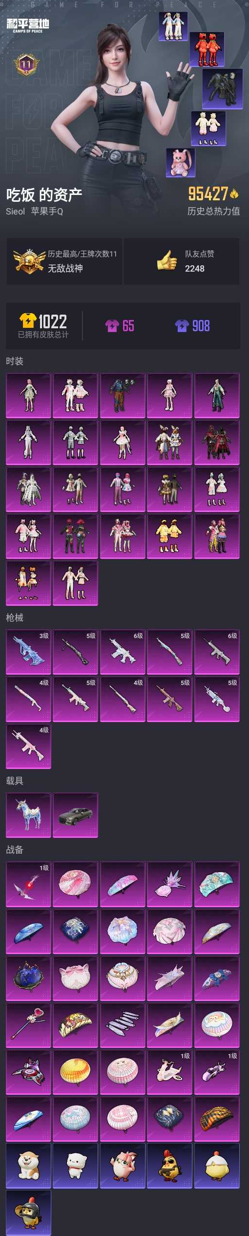 【和平精英】【lyhp19837】22粉装,11特效呛,2载具,历史最高段位:无敌战神 王牌印记11次 热力值:95427,203套装,279呛械,322装备,186战备;套装:套装-怪诞乔克,套装-甜心巧克力,套装-宝贝奶油派,套装-天使彩虹糖,套装-缤纷油彩,套装-放客神游,套装-馨动时刻,套装-冰霜白皇,套装-童趣迷兔,套装-炙焰红王,套装-橘柚倾心,套装-岚岚物语,套装-甜梦小狐,套装-彩虹甜喵,套装-第五大道,套装-蜜语绒猫,套装-憨憨奶龙,角色-美雪,角色-桃源时光,角色-冷漠罗丽,角色-羊梦糖心,角色-花灵,套装-特训学院,套装-猎鹰,套装-青年教官,套装-橘黑制服,套装-红色运动,套装-黄色运动,套装-蓝色运动,套装-黄色伏地魔,套装-竞技名士,套装-深蓝色名流,套装-酒红色名流,套装-湖蓝色名流,套装-黄色名流,套装-猛禽,套装-长空猛禽,套装-漫步者,套装-竞技勇士朋克,套装-黎明保卫者,套装-海岛探路者,套装-冷焰舞者,套装-灼焰舞者,套装-都市猎人,套装-浪漫天命,套装-特战装甲,套装-燃烧卡路里,套装-滨海假日,套装-鹰眼刺客,套装-冰冻风暴,套装-完美偶像,套装-人气偶像,套装-幻影武者,套装-魅力单车,套装-绮丽涂鸦,套装-狂战萌兔,套装-竞技达人朋克,套装-荣耀,套装-热血青春,套装-幻世战舞者,套装-血色贵族,套装-暗影哥特,套装-夏日倾情,套装-青涩时光,套装-缤纷果语,套装-滨海厨神,套装-龙魂突击队,套装-耀动青春,套装-格斗先锋,套装-破蛋小黄鸡,套装-北国孤狼,套装-玲珑飞花,套装-跃动心情,套装-鹤鸣,套装-暴走罗小黑,套装-潮萌小黄鸭,套装-大橘为重,套装-白糯汤圆,套装-青春冒险家,套装-潮流游乐家,套装-萌趣颜团子,套装-特种颜团子,套装-战术大师,套装-ss18特训,套装-耀粉歌者,套装-曼妙人鱼,套装-热情海星,套装-纯真浪花,套装-ss14特训,套装-天籁歌者,套装-吉莉礼服,套装-微雨春柳,套装-ss15特训,套装-ss16特训,套装-暴风机械师,套装-时空追击者,套装-暗夜魅影,套装-ss17特训,套装-醒狮腾龙,套装-瑞龙福将,套装-团圆交子,套装-福星高照,套装-霓虹极客,套装-ss19特训,套装-兔兔白日梦,套装-飞驰魅影,套装-音速流光,套装-ss20特训,套装-ss21特训,套装-荷畔雨呱,套装-红熊茄茄,套装-俏皮奶喵,套装-暖心橘喵,套装-轻风白浪,套装-绯格组合,套装-ss23特训,套装-莱茵河畔,套装-香榭午后,套装-甜梦熊熊,套装-神气柴柴,套装-懵萌河马,套装-妙红点点,套装-幻彩翩翩,套装-糯粉咩咩,套装-王牌教练,套装-ss24特训,套装-恋恋初桃,套装-龟仙人,套装-涂山之恋,套装-ss25特训,套装-惊鸿侠骨,套装-锦衣飞扬,套装-双彩绵绵,套装-香桃花海,套装-龙的传人,套装-冰河战士,套装-ss26特训,套装-快闪甜心,套装-春光漫游,套装-漫游都市,套装-空岛之星,角色-星际旅行,套装-童真绒兔,套装-萌趣绒叽,套装-贝斯之夜,套装-焰鹰斗篷,套装-幽夜迷踪,套装-幻羽潜行,套装-ss27特训,套装-老实芭蕉,套装-ss28特训,玩偶服-卖崽青蛙,角色-迎夏光舞,套装-奶油梦幻熊,角色-极地流光,角色-粉雾星云,角色-白光莹,套装-街头风暴,套装-海盐绵绵冰,套装-蝶变,套装-创世·幻影,套装-小熊娃娃,套装-ss29特训,套装-雏菊兔兔,套装-萝兰蝴蝶,套装-异域银装,角色-都市丽猫,套装-星途旅人,套装-ss30特训,套装-ss31特训,套装-鱼渊荷华,套装-燕燕于飞,套装-ss33特训,套装-云朵鹅,套装-ss32特训,套装-彩虹兔,套装-顶瓜瓜,套装-暖暖向日葵,套装-雪绒豹,套装-狂鲨锋刃,套装-蜜露汐语,套装-炫彩糖果,套装-星影赞美诗,套装-蓝海鲸歌,套装-元气之梦,套装-ss34特训,套装-擎苍青焰,套装-朱霞炽焰,角色-申公豹,套装-游乐,套装-凌霄紫焰,套装-薄荷星砂,套装-ss35特训,套装-午间小调,套装-秘语星愿,套装-风迹短诗,套装-琴音绮想,套装-粉黛兰香,套装-画境星梦,套装-阳光菠萝,套装-ss36特训,套装-雪国风尚,套装-萌鸡速递;呛皮:3级aug-星梦奇缘,aug-甜蜜菠萝,aug-耀粉歌者,aug-青春冒险家,aug-冰川粉黛,aug-天降萌叽,aug-异域银装,aug-冰晶雪宝,aug-紫晶流影,6级蜜獾-荧海星豚,蜜獾-天降萌叽,蜜獾-绯穹魔姬,蜜獾-鸡智如我,蜜獾-风迹短诗,蜜獾-乌木金纹,6级scar-l-纯梦嫁纱,5级scar-l-锦绣绵绵,scar-l-红色方程式,scar-l-炫彩节奏,scar-l-碧影闪光,scar-l-彩虹符号,scar-l-星途旅人,scar-l-海盐豹豹,mk47-青春冒险家,mk47-洛神天依,mk47-乌木金纹,mk47-妙红点点,mk47-风迹短诗,g36c-时空追击者,g36c-懵萌河马,g36c-乌木金纹,akm-影袭,akm-冰凉西瓜,akm-破晓战魂,akm-霓虹街区,akm-涂鸦街区,akm-彩虹符号,akm-萌趣颜团子,akm-虎虎生威,akm-霓彩脉冲,ac-val-乌木金纹,ac-val-彩虹甜喵,ac-val-快闪甜心,ac-val-冠军兔兔,m762-甜心宝贝,m762-瑞龙福将,m762-彩虹甜喵,m762-第五大道,m762-天降萌叽,m762-雏菊兔兔,m762-云朵鹅,q-洛神天依,q-飞驰魅影,q-纯真浪花,5级m416-心之恋语,m416-蓝色火焰,m416-红色方程式,m416-糯团青竹,groza-影袭,groza-彩虹符号,groza-懵萌河马,groza-奶油梦幻熊,groza-海盐豹豹,groza-荧海星豚,arx-凌霄紫焰,ace32-画境星梦,m16a4-蓝色火焰,m16a4-红色方程式,m16a4-幻世战舞者,m16a4-莲影清波,m16a4-冰河战士,famas-乌木金纹,5级kar98k-巳巳如意,kar98k-红色方程式,kar98k-影袭,kar98k-彩虹符号,kar98k-洛神天依,kar98k-飞驰魅影,kar98k-魅影蝠王,kar98k-顶峰精英,kar98k-乌木金纹,win94-瑞龙福将,win94-乌木金纹,m200-仲夏莫吉托,m200-惊鸿侠骨,m200-乌木金纹,4级m24-莲影清波,m24-影袭,m24-乌木金纹,awm-天降萌叽,awm-焰鹰斗篷,awm-纯真浪花,amr-妙红点点,amr-白勺歌姬,amr-鸡智如我,amr