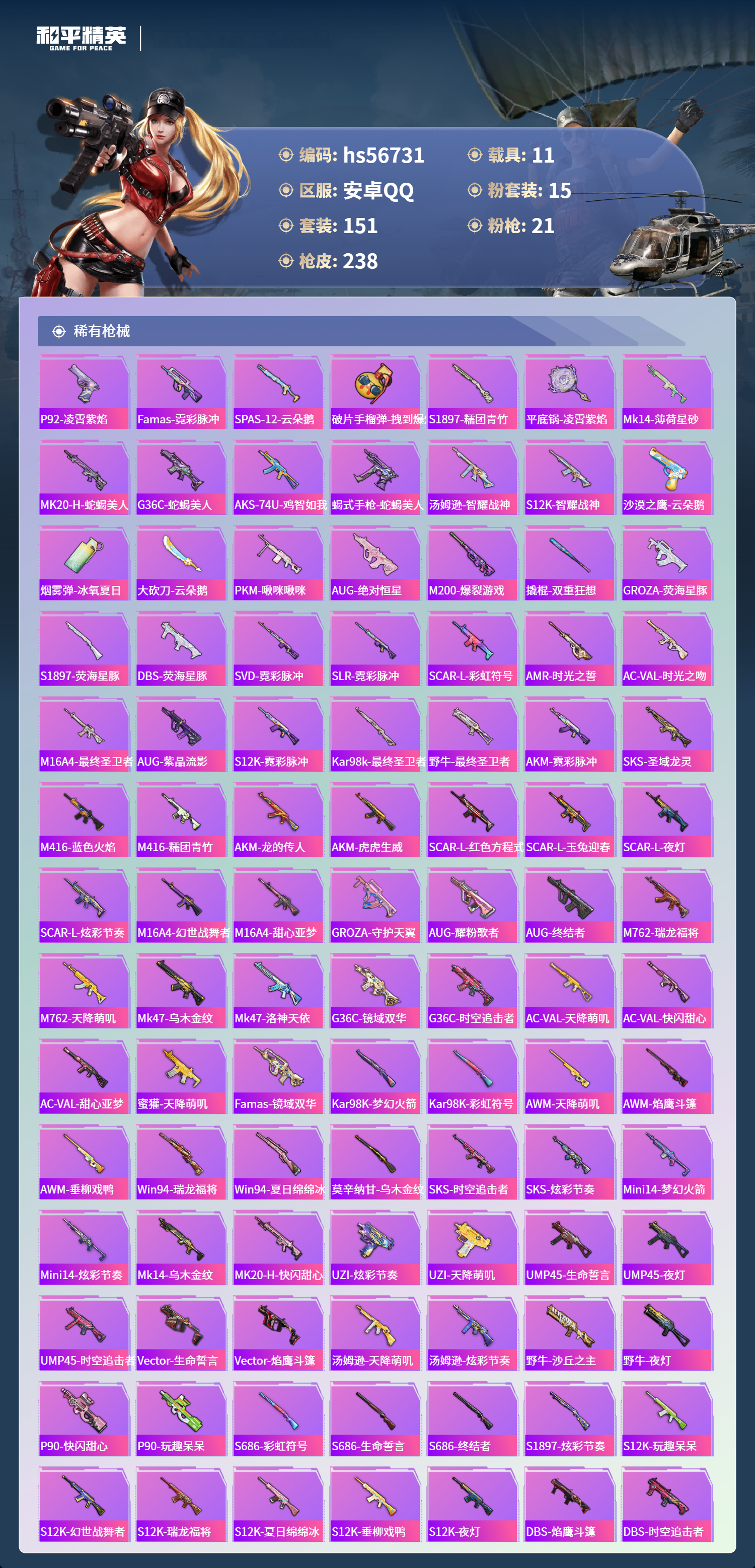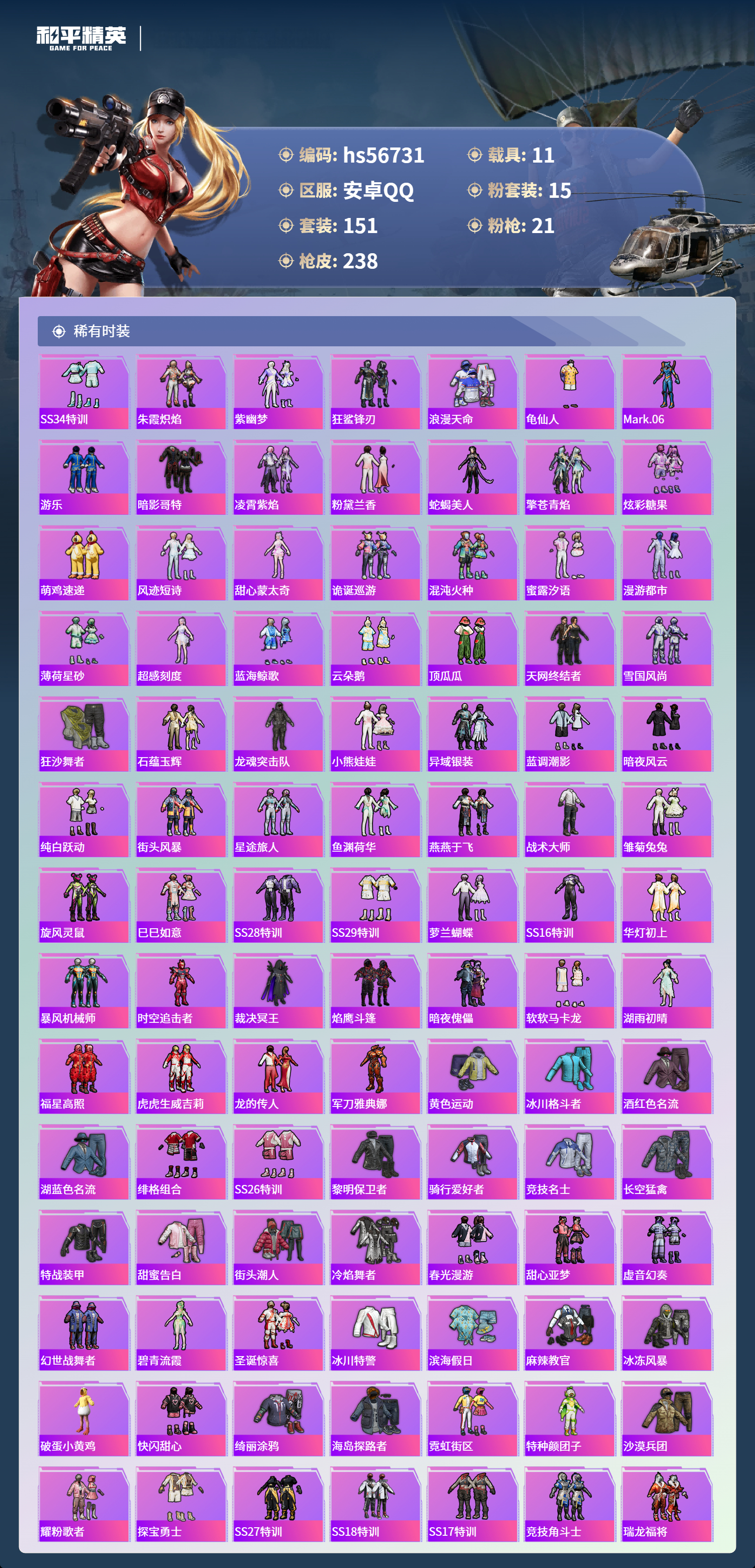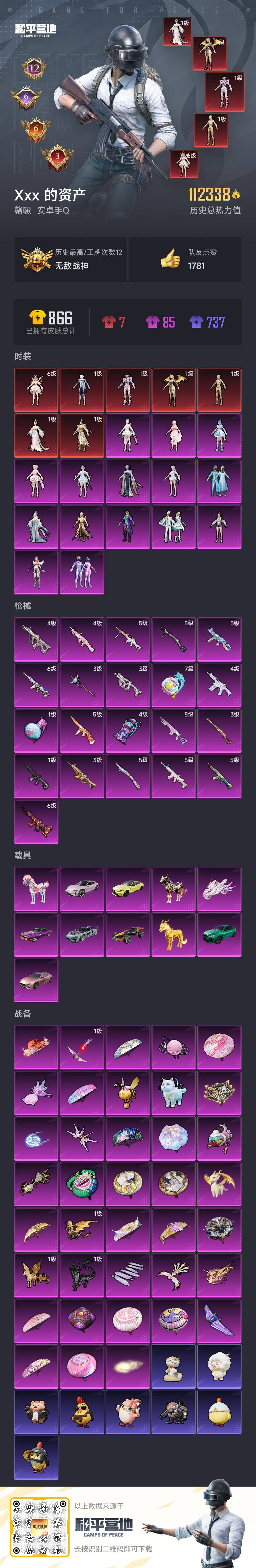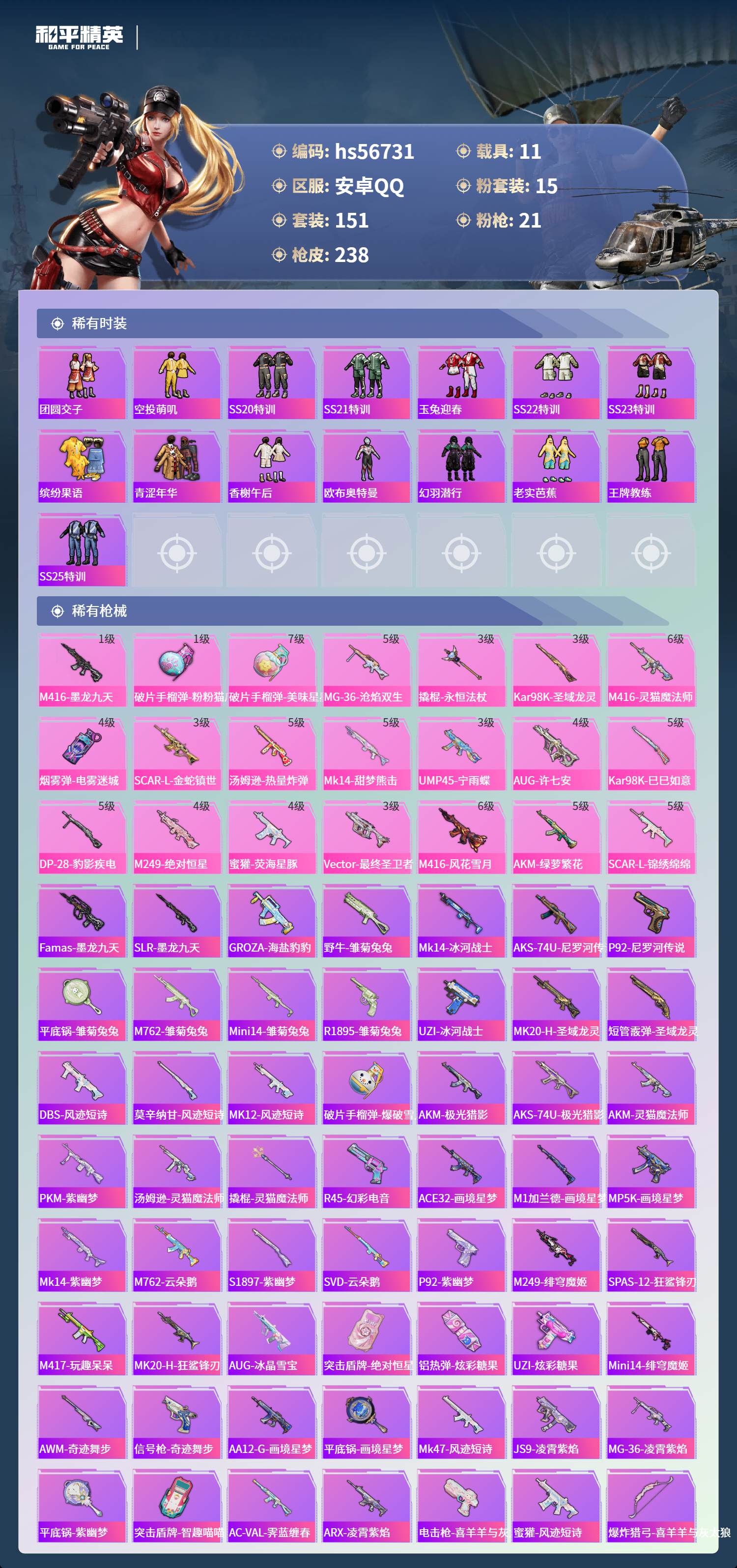hs56731 安卓手q-12王牌印记-有战神框-7红装-15粉装-21特效呛-11载具-热力值-151套装-238呛皮-6卓越印记-6传奇印记【7红装】暮色玫影-艾丽娅/6级最终圣卫者-帕修斯/1级沙丘之主-图卡盟/1级金蛇镇世-烛九/1级圣域龙灵-瑞拉/1级灵猫魔法师-塞维尔/1级盛世惊鸿-云鸾/1级【15粉装】角色-罗征套装-梦幻火箭角色-狂魇小丑角色-荧海