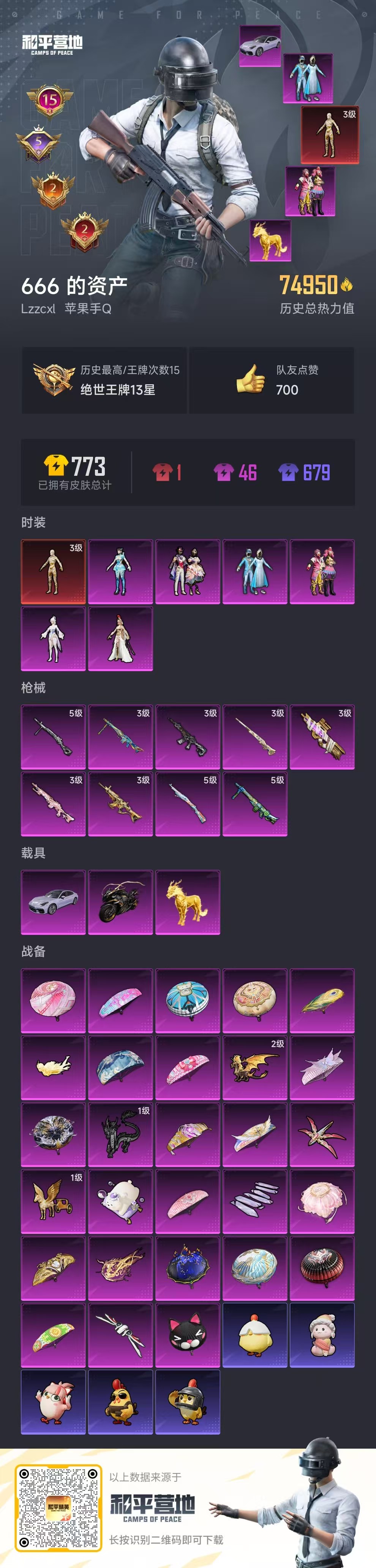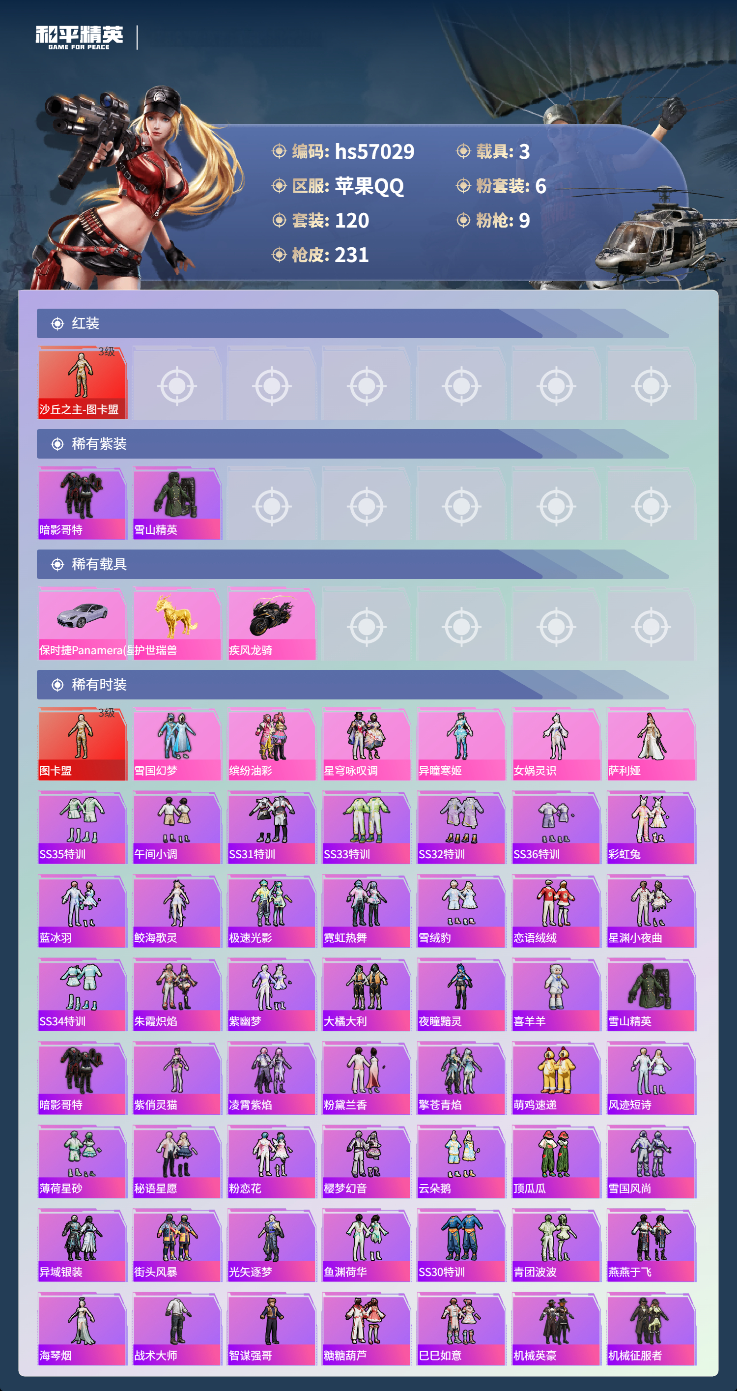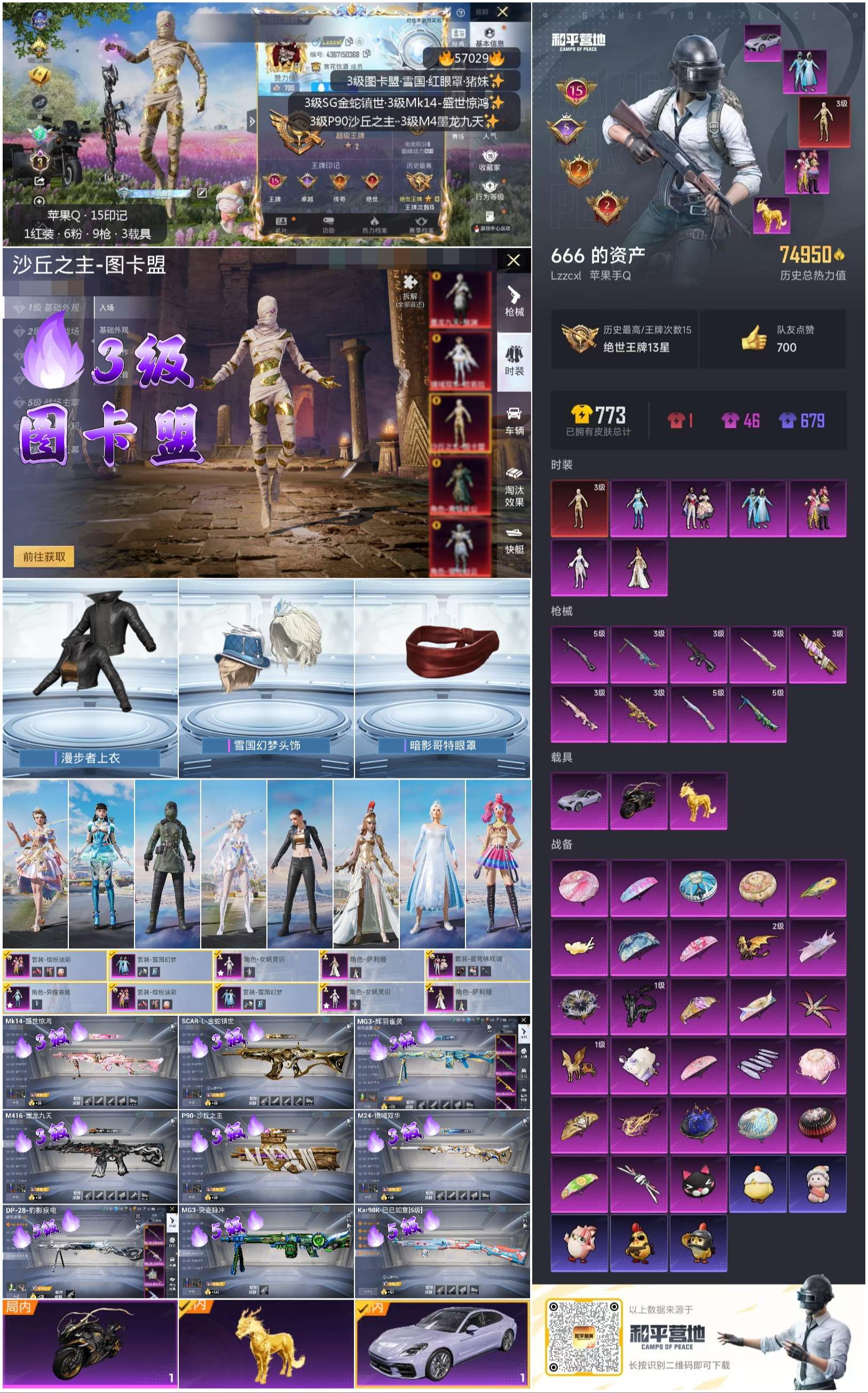hs57029 苹果手q-15王牌印记-1红装-6粉装-9特效呛-3载具-74950热力值-120套装-231呛皮-5卓越印记-2传奇印记【1红装】沙丘之主-图卡盟/3级【6粉装】套装-缤纷油彩角色-异瞳寒姬角色-女娲灵识套装-星穹咏叹调角色-萨利娅套装-雪国幻梦【9特效呛】dp-28-豹影疾电/5级mk14-盛世惊鸿/3级m24-镜域双华/3级mg3-辉羽雀灵/3级kar