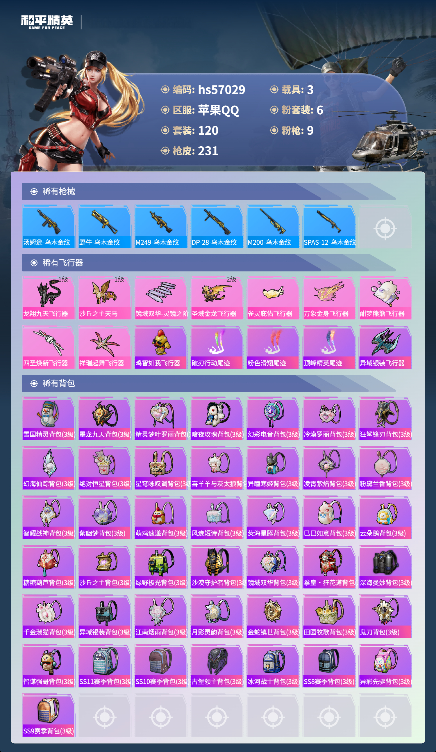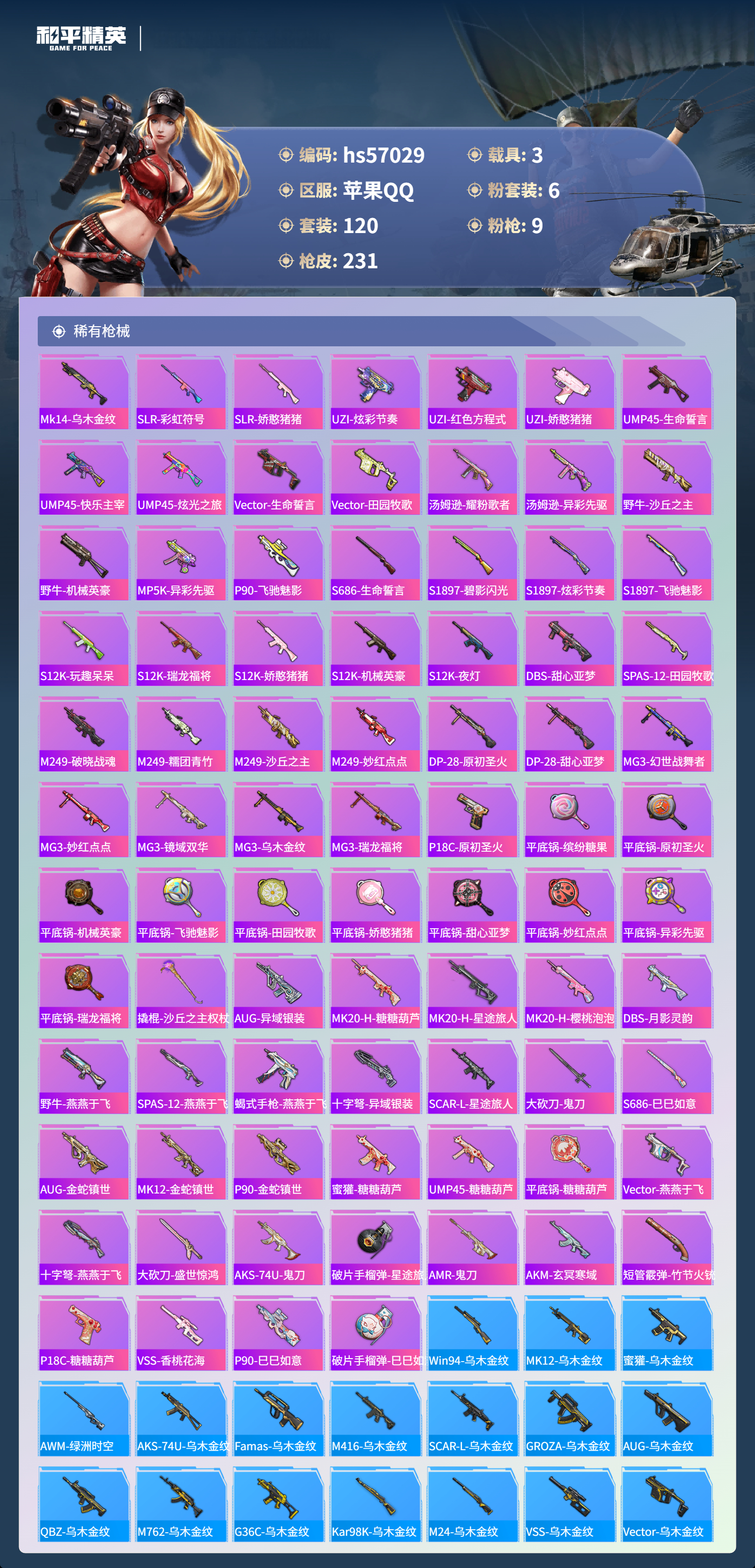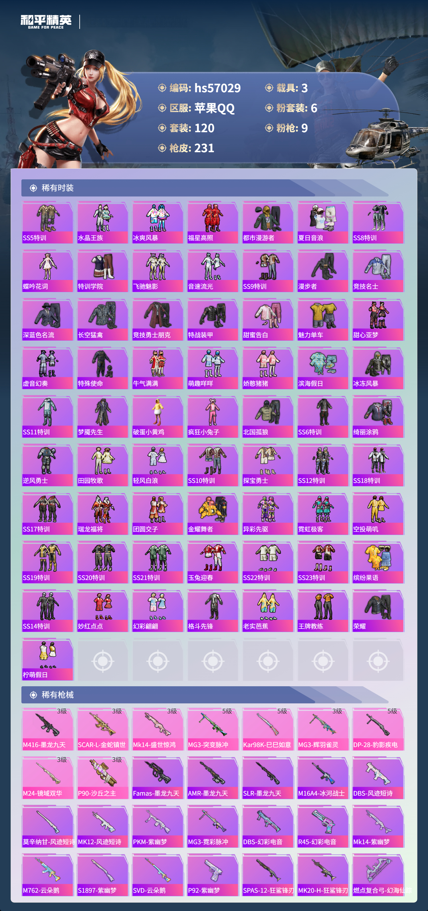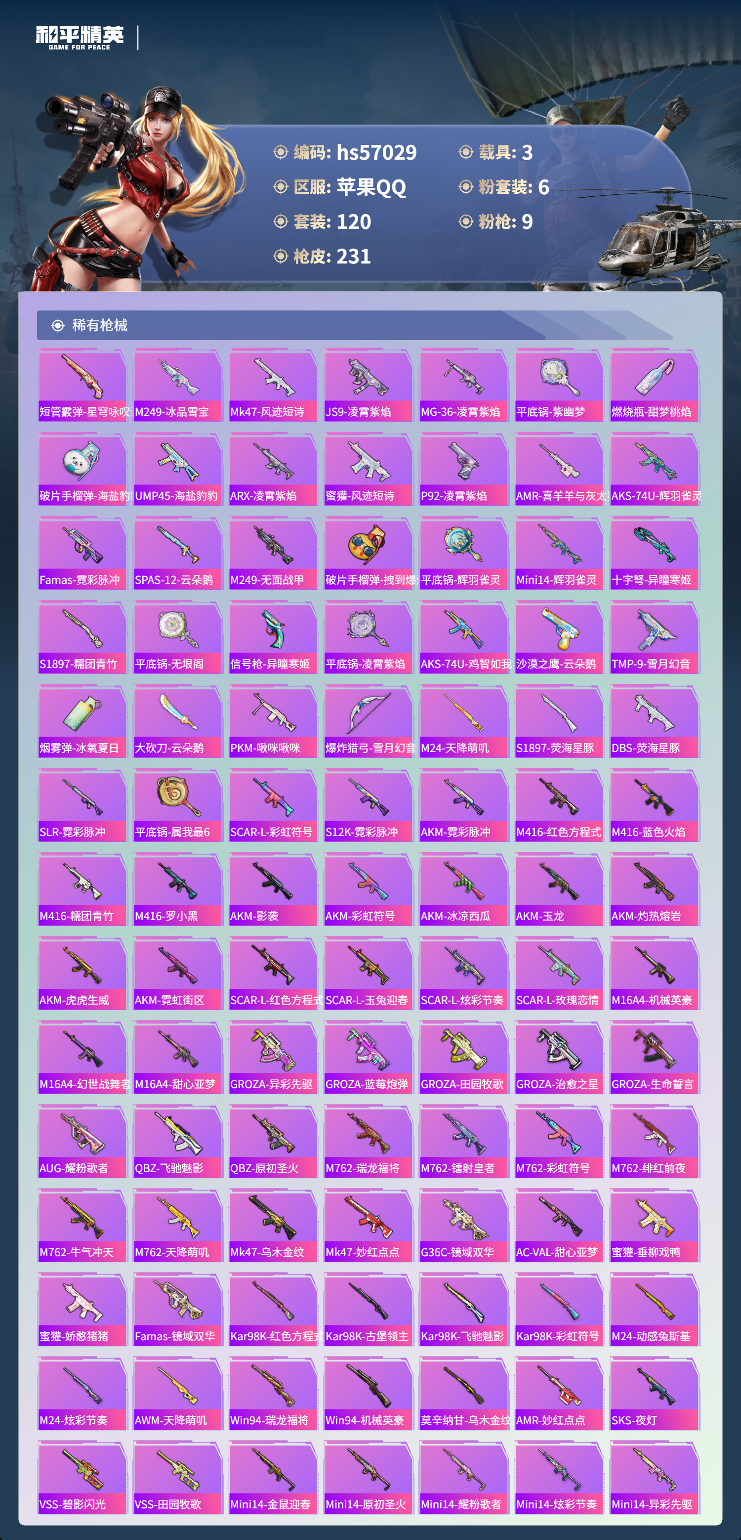hs57029 苹果手q-15王牌印记-1红装-6粉装-9特效呛-3载具-74950热力值-120套装-231呛皮-5卓越印记-2传奇印记【1红装】沙丘之主-图卡盟/3级【6粉装】套装-缤纷油彩角色-异瞳寒姬角色-女娲灵识套装-星穹咏叹调角色-萨利娅套装-雪国幻梦【9特效呛】dp-28-豹影疾电/5级mk14-盛世惊鸿/3级m24-镜域双华/3级mg3-辉羽雀灵/3级kar