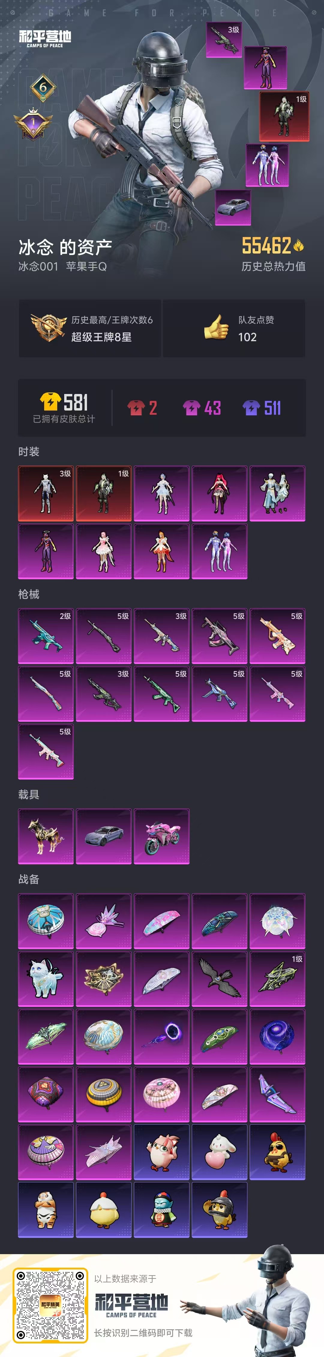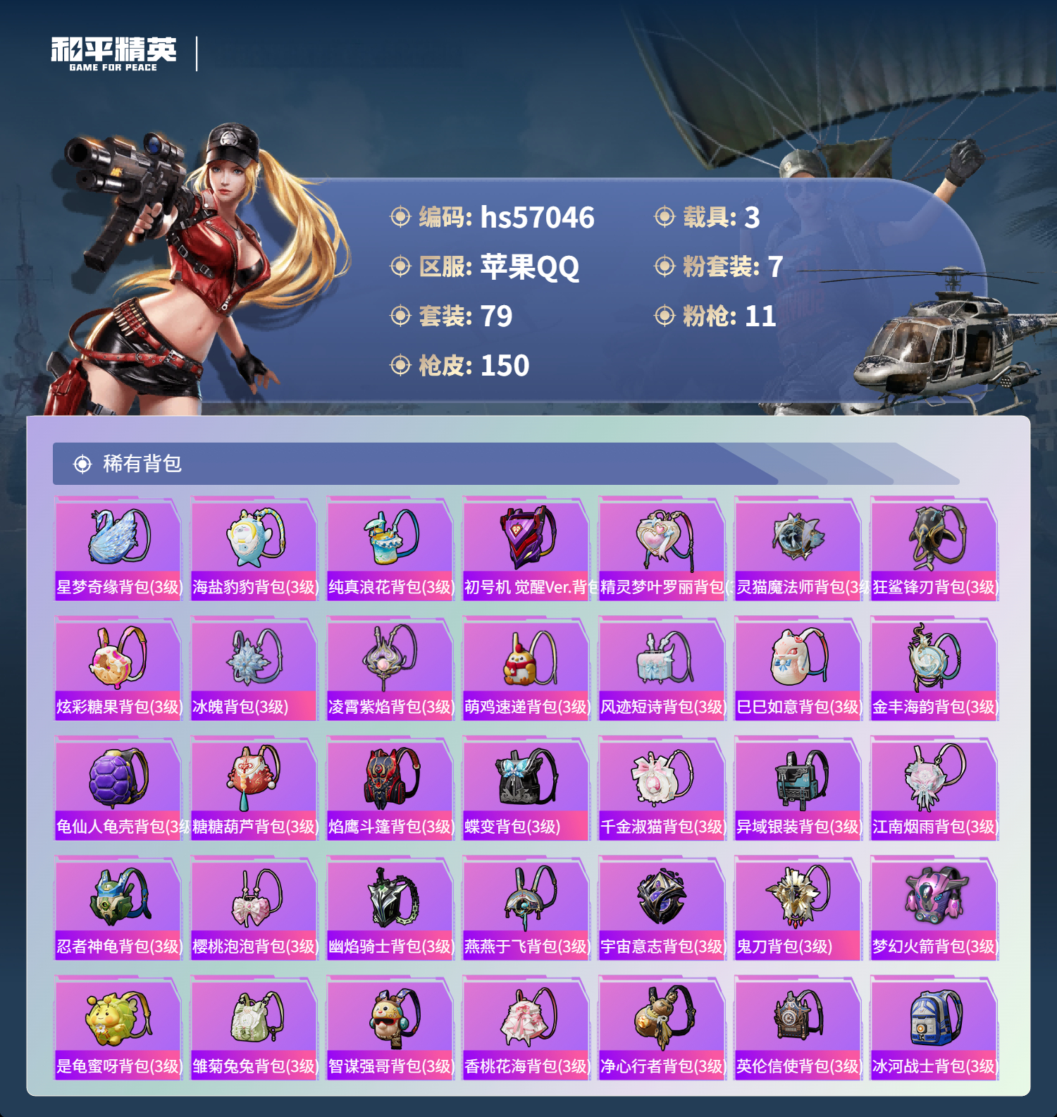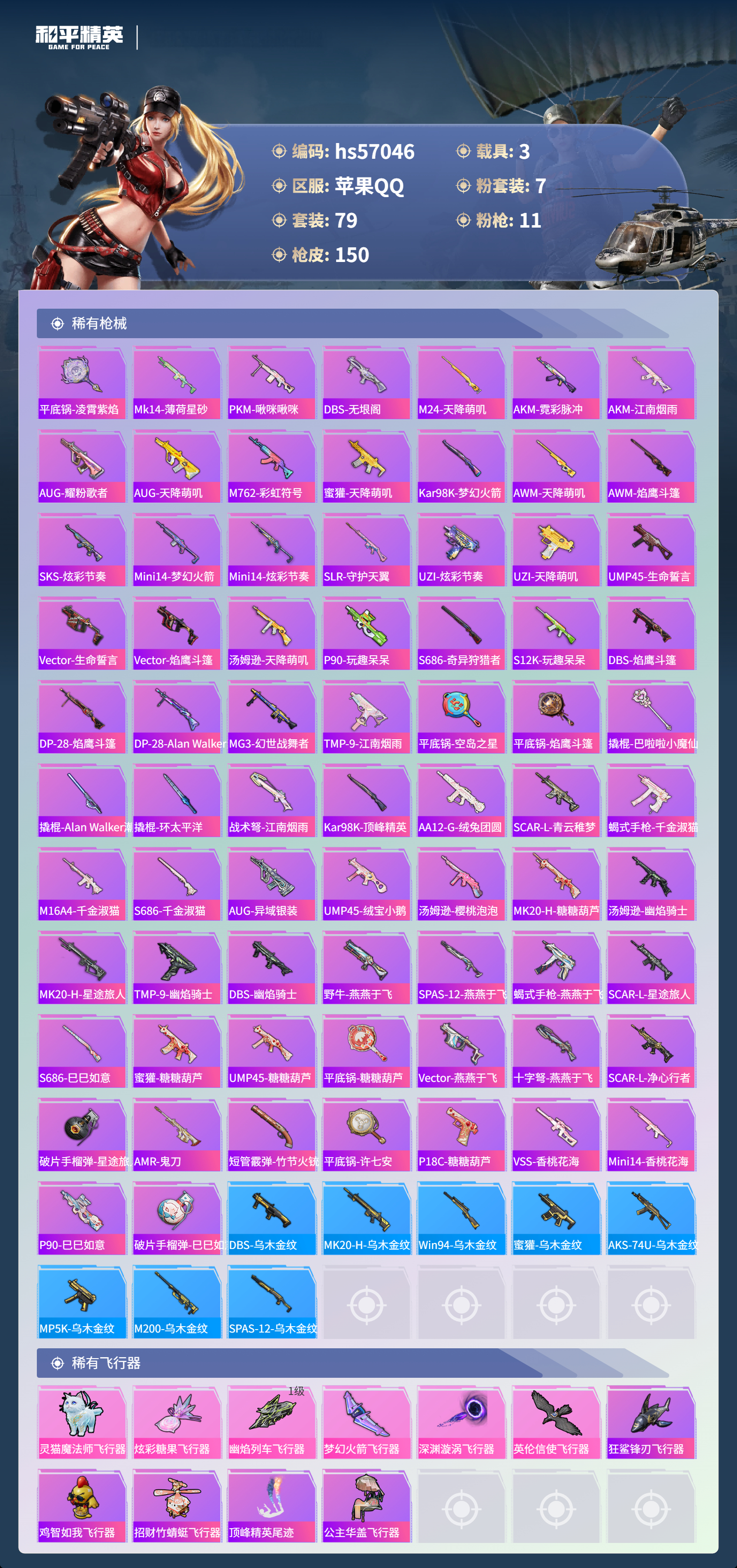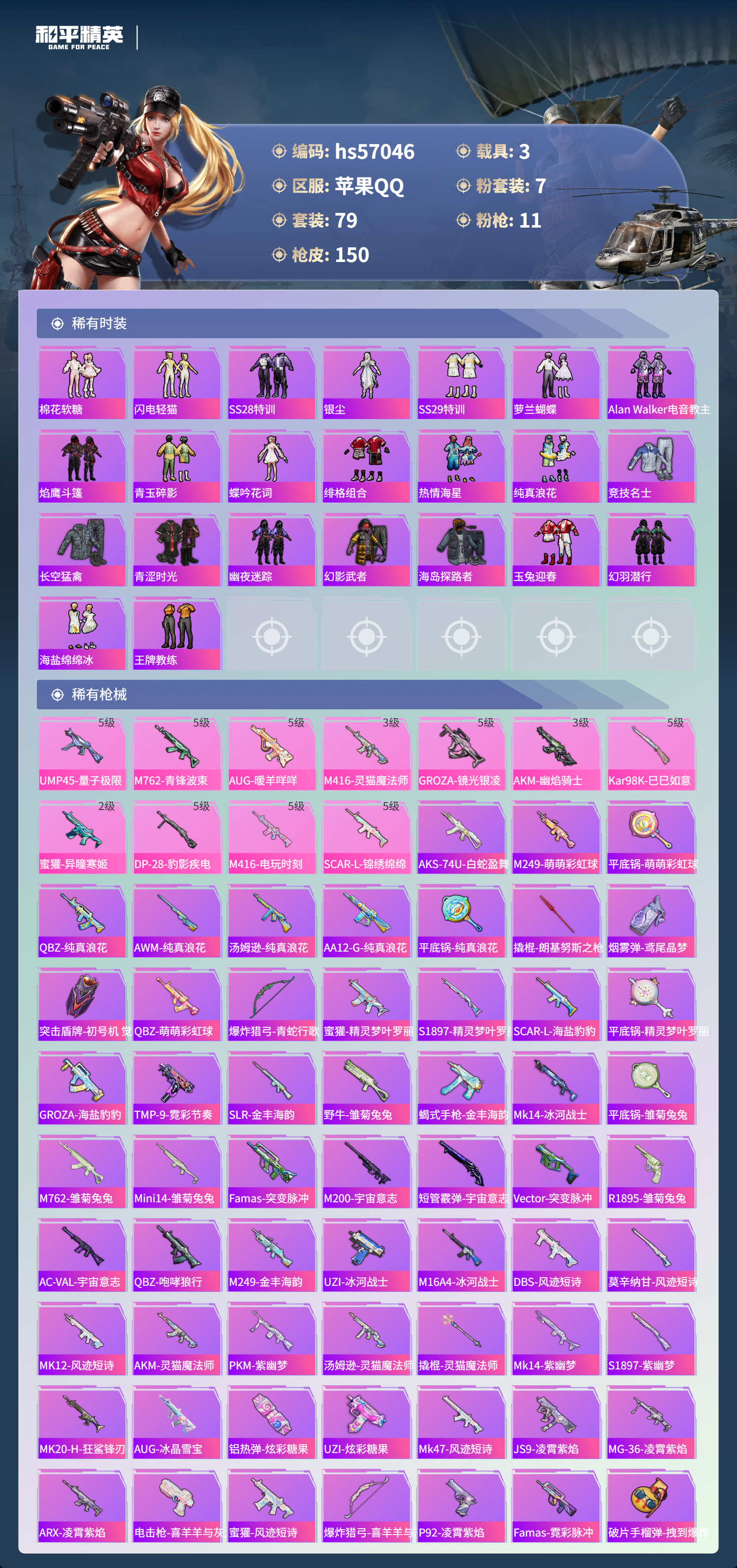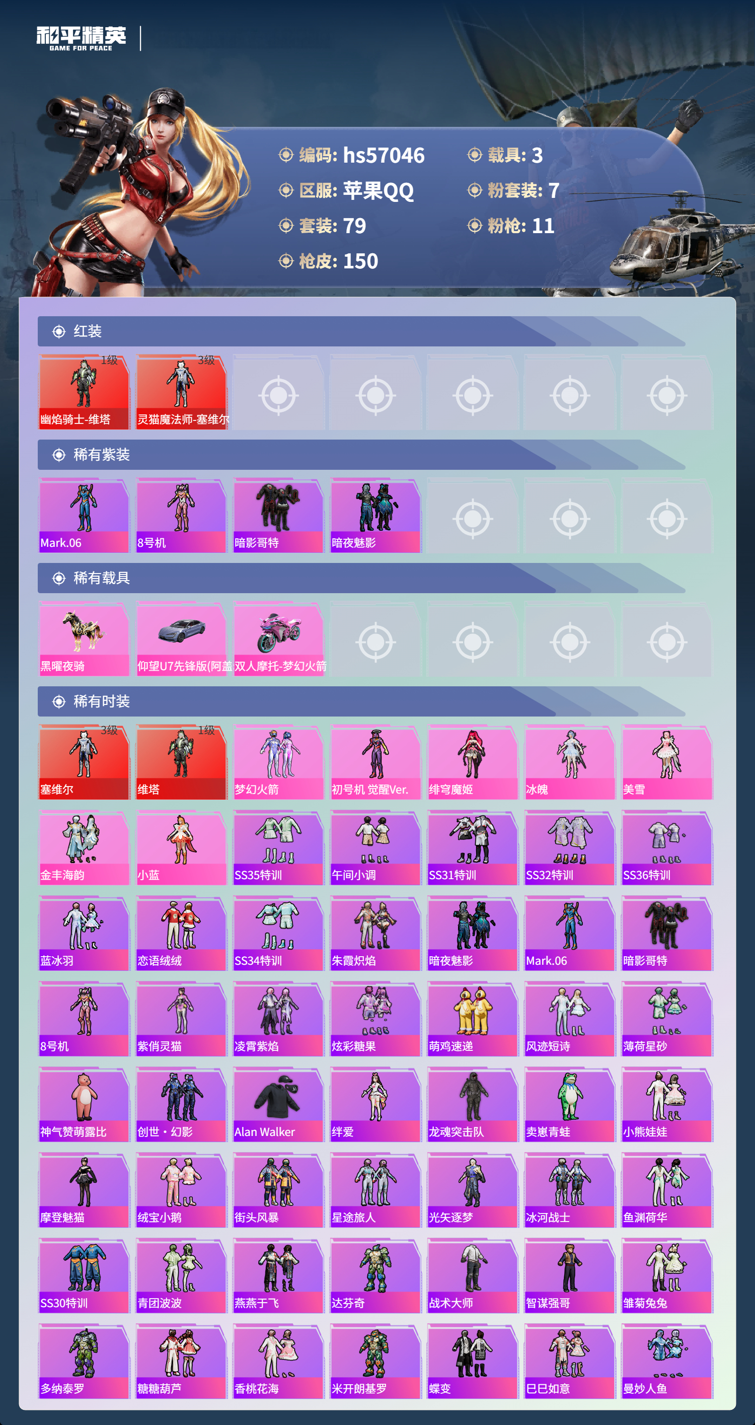 3载具-79套装-150呛皮-hs57046 苹果手q-6王牌印记-2红装-7粉装-11特效呛-3载具-55462热力值-79套装-150呛皮-1卓越印记【2红装】幽焰骑士-维塔/1级灵猫魔法师-塞维尔/3级【7粉装】角色-美雪角色-绯穹魔姬角色-初号机 觉醒ver.角色-冰魄套装-梦幻火箭角色-小蓝套装-金丰海韵【11特效呛】akm-幽焰骑士/3级groza-镜光银凌/5级m416-灵猫魔法师/3级