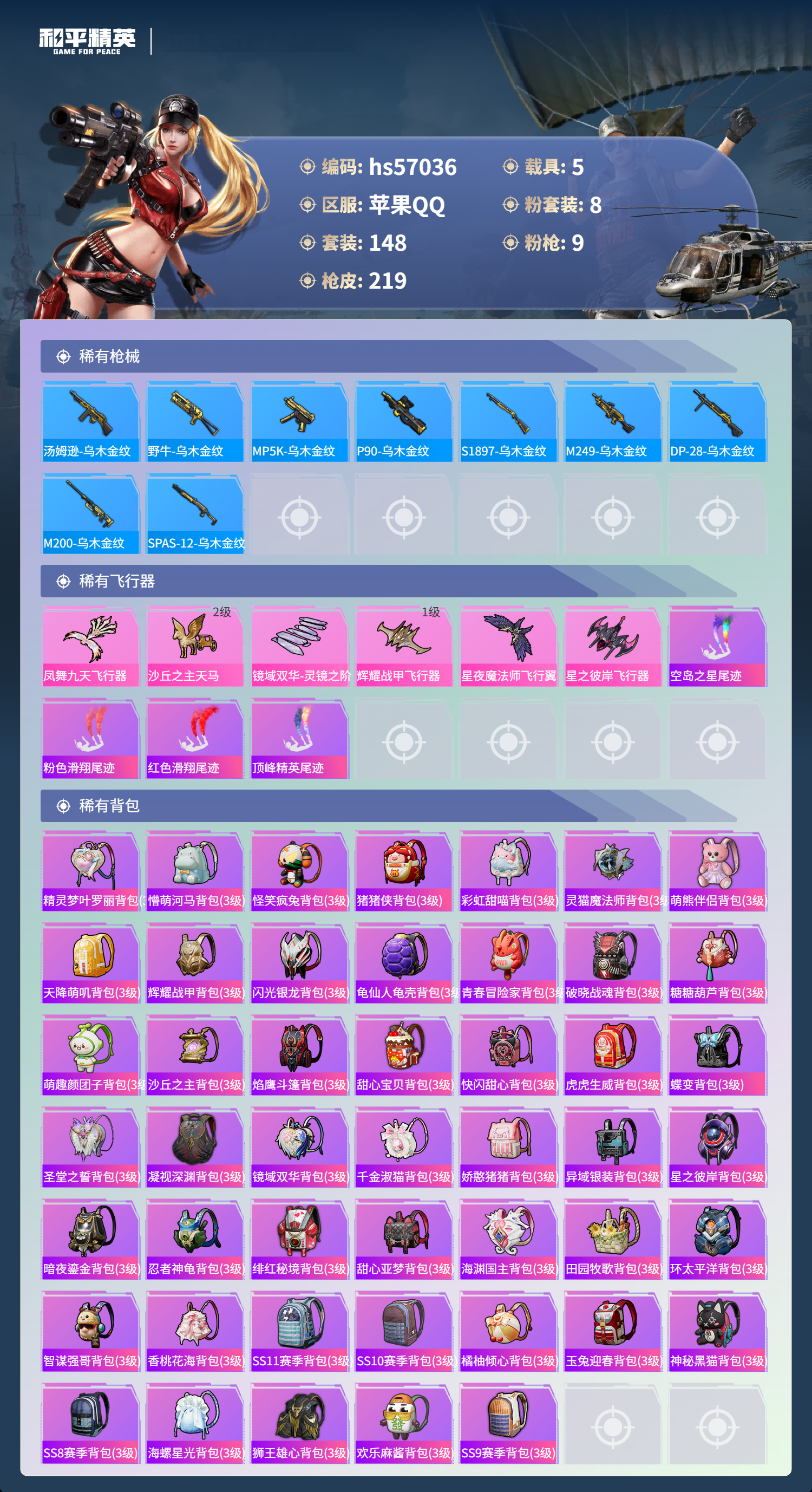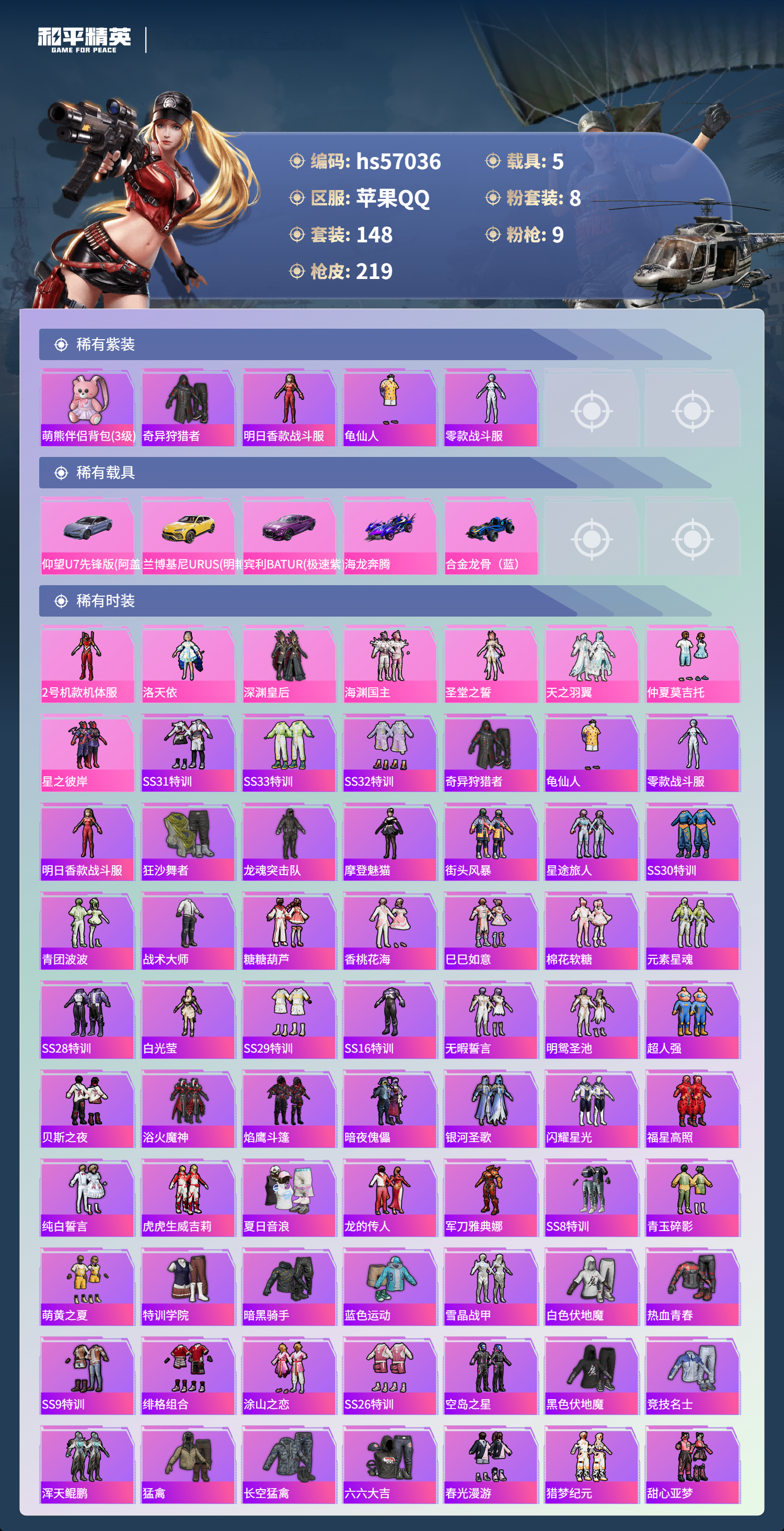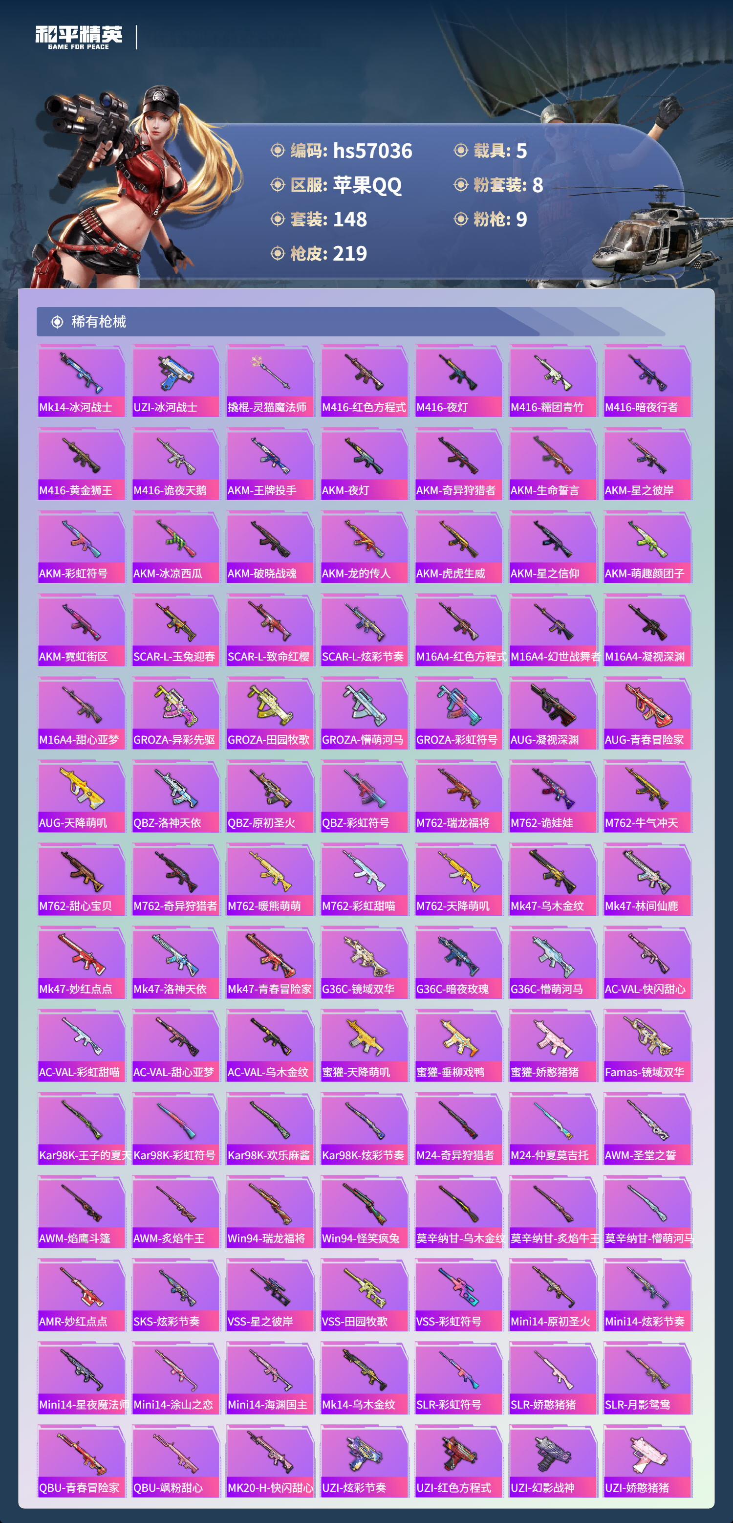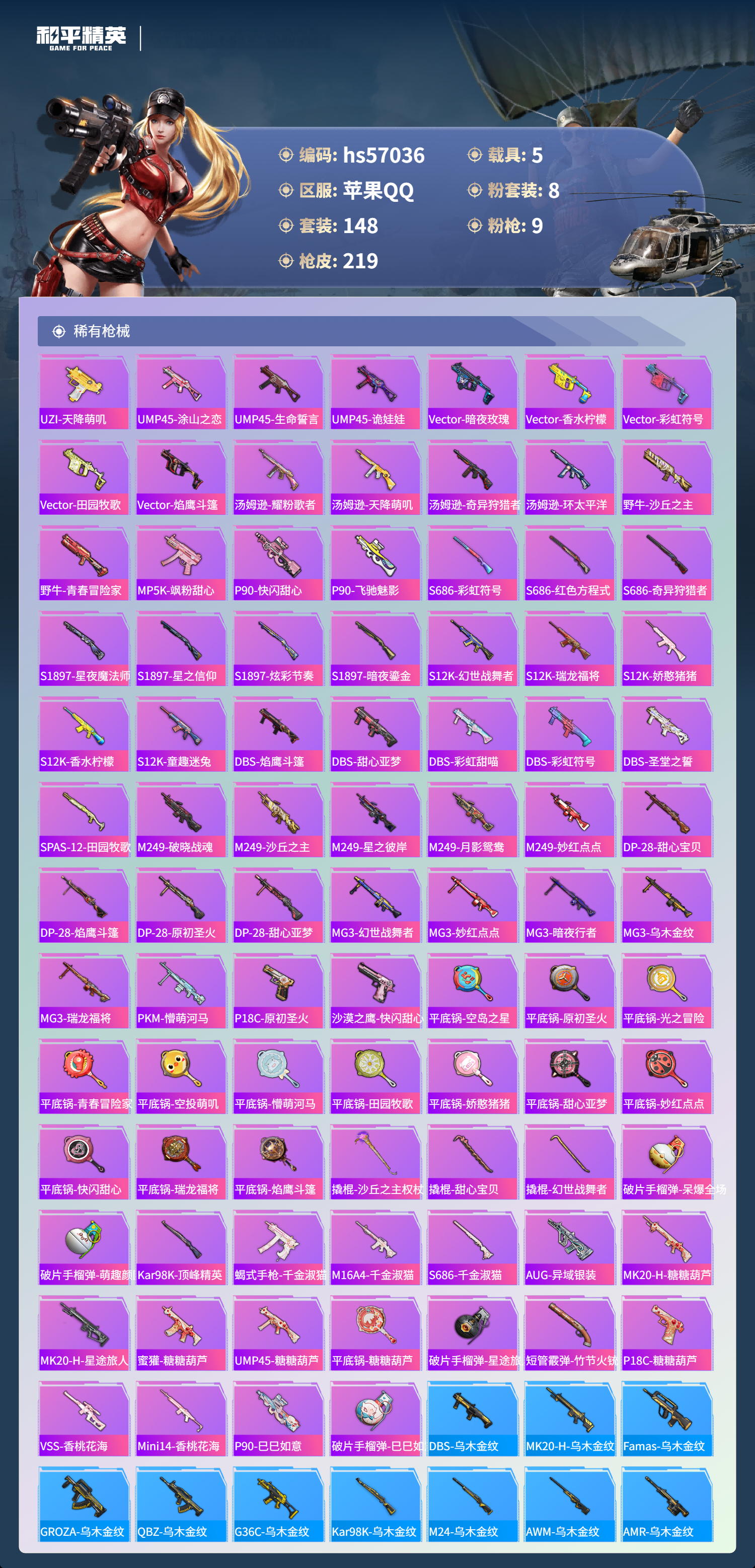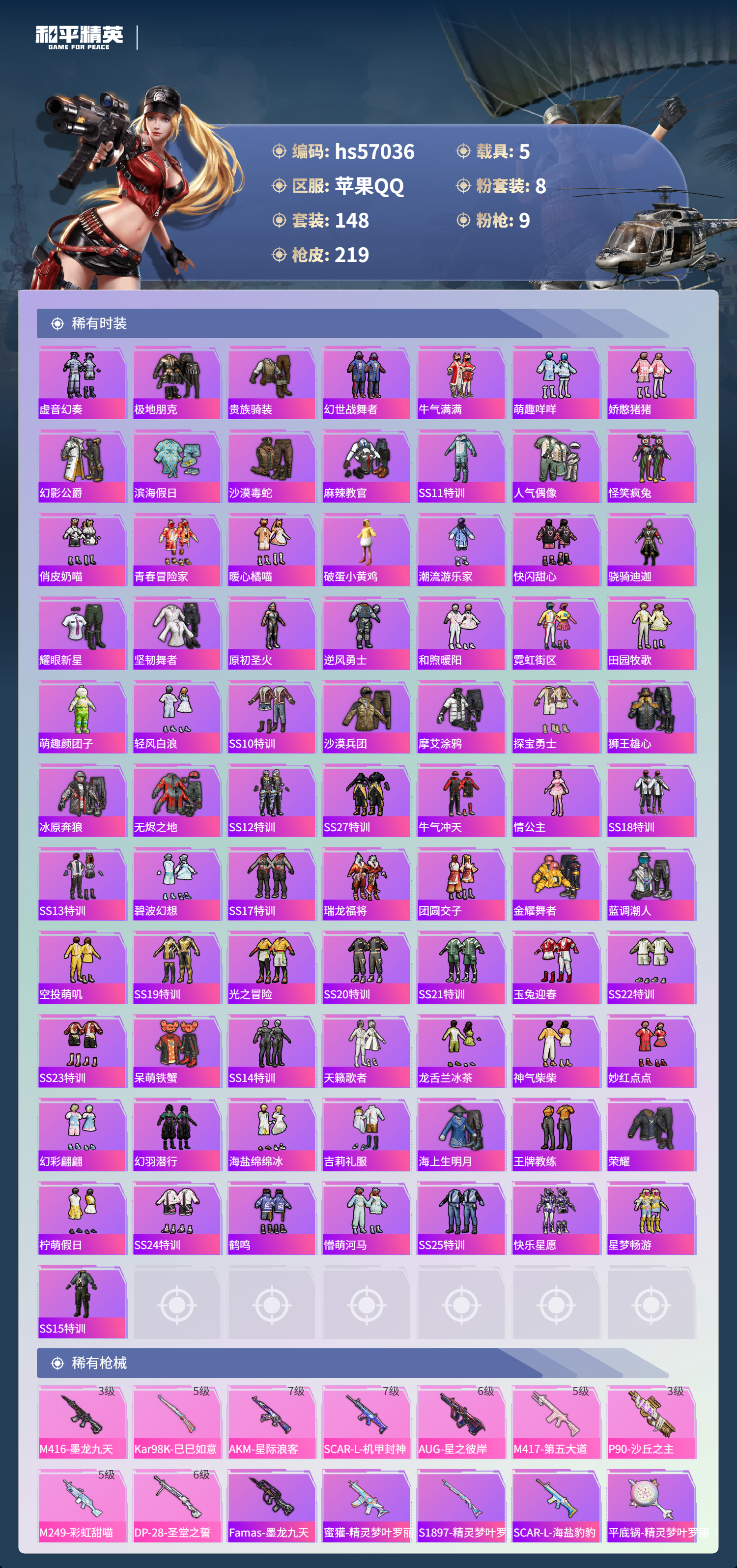 hs57036 苹果手q-15王牌印记-8粉装-9特效呛-5载具-80303热力值-148套装-219呛皮-1卓越印记【8粉装】套装-天之羽翼角色-洛天依套装-海渊国主角色-2号机款机体服套装-深渊皇后角色-圣堂之誓套装-仲夏莫吉托套装-星之彼岸【9特效呛】m416-墨龙九天/3级m417-第五大道/5级m249-彩虹甜喵/5级scar-l-机甲封神/7级aug-星之彼岸