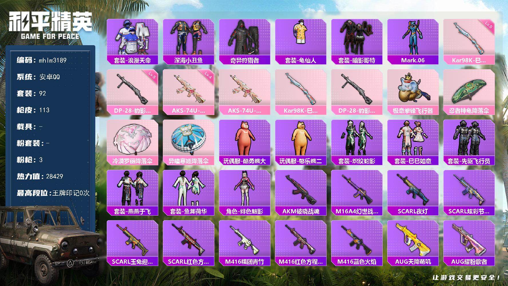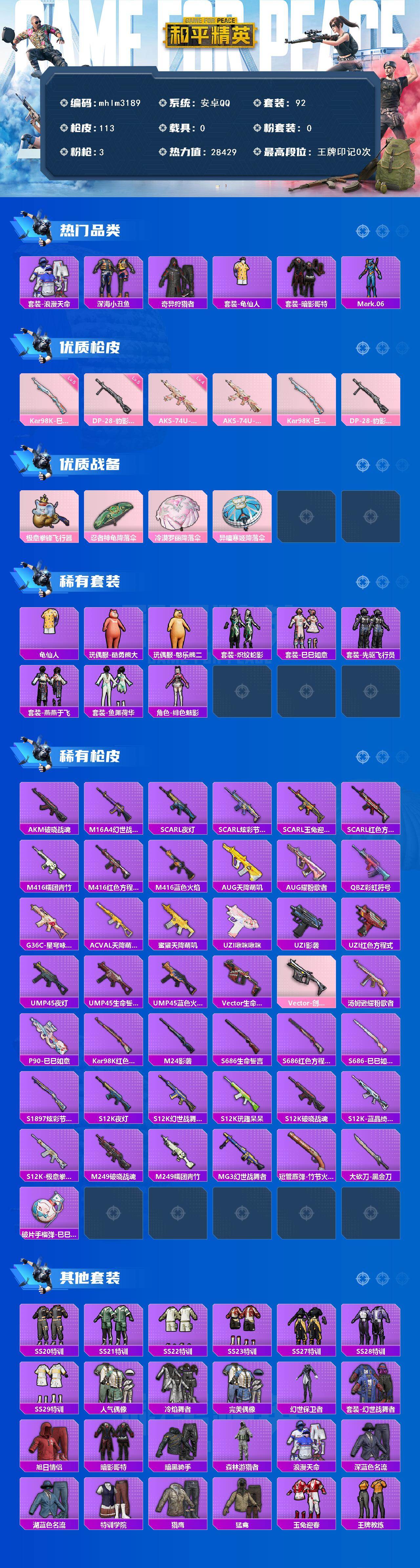 [15514077]【mhlm3189】安卓 手q-0粉装-3特效呛-0载具-2粉色飞行器-28429热力值-2王牌印记-92套装-113呛皮 【热门品类】:套装-浪漫天命,套装-深海小丑鱼,套装-奇异狩猎者,套装-龟仙人,套装-暗影哥特,角色-mark.06 【粉色呛皮等级】:aks-74u-星穹咏叹调四级,kar98k-巳巳如意五级,dp-28-豹影疾电五级 【粉色呛皮】:aks-74u-星穹咏叹调,kar98k-巳巳如意,dp-28-豹影疾电 【粉色飞行器】:极意拳锋飞行器 【粉色降落伞】:忍者神龟降落伞,冷漠罗丽降落伞,异瞳寒姬降落伞,炫彩糖果降落伞 【稀有套装】:套装-龟仙人,玩偶服-酷勇熊大,玩偶服-憨乐熊二,套装-炽纹蛇影,套装-巳巳如意,套装-雪国风尚,套装-先驱飞行员,套装-燕燕于飞,套装-鱼渊荷华,角色-绯色魅影,套装-炫彩糖果 【稀有呛皮】:aug-冰晶雪宝,akm-破晓战魂,m16a4-幻世战舞者,scar-l-夜灯,scar-l-炫彩节奏,scar-l-玉兔迎春,scar-l-红色方程式,m416-糯团青竹,m416-红色方程式,m416-蓝色火焰,aug-天降萌叽,aug-耀粉歌者,q-彩虹符号,g36c-星穹咏叹调,ac-val-天降萌叽,蜜獾-天降萌叽,uzi-啾咪啾咪,uzi-影袭,uzi-红色方程式,ump45-夜灯,ump45-生命誓言,ump45-蓝色火焰,vect-生命誓言,vect-创世·救赎,汤姆逊-耀粉歌者,p90-巳巳如意,kar98k-红色方程式,m24-影袭,s686-生命誓言,s686-红色方程式,s686-巳巳如意,s1897-炫彩节奏,s12k-玩趣呆呆,s12k-破晓战魂,s12k-夜灯,s12k-幻世战舞者,s12k-蓝晶绮麟,s12k-极意拳锋,m249-破晓战魂,m249-糯团青竹,mg3-幻世战舞者,短管霰弹-竹节火铳,大砍刀-黑金刀,破片手留单-巳巳如意 【其他套装】:套装-ss20特训,套装-ss21特训,套装-ss22特训,套装-ss23特训,套装-ss27特训,套装-ss28特训,套装-ss29特训,套装-人气偶像,套装-冷焰舞者,套装-完美偶像,套装-幻世保卫者,套装-幻世战舞者,套装-旭日情侣,套装-暗影哥特,套装-暗黑骑手,套装-森林游猎者,套装-浪漫天命,套装-深蓝色名流,套