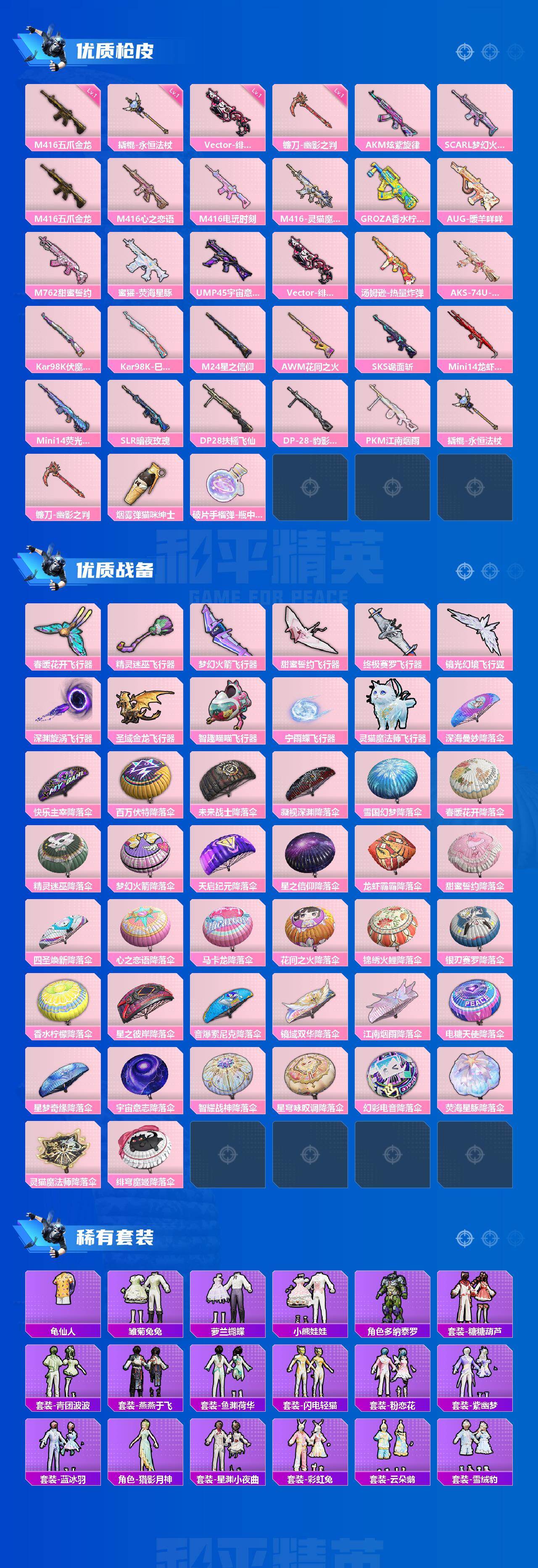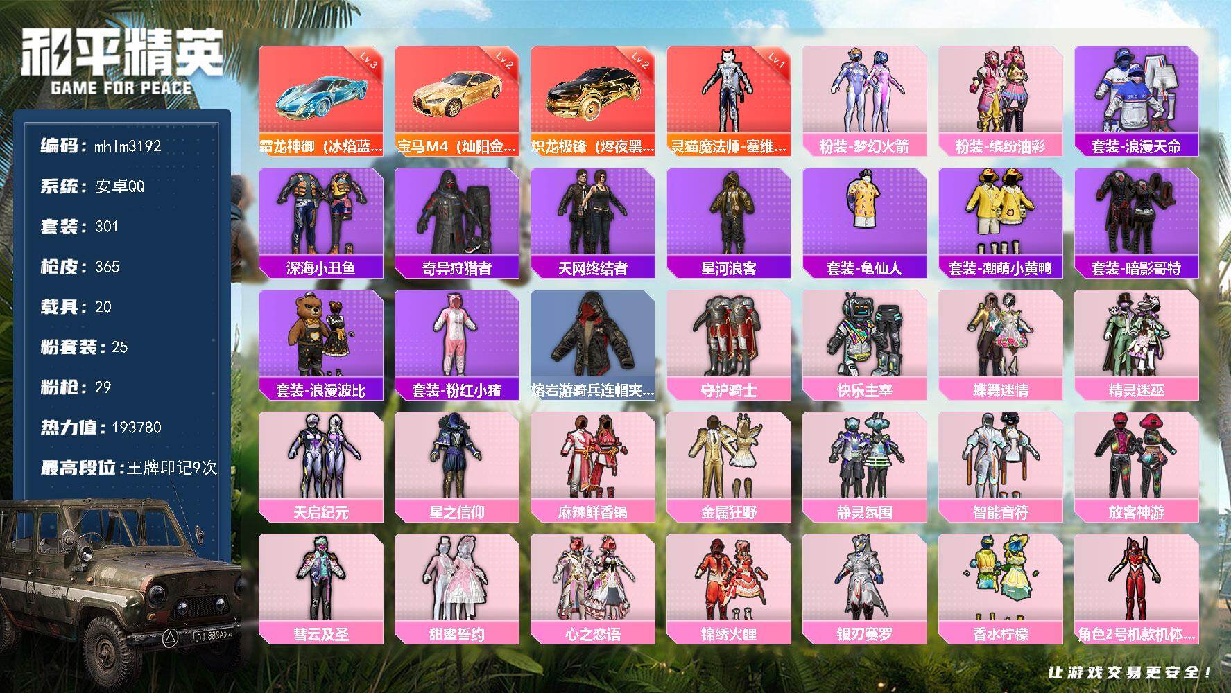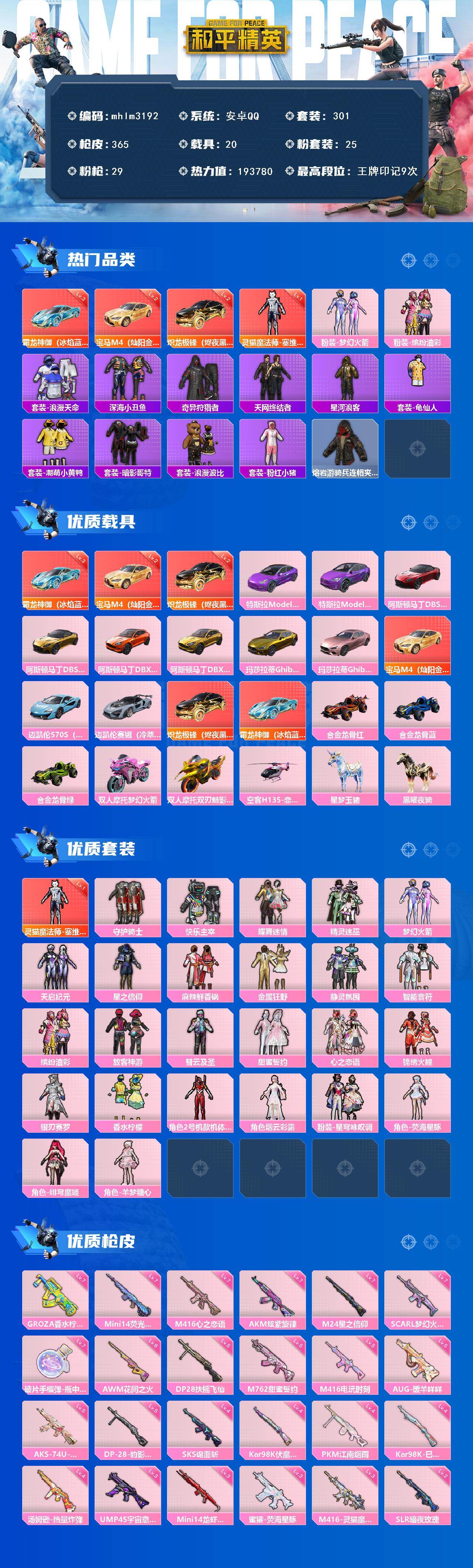 [15514632]【mhlm3192】安卓 手q-1神装-25粉装-29特效呛-20载具-12粉色飞行器-193780热力值-9王牌印记-301套装-365呛皮 【红色载具】:宝马m4(灿阳金)二级,炽龙极锋(烬夜黑)二级,霜龙神御(冰焰蓝)三级 【红色神装等级】:灵猫魔法师-塞维尔一级 【红色角色神装】:灵猫魔法师-塞维尔 【热门品类】:粉装-梦幻火箭,粉装-缤纷油彩,套装-浪漫天命,套装-深海小丑鱼,套装-奇异狩猎者,套装-天网终结者,套装-星河浪客,套装-龟仙人,套装-潮萌小黄鸭,套装-暗影哥特,套装-浪漫波比,套装-粉红小猪,熔岩游骑兵连帽夹克 【粉色套装】:粉装-守护骑士,粉装-快乐主宰,粉装-蝶舞迷情,粉装-精灵迷巫,粉装-梦幻火箭,粉装-天启纪元,粉装-星之信仰,粉装-麻辣鲜香锅,粉装-金属狂野,粉装-静灵氛围,粉装-智能音符,粉装-缤纷油彩,粉装-放客神游,粉装-彗云及圣,粉装-甜蜜誓约,粉装-心之恋语,粉装-锦绣火鲤,粉装-银刃赛罗,粉装-香水柠檬,角色-2号机款机体服,角色-烟云彩露,粉装-星穹咏叹调,角色-荧海星豚,角色-绯穹魔姬,角色-羊梦糖心 【粉色呛皮等级】:akm-炫紫旋律七级,scar-l-梦幻火箭七级,m416-五爪金龙一级,m416-心之恋语七级,m416-电玩时刻五级,m416-灵猫魔法师三级,groza-香水柠檬七级,aug-暖羊咩咩五级,m762-甜蜜誓约五级,蜜獾-荧海星豚三级,ump45-宇宙意志三级,vect-绯穹魔姬一级,汤姆逊-热量炸弹四级,aks-74u-星穹咏叹调五级,kar98k-伏魔团四级,kar98k-巳巳如意四级,m24-星之信仰七级,awm-花间之火六级,sks-诡面斩四级,mini14-龙虾霸霸三级,mini14-荧光虫舞七级,slr-暗夜玫瑰二级,dp-28-扶摇飞仙五级,dp-28-豹影疾电五级,pkm-江南烟雨四级,撬棍-永恒法杖一级,镰刀-幽影之判一级,破片手留单-瓶中星球七级 【粉色载具】:特斯拉model 3(奇幻紫),特斯拉model x(奇幻紫),阿斯顿马丁dbs(红),阿斯顿马丁dbs(金),阿斯顿马丁dbx(橙),阿斯顿马丁dbx(金),玛莎拉蒂ghibli(金),