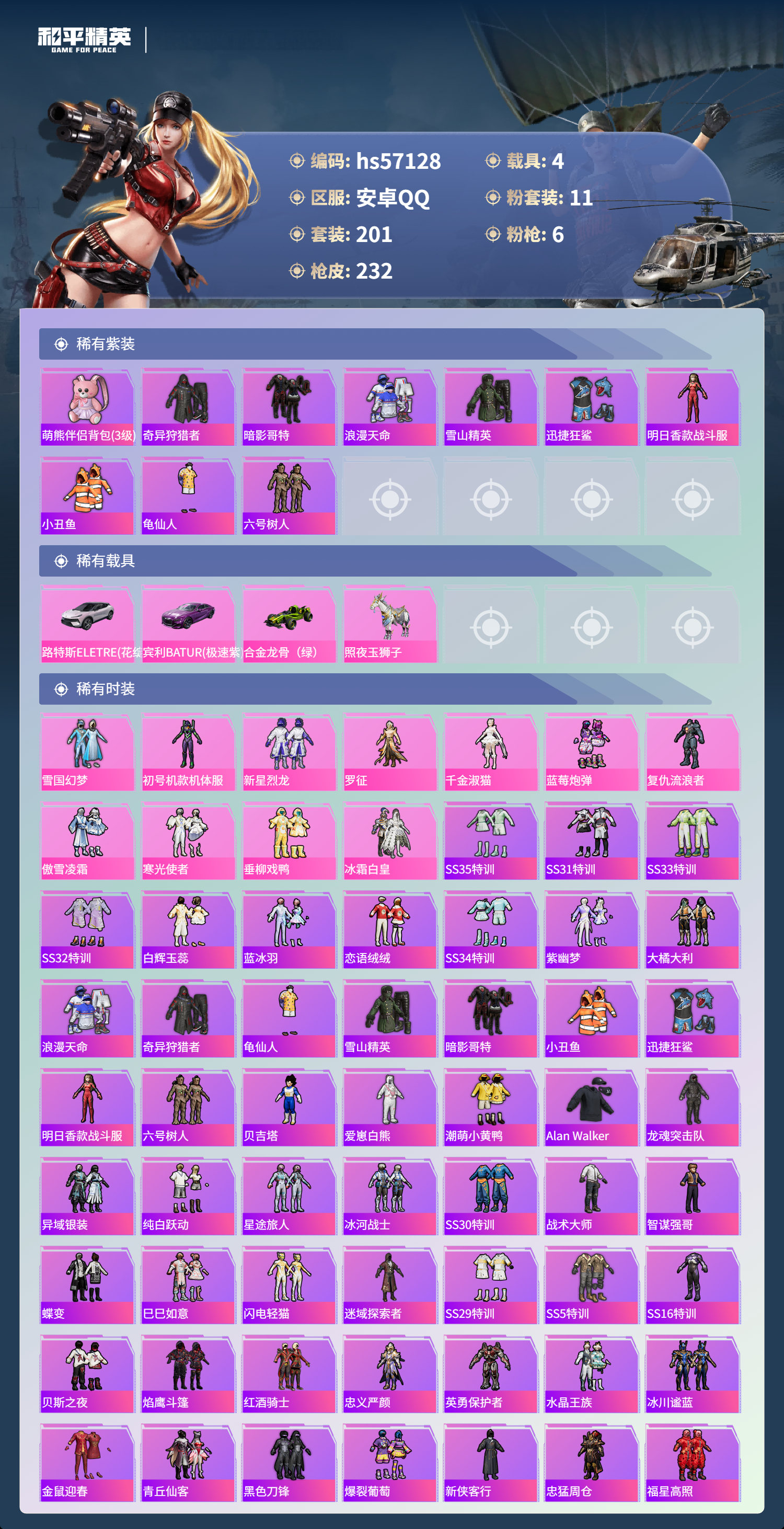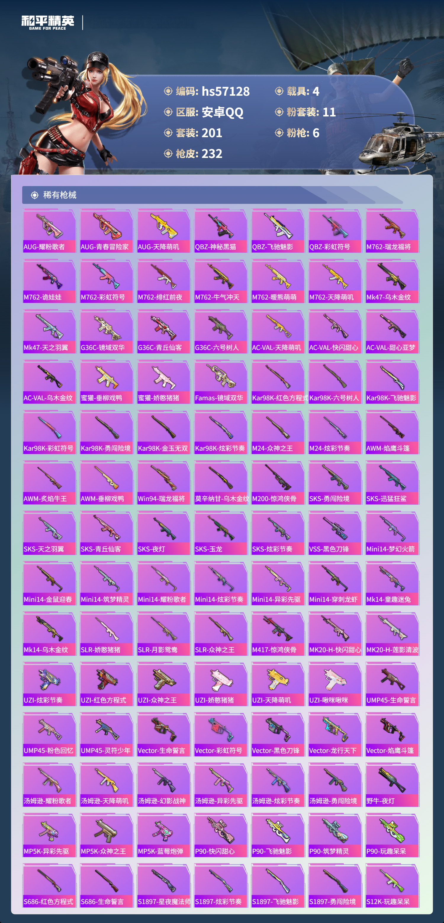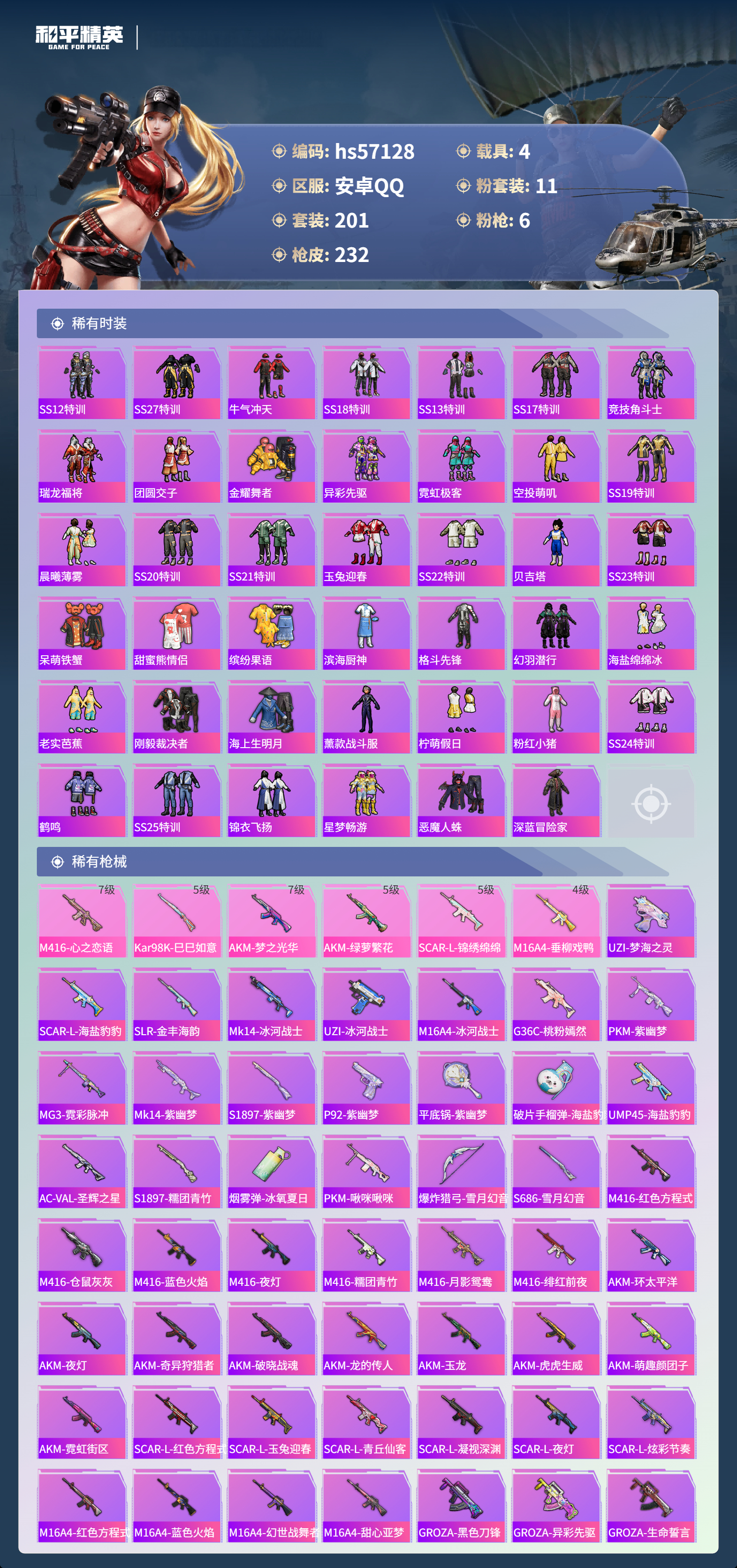 2384749安卓手q-11王牌印记-11粉装-6特效呛-4载具-83782热力值-201套装-232呛皮-1卓越印记 【11粉装】套装-新星烈龙套装-垂柳戏鸭套装-傲雪凌霜套装-雪国幻梦角色-千金淑猫角色-复仇流浪者套装-蓝莓炮弹套装-冰霜白皇套装-寒光使者角色-罗征角色-初号机款机体服 【6特效呛】m16a4-垂柳戏鸭/4级scar-l-锦绣绵绵/5级kar9