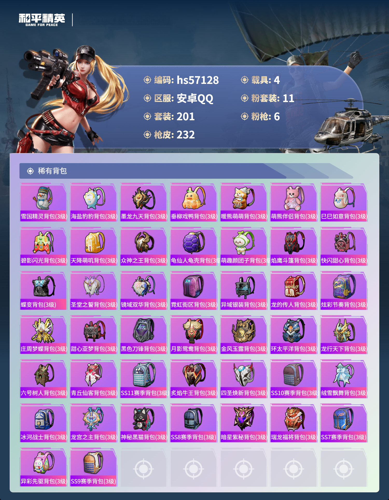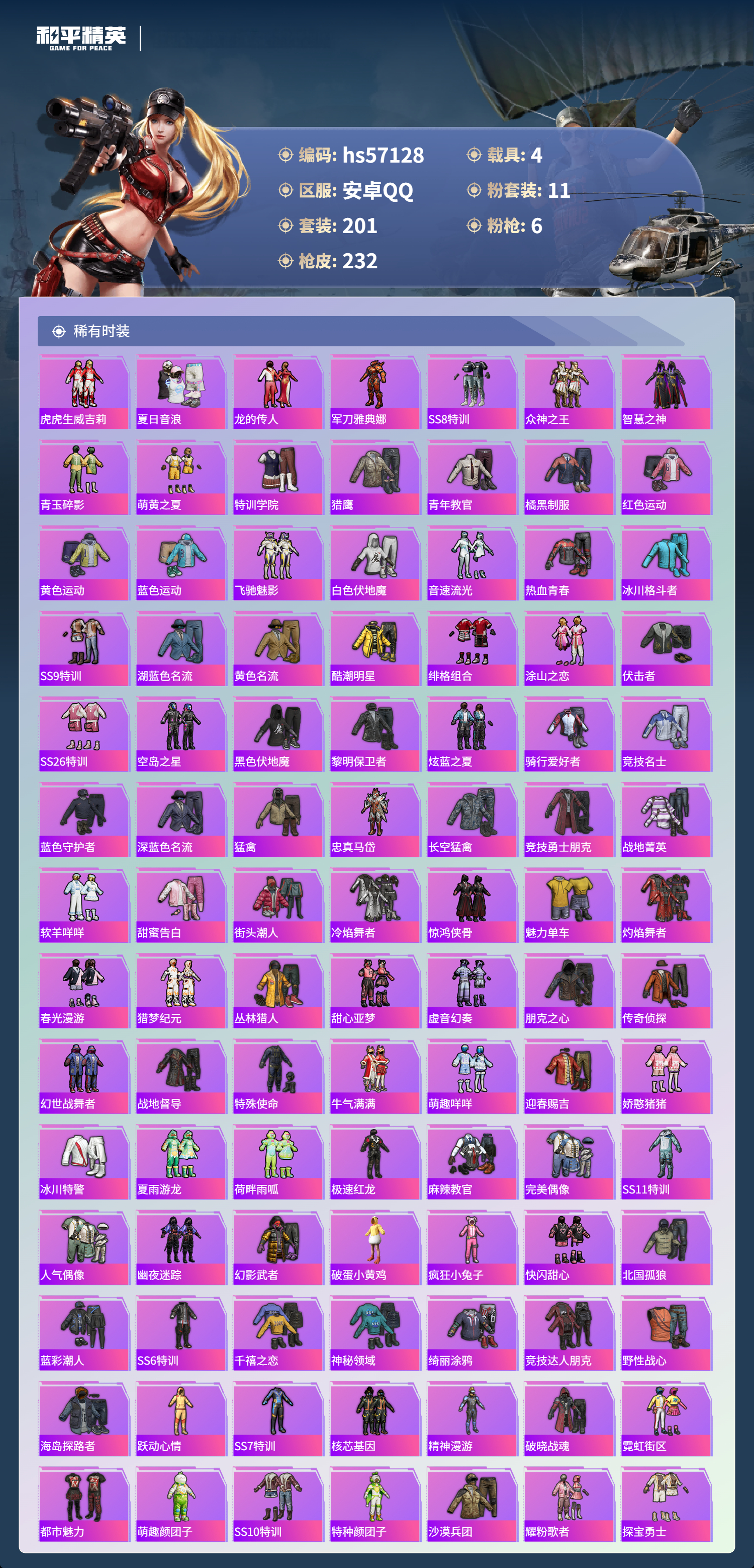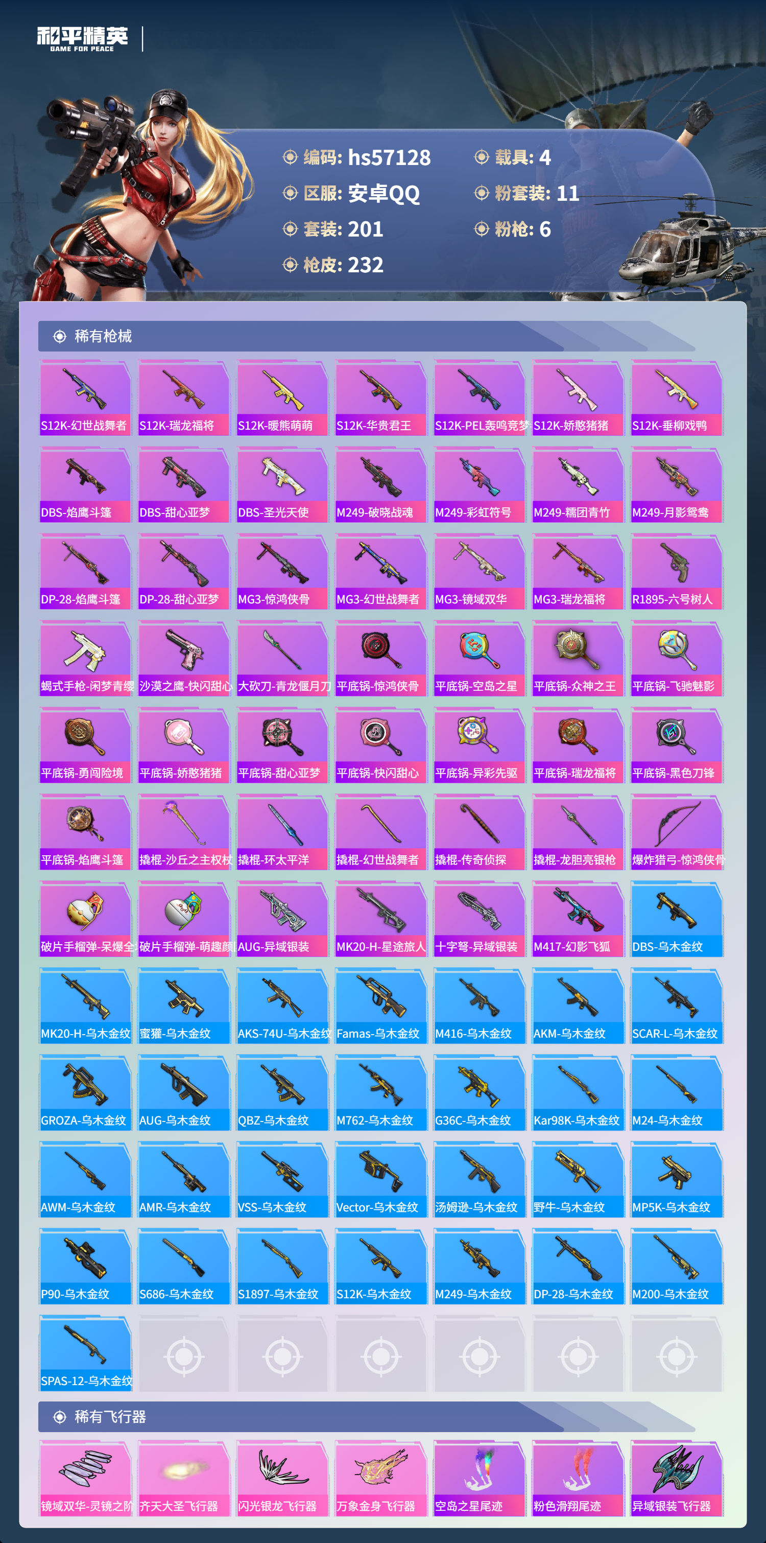 2384749安卓手q-11王牌印记-11粉装-6特效呛-4载具-83782热力值-201套装-232呛皮-1卓越印记 【11粉装】套装-新星烈龙套装-垂柳戏鸭套装-傲雪凌霜套装-雪国幻梦角色-千金淑猫角色-复仇流浪者套装-蓝莓炮弹套装-冰霜白皇套装-寒光使者角色-罗征角色-初号机款机体服 【6特效呛】m16a4-垂柳戏鸭/4级scar-l-锦绣绵绵/5级kar9