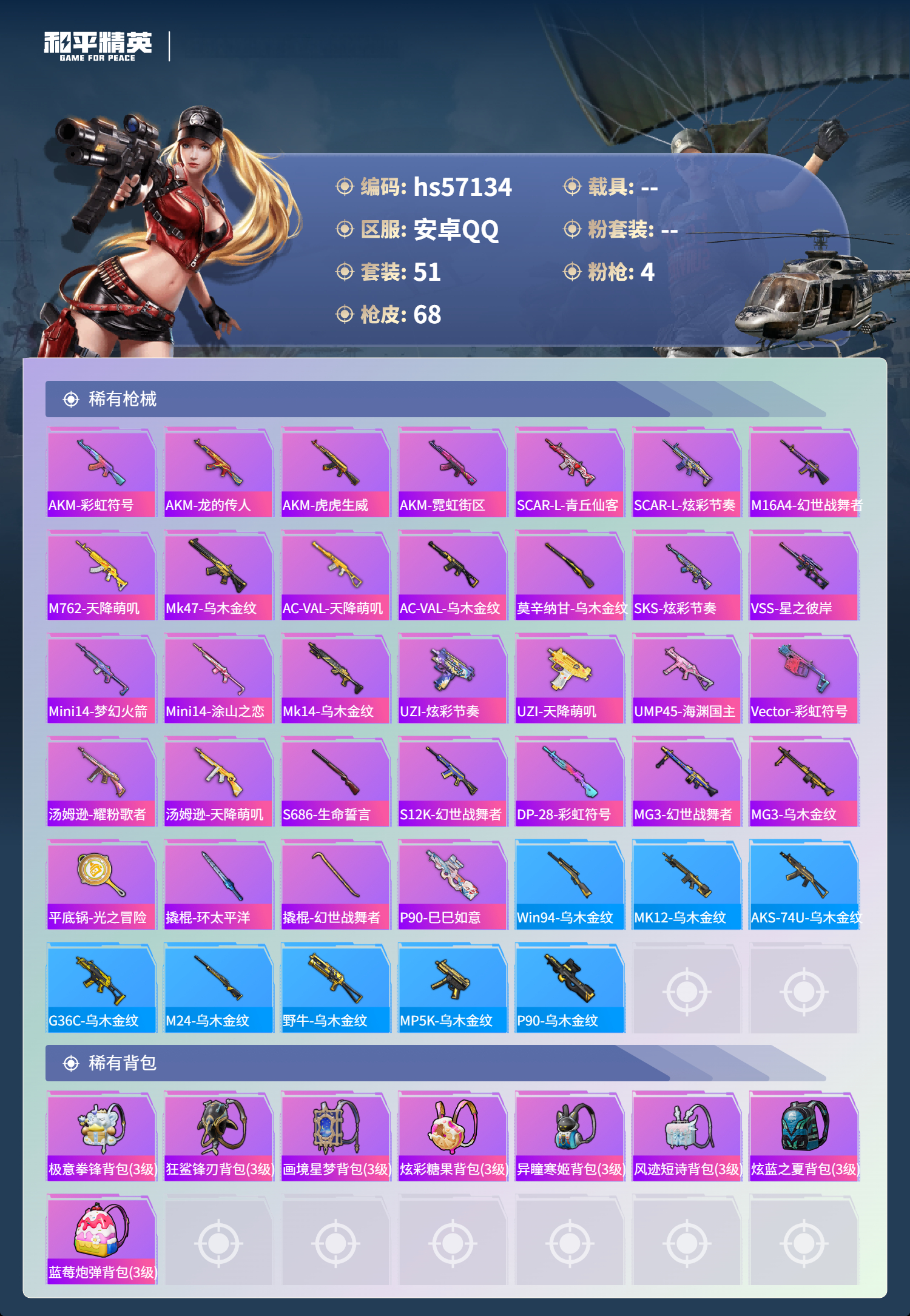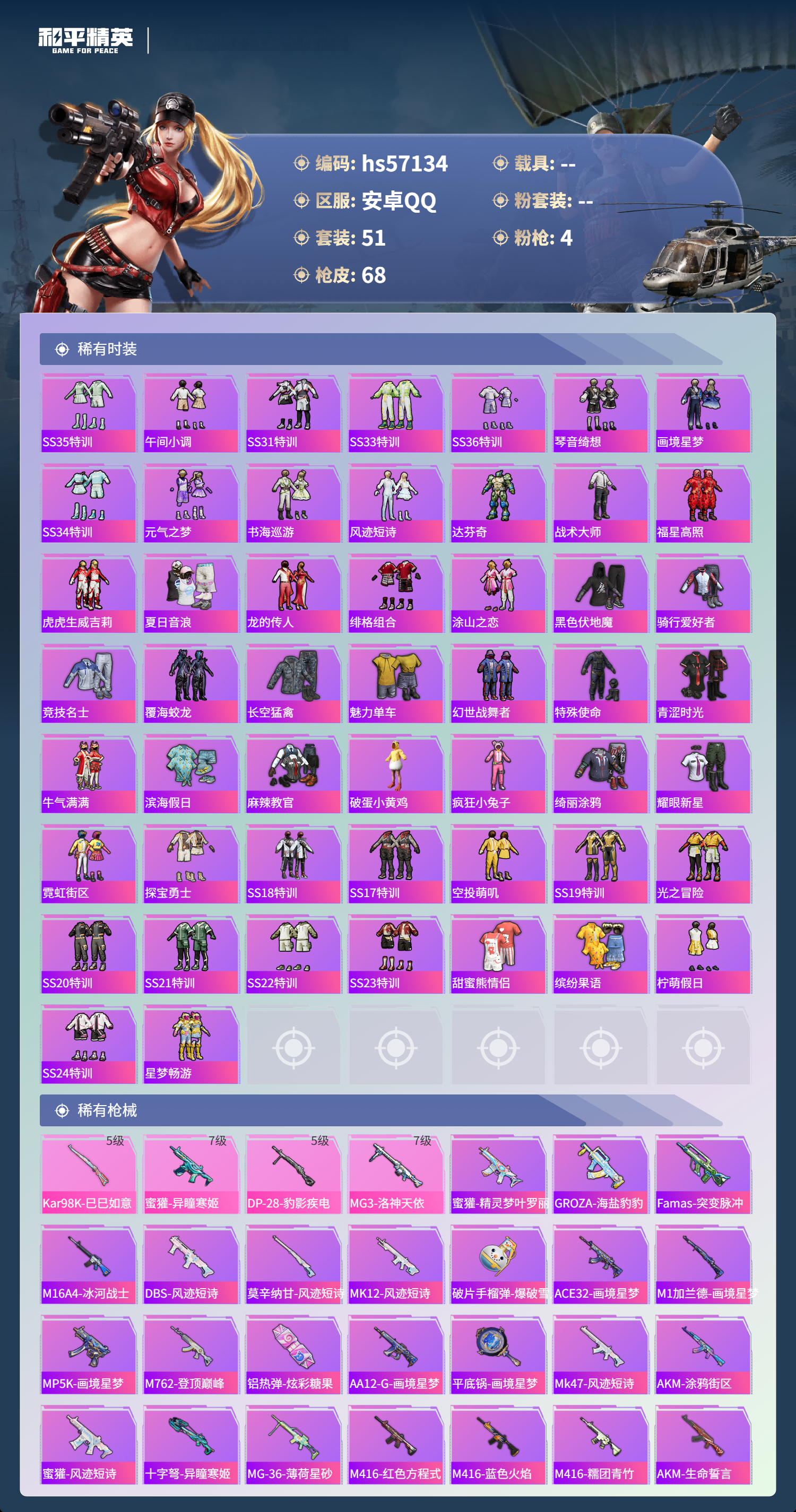 0载具-51套装-68呛皮-hs57134 安卓手q-0王牌印记-4特效呛-21908热力值-51套装-68呛皮【4特效呛】dp-28-豹影疾电/5级kar98k-巳巳如意/5级蜜獾-异瞳寒姬/7级mg3-洛神天依/7级【51稀有时装】ss35特训午间小调ss31特训ss33特训ss36特训琴音绮想画境星梦ss34特训元气之梦书海巡游风迹短诗达芬奇战术大师福星高照虎虎生威吉莉夏日音浪