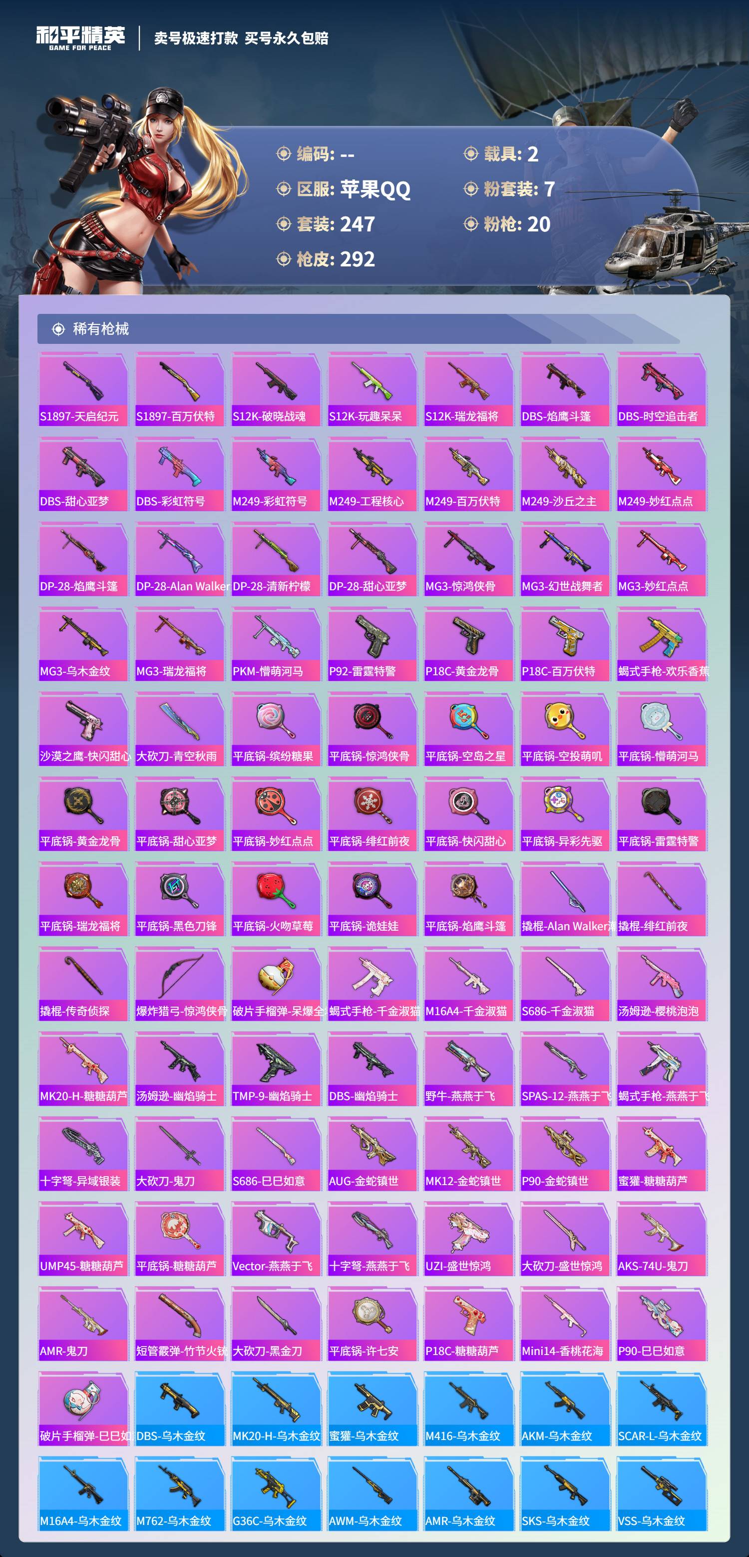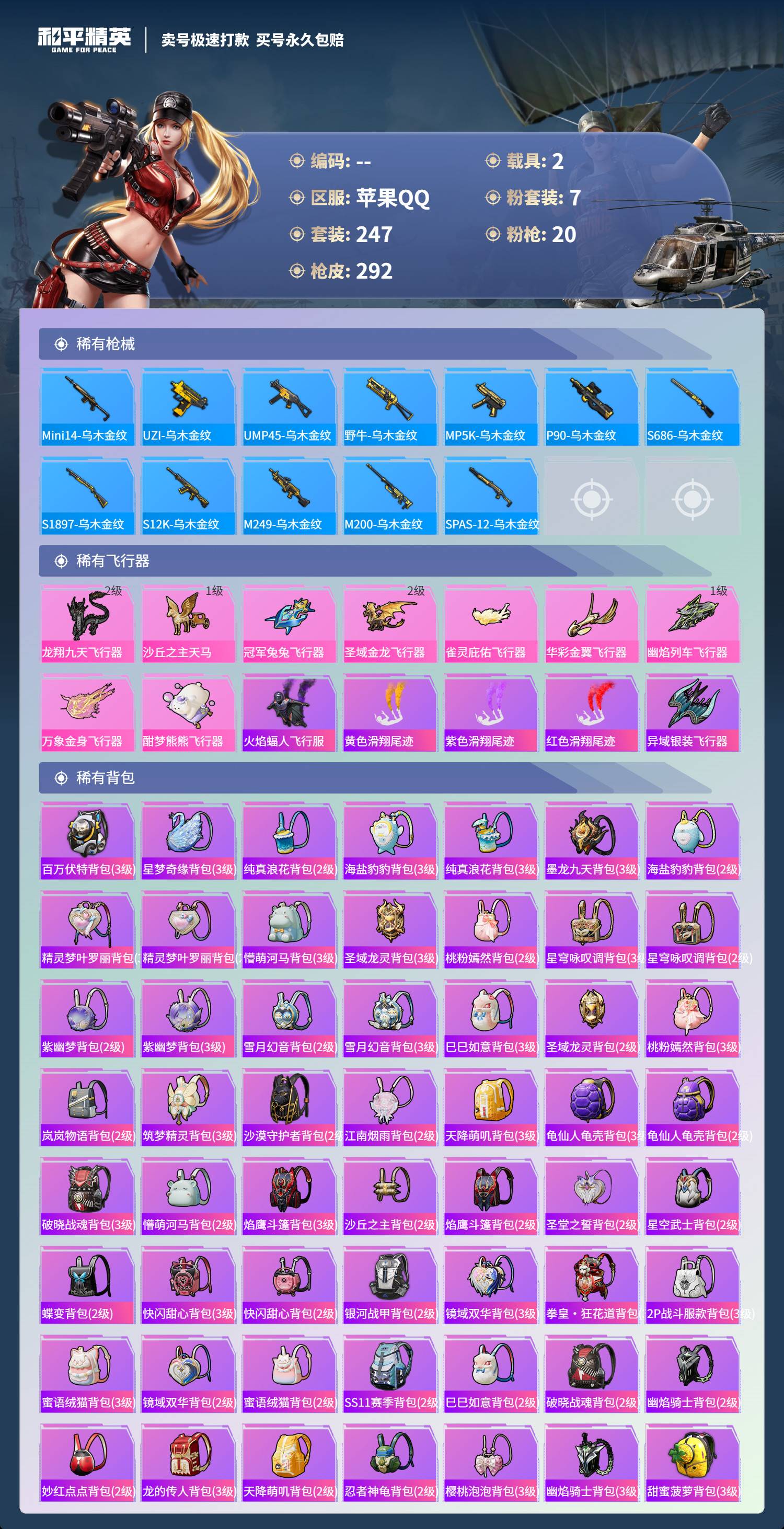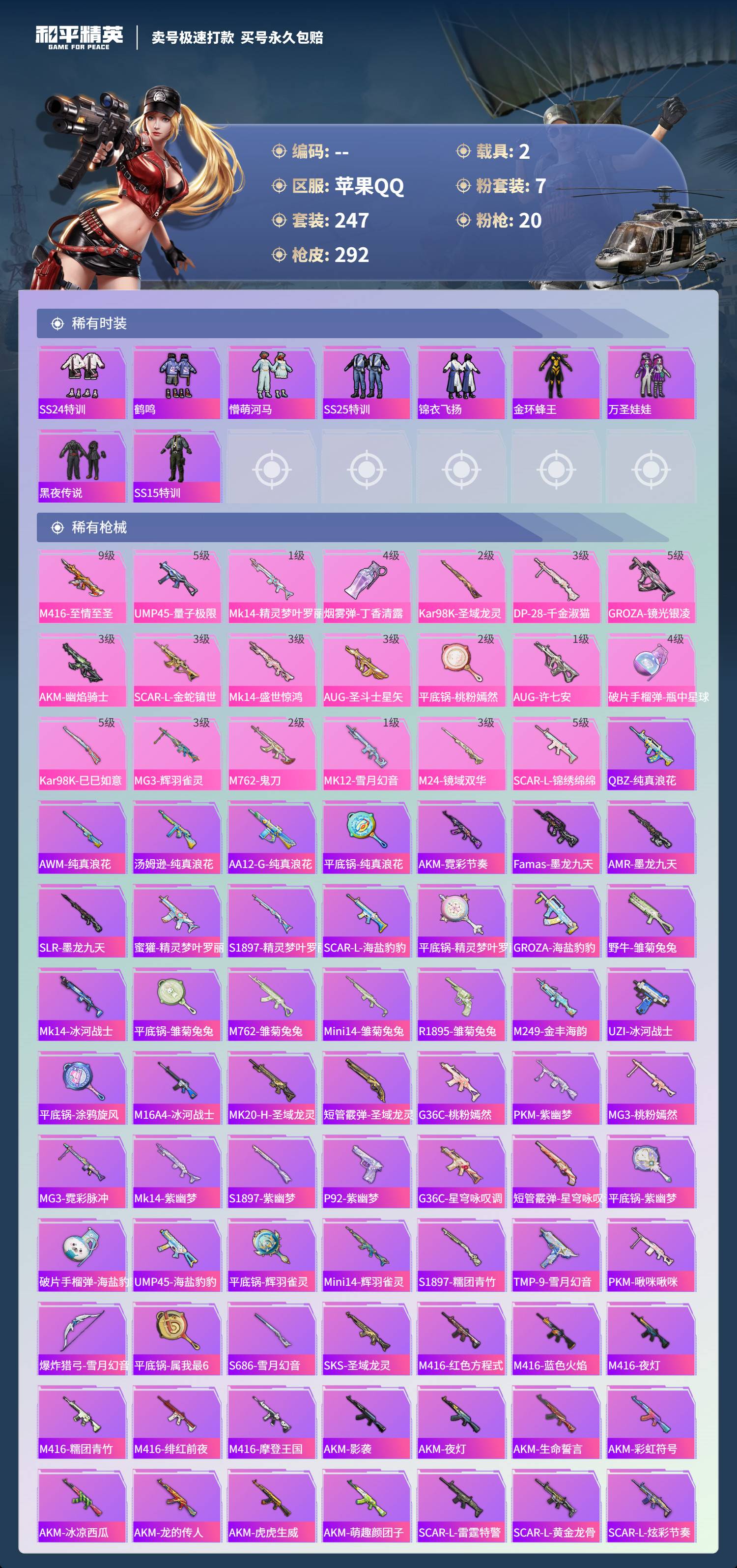 006fs:k1493苹果qq区苹果手q-13王牌印记-7粉装-20特效呛-2载具-103582热力值-244套装-292呛皮-4卓越印记-2传奇印记 【7粉装】宝贝奶油派雪月幻音岚岚物语彗云及圣萨利娅绚金战神烟云彩露 【20特效呛】akm-幽焰骑士-3级 scar-l-锦绣绵绵-5级 scar-l-金蛇镇世-3级 m416-至情至圣-9级 groza-镜光银凌-5级 aug-圣斗士星矢-3级 aug-许七安-1级 m762-鬼刀-2级 kar98k-圣域龙灵-2级 kar98k-巳巳如意-5级 m24-镜域双华-3级 mk14-盛世惊鸿-3级 mk14-精灵梦叶罗丽-1级 mk12-雪月幻音-1级 ump45-量子极限-5级 dp-28-千金淑猫-3级 mg3-辉羽雀灵-3级 平底锅-桃粉嫣然-2级 盐雾蛋-丁香清露-4级 破片手留单-瓶中星球-4级 【3红装】圣域龙灵-瑞拉/2级盛世惊鸿-云鸾/1级幽焰骑士-维塔/1级 【12稀有紫装】都市猎人派对舞王2p战斗服款暗影哥特浪漫天命雪山精英龟仙人许七安怀庆长公主临安公主金羽特工东方飞龙 【2稀有载具】幽焰风驰摩托车护世瑞兽 【1僚机】僚机-圣域龙宝 【244稀有时装】瑞拉/2级维塔/1级云鸾/1级蓝冰羽恋语绒绒星影赞美诗紫幽梦大橘大利都市猎人浪漫天命龟仙人临安公主雪山精英暗影哥特东方飞龙金羽特工怀庆长公主许七安猎影月神小熊蜂蜜罐粉恋花风舞幻音派对舞王2p战斗服款狂战萌兔狂沙舞者alan walker龙魂突击队小熊娃娃异域银装都市丽猫街头风暴冰河战士鱼渊荷华俏兔智灵黑曜寓言ss30特训青团波波燕燕于飞海琴烟风玲战术大师智谋强哥雏菊兔兔糖糖葫芦蝶变巳巳如意湖畔霞光曼妙人鱼元素星魂ss28特训白光莹银尘冰公主ss29特训萝兰蝴蝶ss5特训alan walker电音教主贝斯之夜焰鹰斗篷醒狮腾龙决胜时刻福星高照精密机核龙的传人甜梦熊熊白熊同盟青玉碎影 【292稀有呛械】m416-至情至圣/9级ump45-量子极限/5级q-纯真浪花awm-纯真浪花汤姆逊-纯真浪花dbs-乌木金纹aa12-g-纯真浪花平底锅-纯真浪花akm-霓彩节奏famas-墨龙九天amr-墨龙九天slr-墨龙九天蜜獾-精灵梦叶罗丽s1897-精灵梦叶罗丽scar-l-海盐豹豹mk14-精灵梦叶罗丽/1级平底锅-精灵梦叶罗丽groza-海盐豹豹盐雾蛋-丁香清露/4级kar98k-圣域龙灵/2级dp-28-千金淑猫/3级groza-镜光银凌/5级akm-幽焰骑士/3级scar-l-金蛇镇世/3级mk14-盛世惊鸿/3级aug-圣斗士星矢/3级平底锅-桃粉嫣然/2级aug-许七安/1级破片手留单-瓶中星球/4级kar98k-巳巳如意/5级mg3-辉羽雀灵/3级m762-鬼刀/2级mk12-雪月幻音/1级野牛-雏菊兔兔mk14-冰河战士平底锅-雏菊兔兔m762-雏菊兔兔mini14-雏菊兔兔r1895-雏菊兔兔m249-金丰海韵uzi-冰河战士平底锅-涂鸦旋风m16a4-冰河战士mk20-h-乌木金纹m24-镜域双华/3级scar-l-锦绣绵绵/5级mk20-h-圣域龙灵短管霰弹-圣域龙灵g36c-桃粉嫣然pkm-紫幽梦mg3-桃粉嫣然mg3-霓彩脉冲mk14-紫幽梦蜜獾-乌木金纹s1897-紫幽梦p92-紫幽梦g36c-星穹咏叹调短管霰弹-星穹咏叹调平底锅-紫幽梦 【14稀有飞行器】龙翔九天飞行器/2级沙丘之主天马/1级冠军兔兔飞行器圣域金龙飞行器/2级雀灵庇佑飞行器火焰蝠人飞行服黄色滑翔尾迹紫色滑翔尾迹红色滑翔尾迹华彩金翼飞行器幽焰列车飞行器/1级万象金身飞行器酣梦熊熊飞行器异域银装飞行器 【99稀有背包】百万伏特背包3级星梦奇缘背包3级纯真浪花背包2级海盐豹豹背包3级纯真浪花背包3级墨龙九天背包3级海盐豹豹背包2级精灵梦叶罗丽背包3级精灵梦叶罗丽背包2级懵萌河马背包3级圣域龙灵背包3级桃粉嫣然背包2级星穹咏叹调背包3级星穹咏叹调背包2级紫幽梦背包2级紫幽梦背包3级雪月幻音背包2级雪月幻音背包3级巳巳如意背包3级圣域龙灵背包2级桃粉嫣然背包3级岚岚物语背包2级筑梦精灵背包3级沙漠守护者背包2级江南烟雨背包2级天降萌叽背包3级龟仙人龟壳背包3级龟仙人龟壳背包2级破晓战魂背包3级
