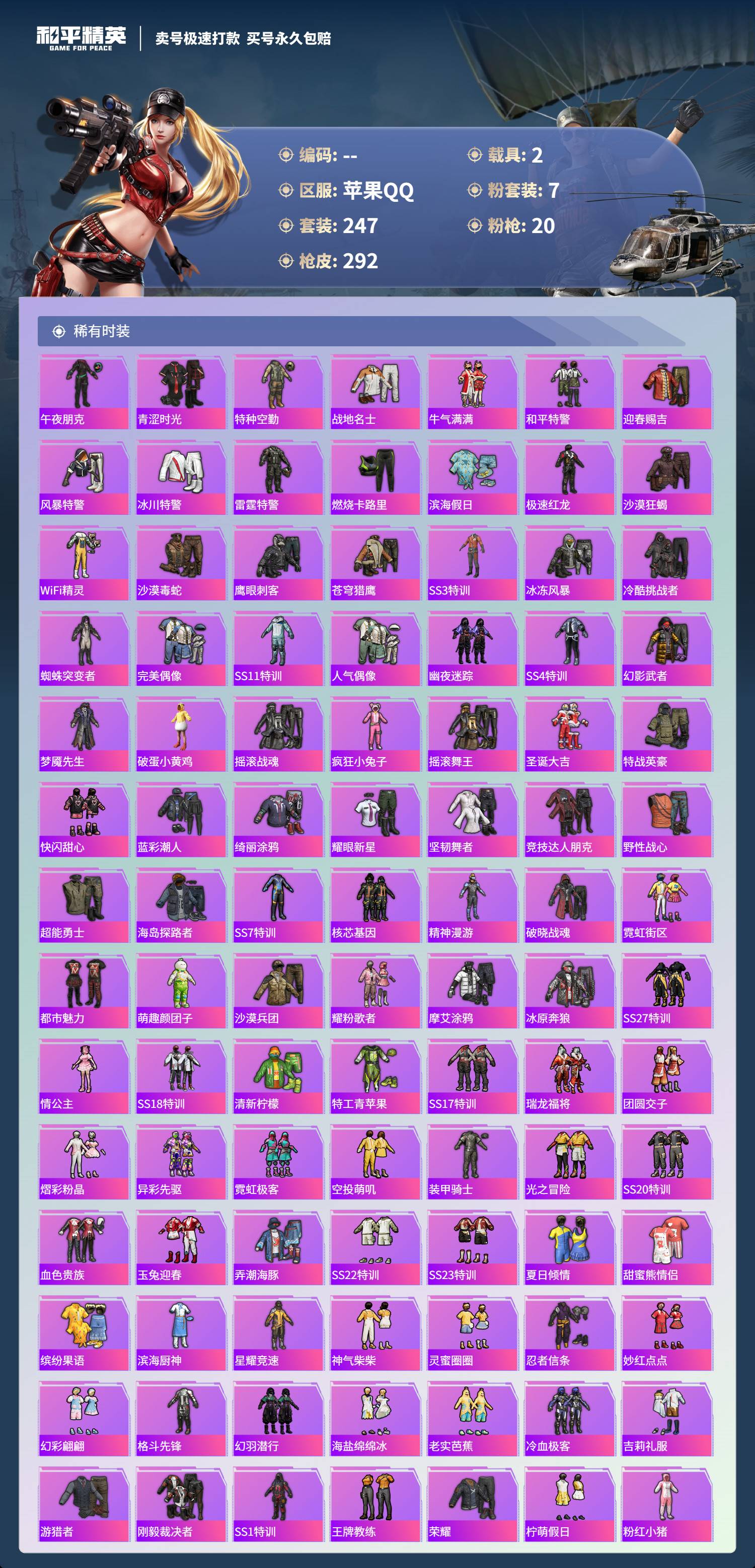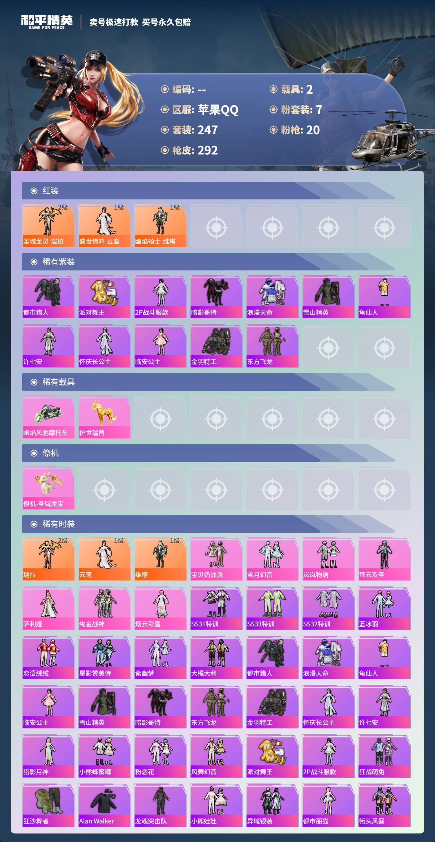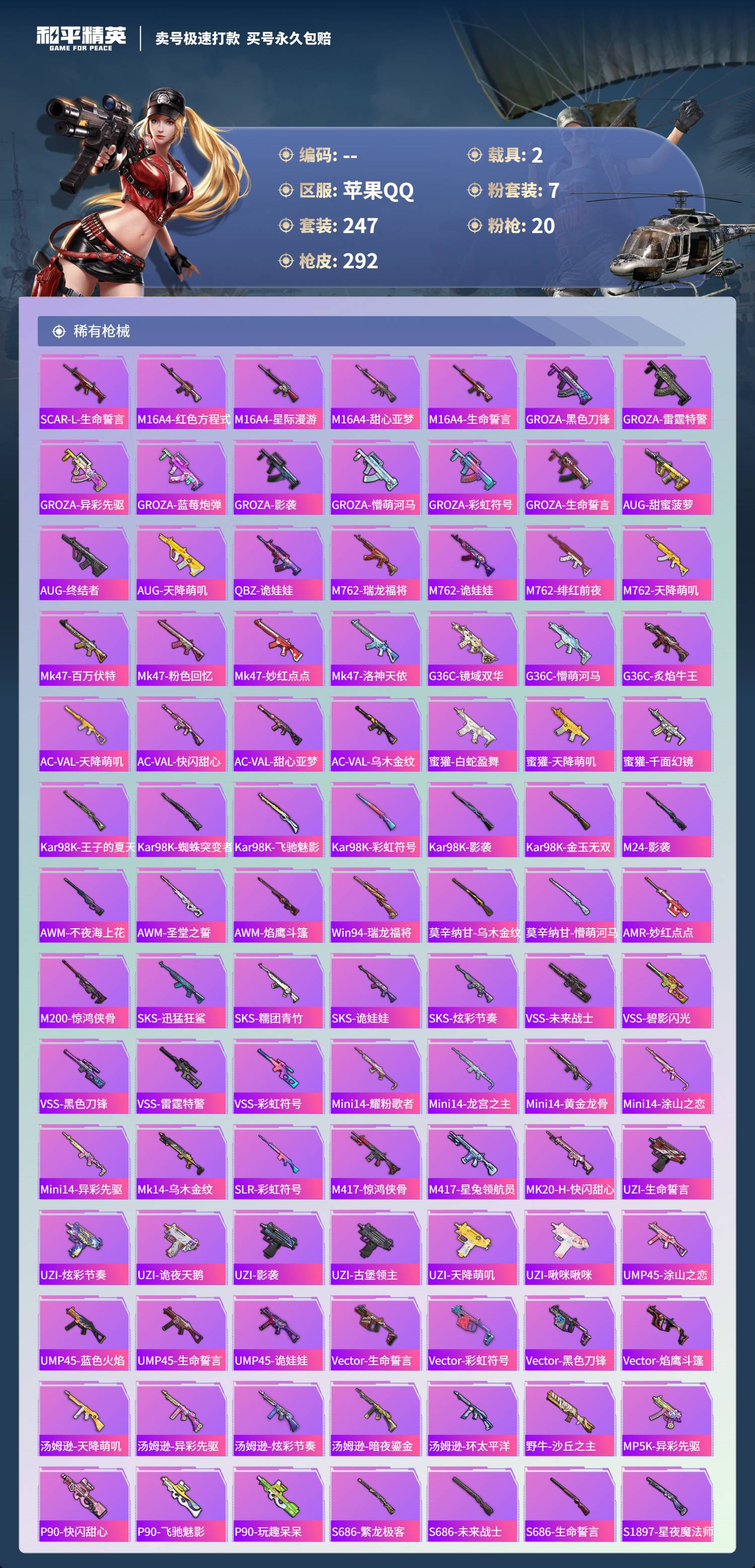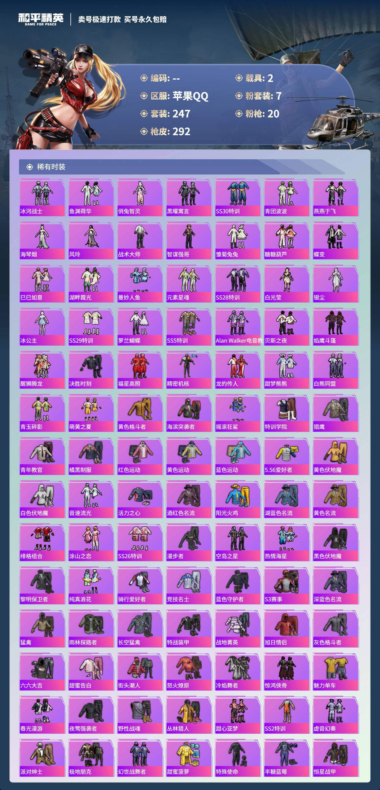 006fs:k1493苹果qq区苹果手q-13王牌印记-7粉装-20特效呛-2载具-103582热力值-244套装-292呛皮-4卓越印记-2传奇印记 【7粉装】宝贝奶油派雪月幻音岚岚物语彗云及圣萨利娅绚金战神烟云彩露 【20特效呛】akm-幽焰骑士-3级 scar-l-锦绣绵绵-5级 scar-l-金蛇镇世-3级 m416-至情至圣-9级 groza-镜光银凌-5级 aug-圣斗士星矢-3级 aug-许七安-1级 m762-鬼刀-2级 kar98k-圣域龙灵-2级 kar98k-巳巳如意-5级 m24-镜域双华-3级 mk14-盛世惊鸿-3级 mk14-精灵梦叶罗丽-1级 mk12-雪月幻音-1级 ump45-量子极限-5级 dp-28-千金淑猫-3级 mg3-辉羽雀灵-3级 平底锅-桃粉嫣然-2级 盐雾蛋-丁香清露-4级 破片手留单-瓶中星球-4级 【3红装】圣域龙灵-瑞拉/2级盛世惊鸿-云鸾/1级幽焰骑士-维塔/1级 【12稀有紫装】都市猎人派对舞王2p战斗服款暗影哥特浪漫天命雪山精英龟仙人许七安怀庆长公主临安公主金羽特工东方飞龙 【2稀有载具】幽焰风驰摩托车护世瑞兽 【1僚机】僚机-圣域龙宝 【244稀有时装】瑞拉/2级维塔/1级云鸾/1级蓝冰羽恋语绒绒星影赞美诗紫幽梦大橘大利都市猎人浪漫天命龟仙人临安公主雪山精英暗影哥特东方飞龙金羽特工怀庆长公主许七安猎影月神小熊蜂蜜罐粉恋花风舞幻音派对舞王2p战斗服款狂战萌兔狂沙舞者alan walker龙魂突击队小熊娃娃异域银装都市丽猫街头风暴冰河战士鱼渊荷华俏兔智灵黑曜寓言ss30特训青团波波燕燕于飞海琴烟风玲战术大师智谋强哥雏菊兔兔糖糖葫芦蝶变巳巳如意湖畔霞光曼妙人鱼元素星魂ss28特训白光莹银尘冰公主ss29特训萝兰蝴蝶ss5特训alan walker电音教主贝斯之夜焰鹰斗篷醒狮腾龙决胜时刻福星高照精密机核龙的传人甜梦熊熊白熊同盟青玉碎影 【292稀有呛械】m416-至情至圣/9级ump45-量子极限/5级q-纯真浪花awm-纯真浪花汤姆逊-纯真浪花dbs-乌木金纹aa12-g-纯真浪花平底锅-纯真浪花akm-霓彩节奏famas-墨龙九天amr-墨龙九天slr-墨龙九天蜜獾-精灵梦叶罗丽s1897-精灵梦叶罗丽scar-l-海盐豹豹mk14-精灵梦叶罗丽/1级平底锅-精灵梦叶罗丽groza-海盐豹豹盐雾蛋-丁香清露/4级kar98k-圣域龙灵/2级dp-28-千金淑猫/3级groza-镜光银凌/5级akm-幽焰骑士/3级scar-l-金蛇镇世/3级mk14-盛世惊鸿/3级aug-圣斗士星矢/3级平底锅-桃粉嫣然/2级aug-许七安/1级破片手留单-瓶中星球/4级kar98k-巳巳如意/5级mg3-辉羽雀灵/3级m762-鬼刀/2级mk12-雪月幻音/1级野牛-雏菊兔兔mk14-冰河战士平底锅-雏菊兔兔m762-雏菊兔兔mini14-雏菊兔兔r1895-雏菊兔兔m249-金丰海韵uzi-冰河战士平底锅-涂鸦旋风m16a4-冰河战士mk20-h-乌木金纹m24-镜域双华/3级scar-l-锦绣绵绵/5级mk20-h-圣域龙灵短管霰弹-圣域龙灵g36c-桃粉嫣然pkm-紫幽梦mg3-桃粉嫣然mg3-霓彩脉冲mk14-紫幽梦蜜獾-乌木金纹s1897-紫幽梦p92-紫幽梦g36c-星穹咏叹调短管霰弹-星穹咏叹调平底锅-紫幽梦 【14稀有飞行器】龙翔九天飞行器/2级沙丘之主天马/1级冠军兔兔飞行器圣域金龙飞行器/2级雀灵庇佑飞行器火焰蝠人飞行服黄色滑翔尾迹紫色滑翔尾迹红色滑翔尾迹华彩金翼飞行器幽焰列车飞行器/1级万象金身飞行器酣梦熊熊飞行器异域银装飞行器 【99稀有背包】百万伏特背包3级星梦奇缘背包3级纯真浪花背包2级海盐豹豹背包3级纯真浪花背包3级墨龙九天背包3级海盐豹豹背包2级精灵梦叶罗丽背包3级精灵梦叶罗丽背包2级懵萌河马背包3级圣域龙灵背包3级桃粉嫣然背包2级星穹咏叹调背包3级星穹咏叹调背包2级紫幽梦背包2级紫幽梦背包3级雪月幻音背包2级雪月幻音背包3级巳巳如意背包3级圣域龙灵背包2级桃粉嫣然背包3级岚岚物语背包2级筑梦精灵背包3级沙漠守护者背包2级江南烟雨背包2级天降萌叽背包3级龟仙人龟壳背包3级龟仙人龟壳背包2级破晓战魂背包3级