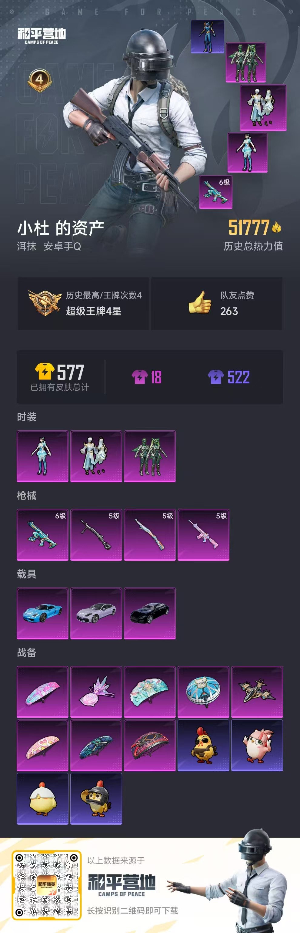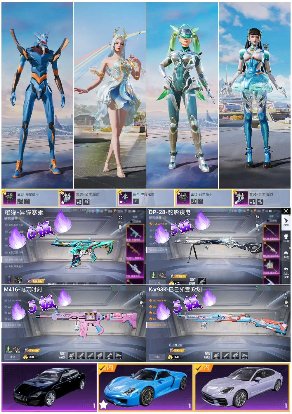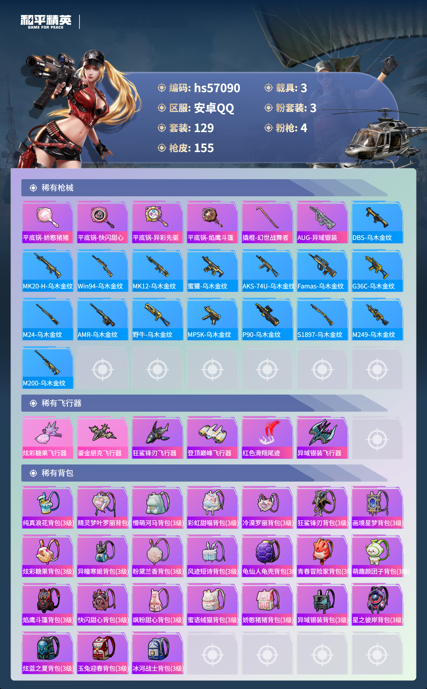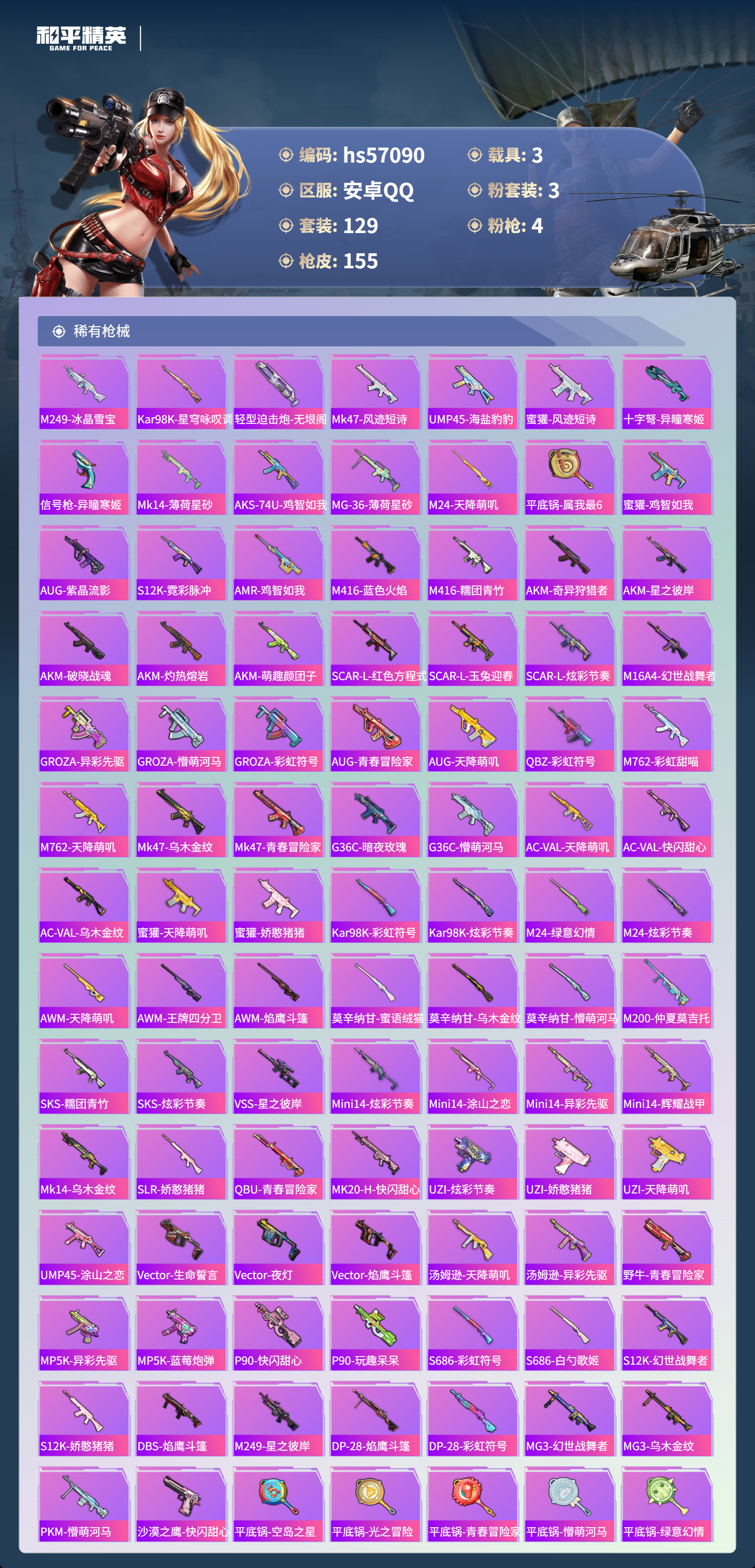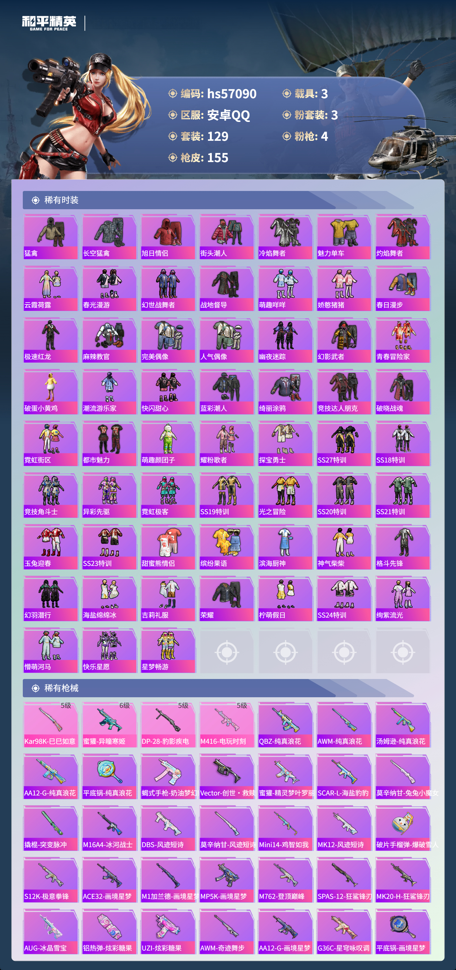 3载具-129套装-155呛皮-hs57090 安卓手q-4王牌印记-3粉装-4特效呛-3载具-51777热力值-129套装-155呛皮【3粉装】套装-翡翠骑士套装-金丰海韵角色-异瞳寒姬【4特效呛】蜜獾-异瞳寒姬/6级kar98k-巳巳如意/5级dp-28-豹影疾电/5级m416-电玩时刻/5级【2稀有紫装】mark.06龟仙人【3稀有载具】保时捷918 sper沉静蓝保时捷panamera星辰