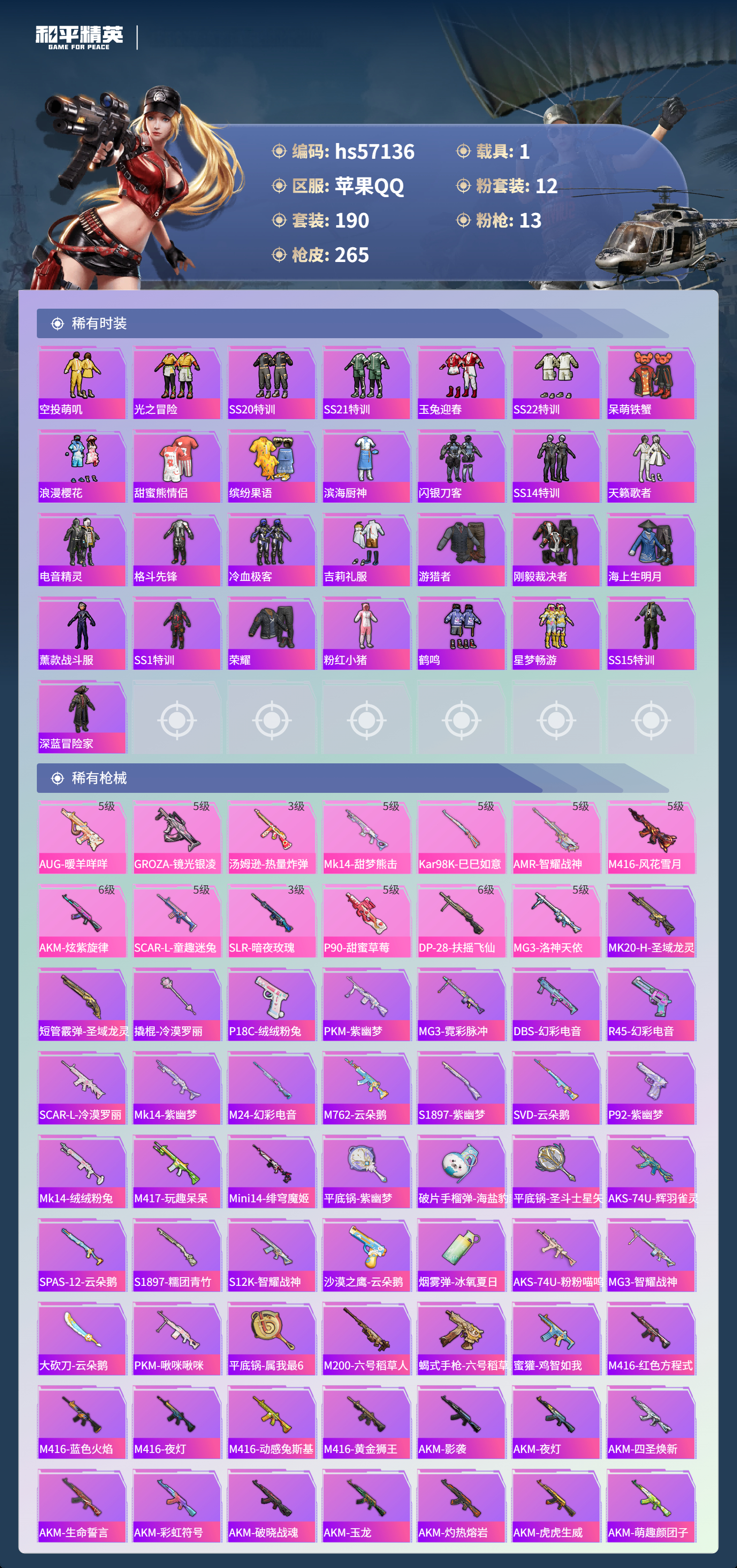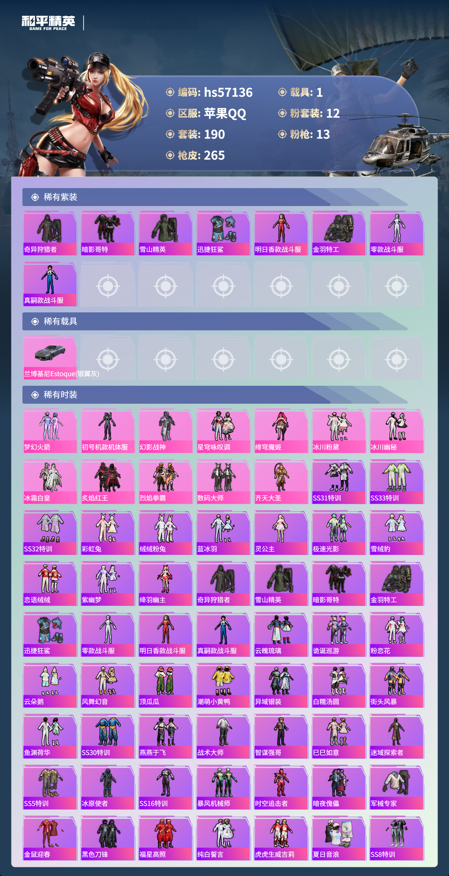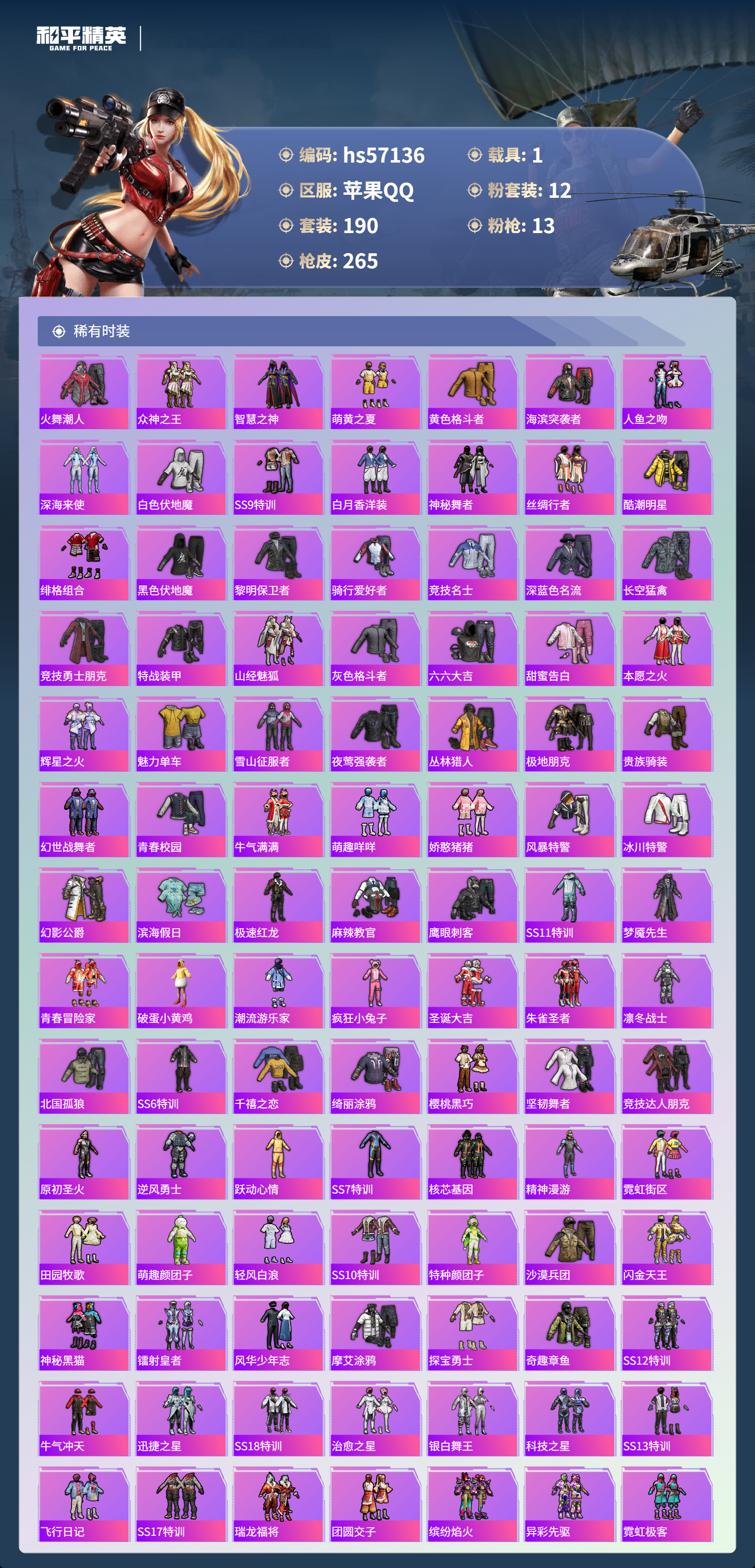 1载具-190套装-265呛皮-hs57136 苹果手q-17王牌印记-12粉装-13特效呛-1载具-85065热力值-190套装-265呛皮-2卓越印记-1传奇印记【12粉装】套装-齐天大圣套装-炙焰红王套装-冰川粉黛套装-幻影战神角色-绯穹魔姬套装-烈焰拳霸套装-梦幻火箭套装-星穹咏叹调套装-冰川幽秘套装-数码大师套装-冰霜白皇角色-初号机款机体服【13特效呛】amr-智耀战神/5级slr-暗夜玫