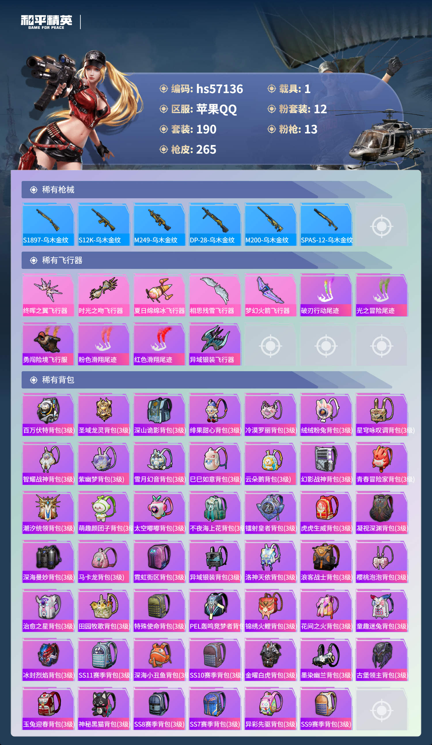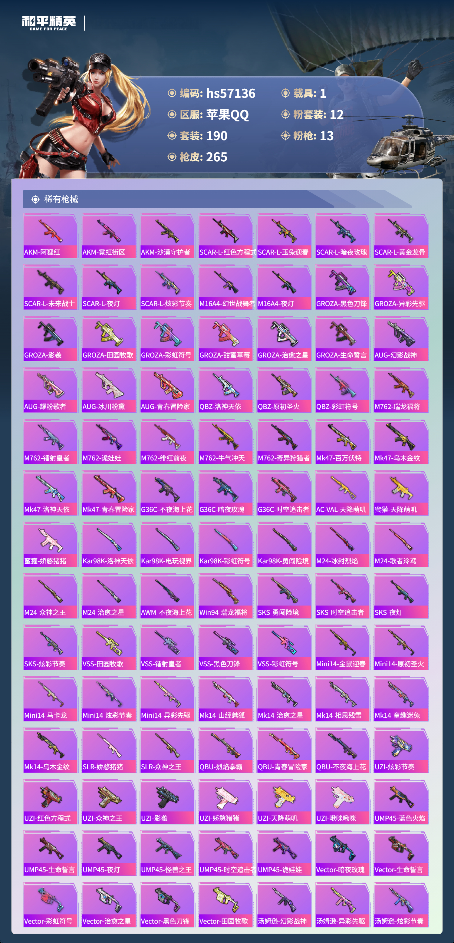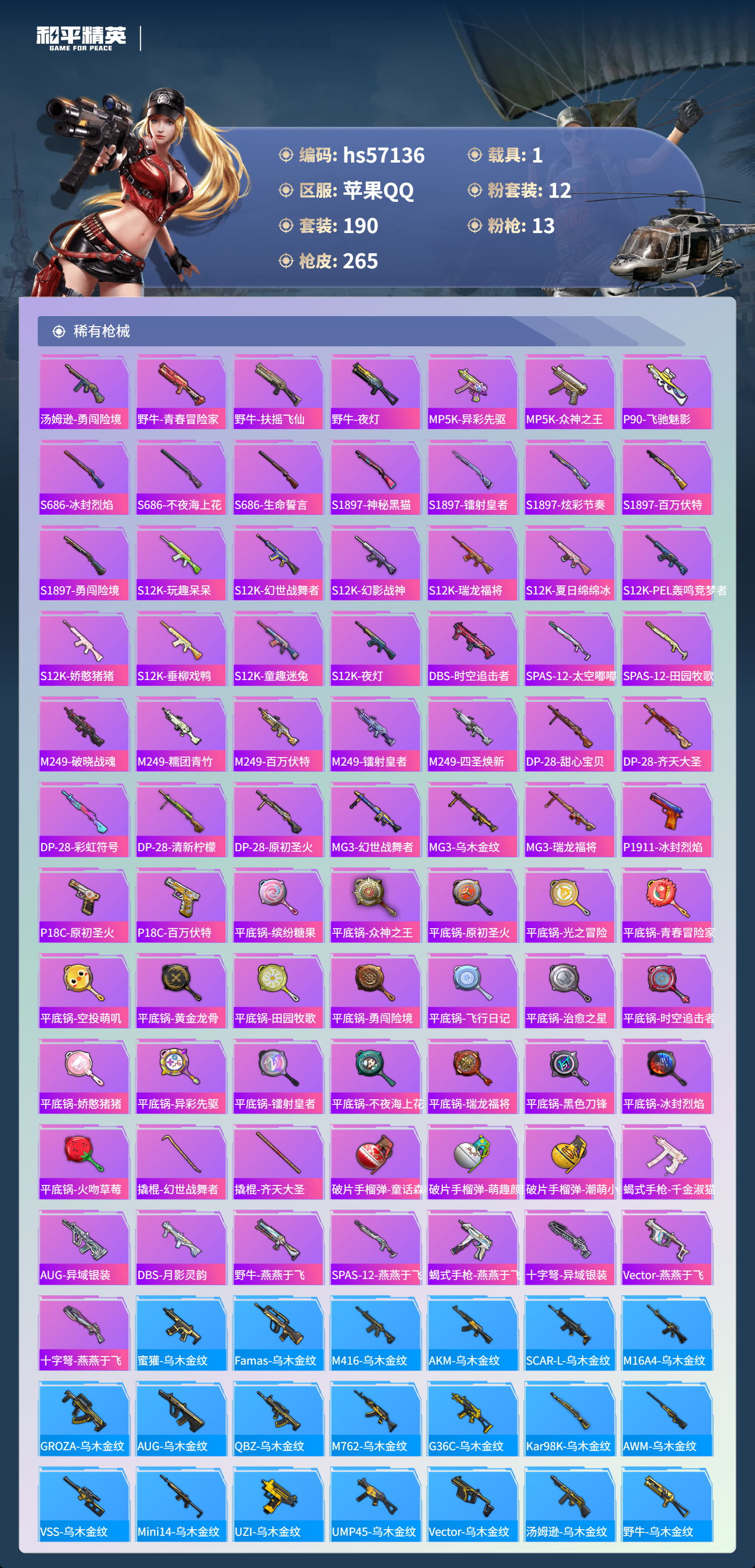 1载具-190套装-265呛皮-hs57136 苹果手q-17王牌印记-12粉装-13特效呛-1载具-85065热力值-190套装-265呛皮-2卓越印记-1传奇印记【12粉装】套装-齐天大圣套装-炙焰红王套装-冰川粉黛套装-幻影战神角色-绯穹魔姬套装-烈焰拳霸套装-梦幻火箭套装-星穹咏叹调套装-冰川幽秘套装-数码大师套装-冰霜白皇角色-初号机款机体服【13特效呛】amr-智耀战神/5级slr-暗夜玫