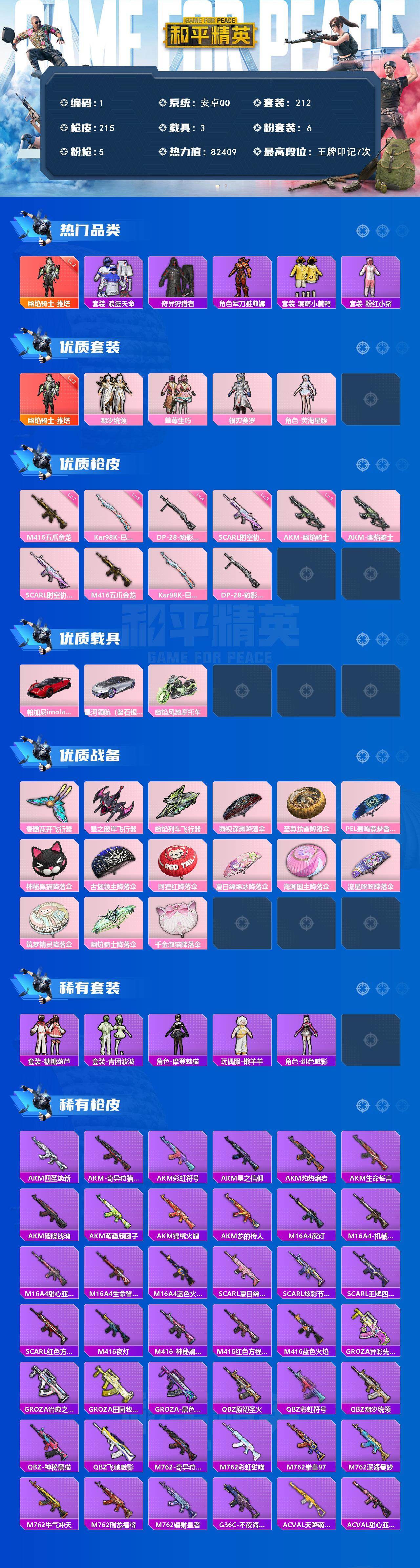 安卓 手q-1神装-6粉装-5特效呛-3载具-3粉色飞行器-82409热力值-7王牌印记-212套装-215呛皮 【红色神装等级】:幽焰骑士-维塔二级 【红色角色神装】:幽焰骑士-维塔 【热门品类】:套装-浪漫天命,套装-奇异狩猎者,角色-军刀雅典娜,套装-潮萌小黄鸭,套装-粉红小猪 【粉色套装】:粉装-潮汐统领,粉装-草莓生巧,粉装-银刃赛罗,角色-荧海星豚 【粉色呛皮等级】:akm-幽