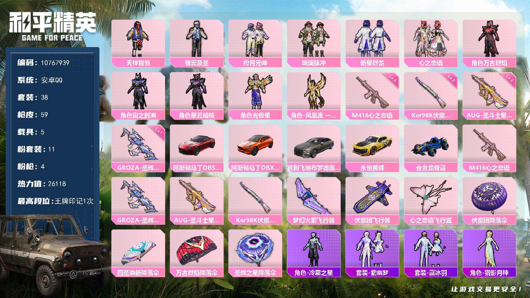 [15554459]【编号84883 可秒换绑】店长推荐特价处理精品号安卓 手q-11粉装-4特效呛-5载具-26118热力值-1印记-38套装-59呛皮 【稀有载具】:阿斯顿马丁dbs(红),阿斯顿马丁dbx(橙),宾利飞驰(布罗德盖棕双色),永恒黄蜂,合金龙骨(蓝) 【特效呛等级】:m416-心之恋语四级,groza-圣辉之星一级,aug-圣斗士星矢二级,kar98k-伏魔团二级 【优质套装】:粉装-天禅智恒,粉装-彗云及圣,粉装-狩月元帅,粉装-琉璃脉冲,粉装-新星烈龙,粉装-心之恋语,角色-万古烈焰,角色-宙之时溯,角色-星云暗核,角色-光极星,角色-凤凰座 一辉 【稀有套装】:角色-冷霜之星,套装-紫幽梦,套装-蓝冰羽,角色-猎影月神 【优质武器皮肤】:m416-心之恋语,groza-圣辉之星,aug-圣斗士星矢,kar98k-伏魔团 【稀有武器皮肤】:akm-四圣焕新,akm-破晓战魂,m16a4-幻世战舞者,scar-l-是爱神辣,scar-l-炫彩节奏,m416-动感兔斯基,groza-马卡龙,q-原初圣火,q-潮汐统领,m762-动感兔斯基,m762-奇异狩猎者,m762-牛气冲天,ac-val-圣辉之星,uzi-古堡领主,uzi-天降萌叽,ump45-生命誓言,vect-彩虹符号,kar98k-彩虹符号,m24-动感兔斯基,awm-不夜海上花,sks-心之恋语,vss-黑色刀锋,mini14-原初圣火,mini14-炫彩节奏,mk14-是爱神辣,slr-四圣焕新,m417-圣辉之星,s686-奇异狩猎者,s12k-夜灯,s12k-是爱神辣,s12k-智耀战神,m249-四圣焕新,dp-28-原初圣火,dp-28-彩虹符号,mg3-幻世战舞者,p18c-原初圣火,蝎式手呛-六号稻草人,tmp-9-萌萌史莱姆,大砍刀-万古烈焰 【其他套装】:套装-ss11特训,套装-ss12特训,套装-ss13特训,套装-幻世战舞者,套装-时尚圣诞,套装-滨海假日,套装-牛气满满,套装-特战装甲,套装-甜蜜告白,套装-甜蜜熊情侣,套装-白熊同盟,套装-竞技达人朋克,套装-绯格组合,套装-风行保卫者,套装-贵族骑装,套装-坚韧舞者,套装-原初圣火,套装-逆风勇士,套装-朱雀圣者,套装-粉甜马卡龙,套装-是爱神辣 【优质飞行器】:梦幻火箭飞行器,伏魔团飞行器