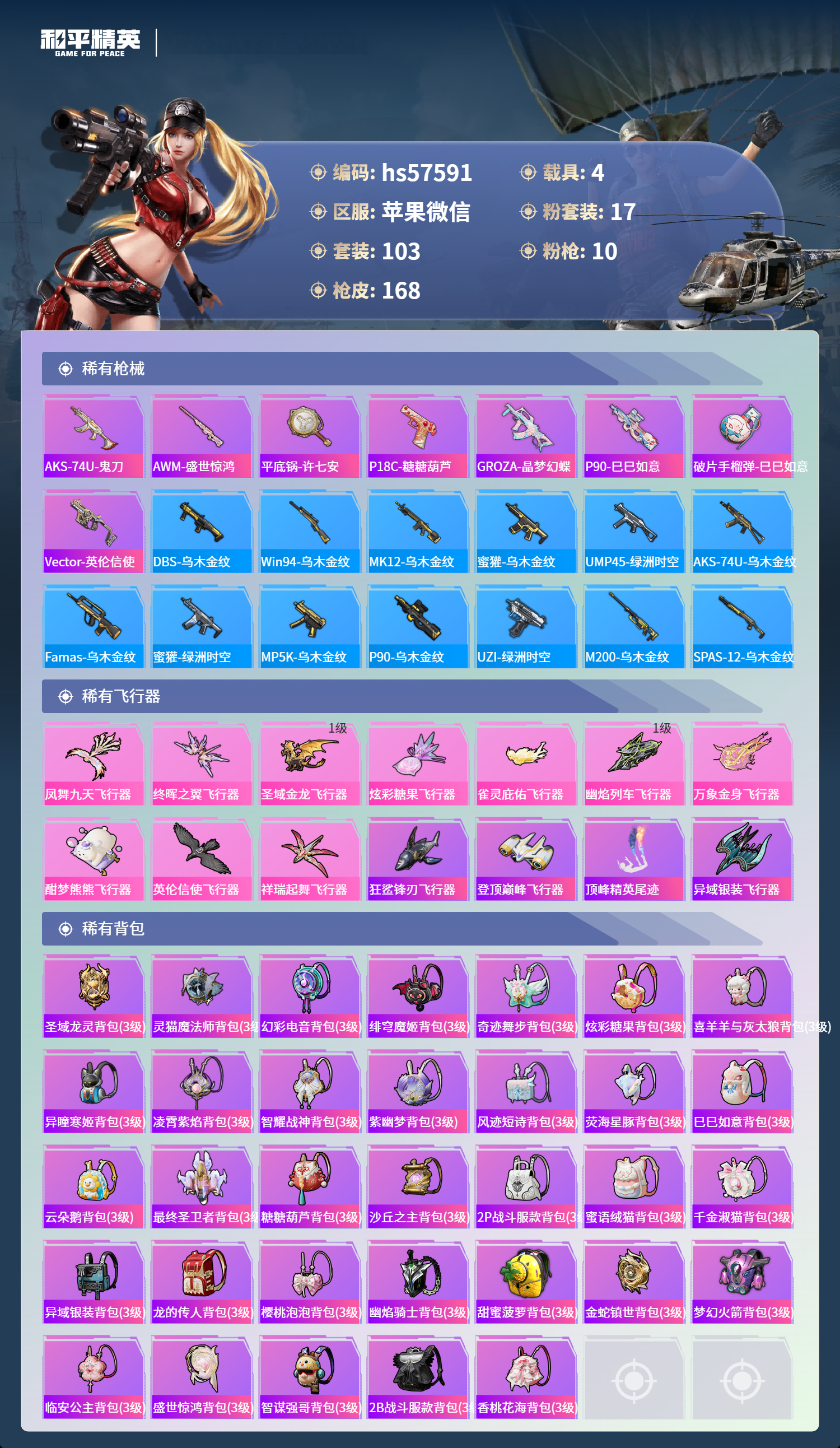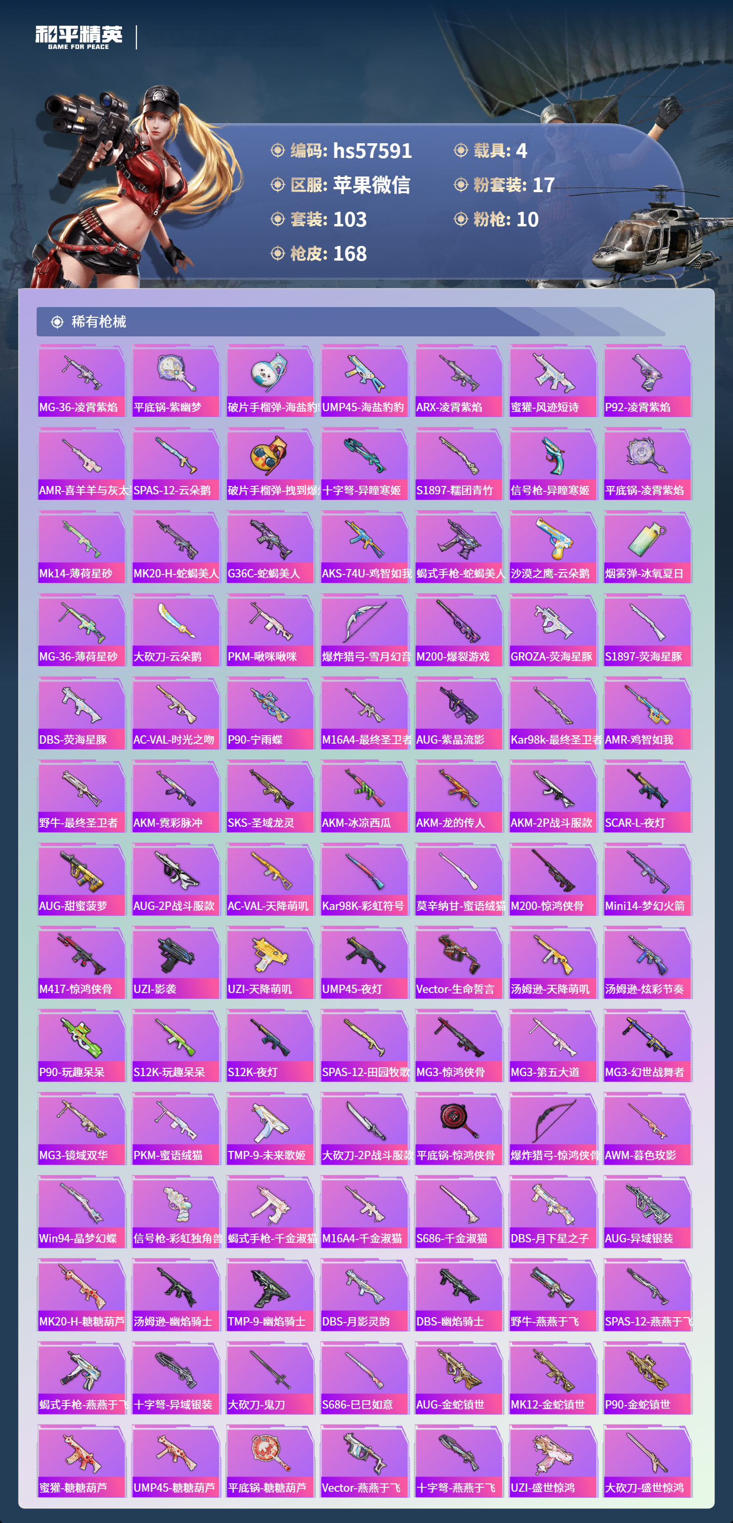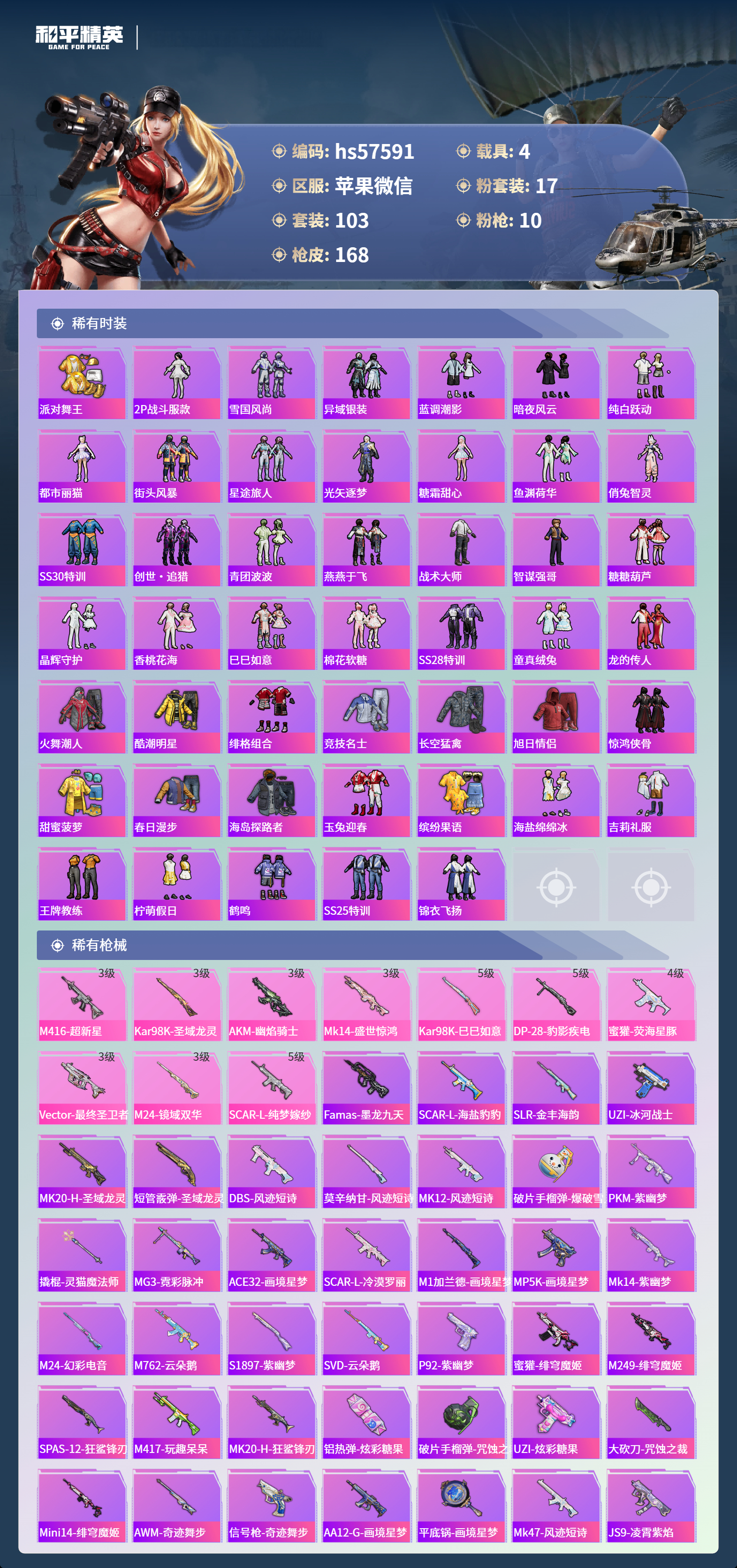 hs57591 苹果微信-8王牌印记-有战神框-4红装-17粉装-10特效呛-4载具-65815热力值-103套装-168呛皮-1卓越印记【4红装】沙丘之主-图卡盟/3级圣域龙灵-瑞拉/1级最终圣卫者-帕修斯/1级幽焰骑士-维塔/1级【17粉装】角色-异瞳寒姬角色-奇迹舞步 美琪套装-梦幻火箭角色-奇迹舞步 美雪角色-猩猩队长女娲后裔-赵灵儿角色-白兰星角色-荧海星豚角色
