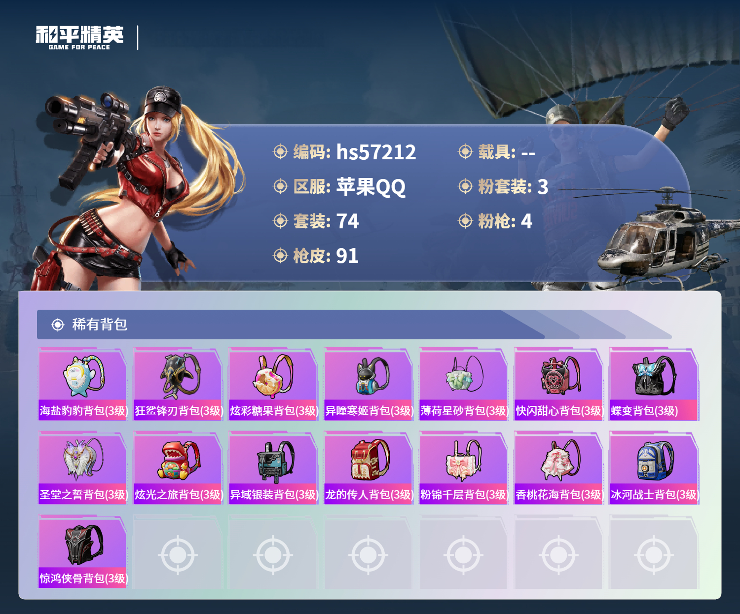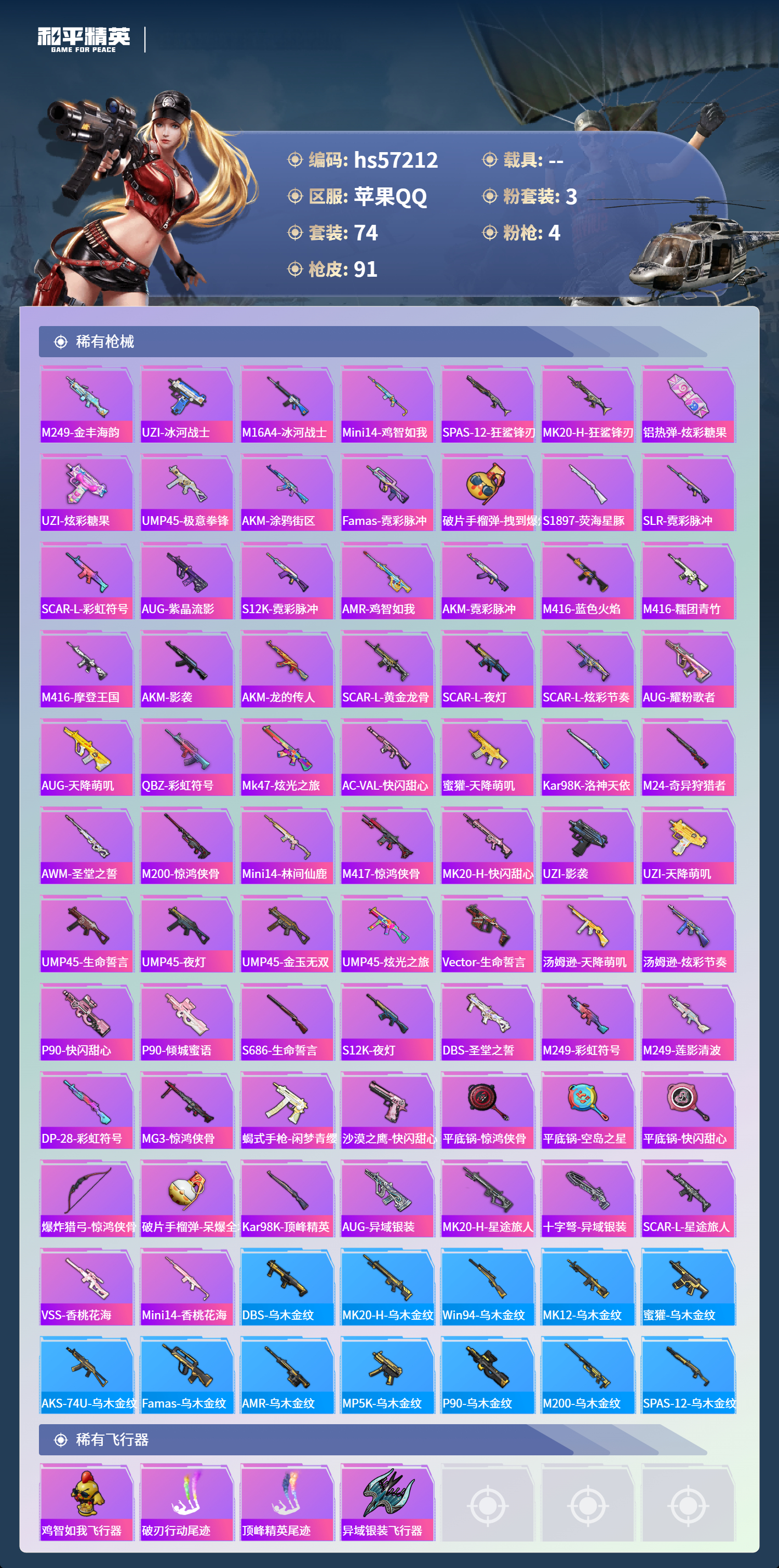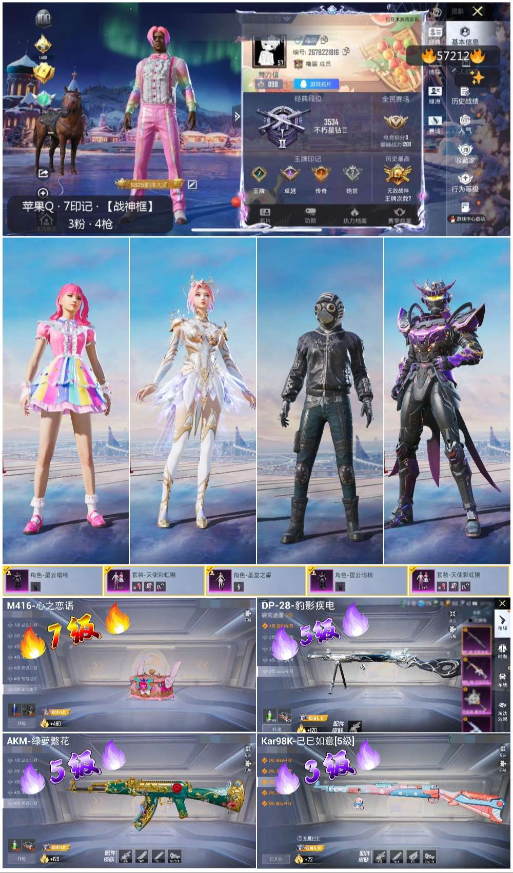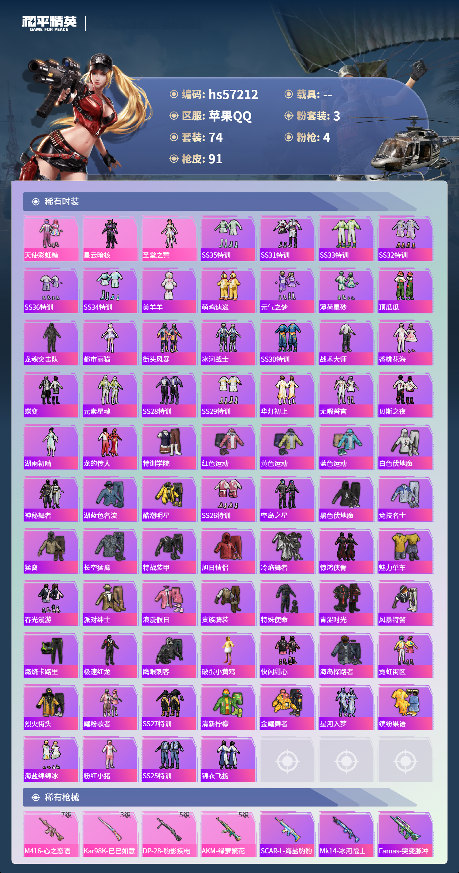 hs57212 苹果手q-7王牌印记-有战神框-3粉装-4特效呛-26968热力值-74套装-91呛皮-3卓越印记-2传奇印记【3粉装】角色-星云暗核角色-圣堂之誓套装-天使彩虹糖【4特效呛】m416-心之恋语/7级dp-28-豹影疾电/5级akm-绿萝繁花/5级kar98k-巳巳如意/3级【74稀有时装】天使彩虹糖ss35特训ss31特训ss33特训ss32特训ss36