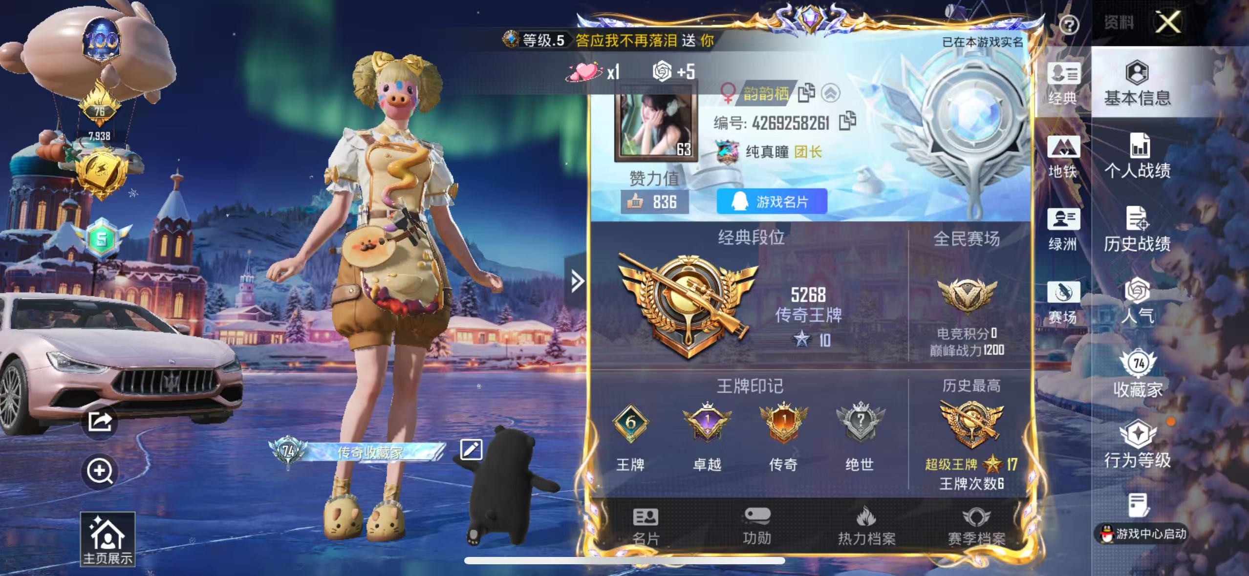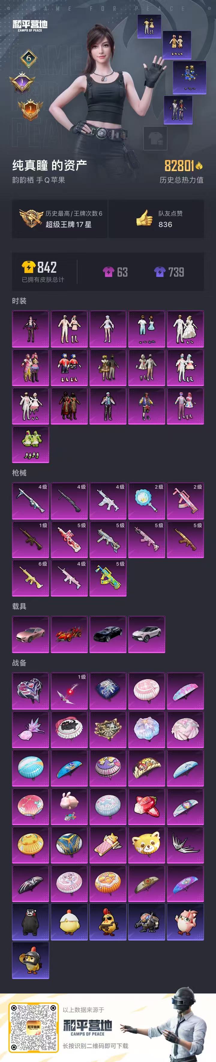 【和平精英】【txhp6062】16粉装,13特效呛,4载具,历史最高段位:超级王牌17星 王牌印记6次 热力值:82801,159套装,221呛械,321装备,109战备;套装:套装-甜心巧克力,套装-宝贝奶油派,套装-天使彩虹糖,套装-缤纷油彩,套装-天禅智恒,套装-彗云及圣,套装-恐龙拽拽,套装-霓裳武神,套装-冰川粉黛,套装-旋转彩虹,套装-音爆索尼克,套装-纯珍童话,套装-第五大道,套装-仲夏莫吉托,角色-荧海星豚,角色-罪夜之冕,套装-红色运动,套装-白色伏地魔,套装-骑行爱好者,套装-竞技名士,套装-猛禽,套装-长空猛禽,套装-蓝色守护者,套装-特战装甲,套装-战地菁英,套装-贵族骑装,套装-灰色格斗者,套装-甜蜜告白,套装-龙腾端午,套装-燃烧卡路里,套装-沙漠毒蛇,套装-鹰眼刺客,套装-幻影武者,套装-怒火燎原,套装-魅力单车,套装-耀眼新星,套装-都市漫游者,套装-野性战心,套装-热血青春,套装-沙漠兵团,套装-ss2特训,套装-极地朋克,套装-幻世战舞者,套装-缤纷果语,套装-滨海厨神,套装-冰川特警,套装-麻辣教官,套装-ss3特训,套装-粉红小猪,套装-破蛋小黄鸡,套装-金鼠迎春,套装-军械专家,套装-北国孤狼,套装-闪耀星光,套装-鹤鸣,套装-暗夜契约,套装-纯白誓言,套装-ss10特训,套装-智慧之神,套装-萌黄之夏,套装-摇滚狂鲨,套装-夏日音浪,套装-ss9特训,套装-神秘舞者,套装-丝绸行者,套装-探宝勇士,套装-牛气满满,套装-白虎圣者,套装-原初圣火,套装-逆风勇士,套装-ss12特训,套装-牛气冲天,套装-ss18特训,套装-治愈之星,套装-科技之星,套装-飞行日记,套装-ss13特训,套装-冰爽海盐,套装-浪漫樱花,套装-ss14特训,套装-天籁歌者,套装-电音精灵,套装-暖风夏荷,套装-暗夜魅影,角色-英勇保护者,套装-水晶王族,套装-智慧隐士,角色-军刀雅典娜,套装-空投萌叽,套装-ss19特训,套装-飞驰魅影,套装-音速流光,套装-炫蓝之夏,套装-ss20特训,套装-粉团憨憨,套装-软羊咩咩,套装-奶芙汪汪,套装-恶魔喵喵,套装-猎梦纪元,套装-甜心亚梦,套装-虚音幻奏,套装-ss21特训,套装-萌趣咩咩,套装-娇憨猪猪,套装-银碳小老虎,套装-墨染幽兰,套装-荷畔雨呱,套装-梦幻奶油,套装-酸甜橘柚,套装-暗夜行者,角色-李,角色-赵灵儿,套装-玉兔迎春,套装-ss22特训,套装-和煦暖阳,套装-田园牧歌,套装-轻风白浪,套装-岑岑玉浪,套装-绚烂繁星,套装-绯格组合,套装-ss23特训,套装-飞狐塔尔斯,套装-莱茵河畔,套装-香榭午后,套装-白兰地假日,套装-龙舌兰冰茶,套装-灵蜜圈圈,套装-妙红点点,套装-幻彩翩翩,套装-王牌教练,套装-柠萌假日,套装-无暇誓言,套装-街头风暴,套装-ss33特训,套装-云朵鹅,套装-彩虹兔,套装-荒原牛仔,套装-暖暖向日葵,套装-雪绒豹,套装-狂鲨锋刃,角色-时希公主,套装-蜜露汐语,套装-炫彩糖果,套装-黄油吐司,套装-ss34特训,套装-薄荷星砂,套装-ss35特训,套装-午间小调,套装-秘语星愿,套装-风迹短诗,套装-琴音绮想,套装-粉黛兰香,角色-超感刻度,套装-画境星梦,套装-书海巡游,角色-月烬之祷,套装-ss36特训,套装-雪国风尚,套装-萌鸡速递;呛皮:famas-乌木金纹,m16a4-蓝色火焰,m16a4-甜心亚梦,m16a4-幻世战舞者,q-原初圣火,q-赛罗,q-彩虹符号,q-洛神天依,q-飞驰魅影,q-银碳小老虎,4级scar-l-甜梦小狐,scar-l-红色方程式,scar-l-甜蜜誓约,scar-l-扶摇飞仙,scar-l-炫彩节奏,scar-l-银碳小老虎,scar-l-玉兔迎春,5级akm-甜心宝贝,akm-玉龙,akm-破晓战魂,akm-夜灯,akm-四圣焕新,akm-环太平洋,akm-筑梦精灵,akm-墨染幽兰,akm-灵猫魔法师,akm-乌木金纹,5级m762-甜蜜誓约,m762-生命誓言,m762-甜心宝贝,m762-深海曼妙,m762-牛气冲天,m762-呛炮玫瑰,m762-暖熊萌萌,m762-彩虹甜喵,m762-暗夜鎏金,m762-第五大道,m762-天降萌叽,m762-云朵鹅,m762-乌木金纹,aug-耀粉歌者,aug-幻梦音符,aug-天降萌叽,aug-异域银装,aug-冰晶雪宝,ac-val-甜心亚梦,ac-val-天降萌叽,1级m416-五爪金龙,6级m416-暖熊萌萌,m416-蓝色火焰,m416-红色方程式,m416-暗夜行者,m416-糯团青竹,5级groza-香水柠檬,2级groza-旋转彩虹,groza-影袭,groza-生命誓言,groza-马卡龙,groza-治愈之星,groza-甜蜜草莓,groza-田园牧歌,groza-荧海星豚,groza-暮色玫影,mk47-洛神天依,mk47-乌木金纹,mk47-妙红点点,mk47-风迹短诗,4级蜜獾-荧海星豚,蜜獾-娇憨猪猪,蜜獾-风迹短诗,ace32-画境星梦,awm-炙焰牛王,awm-垂柳戏鸭,awm-音爆索尼克,awm-暮色玫影,awm-乌木金纹,m24-治愈之星,m24-炫彩节奏,m24-仲夏莫吉托,m24-乌木金纹,莫辛纳甘-乌木金纹,莫辛纳甘-银碳小老虎,莫辛纳甘-风迹短诗,svd-冷漠罗丽,svd-云朵鹅,kar98k-梦幻火箭,kar98k-深海曼妙,kar98k-终极赛罗,kar98k-彩虹符号,kar98k-洛神天依,kar98k-飞驰魅影,amr-暗夜行者,amr-妙红点点,m200-仲夏莫吉托,m200-罪夜之冕,win94-乌木金纹,mk14-山经魅狐,mk14-治愈之星,mk14-乌木金纹,mk14-紫晶流影,slr-四圣焕新,slr-娇憨猪猪,slr-彩虹符号,slr-霓彩脉冲,mini14-生命誓言,mini14-原初圣火,mini14-炫彩节奏,mini14-筑梦精灵,mini14-旋转彩虹,mini14-绯穹魔姬,mk12-风迹短诗,mk12-乌木金纹,qbu-飒粉甜心,mk20-h-墨染幽兰,mk20-h-狂鲨锋刃,vss-田园牧歌,m1加兰德-画境星梦,sks-心之恋语,5级ump45-相思残雪,ump45-夜灯,ump45-生命誓言,ump45-仲夏莫吉托,汤姆逊-耀粉歌者,汤姆逊-炫彩节奏,汤姆逊-庄周梦蝶,汤姆逊-环太平洋,汤姆逊-甜梦小狐,汤姆逊-灵猫魔法师,汤姆逊-乌木金纹,mp5k-众神之王,mp5k-画境星梦,mp5k-乌木金纹,vect-彩虹符号,vect-治愈之星,vect-香水柠檬,vect-田园牧歌,vect-音爆索尼克,野牛-乌木金纹,uzi-众神之王,uzi-娇憨猪猪,uzi-